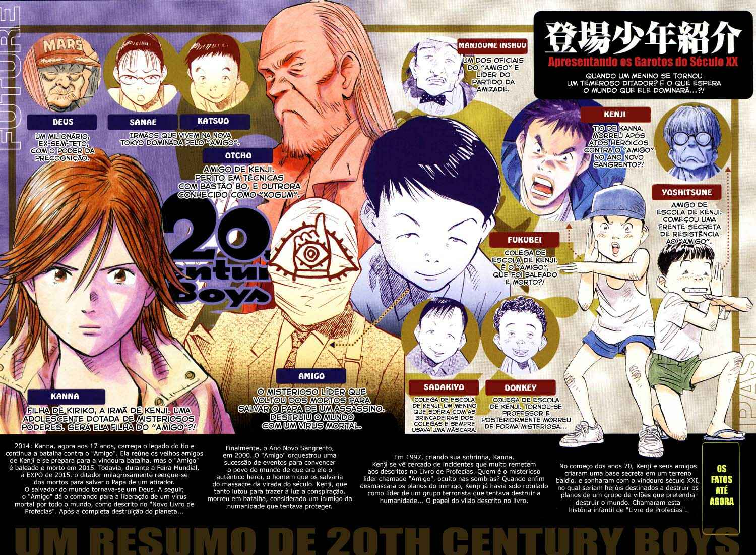 Capítulo 1 - AmigoCapítulo 2 - KaraokêCapítulo 3 - O Garoto Que Comprou um ViolãoCapítulo 4 - Toalha de MelecaCapítulo 5 - Noite no Laboratório de CiênciaCapítulo 6 - Bandeira na LuaCapítulo 7 - SoftballCapítulo 8 - Cave um BuracoCapítulo 9 - MensagemCapítulo 10 - YukijiCapítulo 11 - AmizadeCapítulo 12 - OtchoCapítulo 13 - Chou-sanCapítulo 14 - Yama-sanCapítulo 15 - Momento da Extinção da HumanidadeCapítulo 16 - DeusCapítulo 17 - A Escrivaninha da IrmãCapítulo 18 - O Amor da IrmãCapítulo 19 - O Homem Por Trás de TudoCapítulo 20 - ProfetaCapítulo 21 - Abra Seus OlhosCapítulo 22 - Herói de GuitarraCapítulo 23 - DeterminaçãoCapítulo 24 - EspetáculoCapítulo 25 - IrmãoCapítulo 26 - Colega de TurmaCapítulo 27 - Mais Um... Capítulo 28 - SadakiyoCapítulo 29 - Explosão no AeroportoCapítulo 30 - Criança DestinadaCapítulo 31 - Desde Então... Capítulo 32 - Homem em BangkokCapítulo 33 - Partido da AmizadeCapítulo 34 - FugaCapítulo 35 - ConexõesCapítulo 36 - Paz e AmorCapítulo 37 - Menino do Arco-írisCapítulo 38 - LuzCapítulo 39 - ExplosãoCapítulo 40 - Base secretaCapítulo 41 - Reunião do robõCapítulo 42 - Imperador do mundo inferiorCapítulo 43 - Nas trevas Capítulo 44 - Convite Capítulo 45 - Não está sóCapítulo 46 - Tio KenjiCapítulo 47 - SinalCapítulo 48 - 31 de dezembroCapítulo 49 - O último capítuloCapítulo 50 - ReuniãoCapítulo 51 - MonumentoCapítulo 52 - Detetive ChounoCapítulo 53 - BorboletaCapítulo 54 - Duas aspirações Capítulo 55 - TestemunhaCapítulo 56 - O Verdadeiro AssasinoCapítulo 57 - Vaga-LumeCapítulo 58 - MonstroCapítulo 59 - TúnelCapítulo 60 - Bancando a Caça... Capítulo 61 - Poderoso AliadoCapítulo 62 - Amuleto de Boa SorteCapítulo 63 - A Última EsperançaCapítulo 64 - Fugindo do InfernoCapítulo 65 - Um Teste de CoragemCapítulo 66 - FugaCapítulo 67 - ArCapítulo 68 - ChegadaCapítulo 69 - Feira de SonhosCapítulo 70 - KoizumiCapítulo 71 - Autógrafo de DeusCapítulo 72 - VerdadeCapítulo 73 - Sala de ControleCapítulo 74 - EspetáculoCapítulo 75 - FukubeiCapítulo 76 - EntradaCapítulo 77 - DecisãoCapítulo 78 - RobôCapítulo 79 - A Música de KenjiCapítulo 80 - Sua CaronaCapítulo 81 - AmigolândiaCapítulo 82 - FugaCapítulo 83 - Um PedidoCapítulo 84 - NotasCapítulo 85 - O PlanoCapítulo 86 - O DecliveCapítulo 87 - Vozes ReverberantesCapítulo 88 - Não veja!Capítulo 89 - PesadeloCapítulo 90 - Verdadeira batalhaCapítulo 91 - Coelho NabokovCapítulo 92 - P.E.S.Capítulo 93 - ConfissõesCapítulo 94 - O novo livro de profecias Capítulo 95 - Ao púlpitoCapítulo 96 - SalvadorCapítulo 97 - O assassinatoCapítulo 98 - A bala da pistoleiroCapítulo 99 - Cessar-fogoCapítulo 100 - CruzamentoCapítulo 101 - VigilânciaCapítulo 102 - Novo ProfessorCapítulo 103 - Respostas AterrorizadorasCapítulo 104 - ColecionadorCapítulo 105 - SolilóquioCapítulo 106 - Quarto de Um AmigoCapítulo 107 - Menino sem RostoCapítulo 108 - Menino com RostoCapítulo 109 - TrovãoCapítulo 110 - Um Abismo de DesesperoCapítulo 111 - Lista de IngredientesCapítulo 112 - A Mentira de 1970Capítulo 113 - Velha AmizadeCapítulo 114 - Devoção CompletaCapítulo 115 - AliensCapítulo 116 - A Decisão de SadakiyoCapítulo 117 - RuínasCapítulo 118 - GodzillaCapítulo 119 - Palavras de MãeCapítulo 120 - YamaneCapítulo 121 - Memórias do Laboratório de CiênciasCapítulo 122 - Diferentes Anos NovosCapítulo 123 - PeregrinaçãoCapítulo 124 - AutodestruiçãoCapítulo 125 - Conexão SecretaCapítulo 126 - BibliotecaCapítulo 127 - Laboratório de CiênciasCapítulo 128 - Sob a Lâmpada a ÁlcoolCapítulo 129 - EleCapítulo 130 - Um Tiro (1) Capítulo 131 - Um Tiro (2)Capítulo 132 - O Verdadeiro TiroCapítulo 133 - A Face de um AmigoCapítulo 134 - Um homem EsquecidoCapítulo 135 - A morte do AmigoCapítulo 136 - Encontro da Távola RedondaCapítulo 137 - Tempo de Reuniões Capítulo 138 - Confissões em 2003Capítulo 139 - Um homem de Verdade Capítulo 140 - O começo do FimCapítulo 141 - O império Sapo Contra-Ataca (1)Capítulo 142 - O Império Sapo Contra-Ataca (2)Capítulo 143 - Uma cidade Calma da Alemanha Capítulo 144 - Um terror que Espreita Sorrateiramente Capítulo 145 - Novas OrdensCapítulo 146 - MemorialCapítulo 147 - A Verdade Por Trás de 1971Capítulo 148 - Imperador do MalCapítulo 149 - IntrusoCapítulo 150 - O Dia em Que Ele Viu Algo DiferenteCapítulo 151 - O Entortador de ColheresCapítulo 152 - Laboratório de Ciências, 1971Capítulo 153 - Encontro Com o PassadoCapítulo 154 - IdentidadeCapítulo 155 - Memórias PerdidasCapítulo 156 - Minhas Férias de VerãoCapítulo 157 - Juventude e SonhosCapítulo 158 - Profecias MedíocresCapítulo 159 - Um Japonês Medíocre Capítulo 160 - O homem Tatuado Capítulo 161 - A verdade Retorcida Capítulo 162 - Coragem Em 2001Capítulo 163 - Adeus Em 2001Capítulo 164 - Que Mundo Maravilhoso Capítulo 165 - O Maior Espetáculo Da Terra Capítulo 166 - A Ambulante Da Máscara de Gás Capítulo 167 - Hora Crítica Capítulo 168 - Vida Longa À EXPOCapítulo 169 - Aquém Do Arco-Íris Capítulo 170 - Além Do Arco-Íris Capítulo 171 - O Começo do Arco-írisCapítulo 172 - Um Verdadeiro AmigoCapítulo 173 - No EspelhoCapítulo 174 - O Verdadeiro DecliveCapítulo 175 - O Verdadeiro FantasmaCapítulo 176 - Super-HomemCapítulo 177 - Depois do AmigoCapítulo 178 - O Salto Com VaraCapítulo 179 - História ModernaCapítulo 180 - A Imaginação das CriançasCapítulo 181 - Caixa de BrinquedosCapítulo 182 - Força de Defesa da TerraCapítulo 183 - Força, Katsuo! Capítulo 184 - Limite do SuplícioCapítulo 185 - A Rainha do GeloCapítulo 186 - O Despertar do SuplícioCapítulo 187 - Em JornadaCapítulo 188 - O Fardo da JornadaCapítulo 189 - Policial do Fim do UniversoCapítulo 190 - Canção do Fim do UniversoCapítulo 191 - Dever de Casa de FériasCapítulo 192 - Encontro no Cruzamento: Cruzado de DireitaCapítulo 193 - Guitarra SuddararaCapít
