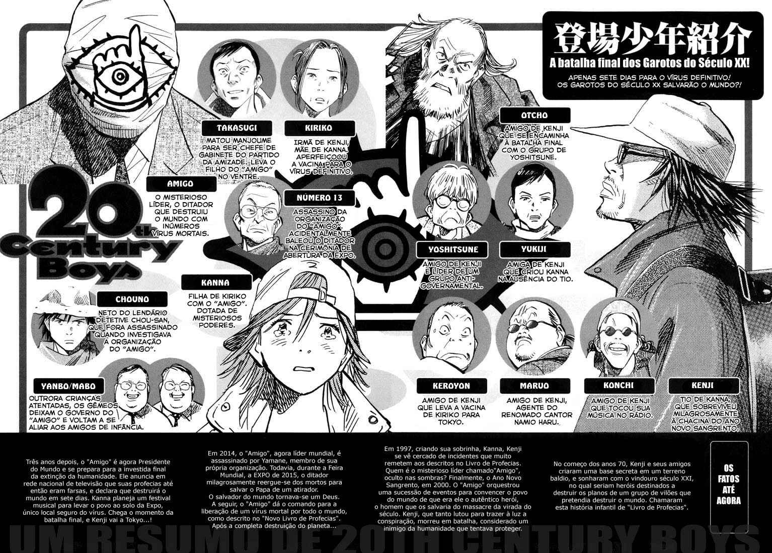 Capítulo 1 - AmigoCapítulo 2 - KaraokêCapítulo 3 - O Garoto Que Comprou um ViolãoCapítulo 4 - Toalha de MelecaCapítulo 5 - Noite no Laboratório de CiênciaCapítulo 6 - Bandeira na LuaCapítulo 7 - SoftballCapítulo 8 - Cave um BuracoCapítulo 9 - MensagemCapítulo 10 - YukijiCapítulo 11 - AmizadeCapítulo 12 - OtchoCapítulo 13 - Chou-sanCapítulo 14 - Yama-sanCapítulo 15 - Momento da Extinção da HumanidadeCapítulo 16 - DeusCapítulo 17 - A Escrivaninha da IrmãCapítulo 18 - O Amor da IrmãCapítulo 19 - O Homem Por Trás de TudoCapítulo 20 - ProfetaCapítulo 21 - Abra Seus OlhosCapítulo 22 - Herói de GuitarraCapítulo 23 - DeterminaçãoCapítulo 24 - EspetáculoCapítulo 25 - IrmãoCapítulo 26 - Colega de TurmaCapítulo 27 - Mais Um... Capítulo 28 - SadakiyoCapítulo 29 - Explosão no AeroportoCapítulo 30 - Criança DestinadaCapítulo 31 - Desde Então... Capítulo 32 - Homem em BangkokCapítulo 33 - Partido da AmizadeCapítulo 34 - FugaCapítulo 35 - ConexõesCapítulo 36 - Paz e AmorCapítulo 37 - Menino do Arco-írisCapítulo 38 - LuzCapítulo 39 - ExplosãoCapítulo 40 - Base secretaCapítulo 41 - Reunião do robõCapítulo 42 - Imperador do mundo inferiorCapítulo 43 - Nas trevas Capítulo 44 - Convite Capítulo 45 - Não está sóCapítulo 46 - Tio KenjiCapítulo 47 - SinalCapítulo 48 - 31 de dezembroCapítulo 49 - O último capítuloCapítulo 50 - ReuniãoCapítulo 51 - MonumentoCapítulo 52 - Detetive ChounoCapítulo 53 - BorboletaCapítulo 54 - Duas aspirações Capítulo 55 - TestemunhaCapítulo 56 - O Verdadeiro AssasinoCapítulo 57 - Vaga-LumeCapítulo 58 - MonstroCapítulo 59 - TúnelCapítulo 60 - Bancando a Caça... Capítulo 61 - Poderoso AliadoCapítulo 62 - Amuleto de Boa SorteCapítulo 63 - A Última EsperançaCapítulo 64 - Fugindo do InfernoCapítulo 65 - Um Teste de CoragemCapítulo 66 - FugaCapítulo 67 - ArCapítulo 68 - ChegadaCapítulo 69 - Feira de SonhosCapítulo 70 - KoizumiCapítulo 71 - Autógrafo de DeusCapítulo 72 - VerdadeCapítulo 73 - Sala de ControleCapítulo 74 - EspetáculoCapítulo 75 - FukubeiCapítulo 76 - EntradaCapítulo 77 - DecisãoCapítulo 78 - RobôCapítulo 79 - A Música de KenjiCapítulo 80 - Sua CaronaCapítulo 81 - AmigolândiaCapítulo 82 - FugaCapítulo 83 - Um PedidoCapítulo 84 - NotasCapítulo 85 - O PlanoCapítulo 86 - O DecliveCapítulo 87 - Vozes ReverberantesCapítulo 88 - Não veja!Capítulo 89 - PesadeloCapítulo 90 - Verdadeira batalhaCapítulo 91 - Coelho NabokovCapítulo 92 - P.E.S.Capítulo 93 - ConfissõesCapítulo 94 - O novo livro de profecias Capítulo 95 - Ao púlpitoCapítulo 96 - SalvadorCapítulo 97 - O assassinatoCapítulo 98 - A bala da pistoleiroCapítulo 99 - Cessar-fogoCapítulo 100 - CruzamentoCapítulo 101 - VigilânciaCapítulo 102 - Novo ProfessorCapítulo 103 - Respostas AterrorizadorasCapítulo 104 - ColecionadorCapítulo 105 - SolilóquioCapítulo 106 - Quarto de Um AmigoCapítulo 107 - Menino sem RostoCapítulo 108 - Menino com RostoCapítulo 109 - TrovãoCapítulo 110 - Um Abismo de DesesperoCapítulo 111 - Lista de IngredientesCapítulo 112 - A Mentira de 1970Capítulo 113 - Velha AmizadeCapítulo 114 - Devoção CompletaCapítulo 115 - AliensCapítulo 116 - A Decisão de SadakiyoCapítulo 117 - RuínasCapítulo 118 - GodzillaCapítulo 119 - Palavras de MãeCapítulo 120 - YamaneCapítulo 121 - Memórias do Laboratório de CiênciasCapítulo 122 - Diferentes Anos NovosCapítulo 123 - PeregrinaçãoCapítulo 124 - AutodestruiçãoCapítulo 125 - Conexão SecretaCapítulo 126 - BibliotecaCapítulo 127 - Laboratório de CiênciasCapítulo 128 - Sob a Lâmpada a ÁlcoolCapítulo 129 - EleCapítulo 130 - Um Tiro (1) Capítulo 131 - Um Tiro (2)Capítulo 132 - O Verdadeiro TiroCapítulo 133 - A Face de um AmigoCapítulo 134 - Um homem EsquecidoCapítulo 135 - A morte do AmigoCapítulo 136 - Encontro da Távola RedondaCapítulo 137 - Tempo de Reuniões Capítulo 138 - Confissões em 2003Capítulo 139 - Um homem de Verdade Capítulo 140 - O começo do FimCapítulo 141 - O império Sapo Contra-Ataca (1)Capítulo 142 - O Império Sapo Contra-Ataca (2)Capítulo 143 - Uma cidade Calma da Alemanha Capítulo 144 - Um terror que Espreita Sorrateiramente Capítulo 145 - Novas OrdensCapítulo 146 - MemorialCapítulo 147 - A Verdade Por Trás de 1971Capítulo 148 - Imperador do MalCapítulo 149 - IntrusoCapítulo 150 - O Dia em Que Ele Viu Algo DiferenteCapítulo 151 - O Entortador de ColheresCapítulo 152 - Laboratório de Ciências, 1971Capítulo 153 - Encontro Com o PassadoCapítulo 154 - IdentidadeCapítulo 155 - Memórias PerdidasCapítulo 156 - Minhas Férias de VerãoCapítulo 157 - Juventude e SonhosCapítulo 158 - Profecias MedíocresCapítulo 159 - Um Japonês Medíocre Capítulo 160 - O homem Tatuado Capítulo 161 - A verdade Retorcida Capítulo 162 - Coragem Em 2001Capítulo 163 - Adeus Em 2001Capítulo 164 - Que Mundo Maravilhoso Capítulo 165 - O Maior Espetáculo Da Terra Capítulo 166 - A Ambulante Da Máscara de Gás Capítulo 167 - Hora Crítica Capítulo 168 - Vida Longa À EXPOCapítulo 169 - Aquém Do Arco-Íris Capítulo 170 - Além Do Arco-Íris Capítulo 171 - O Começo do Arco-írisCapítulo 172 - Um Verdadeiro AmigoCapítulo 173 - No EspelhoCapítulo 174 - O Verdadeiro DecliveCapítulo 175 - O Verdadeiro FantasmaCapítulo 176 - Super-HomemCapítulo 177 - Depois do AmigoCapítulo 178 - O Salto Com VaraCapítulo 179 - História ModernaCapítulo 180 - A Imaginação das CriançasCapítulo 181 - Caixa de BrinquedosCapítulo 182 - Força de Defesa da TerraCapítulo 183 - Força, Katsuo! Capítulo 184 - Limite do SuplícioCapítulo 185 - A Rainha do GeloCapítulo 186 - O Despertar do SuplícioCapítulo 187 - Em JornadaCapítulo 188 - O Fardo da JornadaCapítulo 189 - Policial do Fim do UniversoCapítulo 190 - Canção do Fim do UniversoCapítulo 191 - Dever de Casa de FériasCapítulo 192 - Encontro no Cruzamento: Cruzado de DireitaCapítulo 193 - Guitarra SuddararaCapít