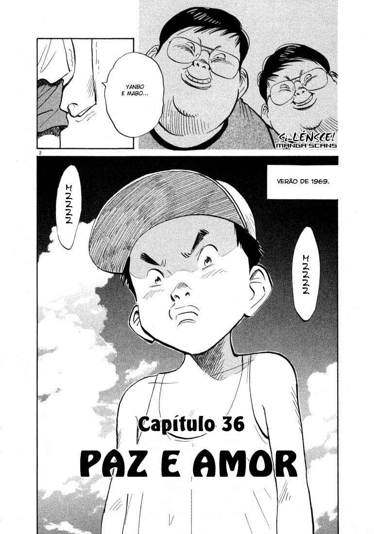 Capítulo 1 - AmigoCapítulo 2 - KaraokêCapítulo 3 - O Garoto Que Comprou um ViolãoCapítulo 4 - Toalha de MelecaCapítulo 5 - Noite no Laboratório de CiênciaCapítulo 6 - Bandeira na LuaCapítulo 7 - SoftballCapítulo 8 - Cave um BuracoCapítulo 9 - MensagemCapítulo 10 - YukijiCapítulo 11 - AmizadeCapítulo 12 - OtchoCapítulo 13 - Chou-sanCapítulo 14 - Yama-sanCapítulo 15 - Momento da Extinção da HumanidadeCapítulo 16 - DeusCapítulo 17 - A Escrivaninha da IrmãCapítulo 18 - O Amor da IrmãCapítulo 19 - O Homem Por Trás de TudoCapítulo 20 - ProfetaCapítulo 21 - Abra Seus OlhosCapítulo 22 - Herói de GuitarraCapítulo 23 - DeterminaçãoCapítulo 24 - EspetáculoCapítulo 25 - IrmãoCapítulo 26 - Colega de TurmaCapítulo 27 - Mais Um... Capítulo 28 - SadakiyoCapítulo 29 - Explosão no AeroportoCapítulo 30 - Criança DestinadaCapítulo 31 - Desde Então... Capítulo 32 - Homem em BangkokCapítulo 33 - Partido da AmizadeCapítulo 34 - FugaCapítulo 35 - ConexõesCapítulo 36 - Paz e AmorCapítulo 37 - Menino do Arco-írisCapítulo 38 - LuzCapítulo 39 - ExplosãoCapítulo 40 - Base secretaCapítulo 41 - Reunião do robõCapítulo 42 - Imperador do mundo inferiorCapítulo 43 - Nas trevas Capítulo 44 - Convite Capítulo 45 - Não está sóCapítulo 46 - Tio KenjiCapítulo 47 - SinalCapítulo 48 - 31 de dezembroCapítulo 49 - O último capítuloCapítulo 50 - ReuniãoCapítulo 51 - MonumentoCapítulo 52 - Detetive ChounoCapítulo 53 - BorboletaCapítulo 54 - Duas aspirações Capítulo 55 - TestemunhaCapítulo 56 - O Verdadeiro AssasinoCapítulo 57 - Vaga-LumeCapítulo 58 - MonstroCapítulo 59 - TúnelCapítulo 60 - Bancando a Caça... Capítulo 61 - Poderoso AliadoCapítulo 62 - Amuleto de Boa SorteCapítulo 63 - A Última EsperançaCapítulo 64 - Fugindo do InfernoCapítulo 65 - Um Teste de CoragemCapítulo 66 - FugaCapítulo 67 - ArCapítulo 68 - ChegadaCapítulo 69 - Feira de SonhosCapítulo 70 - KoizumiCapítulo 71 - Autógrafo de DeusCapítulo 72 - VerdadeCapítulo 73 - Sala de ControleCapítulo 74 - EspetáculoCapítulo 75 - FukubeiCapítulo 76 - EntradaCapítulo 77 - DecisãoCapítulo 78 - RobôCapítulo 79 - A Música de KenjiCapítulo 80 - Sua CaronaCapítulo 81 - AmigolândiaCapítulo 82 - FugaCapítulo 83 - Um PedidoCapítulo 84 - NotasCapítulo 85 - O PlanoCapítulo 86 - O DecliveCapítulo 87 - Vozes ReverberantesCapítulo 88 - Não veja!Capítulo 89 - PesadeloCapítulo 90 - Verdadeira batalhaCapítulo 91 - Coelho NabokovCapítulo 92 - P.E.S.Capítulo 93 - ConfissõesCapítulo 94 - O novo livro de profecias Capítulo 95 - Ao púlpitoCapítulo 96 - SalvadorCapítulo 97 - O assassinatoCapítulo 98 - A bala da pistoleiroCapítulo 99 - Cessar-fogoCapítulo 100 - CruzamentoCapítulo 101 - VigilânciaCapítulo 102 - Novo ProfessorCapítulo 103 - Respostas AterrorizadorasCapítulo 104 - ColecionadorCapítulo 105 - SolilóquioCapítulo 106 - Quarto de Um AmigoCapítulo 107 - Menino sem RostoCapítulo 108 - Menino com RostoCapítulo 109 - TrovãoCapítulo 110 - Um Abismo de DesesperoCapítulo 111 - Lista de IngredientesCapítulo 112 - A Mentira de 1970Capítulo 113 - Velha AmizadeCapítulo 114 - Devoção CompletaCapítulo 115 - AliensCapítulo 116 - A Decisão de SadakiyoCapítulo 117 - RuínasCapítulo 118 - GodzillaCapítulo 119 - Palavras de MãeCapítulo 120 - YamaneCapítulo 121 - Memórias do Laboratório de CiênciasCapítulo 122 - Diferentes Anos NovosCapítulo 123 - PeregrinaçãoCapítulo 124 - AutodestruiçãoCapítulo 125 - Conexão SecretaCapítulo 126 - BibliotecaCapítulo 127 - Laboratório de CiênciasCapítulo 128 - Sob a Lâmpada a ÁlcoolCapítulo 129 - EleCapítulo 130 - Um Tiro (1) Capítulo 131 - Um Tiro (2)Capítulo 132 - O Verdadeiro TiroCapítulo 133 - A Face de um AmigoCapítulo 134 - Um homem EsquecidoCapítulo 135 - A morte do AmigoCapítulo 136 - Encontro da Távola RedondaCapítulo 137 - Tempo de Reuniões Capítulo 138 - Confissões em 2003Capítulo 139 - Um homem de Verdade Capítulo 140 - O começo do FimCapítulo 141 - O império Sapo Contra-Ataca (1)Capítulo 142 - O Império Sapo Contra-Ataca (2)Capítulo 143 - Uma cidade Calma da Alemanha Capítulo 144 - Um terror que Espreita Sorrateiramente Capítulo 145 - Novas OrdensCapítulo 146 - MemorialCapítulo 147 - A Verdade Por Trás de 1971Capítulo 148 - Imperador do MalCapítulo 149 - IntrusoCapítulo 150 - O Dia em Que Ele Viu Algo DiferenteCapítulo 151 - O Entortador de ColheresCapítulo 152 - Laboratório de Ciências, 1971Capítulo 153 - Encontro Com o PassadoCapítulo 154 - IdentidadeCapítulo 155 - Memórias PerdidasCapítulo 156 - Minhas Férias de VerãoCapítulo 157 - Juventude e SonhosCapítulo 158 - Profecias MedíocresCapítulo 159 - Um Japonês Medíocre Capítulo 160 - O homem Tatuado Capítulo 161 - A verdade Retorcida Capítulo 162 - Coragem Em 2001Capítulo 163 - Adeus Em 2001Capítulo 164 - Que Mundo Maravilhoso Capítulo 165 - O Maior Espetáculo Da Terra Capítulo 166 - A Ambulante Da Máscara de Gás Capítulo 167 - Hora Crítica Capítulo 168 - Vida Longa À EXPOCapítulo 169 - Aquém Do Arco-Íris Capítulo 170 - Além Do Arco-Íris Capítulo 171 - O Começo do Arco-írisCapítulo 172 - Um Verdadeiro AmigoCapítulo 173 - No EspelhoCapítulo 174 - O Verdadeiro DecliveCapítulo 175 - O Verdadeiro FantasmaCapítulo 176 - Super-HomemCapítulo 177 - Depois do AmigoCapítulo 178 - O Salto Com VaraCapítulo 179 - História ModernaCapítulo 180 - A Imaginação das CriançasCapítulo 181 - Caixa de BrinquedosCapítulo 182 - Força de Defesa da TerraCapítulo 183 - Força, Katsuo! Capítulo 184 - Limite do SuplícioCapítulo 185 - A Rainha do GeloCapítulo 186 - O Despertar do SuplícioCapítulo 187 - Em JornadaCapítulo 188 - O Fardo da JornadaCapítulo 189 - Policial do Fim do UniversoCapítulo 190 - Canção do Fim do UniversoCapítulo 191 - Dever de Casa de FériasCapítulo 192 - Encontro no Cruzamento: Cruzado de DireitaCapítulo 193 - Guitarra SuddararaCapít