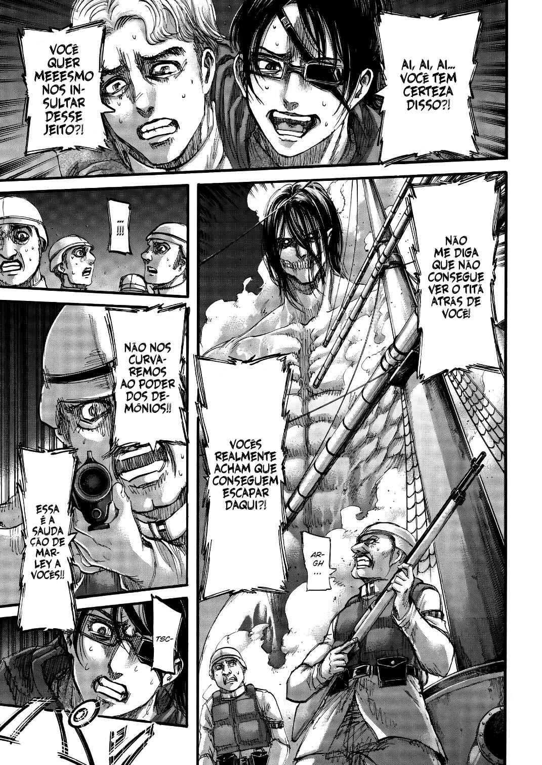Capítulo 1 - Para Você, Após Dois Mil AnosCapítulo 2 - Aquele DiaCapítulo 3 - A Noite da GraduaçãoCapítulo 4 - Primeira BatalhaCapítulo 5 - Uma Fraca Luz em Meio ao DesesperoCapítulo 6 - O Mundo Que a Garota ViuCapítulo 7 - Lâmina PequenaCapítulo 8 - RugidoCapítulo 9 - Ouvindo as Batidas do CoraçãoCapítulo 10 - O Destino do Braço EsquerdoCapítulo 11 - RespostaCapítulo 12 - ÍconeCapítulo 13 - FeridaCapítulo 13.5Capítulo 14 - Desejo PrimordialCapítulo 15 - IndivíduosCapítulo 16 - NecessidadeCapítulo 17 - Força IlusóriaCapítulo 18 - O que Devo Fazer Agora?Capítulo 19 - Ainda Não VeemCapítulo 20 - Esquadrão de Operações EspeciaisCapítulo 21 - Abrem-se os PortõesCapítulo 22 - Formação de Detecção de Longo AlcanceCapítulo 22.5Capítulo 23 - A Titã FêmeaCapítulo 24 - A Floresta das Árvores GigantesCapítulo 25 - MordidaCapítulo 26 - Por um Caminho MelhorCapítulo 27 - Irvin SmithCapítulo 28 - Escolhas e ResultadosCapítulo 29 - Golpe de FerroCapítulo 30 - Os DerrotadosCapítulo 31 - SorrisoCapítulo 32 - ClemênciaCapítulo 33 - MuralhaCapítulo 34 - Os Guerreiros DançamCapítulo 35 - O Titã BestialCapítulo 36 - Estou em CasaCapítulo 37 - Ao SudesteCapítulo 38 - Castelo UtgardCapítulo 39 - SoldadoCapítulo 40 - YmirCapítulo 41 - HistoriaCapítulo 42 - GuerreiroCapítulo 43 - O Titã de ArmaduraCapítulo 44 - Golpear - Derrubar - DominarCapítulo 45 - Aqueles que PerseguemCapítulo 46 - AberturaCapítulo 47 - CriançasCapítulo 48 - AlguémCapítulo 49 - AtaqueCapítulo 50 - GritoCapítulo 50.5Capítulo 51 - Esquadrão LeviCapítulo 52 - Krista LenzCapítulo 53 - FumaçaCapítulo 54 - O Local do Contra-AtaqueCapítulo 55 - DorCapítulo 56 - AtoresCapítulo 57 - Kenny, o EstripadorCapítulo 58 - TiroteioCapítulo 59 - A Alma de um MonstroCapítulo 60 - ConfiançaCapítulo 61 - RespostasCapítulo 62 - CrimeCapítulo 63 - CorrentesCapítulo 64 - Festa de Boas VindasCapítulo 65 - Sonhos e MaldiçõesCapítulo 66 - DesejoCapítulo 67 - O Lado Externo do Distrito OrvudCapítulo 68 - O Rei da MuralhaCapítulo 69 - AmigosCapítulo 70 - Um Sonho do PassadoCapítulo 71 - EspectadorCapítulo 72 - A Noite da OperaçãoCapítulo 73 - A Cidade Onde Tudo ComeçouCapítulo 74 - Objetivos da MissãoCapítulo 75 - Duas Frentes de BatalhaCapítulo 76 - A Lança do TrovãoCapítulo 77 - O Mundo Que Eles ViramCapítulo 78 - VisitaCapítulo 79 - Jogo PerfeitoCapítulo 80 - Os Soldados DesconhecidosCapítulo 81 - PromessaCapítulo 82 - HeróiCapítulo 83 - Golpe de MachadoCapítulo 84 - Sol da Meia NoiteCapítulo 85 - PorãoCapítulo 86 - Aquele DiaCapítulo 87 - FronteiraCapítulo 88 - Ataque dos TitãsCapítulo 89 - ReuniãoCapítulo 90 - Para o Outro Lado da MuralhaCapítulo 91 - O Outro Lado do OceanoCapítulo 92 - Soldados de MarleyCapítulo 93 - Trem da Noite EscuraCapítulo 94 - O Garoto Dentro do MuroCapítulo 95 - MentirosoCapítulo 96 - O Portão da EsperançaCapítulo 97 - De Uma Mão para a OutraCapítulo 98 - Que BomCapítulo 99 - A Sombra de Uma Consciência CulpadaCapítulo 100 - Declaração de GuerraCapítulo 101 - O Gigante do Martelo de GuerraCapítulo 102 - E Tarde DemaisCapítulo 103 - AtaqueCapítulo 104 - VitoriososCapítulo 105 - A Bala do AssassinoCapítulo 106 - Soldados VoluntáriosCapítulo 107 - VisitanteCapítulo 108 - Um Bom ArgumentoCapítulo 109 - Aqueles Que GuiamCapítulo 110 - ImpostorCapítulo 111 - Crianças da FlorestaCapítulo 112 - IgnorânciaCapítulo 113 - ViolênciaCapítulo 114 - Única SalvaçãoCapítulo 115 - SuporteCapítulo 116 - Céu e TerraCapítulo 117 - JulgamentoCapítulo 118 - Ataque SurpresaCapítulo 119 - Irmãos Mais Velhos, Irmãos Mais NovosCapítulo 120 - Um Breve InstanteCapítulo 120 - InstanteCapítulo 121 - Memórias do FuturoCapítulo 121 - Memórias futurasCapítulo 122 - De Você 2000 Anos AtrásCapítulo 122 - De você, há 2000 anos.Capítulo 123 - Os demônios da ilhaCapítulo 123 - Demônios da ilhaCapítulo 124 - DerretimentoCapítulo 124 - DescongelamentoCapítulo 125 - Pôr do SolCapítulo 126 - OrgulhoCapítulo 126 - OrgulhoCapítulo 127 - Noite da Véspera do FimCapítulo 128 - TraidorCapítulo 129 - RetrospectivaCapítulo 130 - O amanhecer da humanidadeCapítulo 130 - Amanhecer Para a HumanidadeCapítulo 131 - EstrondoCapítulo 131 - O EstrondoCapítulo 132 - Asas da LiberdadeCapítulo 132 - As asas da liberdadeCapítulo 133 - PecadoresCapítulo 133 - PecadoresCapítulo 134 - Nas Profundezas do DesesperoCapítulo 135 - Batalha do Céu e da TerraCapítulo 135 - Batalha do Céu e da TerraCapítulo 136 - Dediquem Seus CoraçõesCapítulo 137 - TitãsCapítulo 138 - Um Longo SonhoCapítulo 139 - Em Direção a Árvore Naquela Colina