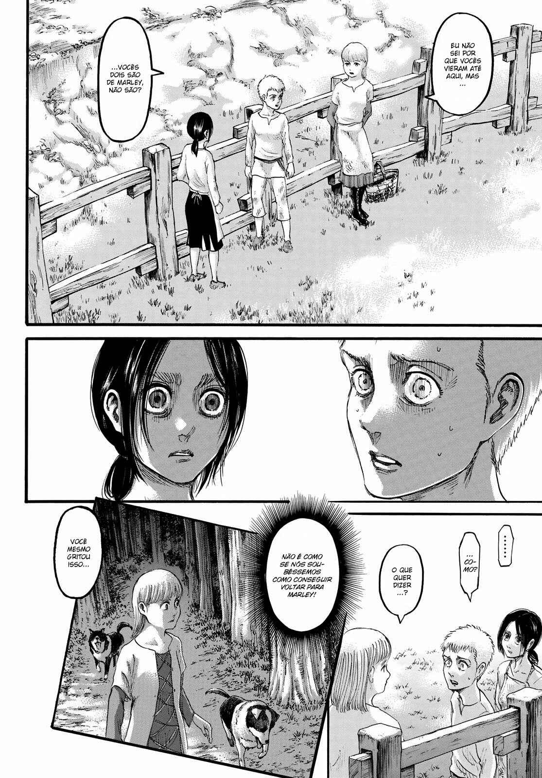 Capítulo 1 - Para Você, Após Dois Mil AnosCapítulo 2 - Aquele DiaCapítulo 3 - A Noite da GraduaçãoCapítulo 4 - Primeira BatalhaCapítulo 5 - Uma Fraca Luz em Meio ao DesesperoCapítulo 6 - O Mundo Que a Garota ViuCapítulo 7 - Lâmina PequenaCapítulo 8 - RugidoCapítulo 9 - Ouvindo as Batidas do CoraçãoCapítulo 10 - O Destino do Braço EsquerdoCapítulo 11 - RespostaCapítulo 12 - ÍconeCapítulo 13 - FeridaCapítulo 13.5Capítulo 14 - Desejo PrimordialCapítulo 15 - IndivíduosCapítulo 16 - NecessidadeCapítulo 17 - Força IlusóriaCapítulo 18 - O que Devo Fazer Agora?Capítulo 19 - Ainda Não VeemCapítulo 20 - Esquadrão de Operações EspeciaisCapítulo 21 - Abrem-se os PortõesCapítulo 22 - Formação de Detecção de Longo AlcanceCapítulo 22.5Capítulo 23 - A Titã FêmeaCapítulo 24 - A Floresta das Árvores GigantesCapítulo 25 - MordidaCapítulo 26 - Por um Caminho MelhorCapítulo 27 - Irvin SmithCapítulo 28 - Escolhas e ResultadosCapítulo 29 - Golpe de FerroCapítulo 30 - Os DerrotadosCapítulo 31 - SorrisoCapítulo 32 - ClemênciaCapítulo 33 - MuralhaCapítulo 34 - Os Guerreiros DançamCapítulo 35 - O Titã BestialCapítulo 36 - Estou em CasaCapítulo 37 - Ao SudesteCapítulo 38 - Castelo UtgardCapítulo 39 - SoldadoCapítulo 40 - YmirCapítulo 41 - HistoriaCapítulo 42 - GuerreiroCapítulo 43 - O Titã de ArmaduraCapítulo 44 - Golpear - Derrubar - DominarCapítulo 45 - Aqueles que PerseguemCapítulo 46 - AberturaCapítulo 47 - CriançasCapítulo 48 - AlguémCapítulo 49 - AtaqueCapítulo 50 - GritoCapítulo 50.5Capítulo 51 - Esquadrão LeviCapítulo 52 - Krista LenzCapítulo 53 - FumaçaCapítulo 54 - O Local do Contra-AtaqueCapítulo 55 - DorCapítulo 56 - AtoresCapítulo 57 - Kenny, o EstripadorCapítulo 58 - TiroteioCapítulo 59 - A Alma de um MonstroCapítulo 60 - ConfiançaCapítulo 61 - RespostasCapítulo 62 - CrimeCapítulo 63 - CorrentesCapítulo 64 - Festa de Boas VindasCapítulo 65 - Sonhos e MaldiçõesCapítulo 66 - DesejoCapítulo 67 - O Lado Externo do Distrito OrvudCapítulo 68 - O Rei da MuralhaCapítulo 69 - AmigosCapítulo 70 - Um Sonho do PassadoCapítulo 71 - EspectadorCapítulo 72 - A Noite da OperaçãoCapítulo 73 - A Cidade Onde Tudo ComeçouCapítulo 74 - Objetivos da MissãoCapítulo 75 - Duas Frentes de BatalhaCapítulo 76 - A Lança do TrovãoCapítulo 77 - O Mundo Que Eles ViramCapítulo 78 - VisitaCapítulo 79 - Jogo PerfeitoCapítulo 80 - Os Soldados DesconhecidosCapítulo 81 - PromessaCapítulo 82 - HeróiCapítulo 83 - Golpe de MachadoCapítulo 84 - Sol da Meia NoiteCapítulo 85 - PorãoCapítulo 86 - Aquele DiaCapítulo 87 - FronteiraCapítulo 88 - Ataque dos TitãsCapítulo 89 - ReuniãoCapítulo 90 - Para o Outro Lado da MuralhaCapítulo 91 - O Outro Lado do OceanoCapítulo 92 - Soldados de MarleyCapítulo 93 - Trem da Noite EscuraCapítulo 94 - O Garoto Dentro do MuroCapítulo 95 - MentirosoCapítulo 96 - O Portão da EsperançaCapítulo 97 - De Uma Mão para a OutraCapítulo 98 - Que BomCapítulo 99 - A Sombra de Uma Consciência CulpadaCapítulo 100 - Declaração de GuerraCapítulo 101 - O Gigante do Martelo de GuerraCapítulo 102 - E Tarde DemaisCapítulo 103 - AtaqueCapítulo 104 - VitoriososCapítulo 105 - A Bala do AssassinoCapítulo 106 - Soldados VoluntáriosCapítulo 107 - VisitanteCapítulo 108 - Um Bom ArgumentoCapítulo 109 - Aqueles Que GuiamCapítulo 110 - ImpostorCapítulo 111 - Crianças da FlorestaCapítulo 112 - IgnorânciaCapítulo 113 - ViolênciaCapítulo 114 - Única SalvaçãoCapítulo 115 - SuporteCapítulo 116 - Céu e TerraCapítulo 117 - JulgamentoCapítulo 118 - Ataque SurpresaCapítulo 119 - Irmãos Mais Velhos, Irmãos Mais NovosCapítulo 120 - Um Breve InstanteCapítulo 120 - InstanteCapítulo 121 - Memórias do FuturoCapítulo 121 - Memórias futurasCapítulo 122 - De Você 2000 Anos AtrásCapítulo 122 - De você, há 2000 anos.Capítulo 123 - Os demônios da ilhaCapítulo 123 - Demônios da ilhaCapítulo 124 - DerretimentoCapítulo 124 - DescongelamentoCapítulo 125 - Pôr do SolCapítulo 126 - OrgulhoCapítulo 126 - OrgulhoCapítulo 127 - Noite da Véspera do FimCapítulo 128 - TraidorCapítulo 129 - RetrospectivaCapítulo 130 - O amanhecer da humanidadeCapítulo 130 - Amanhecer Para a HumanidadeCapítulo 131 - EstrondoCapítulo 131 - O EstrondoCapítulo 132 - Asas da LiberdadeCapítulo 132 - As asas da liberdadeCapítulo 133 - PecadoresCapítulo 133 - PecadoresCapítulo 134 - Nas Profundezas do DesesperoCapítulo 135 - Batalha do Céu e da TerraCapítulo 135 - Batalha do Céu e da TerraCapítulo 136 - Dediquem Seus CoraçõesCapítulo 137 - TitãsCapítulo 138 - Um Longo SonhoCapítulo 139 - Em Direção a Árvore Naquela Colina