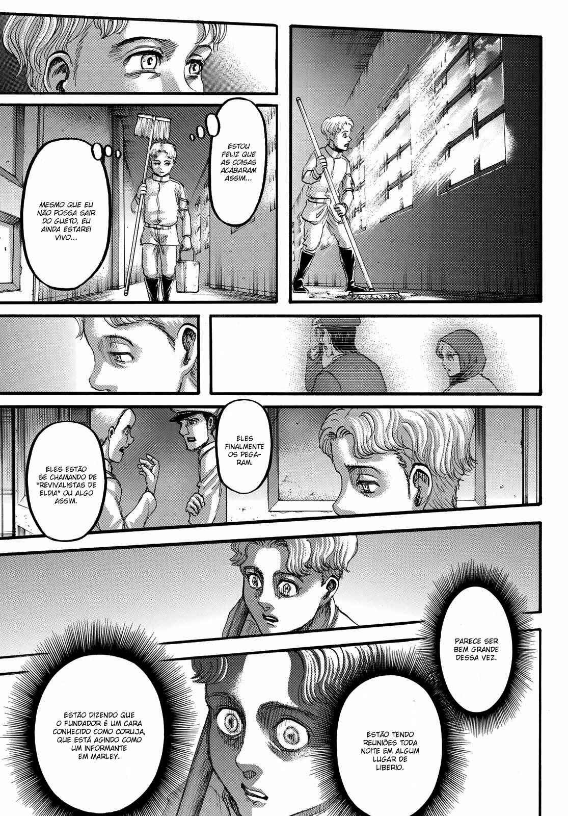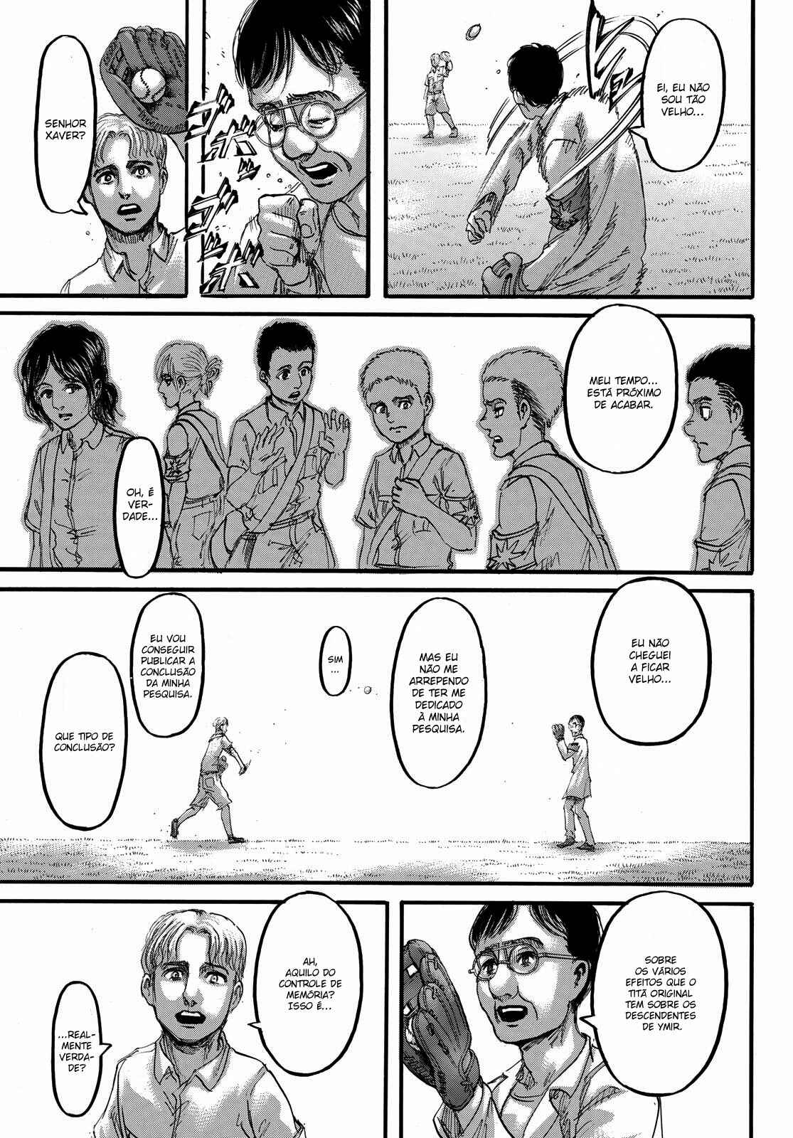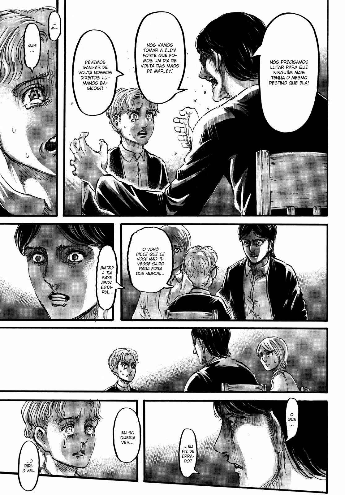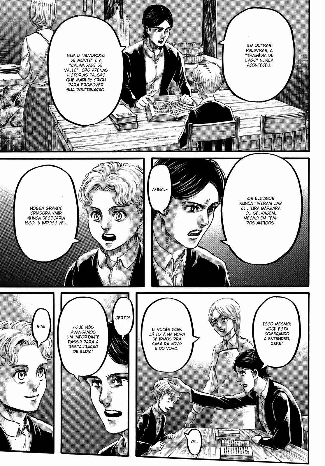 Capítulo 1 - Para Você, Após Dois Mil AnosCapítulo 2 - Aquele DiaCapítulo 3 - A Noite da GraduaçãoCapítulo 4 - Primeira BatalhaCapítulo 5 - Uma Fraca Luz em Meio ao DesesperoCapítulo 6 - O Mundo Que a Garota ViuCapítulo 7 - Lâmina PequenaCapítulo 8 - RugidoCapítulo 9 - Ouvindo as Batidas do CoraçãoCapítulo 10 - O Destino do Braço EsquerdoCapítulo 11 - RespostaCapítulo 12 - ÍconeCapítulo 13 - FeridaCapítulo 13.5Capítulo 14 - Desejo PrimordialCapítulo 15 - IndivíduosCapítulo 16 - NecessidadeCapítulo 17 - Força IlusóriaCapítulo 18 - O que Devo Fazer Agora?Capítulo 19 - Ainda Não VeemCapítulo 20 - Esquadrão de Operações EspeciaisCapítulo 21 - Abrem-se os PortõesCapítulo 22 - Formação de Detecção de Longo AlcanceCapítulo 22.5Capítulo 23 - A Titã FêmeaCapítulo 24 - A Floresta das Árvores GigantesCapítulo 25 - MordidaCapítulo 26 - Por um Caminho MelhorCapítulo 27 - Irvin SmithCapítulo 28 - Escolhas e ResultadosCapítulo 29 - Golpe de FerroCapítulo 30 - Os DerrotadosCapítulo 31 - SorrisoCapítulo 32 - ClemênciaCapítulo 33 - MuralhaCapítulo 34 - Os Guerreiros DançamCapítulo 35 - O Titã BestialCapítulo 36 - Estou em CasaCapítulo 37 - Ao SudesteCapítulo 38 - Castelo UtgardCapítulo 39 - SoldadoCapítulo 40 - YmirCapítulo 41 - HistoriaCapítulo 42 - GuerreiroCapítulo 43 - O Titã de ArmaduraCapítulo 44 - Golpear - Derrubar - DominarCapítulo 45 - Aqueles que PerseguemCapítulo 46 - AberturaCapítulo 47 - CriançasCapítulo 48 - AlguémCapítulo 49 - AtaqueCapítulo 50 - GritoCapítulo 50.5Capítulo 51 - Esquadrão LeviCapítulo 52 - Krista LenzCapítulo 53 - FumaçaCapítulo 54 - O Local do Contra-AtaqueCapítulo 55 - DorCapítulo 56 - AtoresCapítulo 57 - Kenny, o EstripadorCapítulo 58 - TiroteioCapítulo 59 - A Alma de um MonstroCapítulo 60 - ConfiançaCapítulo 61 - RespostasCapítulo 62 - CrimeCapítulo 63 - CorrentesCapítulo 64 - Festa de Boas VindasCapítulo 65 - Sonhos e MaldiçõesCapítulo 66 - DesejoCapítulo 67 - O Lado Externo do Distrito OrvudCapítulo 68 - O Rei da MuralhaCapítulo 69 - AmigosCapítulo 70 - Um Sonho do PassadoCapítulo 71 - EspectadorCapítulo 72 - A Noite da OperaçãoCapítulo 73 - A Cidade Onde Tudo ComeçouCapítulo 74 - Objetivos da MissãoCapítulo 75 - Duas Frentes de BatalhaCapítulo 76 - A Lança do TrovãoCapítulo 77 - O Mundo Que Eles ViramCapítulo 78 - VisitaCapítulo 79 - Jogo PerfeitoCapítulo 80 - Os Soldados DesconhecidosCapítulo 81 - PromessaCapítulo 82 - HeróiCapítulo 83 - Golpe de MachadoCapítulo 84 - Sol da Meia NoiteCapítulo 85 - PorãoCapítulo 86 - Aquele DiaCapítulo 87 - FronteiraCapítulo 88 - Ataque dos TitãsCapítulo 89 - ReuniãoCapítulo 90 - Para o Outro Lado da MuralhaCapítulo 91 - O Outro Lado do OceanoCapítulo 92 - Soldados de MarleyCapítulo 93 - Trem da Noite EscuraCapítulo 94 - O Garoto Dentro do MuroCapítulo 95 - MentirosoCapítulo 96 - O Portão da EsperançaCapítulo 97 - De Uma Mão para a OutraCapítulo 98 - Que BomCapítulo 99 - A Sombra de Uma Consciência CulpadaCapítulo 100 - Declaração de GuerraCapítulo 101 - O Gigante do Martelo de GuerraCapítulo 102 - E Tarde DemaisCapítulo 103 - AtaqueCapítulo 104 - VitoriososCapítulo 105 - A Bala do AssassinoCapítulo 106 - Soldados VoluntáriosCapítulo 107 - VisitanteCapítulo 108 - Um Bom ArgumentoCapítulo 109 - Aqueles Que GuiamCapítulo 110 - ImpostorCapítulo 111 - Crianças da FlorestaCapítulo 112 - IgnorânciaCapítulo 113 - ViolênciaCapítulo 114 - Única SalvaçãoCapítulo 115 - SuporteCapítulo 116 - Céu e TerraCapítulo 117 - JulgamentoCapítulo 118 - Ataque SurpresaCapítulo 119 - Irmãos Mais Velhos, Irmãos Mais NovosCapítulo 120 - Um Breve InstanteCapítulo 120 - InstanteCapítulo 121 - Memórias do FuturoCapítulo 121 - Memórias futurasCapítulo 122 - De Você 2000 Anos AtrásCapítulo 122 - De você, há 2000 anos.Capítulo 123 - Os demônios da ilhaCapítulo 123 - Demônios da ilhaCapítulo 124 - DerretimentoCapítulo 124 - DescongelamentoCapítulo 125 - Pôr do SolCapítulo 126 - OrgulhoCapítulo 126 - OrgulhoCapítulo 127 - Noite da Véspera do FimCapítulo 128 - TraidorCapítulo 129 - RetrospectivaCapítulo 130 - O amanhecer da humanidadeCapítulo 130 - Amanhecer Para a HumanidadeCapítulo 131 - EstrondoCapítulo 131 - O EstrondoCapítulo 132 - Asas da LiberdadeCapítulo 132 - As asas da liberdadeCapítulo 133 - PecadoresCapítulo 133 - PecadoresCapítulo 134 - Nas Profundezas do DesesperoCapítulo 135 - Batalha do Céu e da TerraCapítulo 135 - Batalha do Céu e da TerraCapítulo 136 - Dediquem Seus CoraçõesCapítulo 137 - TitãsCapítulo 138 - Um Longo SonhoCapítulo 139 - Em Direção a Árvore Naquela Colina