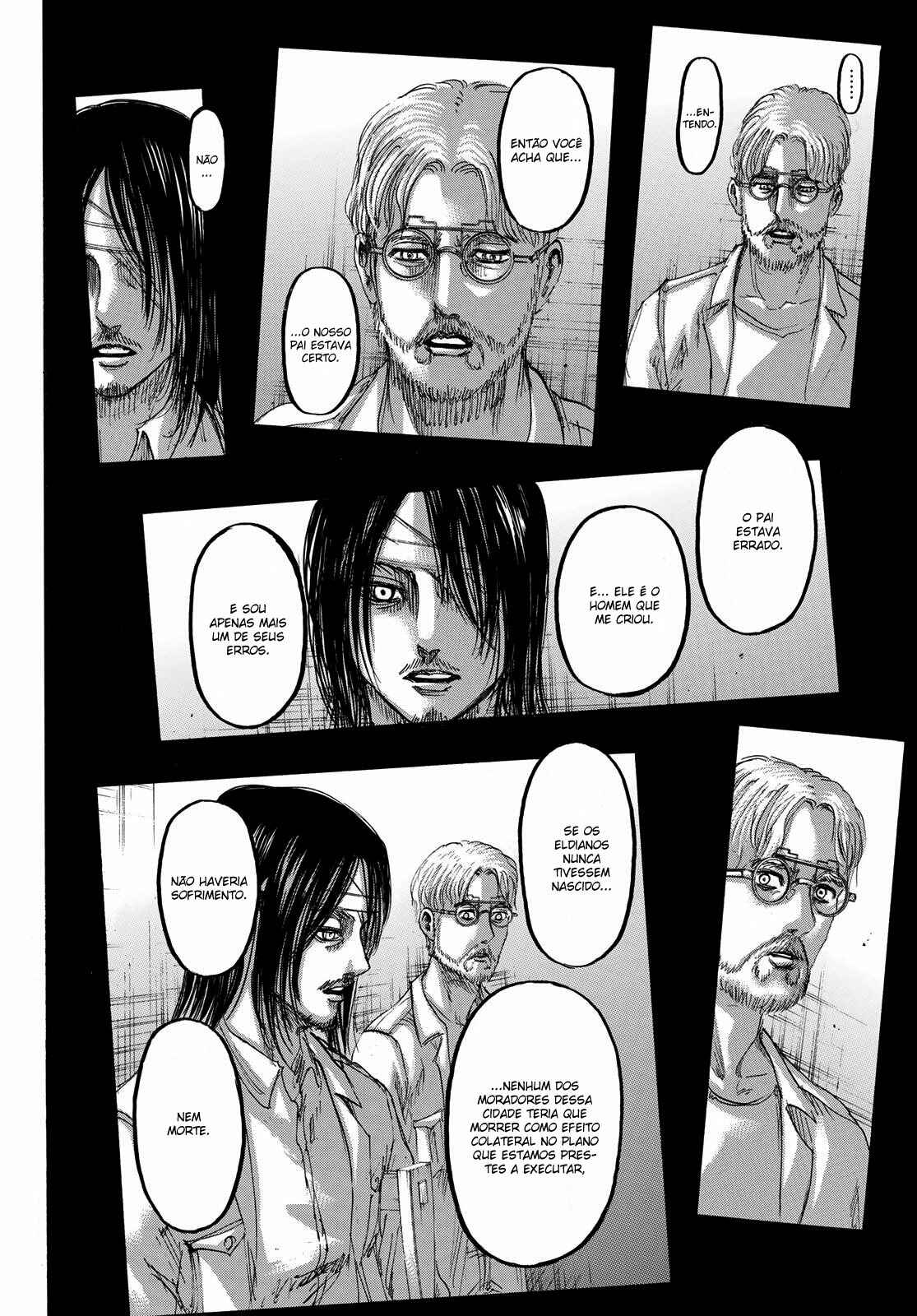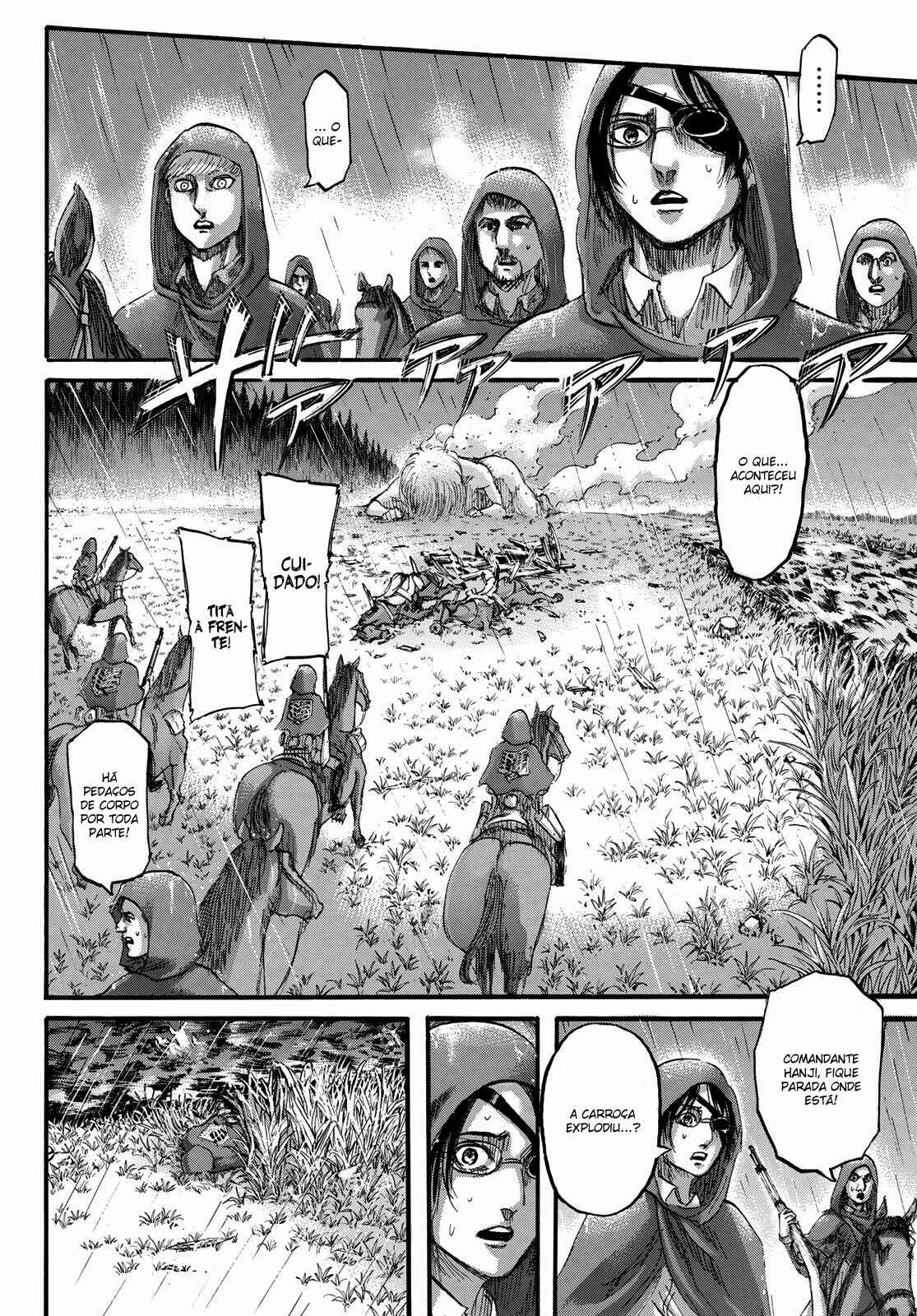 Capítulo 1 - Para Você, Após Dois Mil AnosCapítulo 2 - Aquele DiaCapítulo 3 - A Noite da GraduaçãoCapítulo 4 - Primeira BatalhaCapítulo 5 - Uma Fraca Luz em Meio ao DesesperoCapítulo 6 - O Mundo Que a Garota ViuCapítulo 7 - Lâmina PequenaCapítulo 8 - RugidoCapítulo 9 - Ouvindo as Batidas do CoraçãoCapítulo 10 - O Destino do Braço EsquerdoCapítulo 11 - RespostaCapítulo 12 - ÍconeCapítulo 13 - FeridaCapítulo 13.5Capítulo 14 - Desejo PrimordialCapítulo 15 - IndivíduosCapítulo 16 - NecessidadeCapítulo 17 - Força IlusóriaCapítulo 18 - O que Devo Fazer Agora?Capítulo 19 - Ainda Não VeemCapítulo 20 - Esquadrão de Operações EspeciaisCapítulo 21 - Abrem-se os PortõesCapítulo 22 - Formação de Detecção de Longo AlcanceCapítulo 22.5Capítulo 23 - A Titã FêmeaCapítulo 24 - A Floresta das Árvores GigantesCapítulo 25 - MordidaCapítulo 26 - Por um Caminho MelhorCapítulo 27 - Irvin SmithCapítulo 28 - Escolhas e ResultadosCapítulo 29 - Golpe de FerroCapítulo 30 - Os DerrotadosCapítulo 31 - SorrisoCapítulo 32 - ClemênciaCapítulo 33 - MuralhaCapítulo 34 - Os Guerreiros DançamCapítulo 35 - O Titã BestialCapítulo 36 - Estou em CasaCapítulo 37 - Ao SudesteCapítulo 38 - Castelo UtgardCapítulo 39 - SoldadoCapítulo 40 - YmirCapítulo 41 - HistoriaCapítulo 42 - GuerreiroCapítulo 43 - O Titã de ArmaduraCapítulo 44 - Golpear - Derrubar - DominarCapítulo 45 - Aqueles que PerseguemCapítulo 46 - AberturaCapítulo 47 - CriançasCapítulo 48 - AlguémCapítulo 49 - AtaqueCapítulo 50 - GritoCapítulo 50.5Capítulo 51 - Esquadrão LeviCapítulo 52 - Krista LenzCapítulo 53 - FumaçaCapítulo 54 - O Local do Contra-AtaqueCapítulo 55 - DorCapítulo 56 - AtoresCapítulo 57 - Kenny, o EstripadorCapítulo 58 - TiroteioCapítulo 59 - A Alma de um MonstroCapítulo 60 - ConfiançaCapítulo 61 - RespostasCapítulo 62 - CrimeCapítulo 63 - CorrentesCapítulo 64 - Festa de Boas VindasCapítulo 65 - Sonhos e MaldiçõesCapítulo 66 - DesejoCapítulo 67 - O Lado Externo do Distrito OrvudCapítulo 68 - O Rei da MuralhaCapítulo 69 - AmigosCapítulo 70 - Um Sonho do PassadoCapítulo 71 - EspectadorCapítulo 72 - A Noite da OperaçãoCapítulo 73 - A Cidade Onde Tudo ComeçouCapítulo 74 - Objetivos da MissãoCapítulo 75 - Duas Frentes de BatalhaCapítulo 76 - A Lança do TrovãoCapítulo 77 - O Mundo Que Eles ViramCapítulo 78 - VisitaCapítulo 79 - Jogo PerfeitoCapítulo 80 - Os Soldados DesconhecidosCapítulo 81 - PromessaCapítulo 82 - HeróiCapítulo 83 - Golpe de MachadoCapítulo 84 - Sol da Meia NoiteCapítulo 85 - PorãoCapítulo 86 - Aquele DiaCapítulo 87 - FronteiraCapítulo 88 - Ataque dos TitãsCapítulo 89 - ReuniãoCapítulo 90 - Para o Outro Lado da MuralhaCapítulo 91 - O Outro Lado do OceanoCapítulo 92 - Soldados de MarleyCapítulo 93 - Trem da Noite EscuraCapítulo 94 - O Garoto Dentro do MuroCapítulo 95 - MentirosoCapítulo 96 - O Portão da EsperançaCapítulo 97 - De Uma Mão para a OutraCapítulo 98 - Que BomCapítulo 99 - A Sombra de Uma Consciência CulpadaCapítulo 100 - Declaração de GuerraCapítulo 101 - O Gigante do Martelo de GuerraCapítulo 102 - E Tarde DemaisCapítulo 103 - AtaqueCapítulo 104 - VitoriososCapítulo 105 - A Bala do AssassinoCapítulo 106 - Soldados VoluntáriosCapítulo 107 - VisitanteCapítulo 108 - Um Bom ArgumentoCapítulo 109 - Aqueles Que GuiamCapítulo 110 - ImpostorCapítulo 111 - Crianças da FlorestaCapítulo 112 - IgnorânciaCapítulo 113 - ViolênciaCapítulo 114 - Única SalvaçãoCapítulo 115 - SuporteCapítulo 116 - Céu e TerraCapítulo 117 - JulgamentoCapítulo 118 - Ataque SurpresaCapítulo 119 - Irmãos Mais Velhos, Irmãos Mais NovosCapítulo 120 - Um Breve InstanteCapítulo 120 - InstanteCapítulo 121 - Memórias do FuturoCapítulo 121 - Memórias futurasCapítulo 122 - De Você 2000 Anos AtrásCapítulo 122 - De você, há 2000 anos.Capítulo 123 - Os demônios da ilhaCapítulo 123 - Demônios da ilhaCapítulo 124 - DerretimentoCapítulo 124 - DescongelamentoCapítulo 125 - Pôr do SolCapítulo 126 - OrgulhoCapítulo 126 - OrgulhoCapítulo 127 - Noite da Véspera do FimCapítulo 128 - TraidorCapítulo 129 - RetrospectivaCapítulo 130 - O amanhecer da humanidadeCapítulo 130 - Amanhecer Para a HumanidadeCapítulo 131 - EstrondoCapítulo 131 - O EstrondoCapítulo 132 - Asas da LiberdadeCapítulo 132 - As asas da liberdadeCapítulo 133 - PecadoresCapítulo 133 - PecadoresCapítulo 134 - Nas Profundezas do DesesperoCapítulo 135 - Batalha do Céu e da TerraCapítulo 135 - Batalha do Céu e da TerraCapítulo 136 - Dediquem Seus CoraçõesCapítulo 137 - TitãsCapítulo 138 - Um Longo SonhoCapítulo 139 - Em Direção a Árvore Naquela Colina
