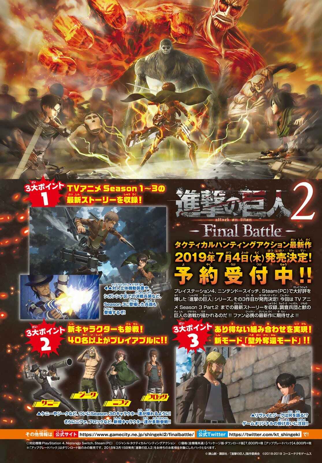 Capítulo 1 - Para Você, Após Dois Mil AnosCapítulo 2 - Aquele DiaCapítulo 3 - A Noite da GraduaçãoCapítulo 4 - Primeira BatalhaCapítulo 5 - Uma Fraca Luz em Meio ao DesesperoCapítulo 6 - O Mundo Que a Garota ViuCapítulo 7 - Lâmina PequenaCapítulo 8 - RugidoCapítulo 9 - Ouvindo as Batidas do CoraçãoCapítulo 10 - O Destino do Braço EsquerdoCapítulo 11 - RespostaCapítulo 12 - ÍconeCapítulo 13 - FeridaCapítulo 13.5Capítulo 14 - Desejo PrimordialCapítulo 15 - IndivíduosCapítulo 16 - NecessidadeCapítulo 17 - Força IlusóriaCapítulo 18 - O que Devo Fazer Agora?Capítulo 19 - Ainda Não VeemCapítulo 20 - Esquadrão de Operações EspeciaisCapítulo 21 - Abrem-se os PortõesCapítulo 22 - Formação de Detecção de Longo AlcanceCapítulo 22.5Capítulo 23 - A Titã FêmeaCapítulo 24 - A Floresta das Árvores GigantesCapítulo 25 - MordidaCapítulo 26 - Por um Caminho MelhorCapítulo 27 - Irvin SmithCapítulo 28 - Escolhas e ResultadosCapítulo 29 - Golpe de FerroCapítulo 30 - Os DerrotadosCapítulo 31 - SorrisoCapítulo 32 - ClemênciaCapítulo 33 - MuralhaCapítulo 34 - Os Guerreiros DançamCapítulo 35 - O Titã BestialCapítulo 36 - Estou em CasaCapítulo 37 - Ao SudesteCapítulo 38 - Castelo UtgardCapítulo 39 - SoldadoCapítulo 40 - YmirCapítulo 41 - HistoriaCapítulo 42 - GuerreiroCapítulo 43 - O Titã de ArmaduraCapítulo 44 - Golpear - Derrubar - DominarCapítulo 45 - Aqueles que PerseguemCapítulo 46 - AberturaCapítulo 47 - CriançasCapítulo 48 - AlguémCapítulo 49 - AtaqueCapítulo 50 - GritoCapítulo 50.5Capítulo 51 - Esquadrão LeviCapítulo 52 - Krista LenzCapítulo 53 - FumaçaCapítulo 54 - O Local do Contra-AtaqueCapítulo 55 - DorCapítulo 56 - AtoresCapítulo 57 - Kenny, o EstripadorCapítulo 58 - TiroteioCapítulo 59 - A Alma de um MonstroCapítulo 60 - ConfiançaCapítulo 61 - RespostasCapítulo 62 - CrimeCapítulo 63 - CorrentesCapítulo 64 - Festa de Boas VindasCapítulo 65 - Sonhos e MaldiçõesCapítulo 66 - DesejoCapítulo 67 - O Lado Externo do Distrito OrvudCapítulo 68 - O Rei da MuralhaCapítulo 69 - AmigosCapítulo 70 - Um Sonho do PassadoCapítulo 71 - EspectadorCapítulo 72 - A Noite da OperaçãoCapítulo 73 - A Cidade Onde Tudo ComeçouCapítulo 74 - Objetivos da MissãoCapítulo 75 - Duas Frentes de BatalhaCapítulo 76 - A Lança do TrovãoCapítulo 77 - O Mundo Que Eles ViramCapítulo 78 - VisitaCapítulo 79 - Jogo PerfeitoCapítulo 80 - Os Soldados DesconhecidosCapítulo 81 - PromessaCapítulo 82 - HeróiCapítulo 83 - Golpe de MachadoCapítulo 84 - Sol da Meia NoiteCapítulo 85 - PorãoCapítulo 86 - Aquele DiaCapítulo 87 - FronteiraCapítulo 88 - Ataque dos TitãsCapítulo 89 - ReuniãoCapítulo 90 - Para o Outro Lado da MuralhaCapítulo 91 - O Outro Lado do OceanoCapítulo 92 - Soldados de MarleyCapítulo 93 - Trem da Noite EscuraCapítulo 94 - O Garoto Dentro do MuroCapítulo 95 - MentirosoCapítulo 96 - O Portão da EsperançaCapítulo 97 - De Uma Mão para a OutraCapítulo 98 - Que BomCapítulo 99 - A Sombra de Uma Consciência CulpadaCapítulo 100 - Declaração de GuerraCapítulo 101 - O Gigante do Martelo de GuerraCapítulo 102 - E Tarde DemaisCapítulo 103 - AtaqueCapítulo 104 - VitoriososCapítulo 105 - A Bala do AssassinoCapítulo 106 - Soldados VoluntáriosCapítulo 107 - VisitanteCapítulo 108 - Um Bom ArgumentoCapítulo 109 - Aqueles Que GuiamCapítulo 110 - ImpostorCapítulo 111 - Crianças da FlorestaCapítulo 112 - IgnorânciaCapítulo 113 - ViolênciaCapítulo 114 - Única SalvaçãoCapítulo 115 - SuporteCapítulo 116 - Céu e TerraCapítulo 117 - JulgamentoCapítulo 118 - Ataque SurpresaCapítulo 119 - Irmãos Mais Velhos, Irmãos Mais NovosCapítulo 120 - Um Breve InstanteCapítulo 120 - InstanteCapítulo 121 - Memórias do FuturoCapítulo 121 - Memórias futurasCapítulo 122 - De Você 2000 Anos AtrásCapítulo 122 - De você, há 2000 anos.Capítulo 123 - Os demônios da ilhaCapítulo 123 - Demônios da ilhaCapítulo 124 - DerretimentoCapítulo 124 - DescongelamentoCapítulo 125 - Pôr do SolCapítulo 126 - OrgulhoCapítulo 126 - OrgulhoCapítulo 127 - Noite da Véspera do FimCapítulo 128 - TraidorCapítulo 129 - RetrospectivaCapítulo 130 - O amanhecer da humanidadeCapítulo 130 - Amanhecer Para a HumanidadeCapítulo 131 - EstrondoCapítulo 131 - O EstrondoCapítulo 132 - Asas da LiberdadeCapítulo 132 - As asas da liberdadeCapítulo 133 - PecadoresCapítulo 133 - PecadoresCapítulo 134 - Nas Profundezas do DesesperoCapítulo 135 - Batalha do Céu e da TerraCapítulo 135 - Batalha do Céu e da TerraCapítulo 136 - Dediquem Seus CoraçõesCapítulo 137 - TitãsCapítulo 138 - Um Longo SonhoCapítulo 139 - Em Direção a Árvore Naquela Colina