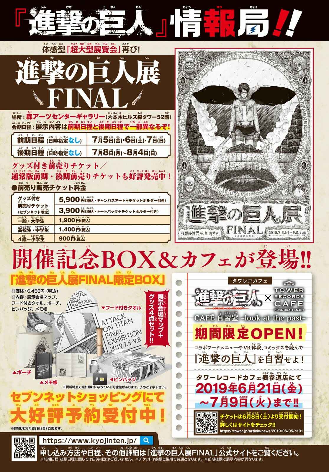 Capítulo 1 - Para Você, Após Dois Mil AnosCapítulo 2 - Aquele DiaCapítulo 3 - A Noite da GraduaçãoCapítulo 4 - Primeira BatalhaCapítulo 5 - Uma Fraca Luz em Meio ao DesesperoCapítulo 6 - O Mundo Que a Garota ViuCapítulo 7 - Lâmina PequenaCapítulo 8 - RugidoCapítulo 9 - Ouvindo as Batidas do CoraçãoCapítulo 10 - O Destino do Braço EsquerdoCapítulo 11 - RespostaCapítulo 12 - ÍconeCapítulo 13 - FeridaCapítulo 13.5Capítulo 14 - Desejo PrimordialCapítulo 15 - IndivíduosCapítulo 16 - NecessidadeCapítulo 17 - Força IlusóriaCapítulo 18 - O que Devo Fazer Agora?Capítulo 19 - Ainda Não VeemCapítulo 20 - Esquadrão de Operações EspeciaisCapítulo 21 - Abrem-se os PortõesCapítulo 22 - Formação de Detecção de Longo AlcanceCapítulo 22.5Capítulo 23 - A Titã FêmeaCapítulo 24 - A Floresta das Árvores GigantesCapítulo 25 - MordidaCapítulo 26 - Por um Caminho MelhorCapítulo 27 - Irvin SmithCapítulo 28 - Escolhas e ResultadosCapítulo 29 - Golpe de FerroCapítulo 30 - Os DerrotadosCapítulo 31 - SorrisoCapítulo 32 - ClemênciaCapítulo 33 - MuralhaCapítulo 34 - Os Guerreiros DançamCapítulo 35 - O Titã BestialCapítulo 36 - Estou em CasaCapítulo 37 - Ao SudesteCapítulo 38 - Castelo UtgardCapítulo 39 - SoldadoCapítulo 40 - YmirCapítulo 41 - HistoriaCapítulo 42 - GuerreiroCapítulo 43 - O Titã de ArmaduraCapítulo 44 - Golpear - Derrubar - DominarCapítulo 45 - Aqueles que PerseguemCapítulo 46 - AberturaCapítulo 47 - CriançasCapítulo 48 - AlguémCapítulo 49 - AtaqueCapítulo 50 - GritoCapítulo 50.5Capítulo 51 - Esquadrão LeviCapítulo 52 - Krista LenzCapítulo 53 - FumaçaCapítulo 54 - O Local do Contra-AtaqueCapítulo 55 - DorCapítulo 56 - AtoresCapítulo 57 - Kenny, o EstripadorCapítulo 58 - TiroteioCapítulo 59 - A Alma de um MonstroCapítulo 60 - ConfiançaCapítulo 61 - RespostasCapítulo 62 - CrimeCapítulo 63 - CorrentesCapítulo 64 - Festa de Boas VindasCapítulo 65 - Sonhos e MaldiçõesCapítulo 66 - DesejoCapítulo 67 - O Lado Externo do Distrito OrvudCapítulo 68 - O Rei da MuralhaCapítulo 69 - AmigosCapítulo 70 - Um Sonho do PassadoCapítulo 71 - EspectadorCapítulo 72 - A Noite da OperaçãoCapítulo 73 - A Cidade Onde Tudo ComeçouCapítulo 74 - Objetivos da MissãoCapítulo 75 - Duas Frentes de BatalhaCapítulo 76 - A Lança do TrovãoCapítulo 77 - O Mundo Que Eles ViramCapítulo 78 - VisitaCapítulo 79 - Jogo PerfeitoCapítulo 80 - Os Soldados DesconhecidosCapítulo 81 - PromessaCapítulo 82 - HeróiCapítulo 83 - Golpe de MachadoCapítulo 84 - Sol da Meia NoiteCapítulo 85 - PorãoCapítulo 86 - Aquele DiaCapítulo 87 - FronteiraCapítulo 88 - Ataque dos TitãsCapítulo 89 - ReuniãoCapítulo 90 - Para o Outro Lado da MuralhaCapítulo 91 - O Outro Lado do OceanoCapítulo 92 - Soldados de MarleyCapítulo 93 - Trem da Noite EscuraCapítulo 94 - O Garoto Dentro do MuroCapítulo 95 - MentirosoCapítulo 96 - O Portão da EsperançaCapítulo 97 - De Uma Mão para a OutraCapítulo 98 - Que BomCapítulo 99 - A Sombra de Uma Consciência CulpadaCapítulo 100 - Declaração de GuerraCapítulo 101 - O Gigante do Martelo de GuerraCapítulo 102 - E Tarde DemaisCapítulo 103 - AtaqueCapítulo 104 - VitoriososCapítulo 105 - A Bala do AssassinoCapítulo 106 - Soldados VoluntáriosCapítulo 107 - VisitanteCapítulo 108 - Um Bom ArgumentoCapítulo 109 - Aqueles Que GuiamCapítulo 110 - ImpostorCapítulo 111 - Crianças da FlorestaCapítulo 112 - IgnorânciaCapítulo 113 - ViolênciaCapítulo 114 - Única SalvaçãoCapítulo 115 - SuporteCapítulo 116 - Céu e TerraCapítulo 117 - JulgamentoCapítulo 118 - Ataque SurpresaCapítulo 119 - Irmãos Mais Velhos, Irmãos Mais NovosCapítulo 120 - Um Breve InstanteCapítulo 120 - InstanteCapítulo 121 - Memórias do FuturoCapítulo 121 - Memórias futurasCapítulo 122 - De Você 2000 Anos AtrásCapítulo 122 - De você, há 2000 anos.Capítulo 123 - Os demônios da ilhaCapítulo 123 - Demônios da ilhaCapítulo 124 - DerretimentoCapítulo 124 - DescongelamentoCapítulo 125 - Pôr do SolCapítulo 126 - OrgulhoCapítulo 126 - OrgulhoCapítulo 127 - Noite da Véspera do FimCapítulo 128 - TraidorCapítulo 129 - RetrospectivaCapítulo 130 - O amanhecer da humanidadeCapítulo 130 - Amanhecer Para a HumanidadeCapítulo 131 - EstrondoCapítulo 131 - O EstrondoCapítulo 132 - Asas da LiberdadeCapítulo 132 - As asas da liberdadeCapítulo 133 - PecadoresCapítulo 133 - PecadoresCapítulo 134 - Nas Profundezas do DesesperoCapítulo 135 - Batalha do Céu e da TerraCapítulo 135 - Batalha do Céu e da TerraCapítulo 136 - Dediquem Seus CoraçõesCapítulo 137 - TitãsCapítulo 138 - Um Longo SonhoCapítulo 139 - Em Direção a Árvore Naquela Colina