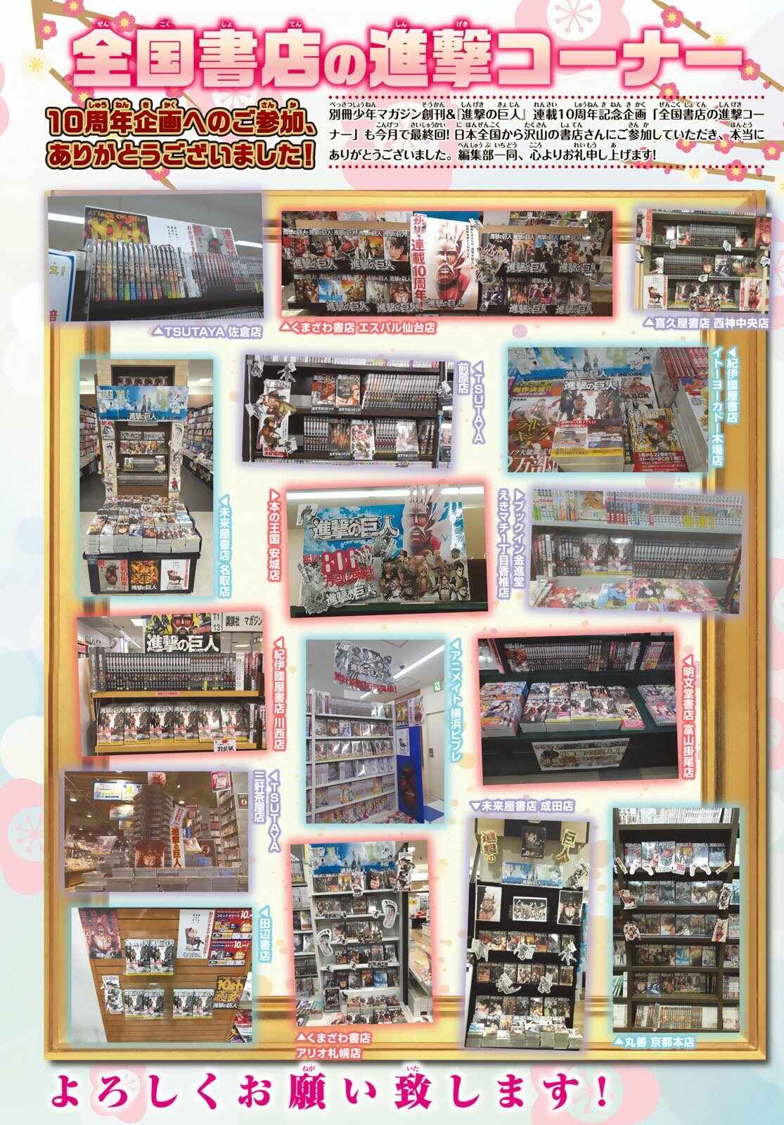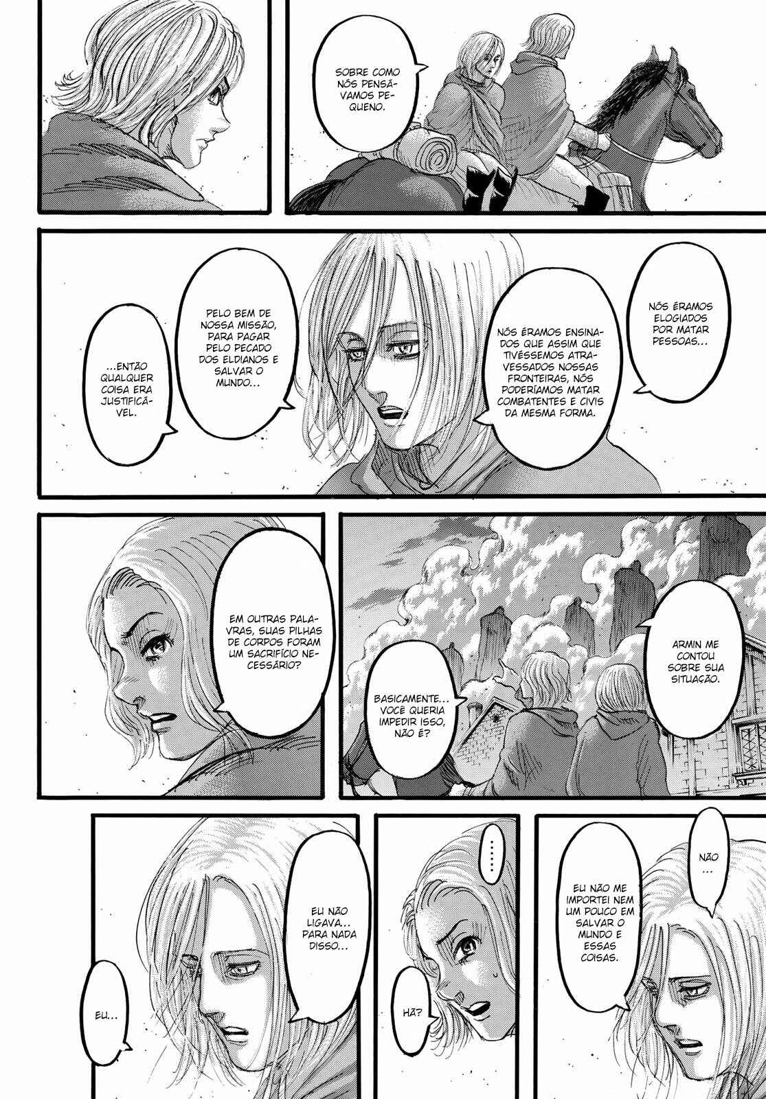 Capítulo 1 - Para Você, Após Dois Mil AnosCapítulo 2 - Aquele DiaCapítulo 3 - A Noite da GraduaçãoCapítulo 4 - Primeira BatalhaCapítulo 5 - Uma Fraca Luz em Meio ao DesesperoCapítulo 6 - O Mundo Que a Garota ViuCapítulo 7 - Lâmina PequenaCapítulo 8 - RugidoCapítulo 9 - Ouvindo as Batidas do CoraçãoCapítulo 10 - O Destino do Braço EsquerdoCapítulo 11 - RespostaCapítulo 12 - ÍconeCapítulo 13 - FeridaCapítulo 13.5Capítulo 14 - Desejo PrimordialCapítulo 15 - IndivíduosCapítulo 16 - NecessidadeCapítulo 17 - Força IlusóriaCapítulo 18 - O que Devo Fazer Agora?Capítulo 19 - Ainda Não VeemCapítulo 20 - Esquadrão de Operações EspeciaisCapítulo 21 - Abrem-se os PortõesCapítulo 22 - Formação de Detecção de Longo AlcanceCapítulo 22.5Capítulo 23 - A Titã FêmeaCapítulo 24 - A Floresta das Árvores GigantesCapítulo 25 - MordidaCapítulo 26 - Por um Caminho MelhorCapítulo 27 - Irvin SmithCapítulo 28 - Escolhas e ResultadosCapítulo 29 - Golpe de FerroCapítulo 30 - Os DerrotadosCapítulo 31 - SorrisoCapítulo 32 - ClemênciaCapítulo 33 - MuralhaCapítulo 34 - Os Guerreiros DançamCapítulo 35 - O Titã BestialCapítulo 36 - Estou em CasaCapítulo 37 - Ao SudesteCapítulo 38 - Castelo UtgardCapítulo 39 - SoldadoCapítulo 40 - YmirCapítulo 41 - HistoriaCapítulo 42 - GuerreiroCapítulo 43 - O Titã de ArmaduraCapítulo 44 - Golpear - Derrubar - DominarCapítulo 45 - Aqueles que PerseguemCapítulo 46 - AberturaCapítulo 47 - CriançasCapítulo 48 - AlguémCapítulo 49 - AtaqueCapítulo 50 - GritoCapítulo 50.5Capítulo 51 - Esquadrão LeviCapítulo 52 - Krista LenzCapítulo 53 - FumaçaCapítulo 54 - O Local do Contra-AtaqueCapítulo 55 - DorCapítulo 56 - AtoresCapítulo 57 - Kenny, o EstripadorCapítulo 58 - TiroteioCapítulo 59 - A Alma de um MonstroCapítulo 60 - ConfiançaCapítulo 61 - RespostasCapítulo 62 - CrimeCapítulo 63 - CorrentesCapítulo 64 - Festa de Boas VindasCapítulo 65 - Sonhos e MaldiçõesCapítulo 66 - DesejoCapítulo 67 - O Lado Externo do Distrito OrvudCapítulo 68 - O Rei da MuralhaCapítulo 69 - AmigosCapítulo 70 - Um Sonho do PassadoCapítulo 71 - EspectadorCapítulo 72 - A Noite da OperaçãoCapítulo 73 - A Cidade Onde Tudo ComeçouCapítulo 74 - Objetivos da MissãoCapítulo 75 - Duas Frentes de BatalhaCapítulo 76 - A Lança do TrovãoCapítulo 77 - O Mundo Que Eles ViramCapítulo 78 - VisitaCapítulo 79 - Jogo PerfeitoCapítulo 80 - Os Soldados DesconhecidosCapítulo 81 - PromessaCapítulo 82 - HeróiCapítulo 83 - Golpe de MachadoCapítulo 84 - Sol da Meia NoiteCapítulo 85 - PorãoCapítulo 86 - Aquele DiaCapítulo 87 - FronteiraCapítulo 88 - Ataque dos TitãsCapítulo 89 - ReuniãoCapítulo 90 - Para o Outro Lado da MuralhaCapítulo 91 - O Outro Lado do OceanoCapítulo 92 - Soldados de MarleyCapítulo 93 - Trem da Noite EscuraCapítulo 94 - O Garoto Dentro do MuroCapítulo 95 - MentirosoCapítulo 96 - O Portão da EsperançaCapítulo 97 - De Uma Mão para a OutraCapítulo 98 - Que BomCapítulo 99 - A Sombra de Uma Consciência CulpadaCapítulo 100 - Declaração de GuerraCapítulo 101 - O Gigante do Martelo de GuerraCapítulo 102 - E Tarde DemaisCapítulo 103 - AtaqueCapítulo 104 - VitoriososCapítulo 105 - A Bala do AssassinoCapítulo 106 - Soldados VoluntáriosCapítulo 107 - VisitanteCapítulo 108 - Um Bom ArgumentoCapítulo 109 - Aqueles Que GuiamCapítulo 110 - ImpostorCapítulo 111 - Crianças da FlorestaCapítulo 112 - IgnorânciaCapítulo 113 - ViolênciaCapítulo 114 - Única SalvaçãoCapítulo 115 - SuporteCapítulo 116 - Céu e TerraCapítulo 117 - JulgamentoCapítulo 118 - Ataque SurpresaCapítulo 119 - Irmãos Mais Velhos, Irmãos Mais NovosCapítulo 120 - Um Breve InstanteCapítulo 120 - InstanteCapítulo 121 - Memórias do FuturoCapítulo 121 - Memórias futurasCapítulo 122 - De Você 2000 Anos AtrásCapítulo 122 - De você, há 2000 anos.Capítulo 123 - Os demônios da ilhaCapítulo 123 - Demônios da ilhaCapítulo 124 - DerretimentoCapítulo 124 - DescongelamentoCapítulo 125 - Pôr do SolCapítulo 126 - OrgulhoCapítulo 126 - OrgulhoCapítulo 127 - Noite da Véspera do FimCapítulo 128 - TraidorCapítulo 129 - RetrospectivaCapítulo 130 - O amanhecer da humanidadeCapítulo 130 - Amanhecer Para a HumanidadeCapítulo 131 - EstrondoCapítulo 131 - O EstrondoCapítulo 132 - Asas da LiberdadeCapítulo 132 - As asas da liberdadeCapítulo 133 - PecadoresCapítulo 133 - PecadoresCapítulo 134 - Nas Profundezas do DesesperoCapítulo 135 - Batalha do Céu e da TerraCapítulo 135 - Batalha do Céu e da TerraCapítulo 136 - Dediquem Seus CoraçõesCapítulo 137 - TitãsCapítulo 138 - Um Longo SonhoCapítulo 139 - Em Direção a Árvore Naquela Colina