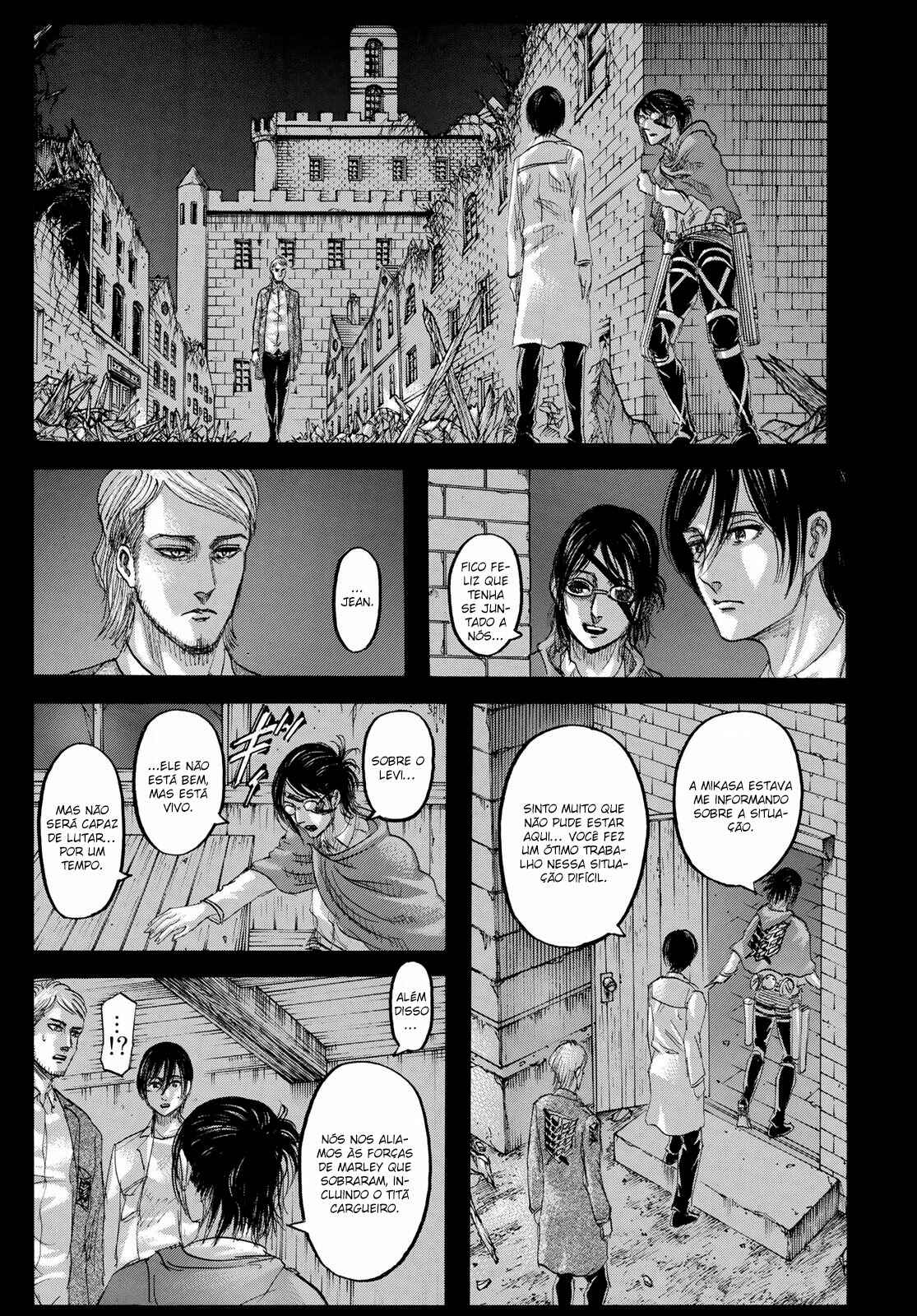 Capítulo 1 - Para Você, Após Dois Mil AnosCapítulo 2 - Aquele DiaCapítulo 3 - A Noite da GraduaçãoCapítulo 4 - Primeira BatalhaCapítulo 5 - Uma Fraca Luz em Meio ao DesesperoCapítulo 6 - O Mundo Que a Garota ViuCapítulo 7 - Lâmina PequenaCapítulo 8 - RugidoCapítulo 9 - Ouvindo as Batidas do CoraçãoCapítulo 10 - O Destino do Braço EsquerdoCapítulo 11 - RespostaCapítulo 12 - ÍconeCapítulo 13 - FeridaCapítulo 13.5Capítulo 14 - Desejo PrimordialCapítulo 15 - IndivíduosCapítulo 16 - NecessidadeCapítulo 17 - Força IlusóriaCapítulo 18 - O que Devo Fazer Agora?Capítulo 19 - Ainda Não VeemCapítulo 20 - Esquadrão de Operações EspeciaisCapítulo 21 - Abrem-se os PortõesCapítulo 22 - Formação de Detecção de Longo AlcanceCapítulo 22.5Capítulo 23 - A Titã FêmeaCapítulo 24 - A Floresta das Árvores GigantesCapítulo 25 - MordidaCapítulo 26 - Por um Caminho MelhorCapítulo 27 - Irvin SmithCapítulo 28 - Escolhas e ResultadosCapítulo 29 - Golpe de FerroCapítulo 30 - Os DerrotadosCapítulo 31 - SorrisoCapítulo 32 - ClemênciaCapítulo 33 - MuralhaCapítulo 34 - Os Guerreiros DançamCapítulo 35 - O Titã BestialCapítulo 36 - Estou em CasaCapítulo 37 - Ao SudesteCapítulo 38 - Castelo UtgardCapítulo 39 - SoldadoCapítulo 40 - YmirCapítulo 41 - HistoriaCapítulo 42 - GuerreiroCapítulo 43 - O Titã de ArmaduraCapítulo 44 - Golpear - Derrubar - DominarCapítulo 45 - Aqueles que PerseguemCapítulo 46 - AberturaCapítulo 47 - CriançasCapítulo 48 - AlguémCapítulo 49 - AtaqueCapítulo 50 - GritoCapítulo 50.5Capítulo 51 - Esquadrão LeviCapítulo 52 - Krista LenzCapítulo 53 - FumaçaCapítulo 54 - O Local do Contra-AtaqueCapítulo 55 - DorCapítulo 56 - AtoresCapítulo 57 - Kenny, o EstripadorCapítulo 58 - TiroteioCapítulo 59 - A Alma de um MonstroCapítulo 60 - ConfiançaCapítulo 61 - RespostasCapítulo 62 - CrimeCapítulo 63 - CorrentesCapítulo 64 - Festa de Boas VindasCapítulo 65 - Sonhos e MaldiçõesCapítulo 66 - DesejoCapítulo 67 - O Lado Externo do Distrito OrvudCapítulo 68 - O Rei da MuralhaCapítulo 69 - AmigosCapítulo 70 - Um Sonho do PassadoCapítulo 71 - EspectadorCapítulo 72 - A Noite da OperaçãoCapítulo 73 - A Cidade Onde Tudo ComeçouCapítulo 74 - Objetivos da MissãoCapítulo 75 - Duas Frentes de BatalhaCapítulo 76 - A Lança do TrovãoCapítulo 77 - O Mundo Que Eles ViramCapítulo 78 - VisitaCapítulo 79 - Jogo PerfeitoCapítulo 80 - Os Soldados DesconhecidosCapítulo 81 - PromessaCapítulo 82 - HeróiCapítulo 83 - Golpe de MachadoCapítulo 84 - Sol da Meia NoiteCapítulo 85 - PorãoCapítulo 86 - Aquele DiaCapítulo 87 - FronteiraCapítulo 88 - Ataque dos TitãsCapítulo 89 - ReuniãoCapítulo 90 - Para o Outro Lado da MuralhaCapítulo 91 - O Outro Lado do OceanoCapítulo 92 - Soldados de MarleyCapítulo 93 - Trem da Noite EscuraCapítulo 94 - O Garoto Dentro do MuroCapítulo 95 - MentirosoCapítulo 96 - O Portão da EsperançaCapítulo 97 - De Uma Mão para a OutraCapítulo 98 - Que BomCapítulo 99 - A Sombra de Uma Consciência CulpadaCapítulo 100 - Declaração de GuerraCapítulo 101 - O Gigante do Martelo de GuerraCapítulo 102 - E Tarde DemaisCapítulo 103 - AtaqueCapítulo 104 - VitoriososCapítulo 105 - A Bala do AssassinoCapítulo 106 - Soldados VoluntáriosCapítulo 107 - VisitanteCapítulo 108 - Um Bom ArgumentoCapítulo 109 - Aqueles Que GuiamCapítulo 110 - ImpostorCapítulo 111 - Crianças da FlorestaCapítulo 112 - IgnorânciaCapítulo 113 - ViolênciaCapítulo 114 - Única SalvaçãoCapítulo 115 - SuporteCapítulo 116 - Céu e TerraCapítulo 117 - JulgamentoCapítulo 118 - Ataque SurpresaCapítulo 119 - Irmãos Mais Velhos, Irmãos Mais NovosCapítulo 120 - Um Breve InstanteCapítulo 120 - InstanteCapítulo 121 - Memórias do FuturoCapítulo 121 - Memórias futurasCapítulo 122 - De Você 2000 Anos AtrásCapítulo 122 - De você, há 2000 anos.Capítulo 123 - Os demônios da ilhaCapítulo 123 - Demônios da ilhaCapítulo 124 - DerretimentoCapítulo 124 - DescongelamentoCapítulo 125 - Pôr do SolCapítulo 126 - OrgulhoCapítulo 126 - OrgulhoCapítulo 127 - Noite da Véspera do FimCapítulo 128 - TraidorCapítulo 129 - RetrospectivaCapítulo 130 - O amanhecer da humanidadeCapítulo 130 - Amanhecer Para a HumanidadeCapítulo 131 - EstrondoCapítulo 131 - O EstrondoCapítulo 132 - Asas da LiberdadeCapítulo 132 - As asas da liberdadeCapítulo 133 - PecadoresCapítulo 133 - PecadoresCapítulo 134 - Nas Profundezas do DesesperoCapítulo 135 - Batalha do Céu e da TerraCapítulo 135 - Batalha do Céu e da TerraCapítulo 136 - Dediquem Seus CoraçõesCapítulo 137 - TitãsCapítulo 138 - Um Longo SonhoCapítulo 139 - Em Direção a Árvore Naquela Colina