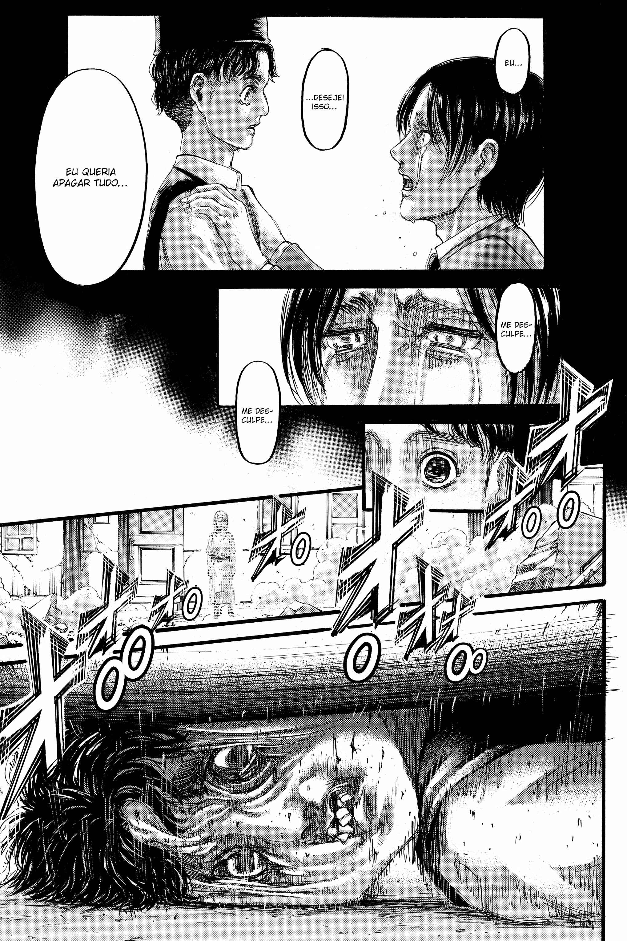 Capítulo 1 - Para Você, Após Dois Mil AnosCapítulo 2 - Aquele DiaCapítulo 3 - A Noite da GraduaçãoCapítulo 4 - Primeira BatalhaCapítulo 5 - Uma Fraca Luz em Meio ao DesesperoCapítulo 6 - O Mundo Que a Garota ViuCapítulo 7 - Lâmina PequenaCapítulo 8 - RugidoCapítulo 9 - Ouvindo as Batidas do CoraçãoCapítulo 10 - O Destino do Braço EsquerdoCapítulo 11 - RespostaCapítulo 12 - ÍconeCapítulo 13 - FeridaCapítulo 13.5Capítulo 14 - Desejo PrimordialCapítulo 15 - IndivíduosCapítulo 16 - NecessidadeCapítulo 17 - Força IlusóriaCapítulo 18 - O que Devo Fazer Agora?Capítulo 19 - Ainda Não VeemCapítulo 20 - Esquadrão de Operações EspeciaisCapítulo 21 - Abrem-se os PortõesCapítulo 22 - Formação de Detecção de Longo AlcanceCapítulo 22.5Capítulo 23 - A Titã FêmeaCapítulo 24 - A Floresta das Árvores GigantesCapítulo 25 - MordidaCapítulo 26 - Por um Caminho MelhorCapítulo 27 - Irvin SmithCapítulo 28 - Escolhas e ResultadosCapítulo 29 - Golpe de FerroCapítulo 30 - Os DerrotadosCapítulo 31 - SorrisoCapítulo 32 - ClemênciaCapítulo 33 - MuralhaCapítulo 34 - Os Guerreiros DançamCapítulo 35 - O Titã BestialCapítulo 36 - Estou em CasaCapítulo 37 - Ao SudesteCapítulo 38 - Castelo UtgardCapítulo 39 - SoldadoCapítulo 40 - YmirCapítulo 41 - HistoriaCapítulo 42 - GuerreiroCapítulo 43 - O Titã de ArmaduraCapítulo 44 - Golpear - Derrubar - DominarCapítulo 45 - Aqueles que PerseguemCapítulo 46 - AberturaCapítulo 47 - CriançasCapítulo 48 - AlguémCapítulo 49 - AtaqueCapítulo 50 - GritoCapítulo 50.5Capítulo 51 - Esquadrão LeviCapítulo 52 - Krista LenzCapítulo 53 - FumaçaCapítulo 54 - O Local do Contra-AtaqueCapítulo 55 - DorCapítulo 56 - AtoresCapítulo 57 - Kenny, o EstripadorCapítulo 58 - TiroteioCapítulo 59 - A Alma de um MonstroCapítulo 60 - ConfiançaCapítulo 61 - RespostasCapítulo 62 - CrimeCapítulo 63 - CorrentesCapítulo 64 - Festa de Boas VindasCapítulo 65 - Sonhos e MaldiçõesCapítulo 66 - DesejoCapítulo 67 - O Lado Externo do Distrito OrvudCapítulo 68 - O Rei da MuralhaCapítulo 69 - AmigosCapítulo 70 - Um Sonho do PassadoCapítulo 71 - EspectadorCapítulo 72 - A Noite da OperaçãoCapítulo 73 - A Cidade Onde Tudo ComeçouCapítulo 74 - Objetivos da MissãoCapítulo 75 - Duas Frentes de BatalhaCapítulo 76 - A Lança do TrovãoCapítulo 77 - O Mundo Que Eles ViramCapítulo 78 - VisitaCapítulo 79 - Jogo PerfeitoCapítulo 80 - Os Soldados DesconhecidosCapítulo 81 - PromessaCapítulo 82 - HeróiCapítulo 83 - Golpe de MachadoCapítulo 84 - Sol da Meia NoiteCapítulo 85 - PorãoCapítulo 86 - Aquele DiaCapítulo 87 - FronteiraCapítulo 88 - Ataque dos TitãsCapítulo 89 - ReuniãoCapítulo 90 - Para o Outro Lado da MuralhaCapítulo 91 - O Outro Lado do OceanoCapítulo 92 - Soldados de MarleyCapítulo 93 - Trem da Noite EscuraCapítulo 94 - O Garoto Dentro do MuroCapítulo 95 - MentirosoCapítulo 96 - O Portão da EsperançaCapítulo 97 - De Uma Mão para a OutraCapítulo 98 - Que BomCapítulo 99 - A Sombra de Uma Consciência CulpadaCapítulo 100 - Declaração de GuerraCapítulo 101 - O Gigante do Martelo de GuerraCapítulo 102 - E Tarde DemaisCapítulo 103 - AtaqueCapítulo 104 - VitoriososCapítulo 105 - A Bala do AssassinoCapítulo 106 - Soldados VoluntáriosCapítulo 107 - VisitanteCapítulo 108 - Um Bom ArgumentoCapítulo 109 - Aqueles Que GuiamCapítulo 110 - ImpostorCapítulo 111 - Crianças da FlorestaCapítulo 112 - IgnorânciaCapítulo 113 - ViolênciaCapítulo 114 - Única SalvaçãoCapítulo 115 - SuporteCapítulo 116 - Céu e TerraCapítulo 117 - JulgamentoCapítulo 118 - Ataque SurpresaCapítulo 119 - Irmãos Mais Velhos, Irmãos Mais NovosCapítulo 120 - Um Breve InstanteCapítulo 120 - InstanteCapítulo 121 - Memórias do FuturoCapítulo 121 - Memórias futurasCapítulo 122 - De Você 2000 Anos AtrásCapítulo 122 - De você, há 2000 anos.Capítulo 123 - Os demônios da ilhaCapítulo 123 - Demônios da ilhaCapítulo 124 - DerretimentoCapítulo 124 - DescongelamentoCapítulo 125 - Pôr do SolCapítulo 126 - OrgulhoCapítulo 126 - OrgulhoCapítulo 127 - Noite da Véspera do FimCapítulo 128 - TraidorCapítulo 129 - RetrospectivaCapítulo 130 - O amanhecer da humanidadeCapítulo 130 - Amanhecer Para a HumanidadeCapítulo 131 - EstrondoCapítulo 131 - O EstrondoCapítulo 132 - Asas da LiberdadeCapítulo 132 - As asas da liberdadeCapítulo 133 - PecadoresCapítulo 133 - PecadoresCapítulo 134 - Nas Profundezas do DesesperoCapítulo 135 - Batalha do Céu e da TerraCapítulo 135 - Batalha do Céu e da TerraCapítulo 136 - Dediquem Seus CoraçõesCapítulo 137 - TitãsCapítulo 138 - Um Longo SonhoCapítulo 139 - Em Direção a Árvore Naquela Colina
