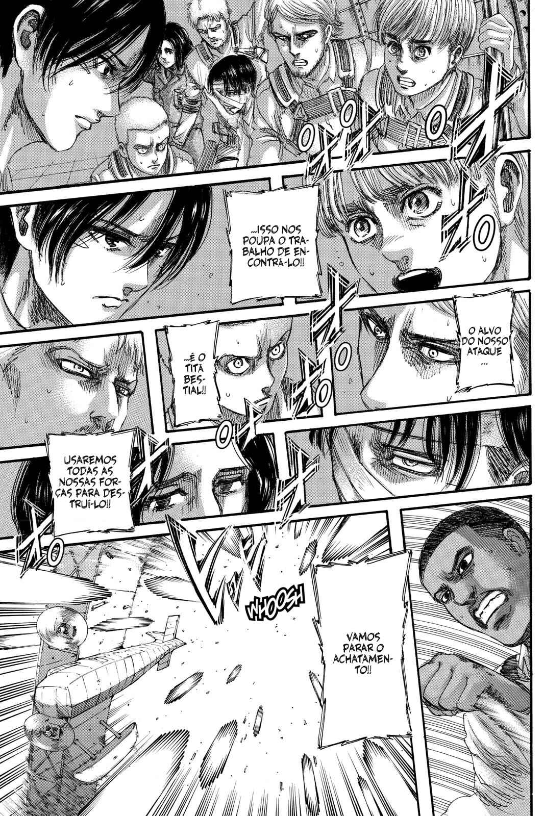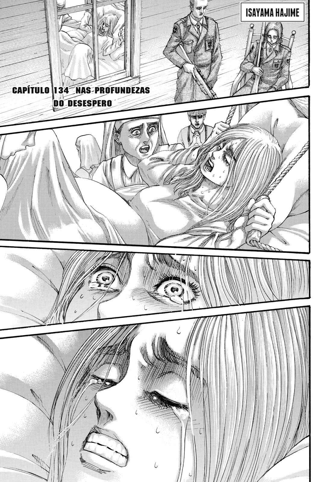Capítulo 1 - Para Você, Após Dois Mil AnosCapítulo 2 - Aquele DiaCapítulo 3 - A Noite da GraduaçãoCapítulo 4 - Primeira BatalhaCapítulo 5 - Uma Fraca Luz em Meio ao DesesperoCapítulo 6 - O Mundo Que a Garota ViuCapítulo 7 - Lâmina PequenaCapítulo 8 - RugidoCapítulo 9 - Ouvindo as Batidas do CoraçãoCapítulo 10 - O Destino do Braço EsquerdoCapítulo 11 - RespostaCapítulo 12 - ÍconeCapítulo 13 - FeridaCapítulo 13.5Capítulo 14 - Desejo PrimordialCapítulo 15 - IndivíduosCapítulo 16 - NecessidadeCapítulo 17 - Força IlusóriaCapítulo 18 - O que Devo Fazer Agora?Capítulo 19 - Ainda Não VeemCapítulo 20 - Esquadrão de Operações EspeciaisCapítulo 21 - Abrem-se os PortõesCapítulo 22 - Formação de Detecção de Longo AlcanceCapítulo 22.5Capítulo 23 - A Titã FêmeaCapítulo 24 - A Floresta das Árvores GigantesCapítulo 25 - MordidaCapítulo 26 - Por um Caminho MelhorCapítulo 27 - Irvin SmithCapítulo 28 - Escolhas e ResultadosCapítulo 29 - Golpe de FerroCapítulo 30 - Os DerrotadosCapítulo 31 - SorrisoCapítulo 32 - ClemênciaCapítulo 33 - MuralhaCapítulo 34 - Os Guerreiros DançamCapítulo 35 - O Titã BestialCapítulo 36 - Estou em CasaCapítulo 37 - Ao SudesteCapítulo 38 - Castelo UtgardCapítulo 39 - SoldadoCapítulo 40 - YmirCapítulo 41 - HistoriaCapítulo 42 - GuerreiroCapítulo 43 - O Titã de ArmaduraCapítulo 44 - Golpear - Derrubar - DominarCapítulo 45 - Aqueles que PerseguemCapítulo 46 - AberturaCapítulo 47 - CriançasCapítulo 48 - AlguémCapítulo 49 - AtaqueCapítulo 50 - GritoCapítulo 50.5Capítulo 51 - Esquadrão LeviCapítulo 52 - Krista LenzCapítulo 53 - FumaçaCapítulo 54 - O Local do Contra-AtaqueCapítulo 55 - DorCapítulo 56 - AtoresCapítulo 57 - Kenny, o EstripadorCapítulo 58 - TiroteioCapítulo 59 - A Alma de um MonstroCapítulo 60 - ConfiançaCapítulo 61 - RespostasCapítulo 62 - CrimeCapítulo 63 - CorrentesCapítulo 64 - Festa de Boas VindasCapítulo 65 - Sonhos e MaldiçõesCapítulo 66 - DesejoCapítulo 67 - O Lado Externo do Distrito OrvudCapítulo 68 - O Rei da MuralhaCapítulo 69 - AmigosCapítulo 70 - Um Sonho do PassadoCapítulo 71 - EspectadorCapítulo 72 - A Noite da OperaçãoCapítulo 73 - A Cidade Onde Tudo ComeçouCapítulo 74 - Objetivos da MissãoCapítulo 75 - Duas Frentes de BatalhaCapítulo 76 - A Lança do TrovãoCapítulo 77 - O Mundo Que Eles ViramCapítulo 78 - VisitaCapítulo 79 - Jogo PerfeitoCapítulo 80 - Os Soldados DesconhecidosCapítulo 81 - PromessaCapítulo 82 - HeróiCapítulo 83 - Golpe de MachadoCapítulo 84 - Sol da Meia NoiteCapítulo 85 - PorãoCapítulo 86 - Aquele DiaCapítulo 87 - FronteiraCapítulo 88 - Ataque dos TitãsCapítulo 89 - ReuniãoCapítulo 90 - Para o Outro Lado da MuralhaCapítulo 91 - O Outro Lado do OceanoCapítulo 92 - Soldados de MarleyCapítulo 93 - Trem da Noite EscuraCapítulo 94 - O Garoto Dentro do MuroCapítulo 95 - MentirosoCapítulo 96 - O Portão da EsperançaCapítulo 97 - De Uma Mão para a OutraCapítulo 98 - Que BomCapítulo 99 - A Sombra de Uma Consciência CulpadaCapítulo 100 - Declaração de GuerraCapítulo 101 - O Gigante do Martelo de GuerraCapítulo 102 - E Tarde DemaisCapítulo 103 - AtaqueCapítulo 104 - VitoriososCapítulo 105 - A Bala do AssassinoCapítulo 106 - Soldados VoluntáriosCapítulo 107 - VisitanteCapítulo 108 - Um Bom ArgumentoCapítulo 109 - Aqueles Que GuiamCapítulo 110 - ImpostorCapítulo 111 - Crianças da FlorestaCapítulo 112 - IgnorânciaCapítulo 113 - ViolênciaCapítulo 114 - Única SalvaçãoCapítulo 115 - SuporteCapítulo 116 - Céu e TerraCapítulo 117 - JulgamentoCapítulo 118 - Ataque SurpresaCapítulo 119 - Irmãos Mais Velhos, Irmãos Mais NovosCapítulo 120 - Um Breve InstanteCapítulo 120 - InstanteCapítulo 121 - Memórias do FuturoCapítulo 121 - Memórias futurasCapítulo 122 - De Você 2000 Anos AtrásCapítulo 122 - De você, há 2000 anos.Capítulo 123 - Os demônios da ilhaCapítulo 123 - Demônios da ilhaCapítulo 124 - DerretimentoCapítulo 124 - DescongelamentoCapítulo 125 - Pôr do SolCapítulo 126 - OrgulhoCapítulo 126 - OrgulhoCapítulo 127 - Noite da Véspera do FimCapítulo 128 - TraidorCapítulo 129 - RetrospectivaCapítulo 130 - O amanhecer da humanidadeCapítulo 130 - Amanhecer Para a HumanidadeCapítulo 131 - EstrondoCapítulo 131 - O EstrondoCapítulo 132 - Asas da LiberdadeCapítulo 132 - As asas da liberdadeCapítulo 133 - PecadoresCapítulo 133 - PecadoresCapítulo 134 - Nas Profundezas do DesesperoCapítulo 135 - Batalha do Céu e da TerraCapítulo 135 - Batalha do Céu e da TerraCapítulo 136 - Dediquem Seus CoraçõesCapítulo 137 - TitãsCapítulo 138 - Um Longo SonhoCapítulo 139 - Em Direção a Árvore Naquela Colina