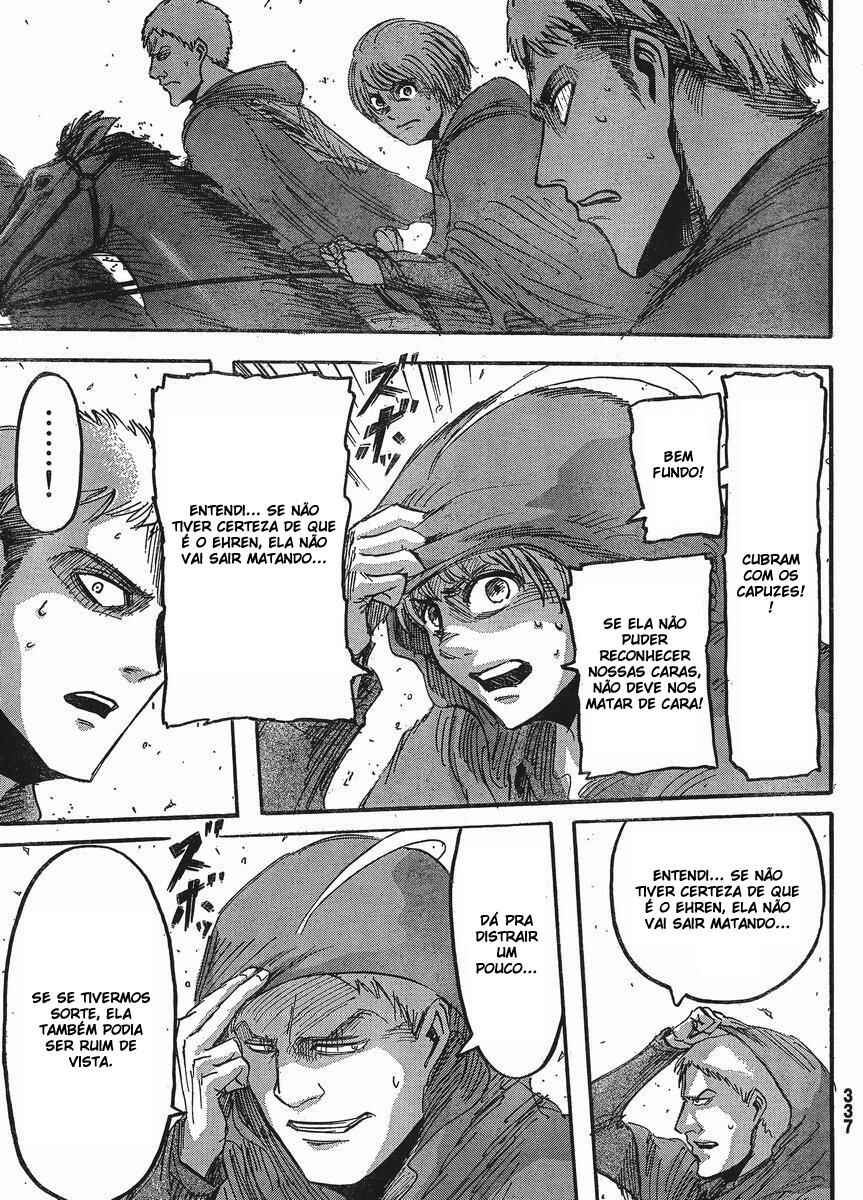 Capítulo 1 - Para Você, Após Dois Mil AnosCapítulo 2 - Aquele DiaCapítulo 3 - A Noite da GraduaçãoCapítulo 4 - Primeira BatalhaCapítulo 5 - Uma Fraca Luz em Meio ao DesesperoCapítulo 6 - O Mundo Que a Garota ViuCapítulo 7 - Lâmina PequenaCapítulo 8 - RugidoCapítulo 9 - Ouvindo as Batidas do CoraçãoCapítulo 10 - O Destino do Braço EsquerdoCapítulo 11 - RespostaCapítulo 12 - ÍconeCapítulo 13 - FeridaCapítulo 13.5Capítulo 14 - Desejo PrimordialCapítulo 15 - IndivíduosCapítulo 16 - NecessidadeCapítulo 17 - Força IlusóriaCapítulo 18 - O que Devo Fazer Agora?Capítulo 19 - Ainda Não VeemCapítulo 20 - Esquadrão de Operações EspeciaisCapítulo 21 - Abrem-se os PortõesCapítulo 22 - Formação de Detecção de Longo AlcanceCapítulo 22.5Capítulo 23 - A Titã FêmeaCapítulo 24 - A Floresta das Árvores GigantesCapítulo 25 - MordidaCapítulo 26 - Por um Caminho MelhorCapítulo 27 - Irvin SmithCapítulo 28 - Escolhas e ResultadosCapítulo 29 - Golpe de FerroCapítulo 30 - Os DerrotadosCapítulo 31 - SorrisoCapítulo 32 - ClemênciaCapítulo 33 - MuralhaCapítulo 34 - Os Guerreiros DançamCapítulo 35 - O Titã BestialCapítulo 36 - Estou em CasaCapítulo 37 - Ao SudesteCapítulo 38 - Castelo UtgardCapítulo 39 - SoldadoCapítulo 40 - YmirCapítulo 41 - HistoriaCapítulo 42 - GuerreiroCapítulo 43 - O Titã de ArmaduraCapítulo 44 - Golpear - Derrubar - DominarCapítulo 45 - Aqueles que PerseguemCapítulo 46 - AberturaCapítulo 47 - CriançasCapítulo 48 - AlguémCapítulo 49 - AtaqueCapítulo 50 - GritoCapítulo 50.5Capítulo 51 - Esquadrão LeviCapítulo 52 - Krista LenzCapítulo 53 - FumaçaCapítulo 54 - O Local do Contra-AtaqueCapítulo 55 - DorCapítulo 56 - AtoresCapítulo 57 - Kenny, o EstripadorCapítulo 58 - TiroteioCapítulo 59 - A Alma de um MonstroCapítulo 60 - ConfiançaCapítulo 61 - RespostasCapítulo 62 - CrimeCapítulo 63 - CorrentesCapítulo 64 - Festa de Boas VindasCapítulo 65 - Sonhos e MaldiçõesCapítulo 66 - DesejoCapítulo 67 - O Lado Externo do Distrito OrvudCapítulo 68 - O Rei da MuralhaCapítulo 69 - AmigosCapítulo 70 - Um Sonho do PassadoCapítulo 71 - EspectadorCapítulo 72 - A Noite da OperaçãoCapítulo 73 - A Cidade Onde Tudo ComeçouCapítulo 74 - Objetivos da MissãoCapítulo 75 - Duas Frentes de BatalhaCapítulo 76 - A Lança do TrovãoCapítulo 77 - O Mundo Que Eles ViramCapítulo 78 - VisitaCapítulo 79 - Jogo PerfeitoCapítulo 80 - Os Soldados DesconhecidosCapítulo 81 - PromessaCapítulo 82 - HeróiCapítulo 83 - Golpe de MachadoCapítulo 84 - Sol da Meia NoiteCapítulo 85 - PorãoCapítulo 86 - Aquele DiaCapítulo 87 - FronteiraCapítulo 88 - Ataque dos TitãsCapítulo 89 - ReuniãoCapítulo 90 - Para o Outro Lado da MuralhaCapítulo 91 - O Outro Lado do OceanoCapítulo 92 - Soldados de MarleyCapítulo 93 - Trem da Noite EscuraCapítulo 94 - O Garoto Dentro do MuroCapítulo 95 - MentirosoCapítulo 96 - O Portão da EsperançaCapítulo 97 - De Uma Mão para a OutraCapítulo 98 - Que BomCapítulo 99 - A Sombra de Uma Consciência CulpadaCapítulo 100 - Declaração de GuerraCapítulo 101 - O Gigante do Martelo de GuerraCapítulo 102 - E Tarde DemaisCapítulo 103 - AtaqueCapítulo 104 - VitoriososCapítulo 105 - A Bala do AssassinoCapítulo 106 - Soldados VoluntáriosCapítulo 107 - VisitanteCapítulo 108 - Um Bom ArgumentoCapítulo 109 - Aqueles Que GuiamCapítulo 110 - ImpostorCapítulo 111 - Crianças da FlorestaCapítulo 112 - IgnorânciaCapítulo 113 - ViolênciaCapítulo 114 - Única SalvaçãoCapítulo 115 - SuporteCapítulo 116 - Céu e TerraCapítulo 117 - JulgamentoCapítulo 118 - Ataque SurpresaCapítulo 119 - Irmãos Mais Velhos, Irmãos Mais NovosCapítulo 120 - Um Breve InstanteCapítulo 120 - InstanteCapítulo 121 - Memórias do FuturoCapítulo 121 - Memórias futurasCapítulo 122 - De Você 2000 Anos AtrásCapítulo 122 - De você, há 2000 anos.Capítulo 123 - Os demônios da ilhaCapítulo 123 - Demônios da ilhaCapítulo 124 - DerretimentoCapítulo 124 - DescongelamentoCapítulo 125 - Pôr do SolCapítulo 126 - OrgulhoCapítulo 126 - OrgulhoCapítulo 127 - Noite da Véspera do FimCapítulo 128 - TraidorCapítulo 129 - RetrospectivaCapítulo 130 - O amanhecer da humanidadeCapítulo 130 - Amanhecer Para a HumanidadeCapítulo 131 - EstrondoCapítulo 131 - O EstrondoCapítulo 132 - Asas da LiberdadeCapítulo 132 - As asas da liberdadeCapítulo 133 - PecadoresCapítulo 133 - PecadoresCapítulo 134 - Nas Profundezas do DesesperoCapítulo 135 - Batalha do Céu e da TerraCapítulo 135 - Batalha do Céu e da TerraCapítulo 136 - Dediquem Seus CoraçõesCapítulo 137 - TitãsCapítulo 138 - Um Longo SonhoCapítulo 139 - Em Direção a Árvore Naquela Colina