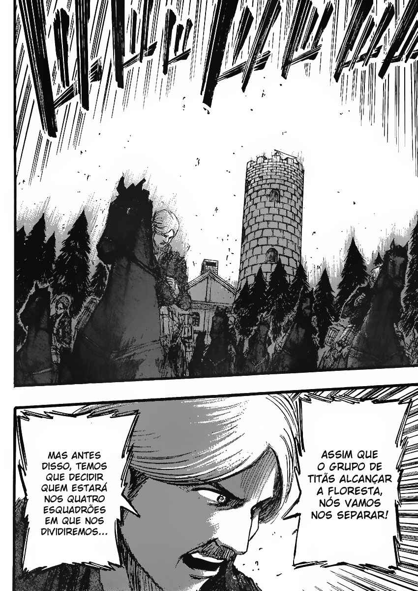 Capítulo 1 - Para Você, Após Dois Mil AnosCapítulo 2 - Aquele DiaCapítulo 3 - A Noite da GraduaçãoCapítulo 4 - Primeira BatalhaCapítulo 5 - Uma Fraca Luz em Meio ao DesesperoCapítulo 6 - O Mundo Que a Garota ViuCapítulo 7 - Lâmina PequenaCapítulo 8 - RugidoCapítulo 9 - Ouvindo as Batidas do CoraçãoCapítulo 10 - O Destino do Braço EsquerdoCapítulo 11 - RespostaCapítulo 12 - ÍconeCapítulo 13 - FeridaCapítulo 13.5Capítulo 14 - Desejo PrimordialCapítulo 15 - IndivíduosCapítulo 16 - NecessidadeCapítulo 17 - Força IlusóriaCapítulo 18 - O que Devo Fazer Agora?Capítulo 19 - Ainda Não VeemCapítulo 20 - Esquadrão de Operações EspeciaisCapítulo 21 - Abrem-se os PortõesCapítulo 22 - Formação de Detecção de Longo AlcanceCapítulo 22.5Capítulo 23 - A Titã FêmeaCapítulo 24 - A Floresta das Árvores GigantesCapítulo 25 - MordidaCapítulo 26 - Por um Caminho MelhorCapítulo 27 - Irvin SmithCapítulo 28 - Escolhas e ResultadosCapítulo 29 - Golpe de FerroCapítulo 30 - Os DerrotadosCapítulo 31 - SorrisoCapítulo 32 - ClemênciaCapítulo 33 - MuralhaCapítulo 34 - Os Guerreiros DançamCapítulo 35 - O Titã BestialCapítulo 36 - Estou em CasaCapítulo 37 - Ao SudesteCapítulo 38 - Castelo UtgardCapítulo 39 - SoldadoCapítulo 40 - YmirCapítulo 41 - HistoriaCapítulo 42 - GuerreiroCapítulo 43 - O Titã de ArmaduraCapítulo 44 - Golpear - Derrubar - DominarCapítulo 45 - Aqueles que PerseguemCapítulo 46 - AberturaCapítulo 47 - CriançasCapítulo 48 - AlguémCapítulo 49 - AtaqueCapítulo 50 - GritoCapítulo 50.5Capítulo 51 - Esquadrão LeviCapítulo 52 - Krista LenzCapítulo 53 - FumaçaCapítulo 54 - O Local do Contra-AtaqueCapítulo 55 - DorCapítulo 56 - AtoresCapítulo 57 - Kenny, o EstripadorCapítulo 58 - TiroteioCapítulo 59 - A Alma de um MonstroCapítulo 60 - ConfiançaCapítulo 61 - RespostasCapítulo 62 - CrimeCapítulo 63 - CorrentesCapítulo 64 - Festa de Boas VindasCapítulo 65 - Sonhos e MaldiçõesCapítulo 66 - DesejoCapítulo 67 - O Lado Externo do Distrito OrvudCapítulo 68 - O Rei da MuralhaCapítulo 69 - AmigosCapítulo 70 - Um Sonho do PassadoCapítulo 71 - EspectadorCapítulo 72 - A Noite da OperaçãoCapítulo 73 - A Cidade Onde Tudo ComeçouCapítulo 74 - Objetivos da MissãoCapítulo 75 - Duas Frentes de BatalhaCapítulo 76 - A Lança do TrovãoCapítulo 77 - O Mundo Que Eles ViramCapítulo 78 - VisitaCapítulo 79 - Jogo PerfeitoCapítulo 80 - Os Soldados DesconhecidosCapítulo 81 - PromessaCapítulo 82 - HeróiCapítulo 83 - Golpe de MachadoCapítulo 84 - Sol da Meia NoiteCapítulo 85 - PorãoCapítulo 86 - Aquele DiaCapítulo 87 - FronteiraCapítulo 88 - Ataque dos TitãsCapítulo 89 - ReuniãoCapítulo 90 - Para o Outro Lado da MuralhaCapítulo 91 - O Outro Lado do OceanoCapítulo 92 - Soldados de MarleyCapítulo 93 - Trem da Noite EscuraCapítulo 94 - O Garoto Dentro do MuroCapítulo 95 - MentirosoCapítulo 96 - O Portão da EsperançaCapítulo 97 - De Uma Mão para a OutraCapítulo 98 - Que BomCapítulo 99 - A Sombra de Uma Consciência CulpadaCapítulo 100 - Declaração de GuerraCapítulo 101 - O Gigante do Martelo de GuerraCapítulo 102 - E Tarde DemaisCapítulo 103 - AtaqueCapítulo 104 - VitoriososCapítulo 105 - A Bala do AssassinoCapítulo 106 - Soldados VoluntáriosCapítulo 107 - VisitanteCapítulo 108 - Um Bom ArgumentoCapítulo 109 - Aqueles Que GuiamCapítulo 110 - ImpostorCapítulo 111 - Crianças da FlorestaCapítulo 112 - IgnorânciaCapítulo 113 - ViolênciaCapítulo 114 - Única SalvaçãoCapítulo 115 - SuporteCapítulo 116 - Céu e TerraCapítulo 117 - JulgamentoCapítulo 118 - Ataque SurpresaCapítulo 119 - Irmãos Mais Velhos, Irmãos Mais NovosCapítulo 120 - Um Breve InstanteCapítulo 120 - InstanteCapítulo 121 - Memórias do FuturoCapítulo 121 - Memórias futurasCapítulo 122 - De Você 2000 Anos AtrásCapítulo 122 - De você, há 2000 anos.Capítulo 123 - Os demônios da ilhaCapítulo 123 - Demônios da ilhaCapítulo 124 - DerretimentoCapítulo 124 - DescongelamentoCapítulo 125 - Pôr do SolCapítulo 126 - OrgulhoCapítulo 126 - OrgulhoCapítulo 127 - Noite da Véspera do FimCapítulo 128 - TraidorCapítulo 129 - RetrospectivaCapítulo 130 - O amanhecer da humanidadeCapítulo 130 - Amanhecer Para a HumanidadeCapítulo 131 - EstrondoCapítulo 131 - O EstrondoCapítulo 132 - Asas da LiberdadeCapítulo 132 - As asas da liberdadeCapítulo 133 - PecadoresCapítulo 133 - PecadoresCapítulo 134 - Nas Profundezas do DesesperoCapítulo 135 - Batalha do Céu e da TerraCapítulo 135 - Batalha do Céu e da TerraCapítulo 136 - Dediquem Seus CoraçõesCapítulo 137 - TitãsCapítulo 138 - Um Longo SonhoCapítulo 139 - Em Direção a Árvore Naquela Colina