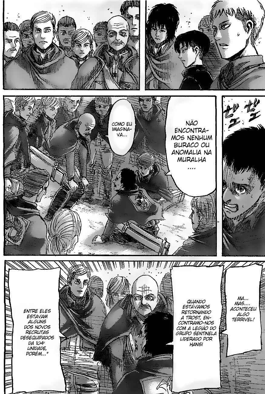 Capítulo 1 - Para Você, Após Dois Mil AnosCapítulo 2 - Aquele DiaCapítulo 3 - A Noite da GraduaçãoCapítulo 4 - Primeira BatalhaCapítulo 5 - Uma Fraca Luz em Meio ao DesesperoCapítulo 6 - O Mundo Que a Garota ViuCapítulo 7 - Lâmina PequenaCapítulo 8 - RugidoCapítulo 9 - Ouvindo as Batidas do CoraçãoCapítulo 10 - O Destino do Braço EsquerdoCapítulo 11 - RespostaCapítulo 12 - ÍconeCapítulo 13 - FeridaCapítulo 13.5Capítulo 14 - Desejo PrimordialCapítulo 15 - IndivíduosCapítulo 16 - NecessidadeCapítulo 17 - Força IlusóriaCapítulo 18 - O que Devo Fazer Agora?Capítulo 19 - Ainda Não VeemCapítulo 20 - Esquadrão de Operações EspeciaisCapítulo 21 - Abrem-se os PortõesCapítulo 22 - Formação de Detecção de Longo AlcanceCapítulo 22.5Capítulo 23 - A Titã FêmeaCapítulo 24 - A Floresta das Árvores GigantesCapítulo 25 - MordidaCapítulo 26 - Por um Caminho MelhorCapítulo 27 - Irvin SmithCapítulo 28 - Escolhas e ResultadosCapítulo 29 - Golpe de FerroCapítulo 30 - Os DerrotadosCapítulo 31 - SorrisoCapítulo 32 - ClemênciaCapítulo 33 - MuralhaCapítulo 34 - Os Guerreiros DançamCapítulo 35 - O Titã BestialCapítulo 36 - Estou em CasaCapítulo 37 - Ao SudesteCapítulo 38 - Castelo UtgardCapítulo 39 - SoldadoCapítulo 40 - YmirCapítulo 41 - HistoriaCapítulo 42 - GuerreiroCapítulo 43 - O Titã de ArmaduraCapítulo 44 - Golpear - Derrubar - DominarCapítulo 45 - Aqueles que PerseguemCapítulo 46 - AberturaCapítulo 47 - CriançasCapítulo 48 - AlguémCapítulo 49 - AtaqueCapítulo 50 - GritoCapítulo 50.5Capítulo 51 - Esquadrão LeviCapítulo 52 - Krista LenzCapítulo 53 - FumaçaCapítulo 54 - O Local do Contra-AtaqueCapítulo 55 - DorCapítulo 56 - AtoresCapítulo 57 - Kenny, o EstripadorCapítulo 58 - TiroteioCapítulo 59 - A Alma de um MonstroCapítulo 60 - ConfiançaCapítulo 61 - RespostasCapítulo 62 - CrimeCapítulo 63 - CorrentesCapítulo 64 - Festa de Boas VindasCapítulo 65 - Sonhos e MaldiçõesCapítulo 66 - DesejoCapítulo 67 - O Lado Externo do Distrito OrvudCapítulo 68 - O Rei da MuralhaCapítulo 69 - AmigosCapítulo 70 - Um Sonho do PassadoCapítulo 71 - EspectadorCapítulo 72 - A Noite da OperaçãoCapítulo 73 - A Cidade Onde Tudo ComeçouCapítulo 74 - Objetivos da MissãoCapítulo 75 - Duas Frentes de BatalhaCapítulo 76 - A Lança do TrovãoCapítulo 77 - O Mundo Que Eles ViramCapítulo 78 - VisitaCapítulo 79 - Jogo PerfeitoCapítulo 80 - Os Soldados DesconhecidosCapítulo 81 - PromessaCapítulo 82 - HeróiCapítulo 83 - Golpe de MachadoCapítulo 84 - Sol da Meia NoiteCapítulo 85 - PorãoCapítulo 86 - Aquele DiaCapítulo 87 - FronteiraCapítulo 88 - Ataque dos TitãsCapítulo 89 - ReuniãoCapítulo 90 - Para o Outro Lado da MuralhaCapítulo 91 - O Outro Lado do OceanoCapítulo 92 - Soldados de MarleyCapítulo 93 - Trem da Noite EscuraCapítulo 94 - O Garoto Dentro do MuroCapítulo 95 - MentirosoCapítulo 96 - O Portão da EsperançaCapítulo 97 - De Uma Mão para a OutraCapítulo 98 - Que BomCapítulo 99 - A Sombra de Uma Consciência CulpadaCapítulo 100 - Declaração de GuerraCapítulo 101 - O Gigante do Martelo de GuerraCapítulo 102 - E Tarde DemaisCapítulo 103 - AtaqueCapítulo 104 - VitoriososCapítulo 105 - A Bala do AssassinoCapítulo 106 - Soldados VoluntáriosCapítulo 107 - VisitanteCapítulo 108 - Um Bom ArgumentoCapítulo 109 - Aqueles Que GuiamCapítulo 110 - ImpostorCapítulo 111 - Crianças da FlorestaCapítulo 112 - IgnorânciaCapítulo 113 - ViolênciaCapítulo 114 - Única SalvaçãoCapítulo 115 - SuporteCapítulo 116 - Céu e TerraCapítulo 117 - JulgamentoCapítulo 118 - Ataque SurpresaCapítulo 119 - Irmãos Mais Velhos, Irmãos Mais NovosCapítulo 120 - Um Breve InstanteCapítulo 120 - InstanteCapítulo 121 - Memórias do FuturoCapítulo 121 - Memórias futurasCapítulo 122 - De Você 2000 Anos AtrásCapítulo 122 - De você, há 2000 anos.Capítulo 123 - Os demônios da ilhaCapítulo 123 - Demônios da ilhaCapítulo 124 - DerretimentoCapítulo 124 - DescongelamentoCapítulo 125 - Pôr do SolCapítulo 126 - OrgulhoCapítulo 126 - OrgulhoCapítulo 127 - Noite da Véspera do FimCapítulo 128 - TraidorCapítulo 129 - RetrospectivaCapítulo 130 - O amanhecer da humanidadeCapítulo 130 - Amanhecer Para a HumanidadeCapítulo 131 - EstrondoCapítulo 131 - O EstrondoCapítulo 132 - Asas da LiberdadeCapítulo 132 - As asas da liberdadeCapítulo 133 - PecadoresCapítulo 133 - PecadoresCapítulo 134 - Nas Profundezas do DesesperoCapítulo 135 - Batalha do Céu e da TerraCapítulo 135 - Batalha do Céu e da TerraCapítulo 136 - Dediquem Seus CoraçõesCapítulo 137 - TitãsCapítulo 138 - Um Longo SonhoCapítulo 139 - Em Direção a Árvore Naquela Colina