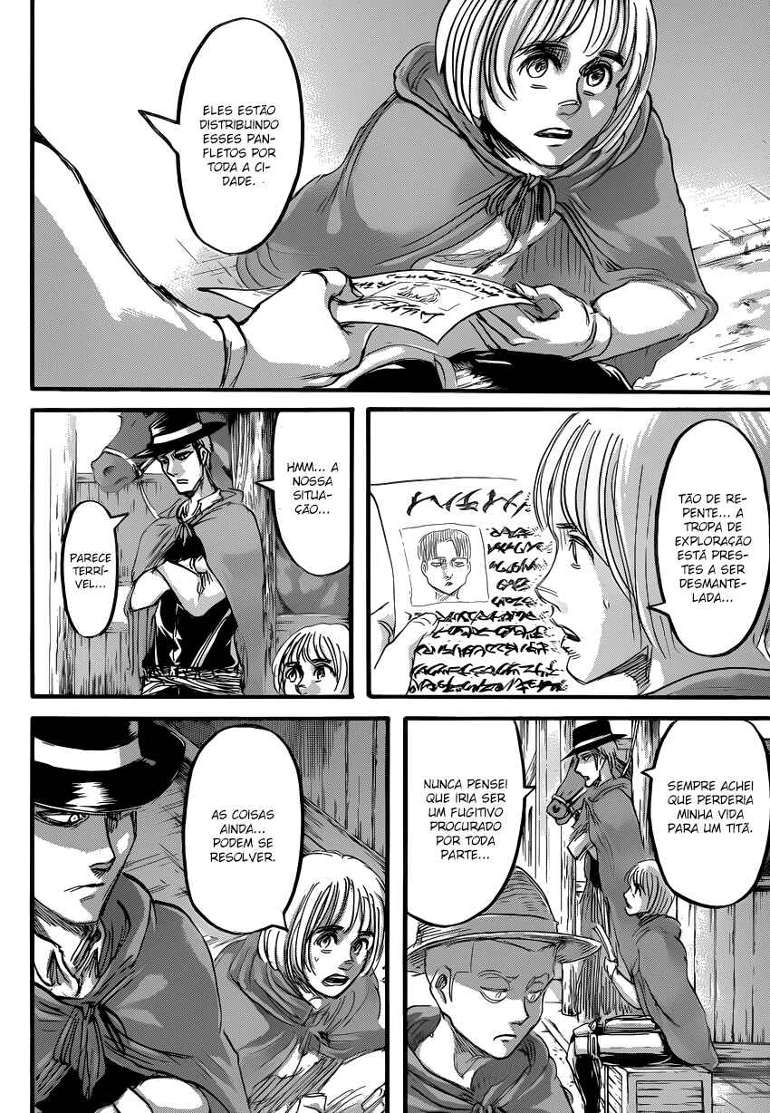 Capítulo 1 - Para Você, Após Dois Mil AnosCapítulo 2 - Aquele DiaCapítulo 3 - A Noite da GraduaçãoCapítulo 4 - Primeira BatalhaCapítulo 5 - Uma Fraca Luz em Meio ao DesesperoCapítulo 6 - O Mundo Que a Garota ViuCapítulo 7 - Lâmina PequenaCapítulo 8 - RugidoCapítulo 9 - Ouvindo as Batidas do CoraçãoCapítulo 10 - O Destino do Braço EsquerdoCapítulo 11 - RespostaCapítulo 12 - ÍconeCapítulo 13 - FeridaCapítulo 13.5Capítulo 14 - Desejo PrimordialCapítulo 15 - IndivíduosCapítulo 16 - NecessidadeCapítulo 17 - Força IlusóriaCapítulo 18 - O que Devo Fazer Agora?Capítulo 19 - Ainda Não VeemCapítulo 20 - Esquadrão de Operações EspeciaisCapítulo 21 - Abrem-se os PortõesCapítulo 22 - Formação de Detecção de Longo AlcanceCapítulo 22.5Capítulo 23 - A Titã FêmeaCapítulo 24 - A Floresta das Árvores GigantesCapítulo 25 - MordidaCapítulo 26 - Por um Caminho MelhorCapítulo 27 - Irvin SmithCapítulo 28 - Escolhas e ResultadosCapítulo 29 - Golpe de FerroCapítulo 30 - Os DerrotadosCapítulo 31 - SorrisoCapítulo 32 - ClemênciaCapítulo 33 - MuralhaCapítulo 34 - Os Guerreiros DançamCapítulo 35 - O Titã BestialCapítulo 36 - Estou em CasaCapítulo 37 - Ao SudesteCapítulo 38 - Castelo UtgardCapítulo 39 - SoldadoCapítulo 40 - YmirCapítulo 41 - HistoriaCapítulo 42 - GuerreiroCapítulo 43 - O Titã de ArmaduraCapítulo 44 - Golpear - Derrubar - DominarCapítulo 45 - Aqueles que PerseguemCapítulo 46 - AberturaCapítulo 47 - CriançasCapítulo 48 - AlguémCapítulo 49 - AtaqueCapítulo 50 - GritoCapítulo 50.5Capítulo 51 - Esquadrão LeviCapítulo 52 - Krista LenzCapítulo 53 - FumaçaCapítulo 54 - O Local do Contra-AtaqueCapítulo 55 - DorCapítulo 56 - AtoresCapítulo 57 - Kenny, o EstripadorCapítulo 58 - TiroteioCapítulo 59 - A Alma de um MonstroCapítulo 60 - ConfiançaCapítulo 61 - RespostasCapítulo 62 - CrimeCapítulo 63 - CorrentesCapítulo 64 - Festa de Boas VindasCapítulo 65 - Sonhos e MaldiçõesCapítulo 66 - DesejoCapítulo 67 - O Lado Externo do Distrito OrvudCapítulo 68 - O Rei da MuralhaCapítulo 69 - AmigosCapítulo 70 - Um Sonho do PassadoCapítulo 71 - EspectadorCapítulo 72 - A Noite da OperaçãoCapítulo 73 - A Cidade Onde Tudo ComeçouCapítulo 74 - Objetivos da MissãoCapítulo 75 - Duas Frentes de BatalhaCapítulo 76 - A Lança do TrovãoCapítulo 77 - O Mundo Que Eles ViramCapítulo 78 - VisitaCapítulo 79 - Jogo PerfeitoCapítulo 80 - Os Soldados DesconhecidosCapítulo 81 - PromessaCapítulo 82 - HeróiCapítulo 83 - Golpe de MachadoCapítulo 84 - Sol da Meia NoiteCapítulo 85 - PorãoCapítulo 86 - Aquele DiaCapítulo 87 - FronteiraCapítulo 88 - Ataque dos TitãsCapítulo 89 - ReuniãoCapítulo 90 - Para o Outro Lado da MuralhaCapítulo 91 - O Outro Lado do OceanoCapítulo 92 - Soldados de MarleyCapítulo 93 - Trem da Noite EscuraCapítulo 94 - O Garoto Dentro do MuroCapítulo 95 - MentirosoCapítulo 96 - O Portão da EsperançaCapítulo 97 - De Uma Mão para a OutraCapítulo 98 - Que BomCapítulo 99 - A Sombra de Uma Consciência CulpadaCapítulo 100 - Declaração de GuerraCapítulo 101 - O Gigante do Martelo de GuerraCapítulo 102 - E Tarde DemaisCapítulo 103 - AtaqueCapítulo 104 - VitoriososCapítulo 105 - A Bala do AssassinoCapítulo 106 - Soldados VoluntáriosCapítulo 107 - VisitanteCapítulo 108 - Um Bom ArgumentoCapítulo 109 - Aqueles Que GuiamCapítulo 110 - ImpostorCapítulo 111 - Crianças da FlorestaCapítulo 112 - IgnorânciaCapítulo 113 - ViolênciaCapítulo 114 - Única SalvaçãoCapítulo 115 - SuporteCapítulo 116 - Céu e TerraCapítulo 117 - JulgamentoCapítulo 118 - Ataque SurpresaCapítulo 119 - Irmãos Mais Velhos, Irmãos Mais NovosCapítulo 120 - Um Breve InstanteCapítulo 120 - InstanteCapítulo 121 - Memórias do FuturoCapítulo 121 - Memórias futurasCapítulo 122 - De Você 2000 Anos AtrásCapítulo 122 - De você, há 2000 anos.Capítulo 123 - Os demônios da ilhaCapítulo 123 - Demônios da ilhaCapítulo 124 - DerretimentoCapítulo 124 - DescongelamentoCapítulo 125 - Pôr do SolCapítulo 126 - OrgulhoCapítulo 126 - OrgulhoCapítulo 127 - Noite da Véspera do FimCapítulo 128 - TraidorCapítulo 129 - RetrospectivaCapítulo 130 - O amanhecer da humanidadeCapítulo 130 - Amanhecer Para a HumanidadeCapítulo 131 - EstrondoCapítulo 131 - O EstrondoCapítulo 132 - Asas da LiberdadeCapítulo 132 - As asas da liberdadeCapítulo 133 - PecadoresCapítulo 133 - PecadoresCapítulo 134 - Nas Profundezas do DesesperoCapítulo 135 - Batalha do Céu e da TerraCapítulo 135 - Batalha do Céu e da TerraCapítulo 136 - Dediquem Seus CoraçõesCapítulo 137 - TitãsCapítulo 138 - Um Longo SonhoCapítulo 139 - Em Direção a Árvore Naquela Colina