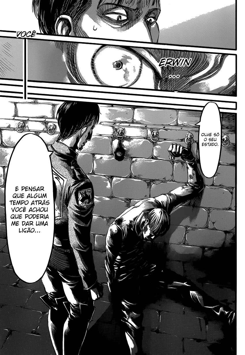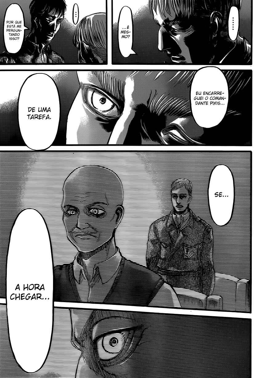 Capítulo 1 - Para Você, Após Dois Mil AnosCapítulo 2 - Aquele DiaCapítulo 3 - A Noite da GraduaçãoCapítulo 4 - Primeira BatalhaCapítulo 5 - Uma Fraca Luz em Meio ao DesesperoCapítulo 6 - O Mundo Que a Garota ViuCapítulo 7 - Lâmina PequenaCapítulo 8 - RugidoCapítulo 9 - Ouvindo as Batidas do CoraçãoCapítulo 10 - O Destino do Braço EsquerdoCapítulo 11 - RespostaCapítulo 12 - ÍconeCapítulo 13 - FeridaCapítulo 13.5Capítulo 14 - Desejo PrimordialCapítulo 15 - IndivíduosCapítulo 16 - NecessidadeCapítulo 17 - Força IlusóriaCapítulo 18 - O que Devo Fazer Agora?Capítulo 19 - Ainda Não VeemCapítulo 20 - Esquadrão de Operações EspeciaisCapítulo 21 - Abrem-se os PortõesCapítulo 22 - Formação de Detecção de Longo AlcanceCapítulo 22.5Capítulo 23 - A Titã FêmeaCapítulo 24 - A Floresta das Árvores GigantesCapítulo 25 - MordidaCapítulo 26 - Por um Caminho MelhorCapítulo 27 - Irvin SmithCapítulo 28 - Escolhas e ResultadosCapítulo 29 - Golpe de FerroCapítulo 30 - Os DerrotadosCapítulo 31 - SorrisoCapítulo 32 - ClemênciaCapítulo 33 - MuralhaCapítulo 34 - Os Guerreiros DançamCapítulo 35 - O Titã BestialCapítulo 36 - Estou em CasaCapítulo 37 - Ao SudesteCapítulo 38 - Castelo UtgardCapítulo 39 - SoldadoCapítulo 40 - YmirCapítulo 41 - HistoriaCapítulo 42 - GuerreiroCapítulo 43 - O Titã de ArmaduraCapítulo 44 - Golpear - Derrubar - DominarCapítulo 45 - Aqueles que PerseguemCapítulo 46 - AberturaCapítulo 47 - CriançasCapítulo 48 - AlguémCapítulo 49 - AtaqueCapítulo 50 - GritoCapítulo 50.5Capítulo 51 - Esquadrão LeviCapítulo 52 - Krista LenzCapítulo 53 - FumaçaCapítulo 54 - O Local do Contra-AtaqueCapítulo 55 - DorCapítulo 56 - AtoresCapítulo 57 - Kenny, o EstripadorCapítulo 58 - TiroteioCapítulo 59 - A Alma de um MonstroCapítulo 60 - ConfiançaCapítulo 61 - RespostasCapítulo 62 - CrimeCapítulo 63 - CorrentesCapítulo 64 - Festa de Boas VindasCapítulo 65 - Sonhos e MaldiçõesCapítulo 66 - DesejoCapítulo 67 - O Lado Externo do Distrito OrvudCapítulo 68 - O Rei da MuralhaCapítulo 69 - AmigosCapítulo 70 - Um Sonho do PassadoCapítulo 71 - EspectadorCapítulo 72 - A Noite da OperaçãoCapítulo 73 - A Cidade Onde Tudo ComeçouCapítulo 74 - Objetivos da MissãoCapítulo 75 - Duas Frentes de BatalhaCapítulo 76 - A Lança do TrovãoCapítulo 77 - O Mundo Que Eles ViramCapítulo 78 - VisitaCapítulo 79 - Jogo PerfeitoCapítulo 80 - Os Soldados DesconhecidosCapítulo 81 - PromessaCapítulo 82 - HeróiCapítulo 83 - Golpe de MachadoCapítulo 84 - Sol da Meia NoiteCapítulo 85 - PorãoCapítulo 86 - Aquele DiaCapítulo 87 - FronteiraCapítulo 88 - Ataque dos TitãsCapítulo 89 - ReuniãoCapítulo 90 - Para o Outro Lado da MuralhaCapítulo 91 - O Outro Lado do OceanoCapítulo 92 - Soldados de MarleyCapítulo 93 - Trem da Noite EscuraCapítulo 94 - O Garoto Dentro do MuroCapítulo 95 - MentirosoCapítulo 96 - O Portão da EsperançaCapítulo 97 - De Uma Mão para a OutraCapítulo 98 - Que BomCapítulo 99 - A Sombra de Uma Consciência CulpadaCapítulo 100 - Declaração de GuerraCapítulo 101 - O Gigante do Martelo de GuerraCapítulo 102 - E Tarde DemaisCapítulo 103 - AtaqueCapítulo 104 - VitoriososCapítulo 105 - A Bala do AssassinoCapítulo 106 - Soldados VoluntáriosCapítulo 107 - VisitanteCapítulo 108 - Um Bom ArgumentoCapítulo 109 - Aqueles Que GuiamCapítulo 110 - ImpostorCapítulo 111 - Crianças da FlorestaCapítulo 112 - IgnorânciaCapítulo 113 - ViolênciaCapítulo 114 - Única SalvaçãoCapítulo 115 - SuporteCapítulo 116 - Céu e TerraCapítulo 117 - JulgamentoCapítulo 118 - Ataque SurpresaCapítulo 119 - Irmãos Mais Velhos, Irmãos Mais NovosCapítulo 120 - Um Breve InstanteCapítulo 120 - InstanteCapítulo 121 - Memórias do FuturoCapítulo 121 - Memórias futurasCapítulo 122 - De Você 2000 Anos AtrásCapítulo 122 - De você, há 2000 anos.Capítulo 123 - Os demônios da ilhaCapítulo 123 - Demônios da ilhaCapítulo 124 - DerretimentoCapítulo 124 - DescongelamentoCapítulo 125 - Pôr do SolCapítulo 126 - OrgulhoCapítulo 126 - OrgulhoCapítulo 127 - Noite da Véspera do FimCapítulo 128 - TraidorCapítulo 129 - RetrospectivaCapítulo 130 - O amanhecer da humanidadeCapítulo 130 - Amanhecer Para a HumanidadeCapítulo 131 - EstrondoCapítulo 131 - O EstrondoCapítulo 132 - Asas da LiberdadeCapítulo 132 - As asas da liberdadeCapítulo 133 - PecadoresCapítulo 133 - PecadoresCapítulo 134 - Nas Profundezas do DesesperoCapítulo 135 - Batalha do Céu e da TerraCapítulo 135 - Batalha do Céu e da TerraCapítulo 136 - Dediquem Seus CoraçõesCapítulo 137 - TitãsCapítulo 138 - Um Longo SonhoCapítulo 139 - Em Direção a Árvore Naquela Colina