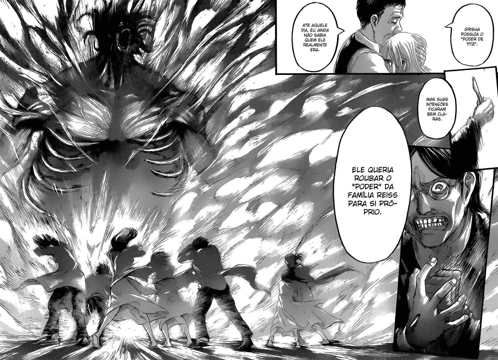 Capítulo 1 - Para Você, Após Dois Mil AnosCapítulo 2 - Aquele DiaCapítulo 3 - A Noite da GraduaçãoCapítulo 4 - Primeira BatalhaCapítulo 5 - Uma Fraca Luz em Meio ao DesesperoCapítulo 6 - O Mundo Que a Garota ViuCapítulo 7 - Lâmina PequenaCapítulo 8 - RugidoCapítulo 9 - Ouvindo as Batidas do CoraçãoCapítulo 10 - O Destino do Braço EsquerdoCapítulo 11 - RespostaCapítulo 12 - ÍconeCapítulo 13 - FeridaCapítulo 13.5Capítulo 14 - Desejo PrimordialCapítulo 15 - IndivíduosCapítulo 16 - NecessidadeCapítulo 17 - Força IlusóriaCapítulo 18 - O que Devo Fazer Agora?Capítulo 19 - Ainda Não VeemCapítulo 20 - Esquadrão de Operações EspeciaisCapítulo 21 - Abrem-se os PortõesCapítulo 22 - Formação de Detecção de Longo AlcanceCapítulo 22.5Capítulo 23 - A Titã FêmeaCapítulo 24 - A Floresta das Árvores GigantesCapítulo 25 - MordidaCapítulo 26 - Por um Caminho MelhorCapítulo 27 - Irvin SmithCapítulo 28 - Escolhas e ResultadosCapítulo 29 - Golpe de FerroCapítulo 30 - Os DerrotadosCapítulo 31 - SorrisoCapítulo 32 - ClemênciaCapítulo 33 - MuralhaCapítulo 34 - Os Guerreiros DançamCapítulo 35 - O Titã BestialCapítulo 36 - Estou em CasaCapítulo 37 - Ao SudesteCapítulo 38 - Castelo UtgardCapítulo 39 - SoldadoCapítulo 40 - YmirCapítulo 41 - HistoriaCapítulo 42 - GuerreiroCapítulo 43 - O Titã de ArmaduraCapítulo 44 - Golpear - Derrubar - DominarCapítulo 45 - Aqueles que PerseguemCapítulo 46 - AberturaCapítulo 47 - CriançasCapítulo 48 - AlguémCapítulo 49 - AtaqueCapítulo 50 - GritoCapítulo 50.5Capítulo 51 - Esquadrão LeviCapítulo 52 - Krista LenzCapítulo 53 - FumaçaCapítulo 54 - O Local do Contra-AtaqueCapítulo 55 - DorCapítulo 56 - AtoresCapítulo 57 - Kenny, o EstripadorCapítulo 58 - TiroteioCapítulo 59 - A Alma de um MonstroCapítulo 60 - ConfiançaCapítulo 61 - RespostasCapítulo 62 - CrimeCapítulo 63 - CorrentesCapítulo 64 - Festa de Boas VindasCapítulo 65 - Sonhos e MaldiçõesCapítulo 66 - DesejoCapítulo 67 - O Lado Externo do Distrito OrvudCapítulo 68 - O Rei da MuralhaCapítulo 69 - AmigosCapítulo 70 - Um Sonho do PassadoCapítulo 71 - EspectadorCapítulo 72 - A Noite da OperaçãoCapítulo 73 - A Cidade Onde Tudo ComeçouCapítulo 74 - Objetivos da MissãoCapítulo 75 - Duas Frentes de BatalhaCapítulo 76 - A Lança do TrovãoCapítulo 77 - O Mundo Que Eles ViramCapítulo 78 - VisitaCapítulo 79 - Jogo PerfeitoCapítulo 80 - Os Soldados DesconhecidosCapítulo 81 - PromessaCapítulo 82 - HeróiCapítulo 83 - Golpe de MachadoCapítulo 84 - Sol da Meia NoiteCapítulo 85 - PorãoCapítulo 86 - Aquele DiaCapítulo 87 - FronteiraCapítulo 88 - Ataque dos TitãsCapítulo 89 - ReuniãoCapítulo 90 - Para o Outro Lado da MuralhaCapítulo 91 - O Outro Lado do OceanoCapítulo 92 - Soldados de MarleyCapítulo 93 - Trem da Noite EscuraCapítulo 94 - O Garoto Dentro do MuroCapítulo 95 - MentirosoCapítulo 96 - O Portão da EsperançaCapítulo 97 - De Uma Mão para a OutraCapítulo 98 - Que BomCapítulo 99 - A Sombra de Uma Consciência CulpadaCapítulo 100 - Declaração de GuerraCapítulo 101 - O Gigante do Martelo de GuerraCapítulo 102 - E Tarde DemaisCapítulo 103 - AtaqueCapítulo 104 - VitoriososCapítulo 105 - A Bala do AssassinoCapítulo 106 - Soldados VoluntáriosCapítulo 107 - VisitanteCapítulo 108 - Um Bom ArgumentoCapítulo 109 - Aqueles Que GuiamCapítulo 110 - ImpostorCapítulo 111 - Crianças da FlorestaCapítulo 112 - IgnorânciaCapítulo 113 - ViolênciaCapítulo 114 - Única SalvaçãoCapítulo 115 - SuporteCapítulo 116 - Céu e TerraCapítulo 117 - JulgamentoCapítulo 118 - Ataque SurpresaCapítulo 119 - Irmãos Mais Velhos, Irmãos Mais NovosCapítulo 120 - Um Breve InstanteCapítulo 120 - InstanteCapítulo 121 - Memórias do FuturoCapítulo 121 - Memórias futurasCapítulo 122 - De Você 2000 Anos AtrásCapítulo 122 - De você, há 2000 anos.Capítulo 123 - Os demônios da ilhaCapítulo 123 - Demônios da ilhaCapítulo 124 - DerretimentoCapítulo 124 - DescongelamentoCapítulo 125 - Pôr do SolCapítulo 126 - OrgulhoCapítulo 126 - OrgulhoCapítulo 127 - Noite da Véspera do FimCapítulo 128 - TraidorCapítulo 129 - RetrospectivaCapítulo 130 - O amanhecer da humanidadeCapítulo 130 - Amanhecer Para a HumanidadeCapítulo 131 - EstrondoCapítulo 131 - O EstrondoCapítulo 132 - Asas da LiberdadeCapítulo 132 - As asas da liberdadeCapítulo 133 - PecadoresCapítulo 133 - PecadoresCapítulo 134 - Nas Profundezas do DesesperoCapítulo 135 - Batalha do Céu e da TerraCapítulo 135 - Batalha do Céu e da TerraCapítulo 136 - Dediquem Seus CoraçõesCapítulo 137 - TitãsCapítulo 138 - Um Longo SonhoCapítulo 139 - Em Direção a Árvore Naquela Colina