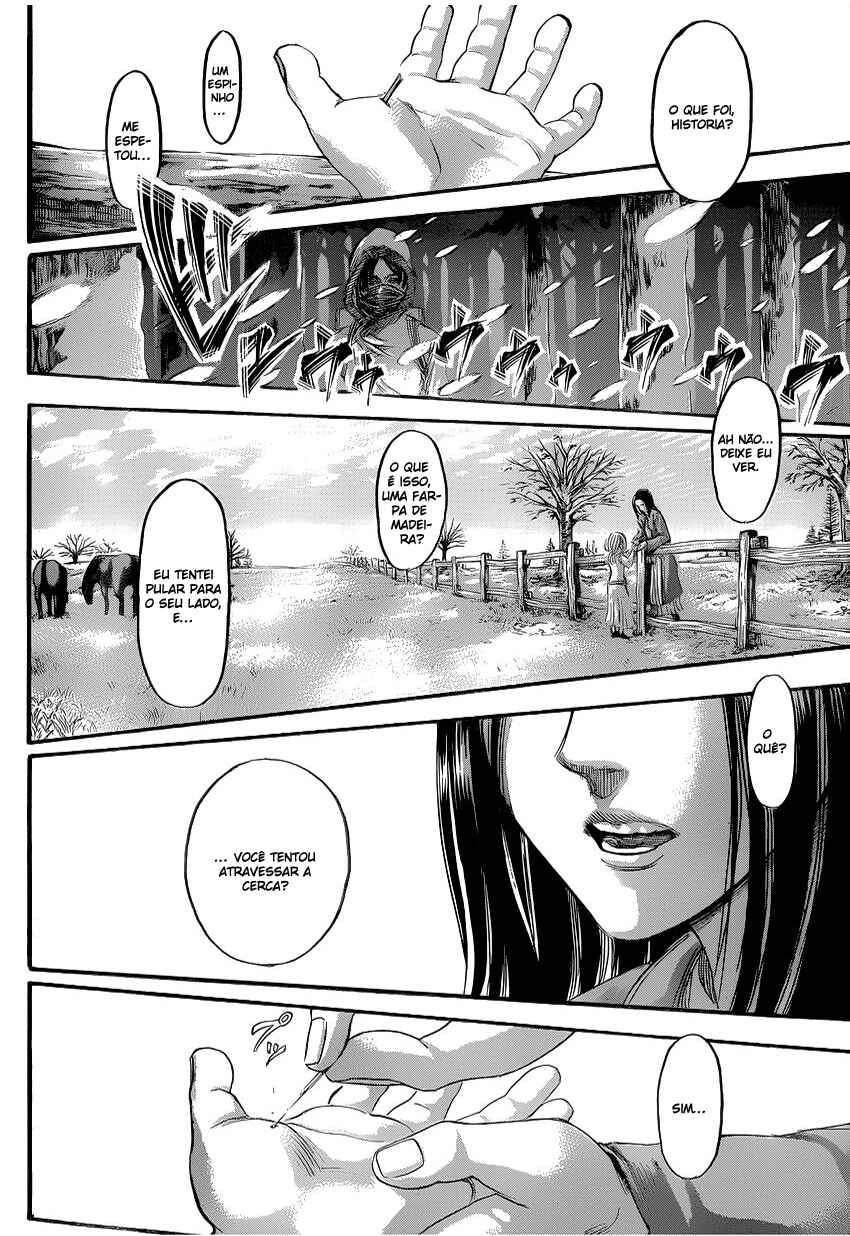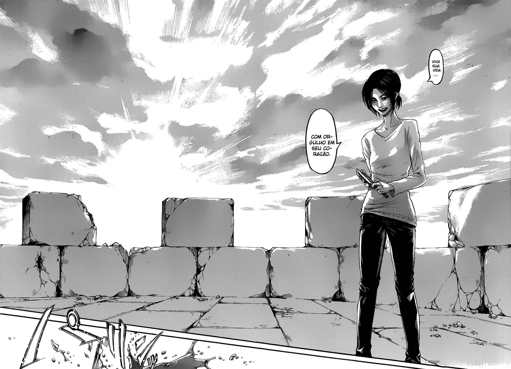 Capítulo 1 - Para Você, Após Dois Mil AnosCapítulo 2 - Aquele DiaCapítulo 3 - A Noite da GraduaçãoCapítulo 4 - Primeira BatalhaCapítulo 5 - Uma Fraca Luz em Meio ao DesesperoCapítulo 6 - O Mundo Que a Garota ViuCapítulo 7 - Lâmina PequenaCapítulo 8 - RugidoCapítulo 9 - Ouvindo as Batidas do CoraçãoCapítulo 10 - O Destino do Braço EsquerdoCapítulo 11 - RespostaCapítulo 12 - ÍconeCapítulo 13 - FeridaCapítulo 13.5Capítulo 14 - Desejo PrimordialCapítulo 15 - IndivíduosCapítulo 16 - NecessidadeCapítulo 17 - Força IlusóriaCapítulo 18 - O que Devo Fazer Agora?Capítulo 19 - Ainda Não VeemCapítulo 20 - Esquadrão de Operações EspeciaisCapítulo 21 - Abrem-se os PortõesCapítulo 22 - Formação de Detecção de Longo AlcanceCapítulo 22.5Capítulo 23 - A Titã FêmeaCapítulo 24 - A Floresta das Árvores GigantesCapítulo 25 - MordidaCapítulo 26 - Por um Caminho MelhorCapítulo 27 - Irvin SmithCapítulo 28 - Escolhas e ResultadosCapítulo 29 - Golpe de FerroCapítulo 30 - Os DerrotadosCapítulo 31 - SorrisoCapítulo 32 - ClemênciaCapítulo 33 - MuralhaCapítulo 34 - Os Guerreiros DançamCapítulo 35 - O Titã BestialCapítulo 36 - Estou em CasaCapítulo 37 - Ao SudesteCapítulo 38 - Castelo UtgardCapítulo 39 - SoldadoCapítulo 40 - YmirCapítulo 41 - HistoriaCapítulo 42 - GuerreiroCapítulo 43 - O Titã de ArmaduraCapítulo 44 - Golpear - Derrubar - DominarCapítulo 45 - Aqueles que PerseguemCapítulo 46 - AberturaCapítulo 47 - CriançasCapítulo 48 - AlguémCapítulo 49 - AtaqueCapítulo 50 - GritoCapítulo 50.5Capítulo 51 - Esquadrão LeviCapítulo 52 - Krista LenzCapítulo 53 - FumaçaCapítulo 54 - O Local do Contra-AtaqueCapítulo 55 - DorCapítulo 56 - AtoresCapítulo 57 - Kenny, o EstripadorCapítulo 58 - TiroteioCapítulo 59 - A Alma de um MonstroCapítulo 60 - ConfiançaCapítulo 61 - RespostasCapítulo 62 - CrimeCapítulo 63 - CorrentesCapítulo 64 - Festa de Boas VindasCapítulo 65 - Sonhos e MaldiçõesCapítulo 66 - DesejoCapítulo 67 - O Lado Externo do Distrito OrvudCapítulo 68 - O Rei da MuralhaCapítulo 69 - AmigosCapítulo 70 - Um Sonho do PassadoCapítulo 71 - EspectadorCapítulo 72 - A Noite da OperaçãoCapítulo 73 - A Cidade Onde Tudo ComeçouCapítulo 74 - Objetivos da MissãoCapítulo 75 - Duas Frentes de BatalhaCapítulo 76 - A Lança do TrovãoCapítulo 77 - O Mundo Que Eles ViramCapítulo 78 - VisitaCapítulo 79 - Jogo PerfeitoCapítulo 80 - Os Soldados DesconhecidosCapítulo 81 - PromessaCapítulo 82 - HeróiCapítulo 83 - Golpe de MachadoCapítulo 84 - Sol da Meia NoiteCapítulo 85 - PorãoCapítulo 86 - Aquele DiaCapítulo 87 - FronteiraCapítulo 88 - Ataque dos TitãsCapítulo 89 - ReuniãoCapítulo 90 - Para o Outro Lado da MuralhaCapítulo 91 - O Outro Lado do OceanoCapítulo 92 - Soldados de MarleyCapítulo 93 - Trem da Noite EscuraCapítulo 94 - O Garoto Dentro do MuroCapítulo 95 - MentirosoCapítulo 96 - O Portão da EsperançaCapítulo 97 - De Uma Mão para a OutraCapítulo 98 - Que BomCapítulo 99 - A Sombra de Uma Consciência CulpadaCapítulo 100 - Declaração de GuerraCapítulo 101 - O Gigante do Martelo de GuerraCapítulo 102 - E Tarde DemaisCapítulo 103 - AtaqueCapítulo 104 - VitoriososCapítulo 105 - A Bala do AssassinoCapítulo 106 - Soldados VoluntáriosCapítulo 107 - VisitanteCapítulo 108 - Um Bom ArgumentoCapítulo 109 - Aqueles Que GuiamCapítulo 110 - ImpostorCapítulo 111 - Crianças da FlorestaCapítulo 112 - IgnorânciaCapítulo 113 - ViolênciaCapítulo 114 - Única SalvaçãoCapítulo 115 - SuporteCapítulo 116 - Céu e TerraCapítulo 117 - JulgamentoCapítulo 118 - Ataque SurpresaCapítulo 119 - Irmãos Mais Velhos, Irmãos Mais NovosCapítulo 120 - Um Breve InstanteCapítulo 120 - InstanteCapítulo 121 - Memórias do FuturoCapítulo 121 - Memórias futurasCapítulo 122 - De Você 2000 Anos AtrásCapítulo 122 - De você, há 2000 anos.Capítulo 123 - Os demônios da ilhaCapítulo 123 - Demônios da ilhaCapítulo 124 - DerretimentoCapítulo 124 - DescongelamentoCapítulo 125 - Pôr do SolCapítulo 126 - OrgulhoCapítulo 126 - OrgulhoCapítulo 127 - Noite da Véspera do FimCapítulo 128 - TraidorCapítulo 129 - RetrospectivaCapítulo 130 - O amanhecer da humanidadeCapítulo 130 - Amanhecer Para a HumanidadeCapítulo 131 - EstrondoCapítulo 131 - O EstrondoCapítulo 132 - Asas da LiberdadeCapítulo 132 - As asas da liberdadeCapítulo 133 - PecadoresCapítulo 133 - PecadoresCapítulo 134 - Nas Profundezas do DesesperoCapítulo 135 - Batalha do Céu e da TerraCapítulo 135 - Batalha do Céu e da TerraCapítulo 136 - Dediquem Seus CoraçõesCapítulo 137 - TitãsCapítulo 138 - Um Longo SonhoCapítulo 139 - Em Direção a Árvore Naquela Colina