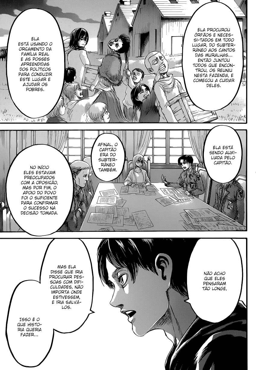 Capítulo 1 - Para Você, Após Dois Mil AnosCapítulo 2 - Aquele DiaCapítulo 3 - A Noite da GraduaçãoCapítulo 4 - Primeira BatalhaCapítulo 5 - Uma Fraca Luz em Meio ao DesesperoCapítulo 6 - O Mundo Que a Garota ViuCapítulo 7 - Lâmina PequenaCapítulo 8 - RugidoCapítulo 9 - Ouvindo as Batidas do CoraçãoCapítulo 10 - O Destino do Braço EsquerdoCapítulo 11 - RespostaCapítulo 12 - ÍconeCapítulo 13 - FeridaCapítulo 13.5Capítulo 14 - Desejo PrimordialCapítulo 15 - IndivíduosCapítulo 16 - NecessidadeCapítulo 17 - Força IlusóriaCapítulo 18 - O que Devo Fazer Agora?Capítulo 19 - Ainda Não VeemCapítulo 20 - Esquadrão de Operações EspeciaisCapítulo 21 - Abrem-se os PortõesCapítulo 22 - Formação de Detecção de Longo AlcanceCapítulo 22.5Capítulo 23 - A Titã FêmeaCapítulo 24 - A Floresta das Árvores GigantesCapítulo 25 - MordidaCapítulo 26 - Por um Caminho MelhorCapítulo 27 - Irvin SmithCapítulo 28 - Escolhas e ResultadosCapítulo 29 - Golpe de FerroCapítulo 30 - Os DerrotadosCapítulo 31 - SorrisoCapítulo 32 - ClemênciaCapítulo 33 - MuralhaCapítulo 34 - Os Guerreiros DançamCapítulo 35 - O Titã BestialCapítulo 36 - Estou em CasaCapítulo 37 - Ao SudesteCapítulo 38 - Castelo UtgardCapítulo 39 - SoldadoCapítulo 40 - YmirCapítulo 41 - HistoriaCapítulo 42 - GuerreiroCapítulo 43 - O Titã de ArmaduraCapítulo 44 - Golpear - Derrubar - DominarCapítulo 45 - Aqueles que PerseguemCapítulo 46 - AberturaCapítulo 47 - CriançasCapítulo 48 - AlguémCapítulo 49 - AtaqueCapítulo 50 - GritoCapítulo 50.5Capítulo 51 - Esquadrão LeviCapítulo 52 - Krista LenzCapítulo 53 - FumaçaCapítulo 54 - O Local do Contra-AtaqueCapítulo 55 - DorCapítulo 56 - AtoresCapítulo 57 - Kenny, o EstripadorCapítulo 58 - TiroteioCapítulo 59 - A Alma de um MonstroCapítulo 60 - ConfiançaCapítulo 61 - RespostasCapítulo 62 - CrimeCapítulo 63 - CorrentesCapítulo 64 - Festa de Boas VindasCapítulo 65 - Sonhos e MaldiçõesCapítulo 66 - DesejoCapítulo 67 - O Lado Externo do Distrito OrvudCapítulo 68 - O Rei da MuralhaCapítulo 69 - AmigosCapítulo 70 - Um Sonho do PassadoCapítulo 71 - EspectadorCapítulo 72 - A Noite da OperaçãoCapítulo 73 - A Cidade Onde Tudo ComeçouCapítulo 74 - Objetivos da MissãoCapítulo 75 - Duas Frentes de BatalhaCapítulo 76 - A Lança do TrovãoCapítulo 77 - O Mundo Que Eles ViramCapítulo 78 - VisitaCapítulo 79 - Jogo PerfeitoCapítulo 80 - Os Soldados DesconhecidosCapítulo 81 - PromessaCapítulo 82 - HeróiCapítulo 83 - Golpe de MachadoCapítulo 84 - Sol da Meia NoiteCapítulo 85 - PorãoCapítulo 86 - Aquele DiaCapítulo 87 - FronteiraCapítulo 88 - Ataque dos TitãsCapítulo 89 - ReuniãoCapítulo 90 - Para o Outro Lado da MuralhaCapítulo 91 - O Outro Lado do OceanoCapítulo 92 - Soldados de MarleyCapítulo 93 - Trem da Noite EscuraCapítulo 94 - O Garoto Dentro do MuroCapítulo 95 - MentirosoCapítulo 96 - O Portão da EsperançaCapítulo 97 - De Uma Mão para a OutraCapítulo 98 - Que BomCapítulo 99 - A Sombra de Uma Consciência CulpadaCapítulo 100 - Declaração de GuerraCapítulo 101 - O Gigante do Martelo de GuerraCapítulo 102 - E Tarde DemaisCapítulo 103 - AtaqueCapítulo 104 - VitoriososCapítulo 105 - A Bala do AssassinoCapítulo 106 - Soldados VoluntáriosCapítulo 107 - VisitanteCapítulo 108 - Um Bom ArgumentoCapítulo 109 - Aqueles Que GuiamCapítulo 110 - ImpostorCapítulo 111 - Crianças da FlorestaCapítulo 112 - IgnorânciaCapítulo 113 - ViolênciaCapítulo 114 - Única SalvaçãoCapítulo 115 - SuporteCapítulo 116 - Céu e TerraCapítulo 117 - JulgamentoCapítulo 118 - Ataque SurpresaCapítulo 119 - Irmãos Mais Velhos, Irmãos Mais NovosCapítulo 120 - Um Breve InstanteCapítulo 120 - InstanteCapítulo 121 - Memórias do FuturoCapítulo 121 - Memórias futurasCapítulo 122 - De Você 2000 Anos AtrásCapítulo 122 - De você, há 2000 anos.Capítulo 123 - Os demônios da ilhaCapítulo 123 - Demônios da ilhaCapítulo 124 - DerretimentoCapítulo 124 - DescongelamentoCapítulo 125 - Pôr do SolCapítulo 126 - OrgulhoCapítulo 126 - OrgulhoCapítulo 127 - Noite da Véspera do FimCapítulo 128 - TraidorCapítulo 129 - RetrospectivaCapítulo 130 - O amanhecer da humanidadeCapítulo 130 - Amanhecer Para a HumanidadeCapítulo 131 - EstrondoCapítulo 131 - O EstrondoCapítulo 132 - Asas da LiberdadeCapítulo 132 - As asas da liberdadeCapítulo 133 - PecadoresCapítulo 133 - PecadoresCapítulo 134 - Nas Profundezas do DesesperoCapítulo 135 - Batalha do Céu e da TerraCapítulo 135 - Batalha do Céu e da TerraCapítulo 136 - Dediquem Seus CoraçõesCapítulo 137 - TitãsCapítulo 138 - Um Longo SonhoCapítulo 139 - Em Direção a Árvore Naquela Colina