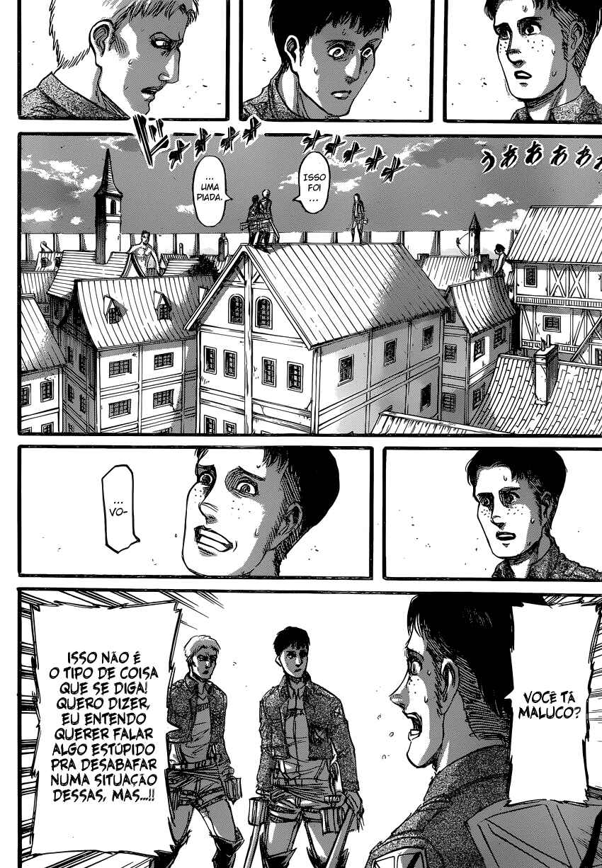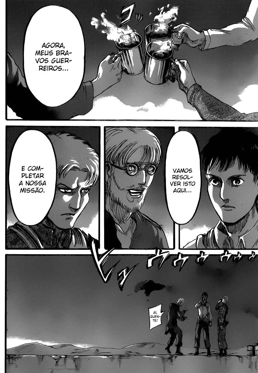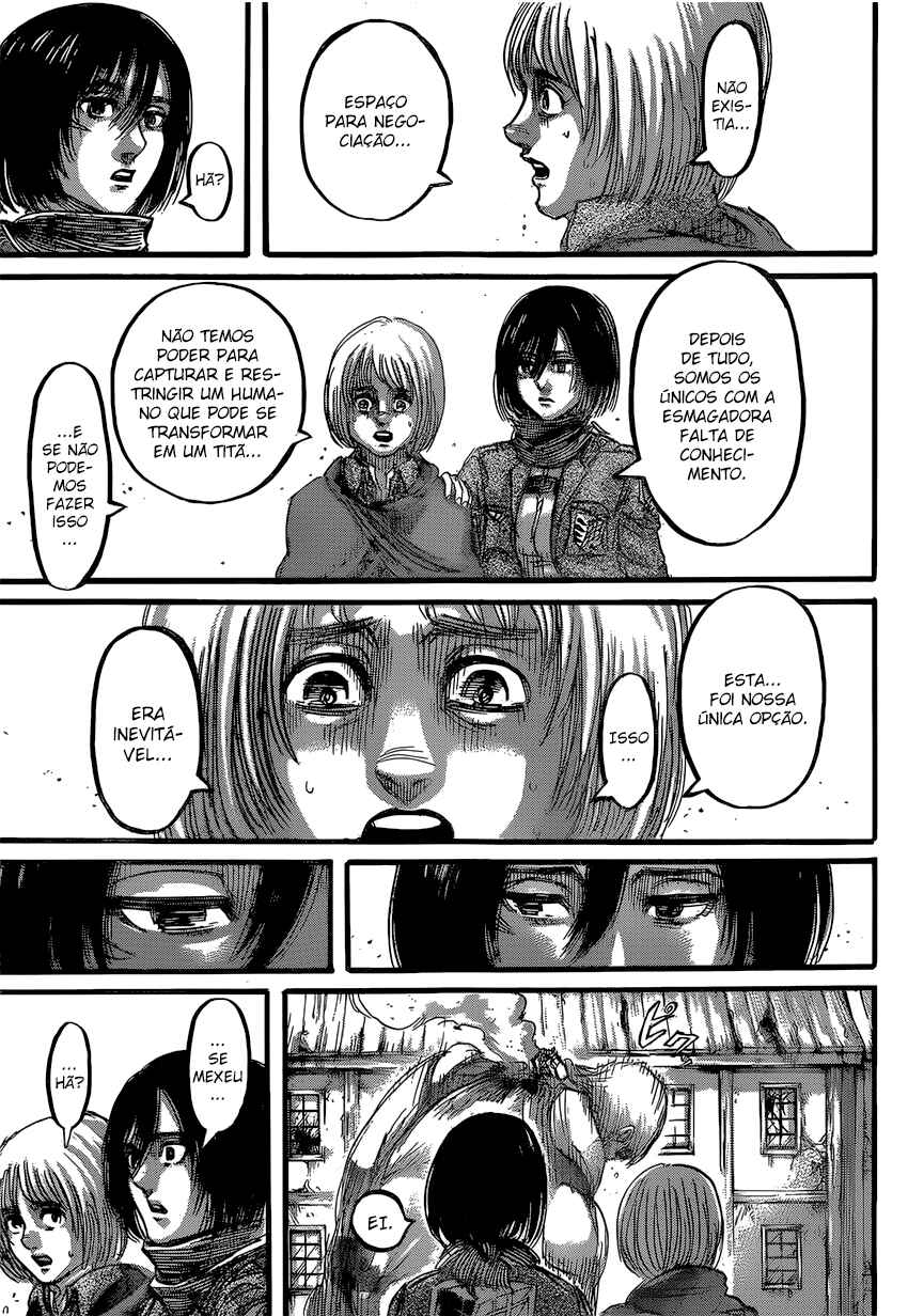 Capítulo 1 - Para Você, Após Dois Mil AnosCapítulo 2 - Aquele DiaCapítulo 3 - A Noite da GraduaçãoCapítulo 4 - Primeira BatalhaCapítulo 5 - Uma Fraca Luz em Meio ao DesesperoCapítulo 6 - O Mundo Que a Garota ViuCapítulo 7 - Lâmina PequenaCapítulo 8 - RugidoCapítulo 9 - Ouvindo as Batidas do CoraçãoCapítulo 10 - O Destino do Braço EsquerdoCapítulo 11 - RespostaCapítulo 12 - ÍconeCapítulo 13 - FeridaCapítulo 13.5Capítulo 14 - Desejo PrimordialCapítulo 15 - IndivíduosCapítulo 16 - NecessidadeCapítulo 17 - Força IlusóriaCapítulo 18 - O que Devo Fazer Agora?Capítulo 19 - Ainda Não VeemCapítulo 20 - Esquadrão de Operações EspeciaisCapítulo 21 - Abrem-se os PortõesCapítulo 22 - Formação de Detecção de Longo AlcanceCapítulo 22.5Capítulo 23 - A Titã FêmeaCapítulo 24 - A Floresta das Árvores GigantesCapítulo 25 - MordidaCapítulo 26 - Por um Caminho MelhorCapítulo 27 - Irvin SmithCapítulo 28 - Escolhas e ResultadosCapítulo 29 - Golpe de FerroCapítulo 30 - Os DerrotadosCapítulo 31 - SorrisoCapítulo 32 - ClemênciaCapítulo 33 - MuralhaCapítulo 34 - Os Guerreiros DançamCapítulo 35 - O Titã BestialCapítulo 36 - Estou em CasaCapítulo 37 - Ao SudesteCapítulo 38 - Castelo UtgardCapítulo 39 - SoldadoCapítulo 40 - YmirCapítulo 41 - HistoriaCapítulo 42 - GuerreiroCapítulo 43 - O Titã de ArmaduraCapítulo 44 - Golpear - Derrubar - DominarCapítulo 45 - Aqueles que PerseguemCapítulo 46 - AberturaCapítulo 47 - CriançasCapítulo 48 - AlguémCapítulo 49 - AtaqueCapítulo 50 - GritoCapítulo 50.5Capítulo 51 - Esquadrão LeviCapítulo 52 - Krista LenzCapítulo 53 - FumaçaCapítulo 54 - O Local do Contra-AtaqueCapítulo 55 - DorCapítulo 56 - AtoresCapítulo 57 - Kenny, o EstripadorCapítulo 58 - TiroteioCapítulo 59 - A Alma de um MonstroCapítulo 60 - ConfiançaCapítulo 61 - RespostasCapítulo 62 - CrimeCapítulo 63 - CorrentesCapítulo 64 - Festa de Boas VindasCapítulo 65 - Sonhos e MaldiçõesCapítulo 66 - DesejoCapítulo 67 - O Lado Externo do Distrito OrvudCapítulo 68 - O Rei da MuralhaCapítulo 69 - AmigosCapítulo 70 - Um Sonho do PassadoCapítulo 71 - EspectadorCapítulo 72 - A Noite da OperaçãoCapítulo 73 - A Cidade Onde Tudo ComeçouCapítulo 74 - Objetivos da MissãoCapítulo 75 - Duas Frentes de BatalhaCapítulo 76 - A Lança do TrovãoCapítulo 77 - O Mundo Que Eles ViramCapítulo 78 - VisitaCapítulo 79 - Jogo PerfeitoCapítulo 80 - Os Soldados DesconhecidosCapítulo 81 - PromessaCapítulo 82 - HeróiCapítulo 83 - Golpe de MachadoCapítulo 84 - Sol da Meia NoiteCapítulo 85 - PorãoCapítulo 86 - Aquele DiaCapítulo 87 - FronteiraCapítulo 88 - Ataque dos TitãsCapítulo 89 - ReuniãoCapítulo 90 - Para o Outro Lado da MuralhaCapítulo 91 - O Outro Lado do OceanoCapítulo 92 - Soldados de MarleyCapítulo 93 - Trem da Noite EscuraCapítulo 94 - O Garoto Dentro do MuroCapítulo 95 - MentirosoCapítulo 96 - O Portão da EsperançaCapítulo 97 - De Uma Mão para a OutraCapítulo 98 - Que BomCapítulo 99 - A Sombra de Uma Consciência CulpadaCapítulo 100 - Declaração de GuerraCapítulo 101 - O Gigante do Martelo de GuerraCapítulo 102 - E Tarde DemaisCapítulo 103 - AtaqueCapítulo 104 - VitoriososCapítulo 105 - A Bala do AssassinoCapítulo 106 - Soldados VoluntáriosCapítulo 107 - VisitanteCapítulo 108 - Um Bom ArgumentoCapítulo 109 - Aqueles Que GuiamCapítulo 110 - ImpostorCapítulo 111 - Crianças da FlorestaCapítulo 112 - IgnorânciaCapítulo 113 - ViolênciaCapítulo 114 - Única SalvaçãoCapítulo 115 - SuporteCapítulo 116 - Céu e TerraCapítulo 117 - JulgamentoCapítulo 118 - Ataque SurpresaCapítulo 119 - Irmãos Mais Velhos, Irmãos Mais NovosCapítulo 120 - Um Breve InstanteCapítulo 120 - InstanteCapítulo 121 - Memórias do FuturoCapítulo 121 - Memórias futurasCapítulo 122 - De Você 2000 Anos AtrásCapítulo 122 - De você, há 2000 anos.Capítulo 123 - Os demônios da ilhaCapítulo 123 - Demônios da ilhaCapítulo 124 - DerretimentoCapítulo 124 - DescongelamentoCapítulo 125 - Pôr do SolCapítulo 126 - OrgulhoCapítulo 126 - OrgulhoCapítulo 127 - Noite da Véspera do FimCapítulo 128 - TraidorCapítulo 129 - RetrospectivaCapítulo 130 - O amanhecer da humanidadeCapítulo 130 - Amanhecer Para a HumanidadeCapítulo 131 - EstrondoCapítulo 131 - O EstrondoCapítulo 132 - Asas da LiberdadeCapítulo 132 - As asas da liberdadeCapítulo 133 - PecadoresCapítulo 133 - PecadoresCapítulo 134 - Nas Profundezas do DesesperoCapítulo 135 - Batalha do Céu e da TerraCapítulo 135 - Batalha do Céu e da TerraCapítulo 136 - Dediquem Seus CoraçõesCapítulo 137 - TitãsCapítulo 138 - Um Longo SonhoCapítulo 139 - Em Direção a Árvore Naquela Colina