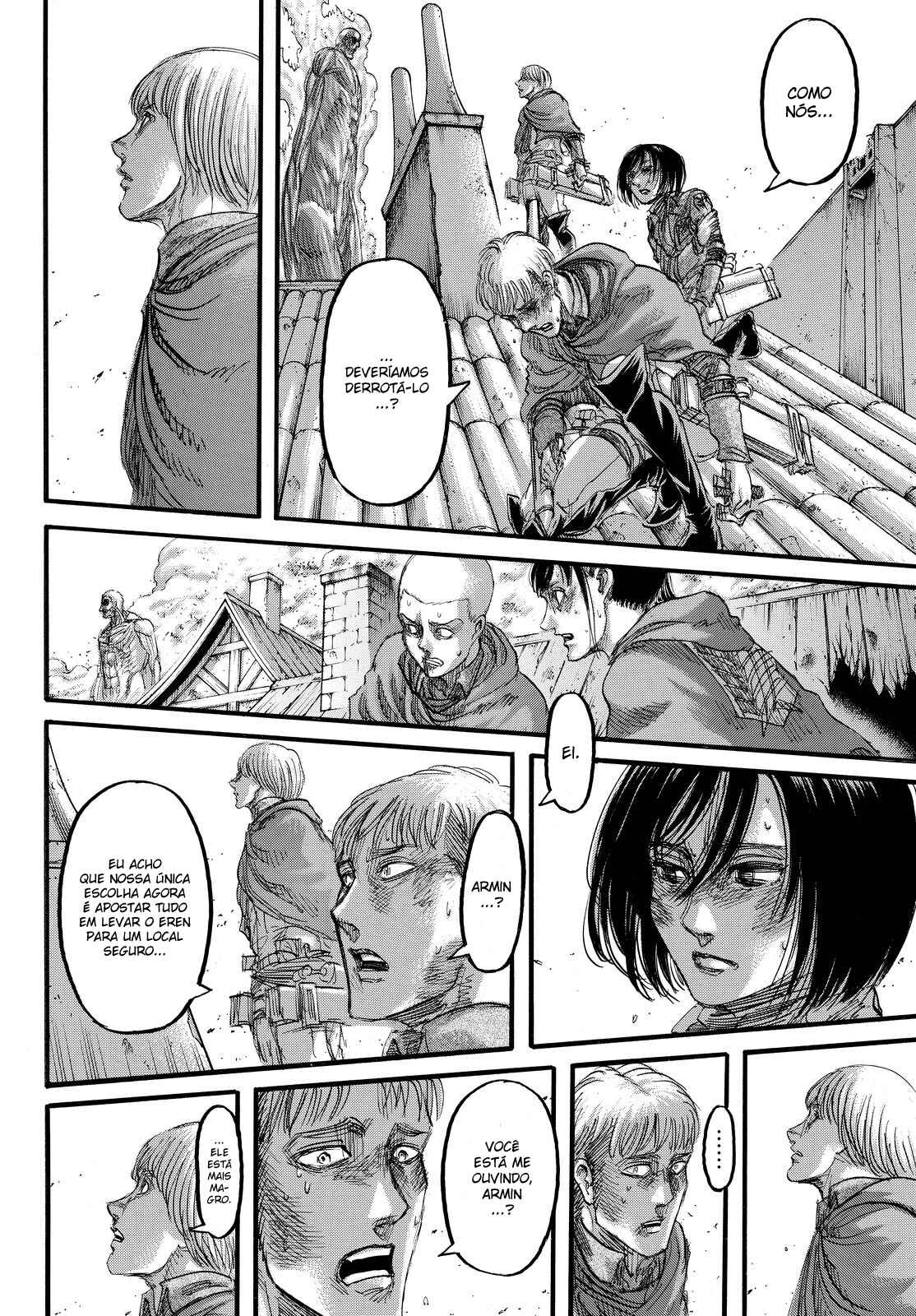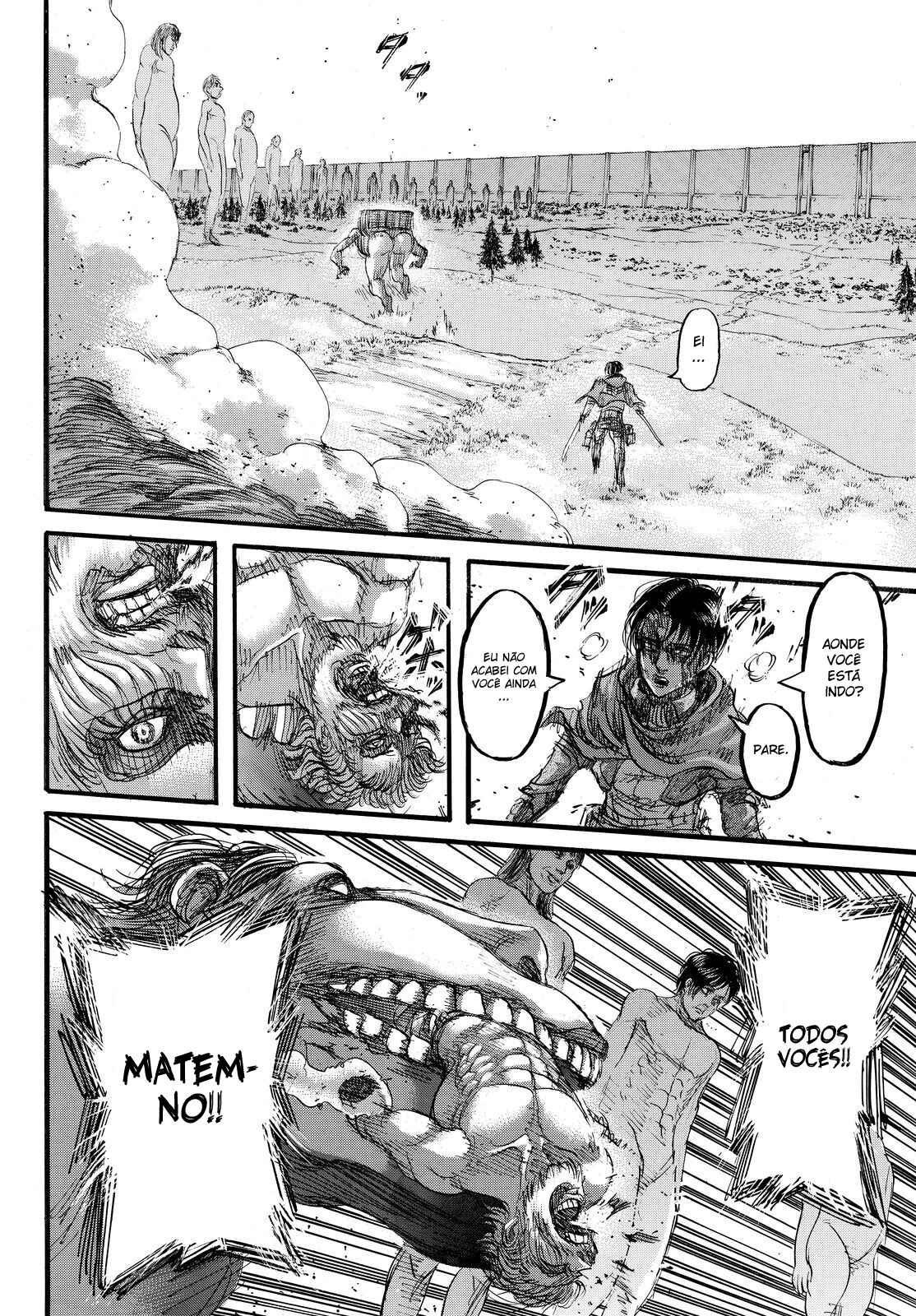 Capítulo 1 - Para Você, Após Dois Mil AnosCapítulo 2 - Aquele DiaCapítulo 3 - A Noite da GraduaçãoCapítulo 4 - Primeira BatalhaCapítulo 5 - Uma Fraca Luz em Meio ao DesesperoCapítulo 6 - O Mundo Que a Garota ViuCapítulo 7 - Lâmina PequenaCapítulo 8 - RugidoCapítulo 9 - Ouvindo as Batidas do CoraçãoCapítulo 10 - O Destino do Braço EsquerdoCapítulo 11 - RespostaCapítulo 12 - ÍconeCapítulo 13 - FeridaCapítulo 13.5Capítulo 14 - Desejo PrimordialCapítulo 15 - IndivíduosCapítulo 16 - NecessidadeCapítulo 17 - Força IlusóriaCapítulo 18 - O que Devo Fazer Agora?Capítulo 19 - Ainda Não VeemCapítulo 20 - Esquadrão de Operações EspeciaisCapítulo 21 - Abrem-se os PortõesCapítulo 22 - Formação de Detecção de Longo AlcanceCapítulo 22.5Capítulo 23 - A Titã FêmeaCapítulo 24 - A Floresta das Árvores GigantesCapítulo 25 - MordidaCapítulo 26 - Por um Caminho MelhorCapítulo 27 - Irvin SmithCapítulo 28 - Escolhas e ResultadosCapítulo 29 - Golpe de FerroCapítulo 30 - Os DerrotadosCapítulo 31 - SorrisoCapítulo 32 - ClemênciaCapítulo 33 - MuralhaCapítulo 34 - Os Guerreiros DançamCapítulo 35 - O Titã BestialCapítulo 36 - Estou em CasaCapítulo 37 - Ao SudesteCapítulo 38 - Castelo UtgardCapítulo 39 - SoldadoCapítulo 40 - YmirCapítulo 41 - HistoriaCapítulo 42 - GuerreiroCapítulo 43 - O Titã de ArmaduraCapítulo 44 - Golpear - Derrubar - DominarCapítulo 45 - Aqueles que PerseguemCapítulo 46 - AberturaCapítulo 47 - CriançasCapítulo 48 - AlguémCapítulo 49 - AtaqueCapítulo 50 - GritoCapítulo 50.5Capítulo 51 - Esquadrão LeviCapítulo 52 - Krista LenzCapítulo 53 - FumaçaCapítulo 54 - O Local do Contra-AtaqueCapítulo 55 - DorCapítulo 56 - AtoresCapítulo 57 - Kenny, o EstripadorCapítulo 58 - TiroteioCapítulo 59 - A Alma de um MonstroCapítulo 60 - ConfiançaCapítulo 61 - RespostasCapítulo 62 - CrimeCapítulo 63 - CorrentesCapítulo 64 - Festa de Boas VindasCapítulo 65 - Sonhos e MaldiçõesCapítulo 66 - DesejoCapítulo 67 - O Lado Externo do Distrito OrvudCapítulo 68 - O Rei da MuralhaCapítulo 69 - AmigosCapítulo 70 - Um Sonho do PassadoCapítulo 71 - EspectadorCapítulo 72 - A Noite da OperaçãoCapítulo 73 - A Cidade Onde Tudo ComeçouCapítulo 74 - Objetivos da MissãoCapítulo 75 - Duas Frentes de BatalhaCapítulo 76 - A Lança do TrovãoCapítulo 77 - O Mundo Que Eles ViramCapítulo 78 - VisitaCapítulo 79 - Jogo PerfeitoCapítulo 80 - Os Soldados DesconhecidosCapítulo 81 - PromessaCapítulo 82 - HeróiCapítulo 83 - Golpe de MachadoCapítulo 84 - Sol da Meia NoiteCapítulo 85 - PorãoCapítulo 86 - Aquele DiaCapítulo 87 - FronteiraCapítulo 88 - Ataque dos TitãsCapítulo 89 - ReuniãoCapítulo 90 - Para o Outro Lado da MuralhaCapítulo 91 - O Outro Lado do OceanoCapítulo 92 - Soldados de MarleyCapítulo 93 - Trem da Noite EscuraCapítulo 94 - O Garoto Dentro do MuroCapítulo 95 - MentirosoCapítulo 96 - O Portão da EsperançaCapítulo 97 - De Uma Mão para a OutraCapítulo 98 - Que BomCapítulo 99 - A Sombra de Uma Consciência CulpadaCapítulo 100 - Declaração de GuerraCapítulo 101 - O Gigante do Martelo de GuerraCapítulo 102 - E Tarde DemaisCapítulo 103 - AtaqueCapítulo 104 - VitoriososCapítulo 105 - A Bala do AssassinoCapítulo 106 - Soldados VoluntáriosCapítulo 107 - VisitanteCapítulo 108 - Um Bom ArgumentoCapítulo 109 - Aqueles Que GuiamCapítulo 110 - ImpostorCapítulo 111 - Crianças da FlorestaCapítulo 112 - IgnorânciaCapítulo 113 - ViolênciaCapítulo 114 - Única SalvaçãoCapítulo 115 - SuporteCapítulo 116 - Céu e TerraCapítulo 117 - JulgamentoCapítulo 118 - Ataque SurpresaCapítulo 119 - Irmãos Mais Velhos, Irmãos Mais NovosCapítulo 120 - Um Breve InstanteCapítulo 120 - InstanteCapítulo 121 - Memórias do FuturoCapítulo 121 - Memórias futurasCapítulo 122 - De Você 2000 Anos AtrásCapítulo 122 - De você, há 2000 anos.Capítulo 123 - Os demônios da ilhaCapítulo 123 - Demônios da ilhaCapítulo 124 - DerretimentoCapítulo 124 - DescongelamentoCapítulo 125 - Pôr do SolCapítulo 126 - OrgulhoCapítulo 126 - OrgulhoCapítulo 127 - Noite da Véspera do FimCapítulo 128 - TraidorCapítulo 129 - RetrospectivaCapítulo 130 - O amanhecer da humanidadeCapítulo 130 - Amanhecer Para a HumanidadeCapítulo 131 - EstrondoCapítulo 131 - O EstrondoCapítulo 132 - Asas da LiberdadeCapítulo 132 - As asas da liberdadeCapítulo 133 - PecadoresCapítulo 133 - PecadoresCapítulo 134 - Nas Profundezas do DesesperoCapítulo 135 - Batalha do Céu e da TerraCapítulo 135 - Batalha do Céu e da TerraCapítulo 136 - Dediquem Seus CoraçõesCapítulo 137 - TitãsCapítulo 138 - Um Longo SonhoCapítulo 139 - Em Direção a Árvore Naquela Colina