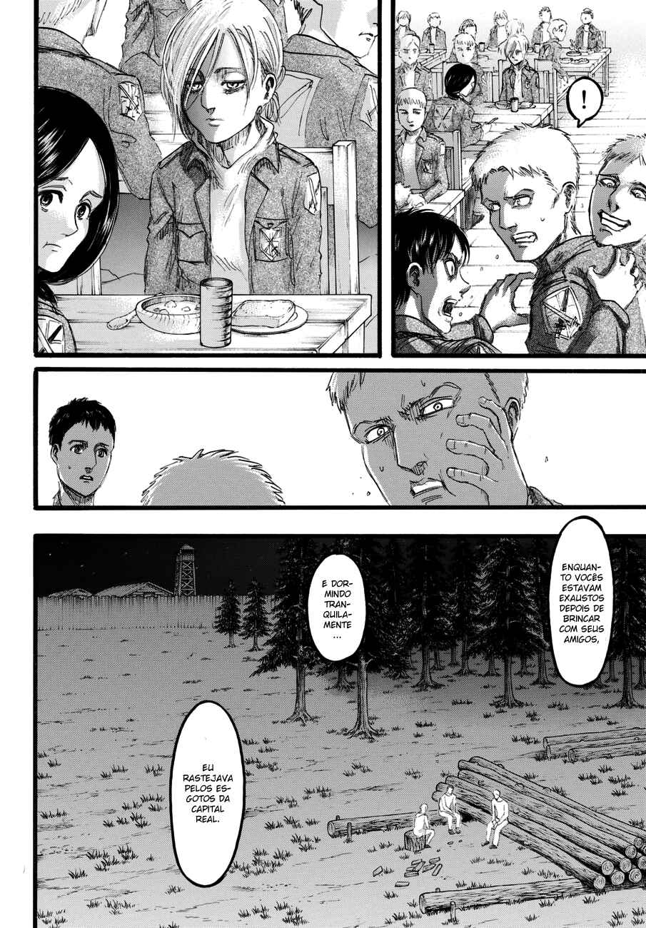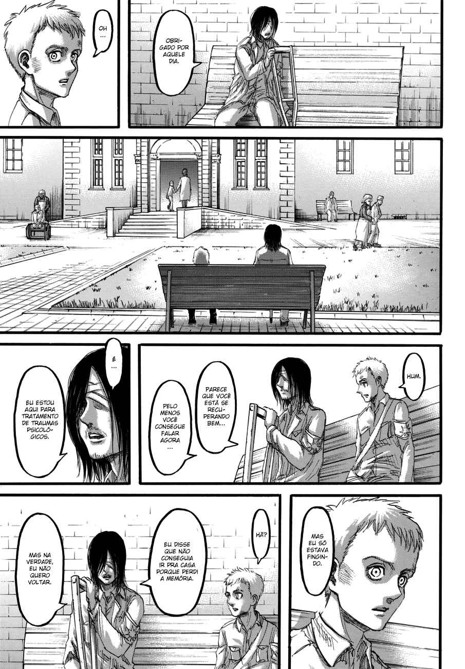 Capítulo 1 - Para Você, Após Dois Mil AnosCapítulo 2 - Aquele DiaCapítulo 3 - A Noite da GraduaçãoCapítulo 4 - Primeira BatalhaCapítulo 5 - Uma Fraca Luz em Meio ao DesesperoCapítulo 6 - O Mundo Que a Garota ViuCapítulo 7 - Lâmina PequenaCapítulo 8 - RugidoCapítulo 9 - Ouvindo as Batidas do CoraçãoCapítulo 10 - O Destino do Braço EsquerdoCapítulo 11 - RespostaCapítulo 12 - ÍconeCapítulo 13 - FeridaCapítulo 13.5Capítulo 14 - Desejo PrimordialCapítulo 15 - IndivíduosCapítulo 16 - NecessidadeCapítulo 17 - Força IlusóriaCapítulo 18 - O que Devo Fazer Agora?Capítulo 19 - Ainda Não VeemCapítulo 20 - Esquadrão de Operações EspeciaisCapítulo 21 - Abrem-se os PortõesCapítulo 22 - Formação de Detecção de Longo AlcanceCapítulo 22.5Capítulo 23 - A Titã FêmeaCapítulo 24 - A Floresta das Árvores GigantesCapítulo 25 - MordidaCapítulo 26 - Por um Caminho MelhorCapítulo 27 - Irvin SmithCapítulo 28 - Escolhas e ResultadosCapítulo 29 - Golpe de FerroCapítulo 30 - Os DerrotadosCapítulo 31 - SorrisoCapítulo 32 - ClemênciaCapítulo 33 - MuralhaCapítulo 34 - Os Guerreiros DançamCapítulo 35 - O Titã BestialCapítulo 36 - Estou em CasaCapítulo 37 - Ao SudesteCapítulo 38 - Castelo UtgardCapítulo 39 - SoldadoCapítulo 40 - YmirCapítulo 41 - HistoriaCapítulo 42 - GuerreiroCapítulo 43 - O Titã de ArmaduraCapítulo 44 - Golpear - Derrubar - DominarCapítulo 45 - Aqueles que PerseguemCapítulo 46 - AberturaCapítulo 47 - CriançasCapítulo 48 - AlguémCapítulo 49 - AtaqueCapítulo 50 - GritoCapítulo 50.5Capítulo 51 - Esquadrão LeviCapítulo 52 - Krista LenzCapítulo 53 - FumaçaCapítulo 54 - O Local do Contra-AtaqueCapítulo 55 - DorCapítulo 56 - AtoresCapítulo 57 - Kenny, o EstripadorCapítulo 58 - TiroteioCapítulo 59 - A Alma de um MonstroCapítulo 60 - ConfiançaCapítulo 61 - RespostasCapítulo 62 - CrimeCapítulo 63 - CorrentesCapítulo 64 - Festa de Boas VindasCapítulo 65 - Sonhos e MaldiçõesCapítulo 66 - DesejoCapítulo 67 - O Lado Externo do Distrito OrvudCapítulo 68 - O Rei da MuralhaCapítulo 69 - AmigosCapítulo 70 - Um Sonho do PassadoCapítulo 71 - EspectadorCapítulo 72 - A Noite da OperaçãoCapítulo 73 - A Cidade Onde Tudo ComeçouCapítulo 74 - Objetivos da MissãoCapítulo 75 - Duas Frentes de BatalhaCapítulo 76 - A Lança do TrovãoCapítulo 77 - O Mundo Que Eles ViramCapítulo 78 - VisitaCapítulo 79 - Jogo PerfeitoCapítulo 80 - Os Soldados DesconhecidosCapítulo 81 - PromessaCapítulo 82 - HeróiCapítulo 83 - Golpe de MachadoCapítulo 84 - Sol da Meia NoiteCapítulo 85 - PorãoCapítulo 86 - Aquele DiaCapítulo 87 - FronteiraCapítulo 88 - Ataque dos TitãsCapítulo 89 - ReuniãoCapítulo 90 - Para o Outro Lado da MuralhaCapítulo 91 - O Outro Lado do OceanoCapítulo 92 - Soldados de MarleyCapítulo 93 - Trem da Noite EscuraCapítulo 94 - O Garoto Dentro do MuroCapítulo 95 - MentirosoCapítulo 96 - O Portão da EsperançaCapítulo 97 - De Uma Mão para a OutraCapítulo 98 - Que BomCapítulo 99 - A Sombra de Uma Consciência CulpadaCapítulo 100 - Declaração de GuerraCapítulo 101 - O Gigante do Martelo de GuerraCapítulo 102 - E Tarde DemaisCapítulo 103 - AtaqueCapítulo 104 - VitoriososCapítulo 105 - A Bala do AssassinoCapítulo 106 - Soldados VoluntáriosCapítulo 107 - VisitanteCapítulo 108 - Um Bom ArgumentoCapítulo 109 - Aqueles Que GuiamCapítulo 110 - ImpostorCapítulo 111 - Crianças da FlorestaCapítulo 112 - IgnorânciaCapítulo 113 - ViolênciaCapítulo 114 - Única SalvaçãoCapítulo 115 - SuporteCapítulo 116 - Céu e TerraCapítulo 117 - JulgamentoCapítulo 118 - Ataque SurpresaCapítulo 119 - Irmãos Mais Velhos, Irmãos Mais NovosCapítulo 120 - Um Breve InstanteCapítulo 120 - InstanteCapítulo 121 - Memórias do FuturoCapítulo 121 - Memórias futurasCapítulo 122 - De Você 2000 Anos AtrásCapítulo 122 - De você, há 2000 anos.Capítulo 123 - Os demônios da ilhaCapítulo 123 - Demônios da ilhaCapítulo 124 - DerretimentoCapítulo 124 - DescongelamentoCapítulo 125 - Pôr do SolCapítulo 126 - OrgulhoCapítulo 126 - OrgulhoCapítulo 127 - Noite da Véspera do FimCapítulo 128 - TraidorCapítulo 129 - RetrospectivaCapítulo 130 - O amanhecer da humanidadeCapítulo 130 - Amanhecer Para a HumanidadeCapítulo 131 - EstrondoCapítulo 131 - O EstrondoCapítulo 132 - Asas da LiberdadeCapítulo 132 - As asas da liberdadeCapítulo 133 - PecadoresCapítulo 133 - PecadoresCapítulo 134 - Nas Profundezas do DesesperoCapítulo 135 - Batalha do Céu e da TerraCapítulo 135 - Batalha do Céu e da TerraCapítulo 136 - Dediquem Seus CoraçõesCapítulo 137 - TitãsCapítulo 138 - Um Longo SonhoCapítulo 139 - Em Direção a Árvore Naquela Colina