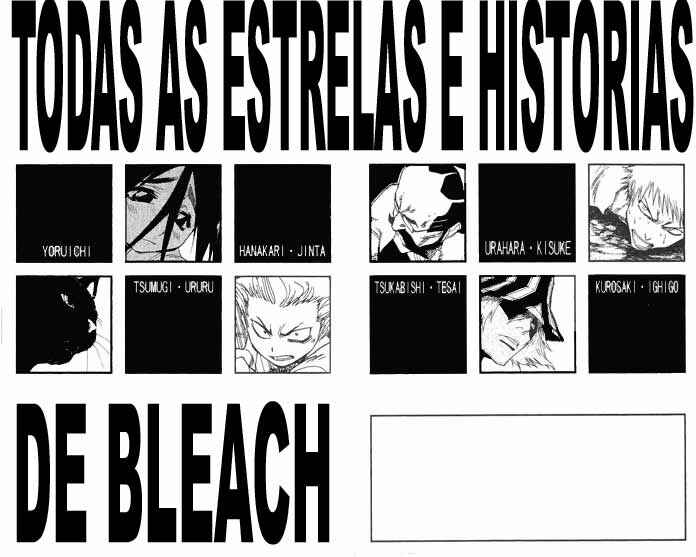 Capítulo 1 - Morte & MorangoCapítulo 2 - InicianteCapítulo 3 - Batendo CabeçaCapítulo 4 - POR QUE VOCÊ COME ISSO?Capítulo 5 - Cego - cegoCapítulo 6 - pequena quebra.Capítulo 7 - O Periquito de Bochechas RosasCapítulo 8 - Persiga o ChadCapítulo 9 - Monstro e uma Transferência [Golpe Baixo]Capítulo 10 - Monstro e uma Transferência 2 [o Fruto da Morte]Capítulo 11 - De Volta [Bomba Sanguessuga ou Mãe]Capítulo 12 - O Portão do FimCapítulo 13 - MAU PADRÃOCapítulo 14 - Perturbação Escolar!!!Capítulo 15 - Macaco Saltitante, EletrizadoCapítulo 16 - Desperdiçado mas DesejadoCapítulo 17 - 17 de JunhoCapítulo 18 - 17 de Junho 2 "Sem Sorrir, Sem Culpa"Capítulo 19 - 17 de Junho 3 "memórias na chuva"Capítulo 20 - 17 de Junho 4 "encare novamente"Capítulo 21 - 17 de Junho 5 "Garoto Lutador"Capítulo 22 - 17 de Junho 6 "BATALHA NO CEMITÉRIO"Capítulo 23 - 17 de Junho 7 "Intenção Afiada, Lâmina Estúpida"Capítulo 24 - 17 de Junho 8 "Todo O Caminho à Simpatia"Capítulo 25 - 17 de Junho 9 "Garoto Lutador 2 [O Blues do Charuto Mix]"Capítulo 26 - Paraíso Fica em Lugar NenhumCapítulo 27 - Espíritos Não Estão Sempre CONOSCOCapítulo 28 - Sintoma de SinestesiaCapítulo 29 - Pare aquele estúpido!!Capítulo 30 - Segundo Contato (isso estava fora de nossa compreensão)Capítulo 31 - HERÓIS PODEM SALVAR VOCÊCapítulo 32 - Herói está Sempre Comigo?Capítulo 33 - FUTURO VIBRANTE 7Capítulo 34 - Arqueiro Quincy Odeia VocêCapítulo 35 - Quer Ser Meu Inimigo?Capítulo 36 - Em Nome da Vingança, Nos Leve à MorteCapítulo 37 - Cruzando a LinhaCapítulo 38 - CURVADOCapítulo 39 - Braço Direito do GiganteCapítulo 40 - Crescer?Capítulo 41 - Princesa & DragãoCapítulo 42 - Princesa & Dragão 2: "O Majestoso"Capítulo 43 - Princesa & Dragão 3: "Seis Flores"Capítulo 44 - Despertar [para a Ameaça]Capítulo 45 - Ponto de FinalidadeCapítulo 46 - Karneades ~ Costa-a-CostaCapítulo 47 - Costa-a-Costa ~ Céu DislaceradoCapítulo 48 - Menos GrandeCapítulo 49 - desacorrentadoCapítulo 50 - Arqueiro Quincy Odeia Você 2 [Cego Mas Sangrando Mix]Capítulo 51 - MORTE 3Capítulo 52 - Emoções DesnecessáriasCapítulo 53 - Prazer em conhecê-lo, vou te derrotarCapítulo 54 - O Novato que nem Pergunta o NomeCapítulo 55 - FECHADOCapítulo 56 - código quebradoCapítulo 57 - Infindável Chuva de JulhoCapítulo 58 - vazioCapítulo 59 - Lição 1: Um Golpe! + Prisioneiro em CasaCapítulo 60 - Lição 1-2: DETONADO!!Capítulo 61 - Lição 2: Eixo quebradoCapítulo 62 - Lição 2-2: Péssimo Fim no EixoCapítulo 63 - Lição 2-3: Colapso do Cicuito InternoCapítulo 64 - RETORNO EM PRETOCapítulo 65 - ColisõesCapítulo 66 - A ESPADA E EUCapítulo 67 - Fim das LiçõesCapítulo 68 - Últimas Férias de VerãoCapítulo 69 - 25:00 reuniãoCapítulo 70 - Onde os Hollows Temem PisarCapítulo 71 - INTRUSOZCapítulo 72 - O SupergrupoCapítulo 73 - Chuva de MachadosCapítulo 74 - Braço Perdido, Braço PerdidoCapítulo 75 - Chuva de SangueCapítulo 76 - Piloto de Javali ChegandoCapítulo 77 - Meu Nome é Ganju-samaCapítulo 78 - reuniãO nO porãOCapítulo 79 - QUATORZE DIAS PARA A CONSPIRAÇÃOCapítulo 80 - O Projeto Estrela CadenteCapítulo 81 - Reunião de Doze TonsCapítulo 82 - Composição do ConflitoCapítulo 83 - VENHA COMIGOCapítulo 84 - O Projeto Estrela Cadente 2 [Tatuagem No Céu]Capítulo 85 - INTRUSOZ 2 [Arrombando o telhado mix]Capítulo 86 - Estabelecendo Boas Relações, CERTO?Capítulo 87 - Dançando com LançasCapítulo 88 - SOMOS TÃO AZARADOSCapítulo 89 - Magistral! E Adeus!Capítulo 90 - Vejo Você Sob Fogos de ArtifícioCapítulo 91 - REI PROTETOR DA LIBERDADECapítulo 92 - Magistral! E Adeus! [Reprise]Capítulo 93 - Dirigindo-se para a EstrelaCapítulo 94 - Cadeia Chamada RemorsoCapítulo 95 - COLISÃOCapítulo 96 - CONFLITO SANGRENTOCapítulo 97 - Fale Sobre Seu MedoCapítulo 98 - A Estrela e o Vira-LataCapítulo 99 - Negra Nuvem de Guerra MortalCapítulo 100 - Como a Flor de um PrecipícioCapítulo 101 - Divisão Sob a Base VermelhaCapítulo 102 - Ninguém DerrubaCapítulo 103 - SoberaniaCapítulo 104 - O Morto-vivoCapítulo 105 - Pule, Pule, Encontre o TigreCapítulo 106 - Razão do ConfrontoCapítulo 107 - Paixão na ConfiançaCapítulo 108 - Tempo de PânicoCapítulo 109 - Como um Tigre Tentando Não Esmagar as FloresCapítulo 110 - Lado Negro do UniversoCapítulo 111 - Preto & BrancoCapítulo 112 - O Morto-vivo 2 [Ascensão & Loucura]Capítulo 113 - O Morto-vivo 3 [Acabando com a Loucura]Capítulo 114 - Tudo Sobre o Mundo que DesmoronaCapítulo 115 - RemanescênciasCapítulo 116 - Abalo à Torre BrancaCapítulo 117 - Remanescências 2 [Negação à Sombra]Capítulo 118 - O Elo CelestialCapítulo 119 - Segredo da LuaCapítulo 120 - Aperto de Mãos com GranadasCapítulo 121 - Confiamos na SanidadeCapítulo 122 - Não Perca o ControleCapítulo 123 - Juro pelo Meu OrgulhoCapítulo 124 - Pequenas Pessoas ChorandoCapítulo 125 - Insano & GenialCapítulo 126 - O Último de uma Guerra sem SentidoCapítulo 127 - Começo da Morte do AmanhãCapítulo 128 - O Grande Esforço ColetivoCapítulo 129 - Suspeita [de Assassinato]Capítulo 130 - Suspeita 2 [de Fazer Chorar]Capítulo 131 - O Verdadeiro DesejoCapítulo 132 - Limite AssustadorCapítulo 133 - memórias na chuva 2 "o noturno"Capítulo 134 - memórias na chuva 2 - 2 "Ânsia pelo Santuário"Capítulo 135 - memórias na chuva 2 - 3 "Afetados Pela Noite"Capítulo 136 - memórias na chuva 2 - 4 "noite do arrependimento"Capítulo 137 - Cerco ApertadoCapítulo 138 - Pensamentos IndividuaisCapítulo 139 - Cansado, Ensanguentado, LoucoCapítulo 140 - Mordida na LuaCapítulo 141 - Ajoelhe-se para o Rei dos BabuínosCapítulo 142 - Para Aqueles que Capturam a LuaCapítulo 143 - Almas ArdentesCapítulo 144 - Mais Vermelho que uma Rosa, Mais Branco que um LírioCapítulo 145 - AgitadoCapítulo 146 - Demônio Adora as TrevasCapítulo 147 - Contagem Regressiva para o Fim: 3 [Luz Cega, Batida Surda]Capítulo 148 - Contagem Regressiva par