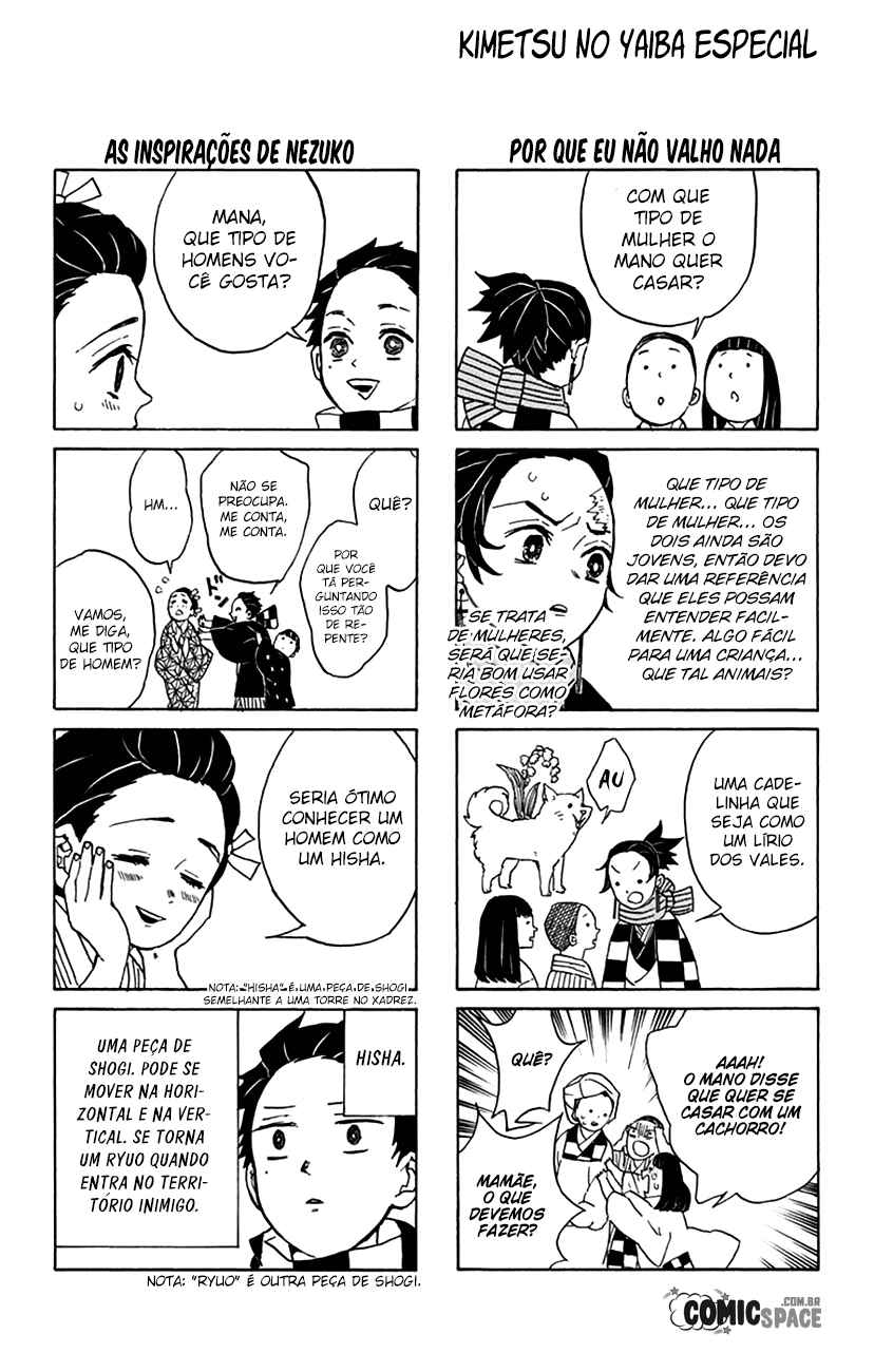 Capítulo 1 - CrueldadeCapítulo 2 - Alguém desconhecidoCapítulo 3 - Volte antes do amanhecerCapítulo 4 - Diário de Tanjirou - parte 1Capítulo 5 - Diário de Tanjirou - parte 2Capítulo 6 - Pilha de mãosCapítulo 7 - Espíritos da morteCapítulo 8 - IrmãozãoCapítulo 9 - Bem vindo de voltaCapítulo 10 - Pântano do sequestroCapítulo 11 - EnsinamentosCapítulo 12 - Eu não posso falarCapítulo 13 - Você é...Capítulo 14 - A fúria de Kibutsuji, a sedutora fragrância de sangueCapítulo 15 - A opinião da doutoraCapítulo 16 - O jogo das esferasCapítulo 17 - O demônio das flechasCapítulo 18 - MaldiçãoCapítulo 19 - Sempre juntosCapítulo 20 - Agatsuma ZenitsuCapítulo 21 - A casa do tamborCapítulo 22 - A aparição repentina de um porcoCapítulo 22.5 - EspecialCapítulo 23 - O porco descobre suas presas - Zenitsu dormeCapítulo 24 - Ex-lua demoníacaCapítulo 25 - Auto-inspiraçãoCapítulo 25.5 - EspecialCapítulo 26 - Luta de mãos nuasCapítulo 27 - Hashibira InosukeCapítulo 28 - Convocação de emergênciaCapítulo 29 - Montanha NatagumoCapítulo 30 - MarionetesCapítulo 31 - Se eu não seguir em frente sozinho, que seguirá?Capítulo 32 - Fedor forteCapítulo 33 - Dor, avançando enquanto se contorceCapítulo 34 - A espada mais forteCapítulo 35 - DispersoCapítulo 36 - Isso é mauCapítulo 37 - Espada quebradaCapítulo 38 - Genuíno e falsoCapítulo 39 - Quando a vida passa diante dos olhosCapítulo 40 - Deus do fogoCapítulo 41 - Kochou ShinobuCapítulo 42 - AtrásCapítulo 43 - Para o infernoCapítulo 43.5 - ExtraCapítulo 44 - Violação na conduta dos caçadores de demôniosCapítulo 45 - Julgamento conjunto dos Pilares caçadores de demôniosCapítulo 46 - Oyakata-samaCapítulo 47 - HuffCapítulo 48 - A área borboletaCapítulo 49 - Treino funcional de recuperação: parte 1Capítulo 50 - Treino funcional de recuperação: parte 2Capítulo 51 - A espada de nichirin volta para casaCapítulo 52 - ImpiedosoCapítulo 53 - Você é...Capítulo 54 - Boa noite, Rengoku-sanCapítulo 55 - O trem dos sonhos infinitosCapítulo 56 - AcordeCapítulo 57 - Você tem sua espadaCapítulo 58 - Bom diaCapítulo 59 - InsultoCapítulo 59.1 - ExtraCapítulo 59.5 - Arco extraCapítulo 60 - Protegendo 200 pessoasCapítulo 61 - Lutando em um espaço estreitoCapítulo 62 - O pesadelo acabaCapítulo 63 - AkazaCapítulo 64 - A força dos demônios superiores e a força dos PilaresCapítulo 65 - Quem ganhou?Capítulo 66 - O amanhecer se espalhaCapítulo 67 - O que você está buscandoCapítulo 68 - UsuárioCapítulo 69 - Siga em frente. Não importa se for pouco a poucoCapítulo 70 - SequestroCapítulo 71 - O grande distrito da luz vermelha, operação infiltraçãoCapítulo 71.5 - GIGA - Extra: Os contos de InosukeCapítulo 72 - A procura pelas esposasCapítulo 73 - PerseguiçãoCapítulo 74 - DakiCapítulo 75 - O pensamento de cada umCapítulo 76 - O lugar de cada umCapítulo 77 - TrovejanteCapítulo 78 - VagandoCapítulo 79 - Buraco de arCapítulo 80 - ValorCapítulo 81 - Sobrepondo memóriasCapítulo 82 - Humanos e DemôniosCapítulo 83 - TransfiguraçãoCapítulo 84 - Coisa PreciosaCapítulo 85 - BerrandoCapítulo 86 - GyuutarouCapítulo 87 - ReunindoCapítulo 88 - O caminho para a VitóriaCapítulo 89 - Vale tudoCapítulo 90 - Em dívida com vocêCapítulo 91 - Mudança de PlanosCapítulo 92 - Verme, estúpido, covarde entre os idiotasCapítulo 93 - Nunca desistaCapítulo 94 - Faça alguma coisaCapítulo 95 - Momentos FinaisCapítulo 95.5 - Extra Jump GIGACapítulo 96 - Não importa quantas vezes eu nasça de novo (parte 1)Capítulo 97 - Não importa quantas vezes eu nasça de novo (parte 2)Capítulo 98 - Reunião das Luas superioresCapítulo 99 - O sonho de alguémCapítulo 100 - Agora, para a vila!!Capítulo 101 - Conversa secretaCapítulo 102 - Olá, Tokitou-kunCapítulo 103 - Yorichi ZeroshikiCapítulo 104 - Kotetsu-sanCapítulo 105 - Alguma coisa apareceuCapítulo 106 - Ataque inimigoCapítulo 107 - No caminhoCapítulo 108 - Obrigado, Tokitou-kunCapítulo 109 - Não vou morrerCapítulo 110 - Barulhos no galpão abandonadoCapítulo 111 - Ares de um artistaCapítulo 112 - Transição completaCapítulo 113 - Espada vermelhaCapítulo 114 - Querendo ser aceitoCapítulo 115 - Para ser um PilarCapítulo 116Capítulo 117Capítulo 118Capítulo 119Capítulo 120Capítulo 121Capítulo 122Capítulo 123Capítulo 124Capítulo 125Capítulo 126Capítulo 127Capítulo 128Capítulo 129Capítulo 130Capítulo 131Capítulo 132Capítulo 133Capítulo 134Capítulo 135Capítulo 136Capítulo 137Capítulo 138Capítulo 139Capítulo 140Capítulo 141Capítulo 142Capítulo 143Capítulo 144Capítulo 145Capítulo 146Capítulo 147Capítulo 148Capítulo 149Capítulo 150Capítulo 151Capítulo 152Capítulo 153Capítulo 154Capítulo 155Capítulo 156Capítulo 157Capítulo 158Capítulo 159Capítulo 160Capítulo 161Capítulo 162Capítulo 163Capítulo 164Capítulo 165Capítulo 166Capítulo 167Capítulo 168Capítulo 169Capítulo 170Capítulo 171Capítulo 172Capítulo 173Capítulo 174Capítulo 175Capítulo 176Capítulo 177Capítulo 178Capítulo 179Capítulo 180Capítulo 181Capítulo 182Capítulo 183Capítulo 184Capítulo 185Capítulo 186Capítulo 186 - Velhas LembrançasCapítulo 187Capítulo 187 - Pessoa InocenteCapítulo 188Capítulo 189Capítulo 190Capítulo 191Capítulo 192Capítulo 193Capítulo 194Capítulo 195Capítulo 196Capítulo 197Capítulo 198Capítulo 199Capítulo 200Capítulo 201Capítulo 202Capítulo 202 - Vamos Voltar Para CasaCapítulo 203Capítulo 204 - Um Mundo Sem DemôniosCapítulo 204Capítulo 205 - Vidas Que Brilham ao Longo dos AnosCapítulo 205.5