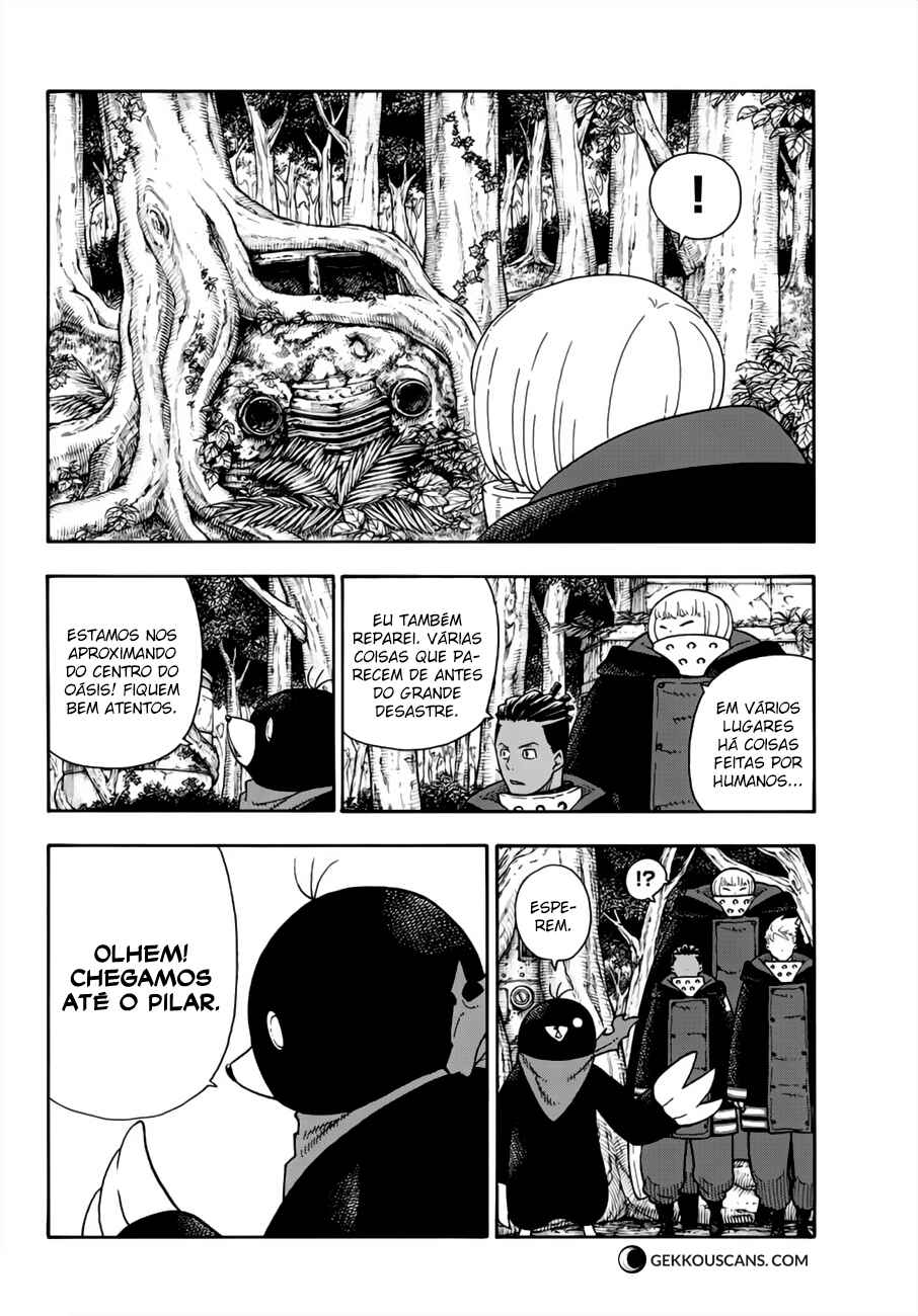 Capítulo 0 - Shinra Kusakabe entra na EquipeCapítulo - Roubar? ou Homenagem?Capítulo 1 - EstréiaCapítulo 2 - O Demônio, O Cavaleiro, E a BruxaCapítulo 3 - O Coração de um BombeiroCapítulo 4 - O Suspeito BlasfemoCapítulo 5 - O Torneio dos Bombeiros NovatosCapítulo 6 - O Mal de Descobrir a VerdadeCapítulo 7 - O Demônio e o JokerCapítulo 8 - Procurando pela VerdadeCapítulo 9 - O que a 8ª PersegueCapítulo 10 - O Indivíduo de Fogo com ConsciênciaCapítulo 11 - O Herói e a PrincesaCapítulo 12 - A 5ª e a 8ª BrigadaCapítulo 13 - EsperaCapítulo 14 - A Determinação da Donzela SagradaCapítulo 15 - A Guerra ComeçaCapítulo 16 - A Derrota do CavaleiroCapítulo 17 - Shinra VS HibanaCapítulo 18 - ConfrontoCapítulo 19 - A Promessa de HibanaCapítulo 20 - O Lugar Onde Nascem as ChamasCapítulo 21 - Início da InvestigaçãoCapítulo 22 - Plano de Infiltração no Primeiro BatalhãoCapítulo 24 - Shinra vs. BurnsCapítulo 25 - Persiga o InimigoCapítulo 26 - Inseto das ChamasCapítulo 27 - Mal ImperdoávelCapítulo 28 - Shinra vs. RekkaCapítulo 29 - Punho ou Perna?Capítulo 30 - O Homem Que Está por TrásCapítulo 31 - O Mal que se Espalha Como ChamasCapítulo 32 - Um Novo InimigoCapítulo 33 - Heróis se Reúnem!Capítulo 34 - Jovem CavaleiroCapítulo 35 - PromessaCapítulo 36 - Formação da Oitava Brigada Especial de Incêndio - 1ª ParteCapítulo 37 - Formação da Oitava Brigada Especial de Incêndio - 2ª ParteCapítulo 38 - Onde os Que Vestem Branco EstãoCapítulo 39 - Extintor Mais PotenteCapítulo 40 - A Noite Antes da Guerra de AsakusaCapítulo 41 - A Aliança de Bombeiros do ÓdioCapítulo 42 - Oubi VS BenimaruCapítulo 43 - O Motivo da LutaCapítulo 44 - O Sétimo Batalhão NasceCapítulo 45 - A Armadilha PlanejadaCapítulo 46 - Persiga o Atirador!Capítulo 47 - Luta de Dois Contra DoisCapítulo 48 - O Orgulho de AsakusaCapítulo 49 - Festival de BrigasCapítulo 50 - Chama Para Quem?Capítulo 51 - TaçasCapítulo 52 - O Mundo das ChamasCapítulo 53 - O Deus da Forja!Capítulo 54 - Aqueles com Manobras SecretasCapítulo 55 - O Sonho do EngenheiroCapítulo 56 - Rei Cavaleiro CavalgandoCapítulo 57 - Dilema!!Capítulo 58 - Nós Somos FamiliaCapítulo 59 - Chegada!Capítulo 60 - Preto, Branco e CinzaCapítulo 61 - Espada SagradaCapítulo 62 - PromessaCapítulo 63 - AmigoCapítulo 64 - O Local do TreinamentoCapítulo 65 - O Ponto de IgniçãoCapítulo 66 - Os Resultados de Cada UmCapítulo 67 - Indo ao NetherCapítulo 68 - Perdidos no EscuroCapítulo 69 - Maki Vs FlailCapítulo 70 - O Que é ProtegerCapítulo 71 - Tamaki vs AssaultCapítulo 72 - Aonde a Bala VaiCapítulo 73 - Se OrgulhandoCapítulo 74 - Espada Longa RelâmpagoCapítulo 75 - Orgulho da Brigada de IncêndioCapítulo 76 - Desejo PerfuranteCapítulo 77 - Aquele Que Se ConectaCapítulo 78 - IrmãosCapítulo 79 - Além da Luta até a MorteCapítulo 80 - A Habilidade de ShouCapítulo 81 - A Força de Vontade do IrmãoCapítulo 82 - A Proteção Divina do ConversorCapítulo 83 - Quarta GeraçãoCapítulo 84 - SorrisoCapítulo 85 - Conspiração DeclaradaCapítulo 86 - RecuperaçãoCapítulo 87 - Doutora e ChamaCapítulo 88 - O Passado e o PresenteCapítulo 89 - Passado em ChamasCapítulo 90 - O Final da TragédiaCapítulo 91 - A Luta dos HomensCapítulo 92 - Replanejamento do Chefe da CompanhiaCapítulo 93 - Quarto BatalhãoCapítulo 94 - Souichirou ArgCapítulo 95 - Chamas da RaivaCapítulo 96 - Colegas ReunidosCapítulo 97 - O Motivo do Cavaleiro ReiCapítulo 98 - Shinra vs. ArthurCapítulo 99 - Uma Nova LenhaCapítulo 100 - Aroma das ChamasCapítulo 101 - Tragédia em ChamasCapítulo 102 - Punho SelvagemCapítulo 103 - Tateando nas ChamasCapítulo 104 - Laços do IncêndioCapítulo 105 - ConclusãoCapítulo 106 - Segunda GeraçãoCapítulo 107 - Selo de ChifresCapítulo 108 - O Plano Secreto de LichtCapítulo 109 - Momento CriticoCapítulo 110 - A Hora da EscolhaCapítulo 111 - O Próximo PassoCapítulo 112 - Rumo ao DesconhecidoCapítulo 113 - O Mundo de ForaCapítulo 114 - O Caminho Para o OásisCapítulo 115 - OásisCapítulo 116 - Terra SagradaCapítulo 117 - O Mal Escondido nas ChamasCapítulo 118 - O LíderCapítulo 119 - O Mistério do DeusCapítulo 120 - NúcleoCapítulo 121 - 1 Segundo - 250 AnosCapítulo 122 - Mulher ObscuraCapítulo 123 - Uma Sombra ApareceCapítulo 124 - Herói SombrioCapítulo 125 - A Luz Que Nasce das TrevasCapítulo 126 - Na Sombra do SolCapítulo 127 - Ignição FrontalCapítulo 128 - Grupal e IndividualCapítulo 129 - Caolhos se EnfrentamCapítulo 130 - A Verdade OcultaCapítulo 131 - PesquisadorCapítulo 132 - Confiança e VerdadeCapítulo 133 - O Forte e o MalignoCapítulo 134 - A verdade da MaqueteCapítulo 135 - Shinigami das CinzasCapítulo 136 - Luta em Território InimigoCapítulo 137 - Anjo VS BruxaCapítulo 138 - Coração que confiaCapítulo 139 - Batalha Entre os Três GrandesCapítulo 140 - Batalha de MulheresCapítulo 141Capítulo 142Capítulo 143Capítulo 144Capítulo 145Capítulo 146Capítulo 147Capítulo 148Capítulo 149Capítulo 150Capítulo 151Capítulo 152Capítulo 153Capítulo 154Capítulo 155Capítulo 156Capítulo 157Capítulo 158Capítulo 159Capítulo 160Capítulo 161Capítulo 162Capítulo 163Capítulo 164Capítulo 165Capítulo 166Capítulo 167Capítulo 168Capítulo 169Capítulo 170Capítulo 171Capítulo 172Capítulo 173Capítulo 174Capítulo 175Capítulo 176Capítulo 177Capítulo 178Capítulo 179Capítulo 180Capítulo 181Capítulo 182Capítulo 183Capítulo 184Capítulo 185Capítulo 186Capítulo 187Capítulo 188Capítulo 189Capítulo 190Capítulo 191Capítulo 192Capítulo 193Capítulo 194Capítulo 195Capítulo 196Capítulo 197Capítulo 198Capítulo 199Capítulo 200Capítulo 201Capítulo 202 - A Grande Aventura do Cavaleiro ReiCapítulo 203 - Uma DescobertaCapítulo 204 - A Família do Cavaleiro ReiCapítulo 205 - A lâmina Sagrada Renasce!Capítulo 206 - ConexãoCapítulo 207 - FugaCapítulo 208 - A Reunião FinalCapítulo 209 - Feudo SecretoCapí