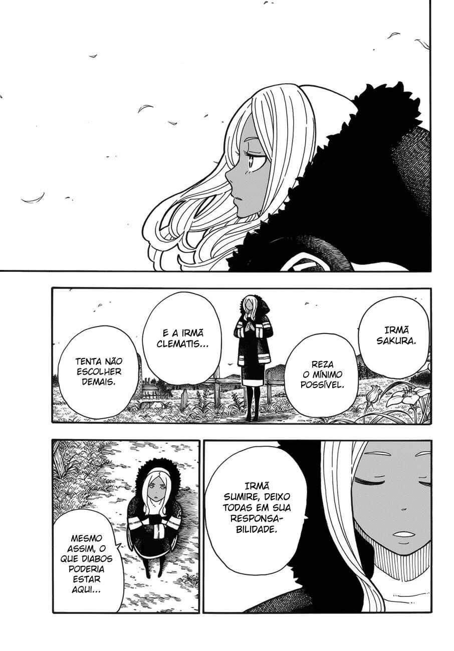 Capítulo 0 - Shinra Kusakabe entra na EquipeCapítulo - Roubar? ou Homenagem?Capítulo 1 - EstréiaCapítulo 2 - O Demônio, O Cavaleiro, E a BruxaCapítulo 3 - O Coração de um BombeiroCapítulo 4 - O Suspeito BlasfemoCapítulo 5 - O Torneio dos Bombeiros NovatosCapítulo 6 - O Mal de Descobrir a VerdadeCapítulo 7 - O Demônio e o JokerCapítulo 8 - Procurando pela VerdadeCapítulo 9 - O que a 8ª PersegueCapítulo 10 - O Indivíduo de Fogo com ConsciênciaCapítulo 11 - O Herói e a PrincesaCapítulo 12 - A 5ª e a 8ª BrigadaCapítulo 13 - EsperaCapítulo 14 - A Determinação da Donzela SagradaCapítulo 15 - A Guerra ComeçaCapítulo 16 - A Derrota do CavaleiroCapítulo 17 - Shinra VS HibanaCapítulo 18 - ConfrontoCapítulo 19 - A Promessa de HibanaCapítulo 20 - O Lugar Onde Nascem as ChamasCapítulo 21 - Início da InvestigaçãoCapítulo 22 - Plano de Infiltração no Primeiro BatalhãoCapítulo 24 - Shinra vs. BurnsCapítulo 25 - Persiga o InimigoCapítulo 26 - Inseto das ChamasCapítulo 27 - Mal ImperdoávelCapítulo 28 - Shinra vs. RekkaCapítulo 29 - Punho ou Perna?Capítulo 30 - O Homem Que Está por TrásCapítulo 31 - O Mal que se Espalha Como ChamasCapítulo 32 - Um Novo InimigoCapítulo 33 - Heróis se Reúnem!Capítulo 34 - Jovem CavaleiroCapítulo 35 - PromessaCapítulo 36 - Formação da Oitava Brigada Especial de Incêndio - 1ª ParteCapítulo 37 - Formação da Oitava Brigada Especial de Incêndio - 2ª ParteCapítulo 38 - Onde os Que Vestem Branco EstãoCapítulo 39 - Extintor Mais PotenteCapítulo 40 - A Noite Antes da Guerra de AsakusaCapítulo 41 - A Aliança de Bombeiros do ÓdioCapítulo 42 - Oubi VS BenimaruCapítulo 43 - O Motivo da LutaCapítulo 44 - O Sétimo Batalhão NasceCapítulo 45 - A Armadilha PlanejadaCapítulo 46 - Persiga o Atirador!Capítulo 47 - Luta de Dois Contra DoisCapítulo 48 - O Orgulho de AsakusaCapítulo 49 - Festival de BrigasCapítulo 50 - Chama Para Quem?Capítulo 51 - TaçasCapítulo 52 - O Mundo das ChamasCapítulo 53 - O Deus da Forja!Capítulo 54 - Aqueles com Manobras SecretasCapítulo 55 - O Sonho do EngenheiroCapítulo 56 - Rei Cavaleiro CavalgandoCapítulo 57 - Dilema!!Capítulo 58 - Nós Somos FamiliaCapítulo 59 - Chegada!Capítulo 60 - Preto, Branco e CinzaCapítulo 61 - Espada SagradaCapítulo 62 - PromessaCapítulo 63 - AmigoCapítulo 64 - O Local do TreinamentoCapítulo 65 - O Ponto de IgniçãoCapítulo 66 - Os Resultados de Cada UmCapítulo 67 - Indo ao NetherCapítulo 68 - Perdidos no EscuroCapítulo 69 - Maki Vs FlailCapítulo 70 - O Que é ProtegerCapítulo 71 - Tamaki vs AssaultCapítulo 72 - Aonde a Bala VaiCapítulo 73 - Se OrgulhandoCapítulo 74 - Espada Longa RelâmpagoCapítulo 75 - Orgulho da Brigada de IncêndioCapítulo 76 - Desejo PerfuranteCapítulo 77 - Aquele Que Se ConectaCapítulo 78 - IrmãosCapítulo 79 - Além da Luta até a MorteCapítulo 80 - A Habilidade de ShouCapítulo 81 - A Força de Vontade do IrmãoCapítulo 82 - A Proteção Divina do ConversorCapítulo 83 - Quarta GeraçãoCapítulo 84 - SorrisoCapítulo 85 - Conspiração DeclaradaCapítulo 86 - RecuperaçãoCapítulo 87 - Doutora e ChamaCapítulo 88 - O Passado e o PresenteCapítulo 89 - Passado em ChamasCapítulo 90 - O Final da TragédiaCapítulo 91 - A Luta dos HomensCapítulo 92 - Replanejamento do Chefe da CompanhiaCapítulo 93 - Quarto BatalhãoCapítulo 94 - Souichirou ArgCapítulo 95 - Chamas da RaivaCapítulo 96 - Colegas ReunidosCapítulo 97 - O Motivo do Cavaleiro ReiCapítulo 98 - Shinra vs. ArthurCapítulo 99 - Uma Nova LenhaCapítulo 100 - Aroma das ChamasCapítulo 101 - Tragédia em ChamasCapítulo 102 - Punho SelvagemCapítulo 103 - Tateando nas ChamasCapítulo 104 - Laços do IncêndioCapítulo 105 - ConclusãoCapítulo 106 - Segunda GeraçãoCapítulo 107 - Selo de ChifresCapítulo 108 - O Plano Secreto de LichtCapítulo 109 - Momento CriticoCapítulo 110 - A Hora da EscolhaCapítulo 111 - O Próximo PassoCapítulo 112 - Rumo ao DesconhecidoCapítulo 113 - O Mundo de ForaCapítulo 114 - O Caminho Para o OásisCapítulo 115 - OásisCapítulo 116 - Terra SagradaCapítulo 117 - O Mal Escondido nas ChamasCapítulo 118 - O LíderCapítulo 119 - O Mistério do DeusCapítulo 120 - NúcleoCapítulo 121 - 1 Segundo - 250 AnosCapítulo 122 - Mulher ObscuraCapítulo 123 - Uma Sombra ApareceCapítulo 124 - Herói SombrioCapítulo 125 - A Luz Que Nasce das TrevasCapítulo 126 - Na Sombra do SolCapítulo 127 - Ignição FrontalCapítulo 128 - Grupal e IndividualCapítulo 129 - Caolhos se EnfrentamCapítulo 130 - A Verdade OcultaCapítulo 131 - PesquisadorCapítulo 132 - Confiança e VerdadeCapítulo 133 - O Forte e o MalignoCapítulo 134 - A verdade da MaqueteCapítulo 135 - Shinigami das CinzasCapítulo 136 - Luta em Território InimigoCapítulo 137 - Anjo VS BruxaCapítulo 138 - Coração que confiaCapítulo 139 - Batalha Entre os Três GrandesCapítulo 140 - Batalha de MulheresCapítulo 141Capítulo 142Capítulo 143Capítulo 144Capítulo 145Capítulo 146Capítulo 147Capítulo 148Capítulo 149Capítulo 150Capítulo 151Capítulo 152Capítulo 153Capítulo 154Capítulo 155Capítulo 156Capítulo 157Capítulo 158Capítulo 159Capítulo 160Capítulo 161Capítulo 162Capítulo 163Capítulo 164Capítulo 165Capítulo 166Capítulo 167Capítulo 168Capítulo 169Capítulo 170Capítulo 171Capítulo 172Capítulo 173Capítulo 174Capítulo 175Capítulo 176Capítulo 177Capítulo 178Capítulo 179Capítulo 180Capítulo 181Capítulo 182Capítulo 183Capítulo 184Capítulo 185Capítulo 186Capítulo 187Capítulo 188Capítulo 189Capítulo 190Capítulo 191Capítulo 192Capítulo 193Capítulo 194Capítulo 195Capítulo 196Capítulo 197Capítulo 198Capítulo 199Capítulo 200Capítulo 201Capítulo 202 - A Grande Aventura do Cavaleiro ReiCapítulo 203 - Uma DescobertaCapítulo 204 - A Família do Cavaleiro ReiCapítulo 205 - A lâmina Sagrada Renasce!Capítulo 206 - ConexãoCapítulo 207 - FugaCapítulo 208 - A Reunião FinalCapítulo 209 - Feudo SecretoCapí