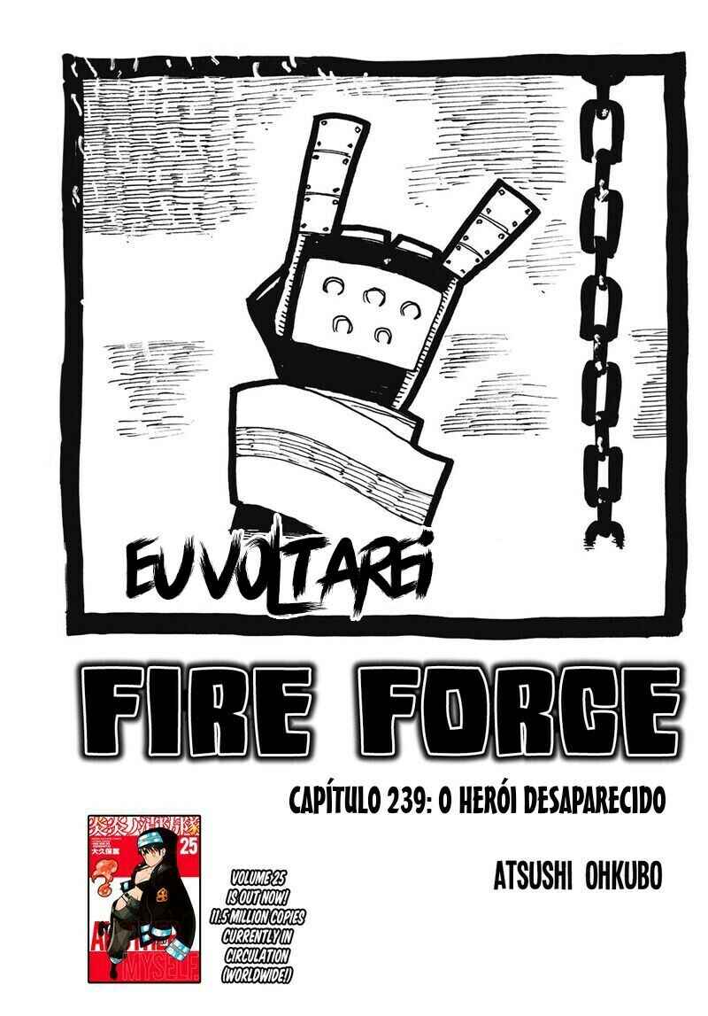Capítulo 0 - Shinra Kusakabe entra na EquipeCapítulo - Roubar? ou Homenagem?Capítulo 1 - EstréiaCapítulo 2 - O Demônio, O Cavaleiro, E a BruxaCapítulo 3 - O Coração de um BombeiroCapítulo 4 - O Suspeito BlasfemoCapítulo 5 - O Torneio dos Bombeiros NovatosCapítulo 6 - O Mal de Descobrir a VerdadeCapítulo 7 - O Demônio e o JokerCapítulo 8 - Procurando pela VerdadeCapítulo 9 - O que a 8ª PersegueCapítulo 10 - O Indivíduo de Fogo com ConsciênciaCapítulo 11 - O Herói e a PrincesaCapítulo 12 - A 5ª e a 8ª BrigadaCapítulo 13 - EsperaCapítulo 14 - A Determinação da Donzela SagradaCapítulo 15 - A Guerra ComeçaCapítulo 16 - A Derrota do CavaleiroCapítulo 17 - Shinra VS HibanaCapítulo 18 - ConfrontoCapítulo 19 - A Promessa de HibanaCapítulo 20 - O Lugar Onde Nascem as ChamasCapítulo 21 - Início da InvestigaçãoCapítulo 22 - Plano de Infiltração no Primeiro BatalhãoCapítulo 24 - Shinra vs. BurnsCapítulo 25 - Persiga o InimigoCapítulo 26 - Inseto das ChamasCapítulo 27 - Mal ImperdoávelCapítulo 28 - Shinra vs. RekkaCapítulo 29 - Punho ou Perna?Capítulo 30 - O Homem Que Está por TrásCapítulo 31 - O Mal que se Espalha Como ChamasCapítulo 32 - Um Novo InimigoCapítulo 33 - Heróis se Reúnem!Capítulo 34 - Jovem CavaleiroCapítulo 35 - PromessaCapítulo 36 - Formação da Oitava Brigada Especial de Incêndio - 1ª ParteCapítulo 37 - Formação da Oitava Brigada Especial de Incêndio - 2ª ParteCapítulo 38 - Onde os Que Vestem Branco EstãoCapítulo 39 - Extintor Mais PotenteCapítulo 40 - A Noite Antes da Guerra de AsakusaCapítulo 41 - A Aliança de Bombeiros do ÓdioCapítulo 42 - Oubi VS BenimaruCapítulo 43 - O Motivo da LutaCapítulo 44 - O Sétimo Batalhão NasceCapítulo 45 - A Armadilha PlanejadaCapítulo 46 - Persiga o Atirador!Capítulo 47 - Luta de Dois Contra DoisCapítulo 48 - O Orgulho de AsakusaCapítulo 49 - Festival de BrigasCapítulo 50 - Chama Para Quem?Capítulo 51 - TaçasCapítulo 52 - O Mundo das ChamasCapítulo 53 - O Deus da Forja!Capítulo 54 - Aqueles com Manobras SecretasCapítulo 55 - O Sonho do EngenheiroCapítulo 56 - Rei Cavaleiro CavalgandoCapítulo 57 - Dilema!!Capítulo 58 - Nós Somos FamiliaCapítulo 59 - Chegada!Capítulo 60 - Preto, Branco e CinzaCapítulo 61 - Espada SagradaCapítulo 62 - PromessaCapítulo 63 - AmigoCapítulo 64 - O Local do TreinamentoCapítulo 65 - O Ponto de IgniçãoCapítulo 66 - Os Resultados de Cada UmCapítulo 67 - Indo ao NetherCapítulo 68 - Perdidos no EscuroCapítulo 69 - Maki Vs FlailCapítulo 70 - O Que é ProtegerCapítulo 71 - Tamaki vs AssaultCapítulo 72 - Aonde a Bala VaiCapítulo 73 - Se OrgulhandoCapítulo 74 - Espada Longa RelâmpagoCapítulo 75 - Orgulho da Brigada de IncêndioCapítulo 76 - Desejo PerfuranteCapítulo 77 - Aquele Que Se ConectaCapítulo 78 - IrmãosCapítulo 79 - Além da Luta até a MorteCapítulo 80 - A Habilidade de ShouCapítulo 81 - A Força de Vontade do IrmãoCapítulo 82 - A Proteção Divina do ConversorCapítulo 83 - Quarta GeraçãoCapítulo 84 - SorrisoCapítulo 85 - Conspiração DeclaradaCapítulo 86 - RecuperaçãoCapítulo 87 - Doutora e ChamaCapítulo 88 - O Passado e o PresenteCapítulo 89 - Passado em ChamasCapítulo 90 - O Final da TragédiaCapítulo 91 - A Luta dos HomensCapítulo 92 - Replanejamento do Chefe da CompanhiaCapítulo 93 - Quarto BatalhãoCapítulo 94 - Souichirou ArgCapítulo 95 - Chamas da RaivaCapítulo 96 - Colegas ReunidosCapítulo 97 - O Motivo do Cavaleiro ReiCapítulo 98 - Shinra vs. ArthurCapítulo 99 - Uma Nova LenhaCapítulo 100 - Aroma das ChamasCapítulo 101 - Tragédia em ChamasCapítulo 102 - Punho SelvagemCapítulo 103 - Tateando nas ChamasCapítulo 104 - Laços do IncêndioCapítulo 105 - ConclusãoCapítulo 106 - Segunda GeraçãoCapítulo 107 - Selo de ChifresCapítulo 108 - O Plano Secreto de LichtCapítulo 109 - Momento CriticoCapítulo 110 - A Hora da EscolhaCapítulo 111 - O Próximo PassoCapítulo 112 - Rumo ao DesconhecidoCapítulo 113 - O Mundo de ForaCapítulo 114 - O Caminho Para o OásisCapítulo 115 - OásisCapítulo 116 - Terra SagradaCapítulo 117 - O Mal Escondido nas ChamasCapítulo 118 - O LíderCapítulo 119 - O Mistério do DeusCapítulo 120 - NúcleoCapítulo 121 - 1 Segundo - 250 AnosCapítulo 122 - Mulher ObscuraCapítulo 123 - Uma Sombra ApareceCapítulo 124 - Herói SombrioCapítulo 125 - A Luz Que Nasce das TrevasCapítulo 126 - Na Sombra do SolCapítulo 127 - Ignição FrontalCapítulo 128 - Grupal e IndividualCapítulo 129 - Caolhos se EnfrentamCapítulo 130 - A Verdade OcultaCapítulo 131 - PesquisadorCapítulo 132 - Confiança e VerdadeCapítulo 133 - O Forte e o MalignoCapítulo 134 - A verdade da MaqueteCapítulo 135 - Shinigami das CinzasCapítulo 136 - Luta em Território InimigoCapítulo 137 - Anjo VS BruxaCapítulo 138 - Coração que confiaCapítulo 139 - Batalha Entre os Três GrandesCapítulo 140 - Batalha de MulheresCapítulo 141Capítulo 142Capítulo 143Capítulo 144Capítulo 145Capítulo 146Capítulo 147Capítulo 148Capítulo 149Capítulo 150Capítulo 151Capítulo 152Capítulo 153Capítulo 154Capítulo 155Capítulo 156Capítulo 157Capítulo 158Capítulo 159Capítulo 160Capítulo 161Capítulo 162Capítulo 163Capítulo 164Capítulo 165Capítulo 166Capítulo 167Capítulo 168Capítulo 169Capítulo 170Capítulo 171Capítulo 172Capítulo 173Capítulo 174Capítulo 175Capítulo 176Capítulo 177Capítulo 178Capítulo 179Capítulo 180Capítulo 181Capítulo 182Capítulo 183Capítulo 184Capítulo 185Capítulo 186Capítulo 187Capítulo 188Capítulo 189Capítulo 190Capítulo 191Capítulo 192Capítulo 193Capítulo 194Capítulo 195Capítulo 196Capítulo 197Capítulo 198Capítulo 199Capítulo 200Capítulo 201Capítulo 202 - A Grande Aventura do Cavaleiro ReiCapítulo 203 - Uma DescobertaCapítulo 204 - A Família do Cavaleiro ReiCapítulo 205 - A lâmina Sagrada Renasce!Capítulo 206 - ConexãoCapítulo 207 - FugaCapítulo 208 - A Reunião FinalCapítulo 209 - Feudo SecretoCapí
