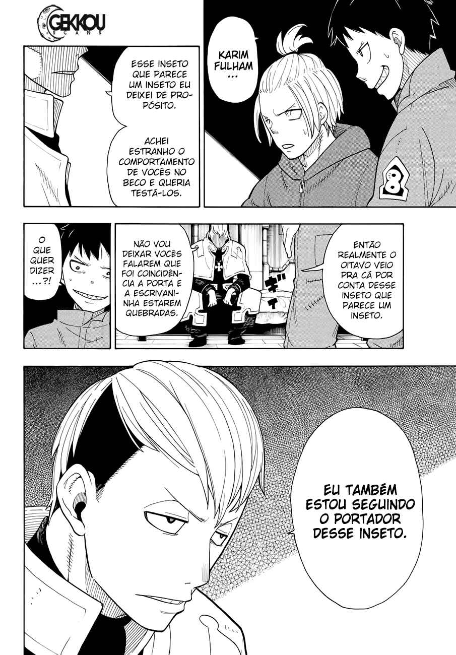 Capítulo 0 - Shinra Kusakabe entra na EquipeCapítulo - Roubar? ou Homenagem?Capítulo 1 - EstréiaCapítulo 2 - O Demônio, O Cavaleiro, E a BruxaCapítulo 3 - O Coração de um BombeiroCapítulo 4 - O Suspeito BlasfemoCapítulo 5 - O Torneio dos Bombeiros NovatosCapítulo 6 - O Mal de Descobrir a VerdadeCapítulo 7 - O Demônio e o JokerCapítulo 8 - Procurando pela VerdadeCapítulo 9 - O que a 8ª PersegueCapítulo 10 - O Indivíduo de Fogo com ConsciênciaCapítulo 11 - O Herói e a PrincesaCapítulo 12 - A 5ª e a 8ª BrigadaCapítulo 13 - EsperaCapítulo 14 - A Determinação da Donzela SagradaCapítulo 15 - A Guerra ComeçaCapítulo 16 - A Derrota do CavaleiroCapítulo 17 - Shinra VS HibanaCapítulo 18 - ConfrontoCapítulo 19 - A Promessa de HibanaCapítulo 20 - O Lugar Onde Nascem as ChamasCapítulo 21 - Início da InvestigaçãoCapítulo 22 - Plano de Infiltração no Primeiro BatalhãoCapítulo 24 - Shinra vs. BurnsCapítulo 25 - Persiga o InimigoCapítulo 26 - Inseto das ChamasCapítulo 27 - Mal ImperdoávelCapítulo 28 - Shinra vs. RekkaCapítulo 29 - Punho ou Perna?Capítulo 30 - O Homem Que Está por TrásCapítulo 31 - O Mal que se Espalha Como ChamasCapítulo 32 - Um Novo InimigoCapítulo 33 - Heróis se Reúnem!Capítulo 34 - Jovem CavaleiroCapítulo 35 - PromessaCapítulo 36 - Formação da Oitava Brigada Especial de Incêndio - 1ª ParteCapítulo 37 - Formação da Oitava Brigada Especial de Incêndio - 2ª ParteCapítulo 38 - Onde os Que Vestem Branco EstãoCapítulo 39 - Extintor Mais PotenteCapítulo 40 - A Noite Antes da Guerra de AsakusaCapítulo 41 - A Aliança de Bombeiros do ÓdioCapítulo 42 - Oubi VS BenimaruCapítulo 43 - O Motivo da LutaCapítulo 44 - O Sétimo Batalhão NasceCapítulo 45 - A Armadilha PlanejadaCapítulo 46 - Persiga o Atirador!Capítulo 47 - Luta de Dois Contra DoisCapítulo 48 - O Orgulho de AsakusaCapítulo 49 - Festival de BrigasCapítulo 50 - Chama Para Quem?Capítulo 51 - TaçasCapítulo 52 - O Mundo das ChamasCapítulo 53 - O Deus da Forja!Capítulo 54 - Aqueles com Manobras SecretasCapítulo 55 - O Sonho do EngenheiroCapítulo 56 - Rei Cavaleiro CavalgandoCapítulo 57 - Dilema!!Capítulo 58 - Nós Somos FamiliaCapítulo 59 - Chegada!Capítulo 60 - Preto, Branco e CinzaCapítulo 61 - Espada SagradaCapítulo 62 - PromessaCapítulo 63 - AmigoCapítulo 64 - O Local do TreinamentoCapítulo 65 - O Ponto de IgniçãoCapítulo 66 - Os Resultados de Cada UmCapítulo 67 - Indo ao NetherCapítulo 68 - Perdidos no EscuroCapítulo 69 - Maki Vs FlailCapítulo 70 - O Que é ProtegerCapítulo 71 - Tamaki vs AssaultCapítulo 72 - Aonde a Bala VaiCapítulo 73 - Se OrgulhandoCapítulo 74 - Espada Longa RelâmpagoCapítulo 75 - Orgulho da Brigada de IncêndioCapítulo 76 - Desejo PerfuranteCapítulo 77 - Aquele Que Se ConectaCapítulo 78 - IrmãosCapítulo 79 - Além da Luta até a MorteCapítulo 80 - A Habilidade de ShouCapítulo 81 - A Força de Vontade do IrmãoCapítulo 82 - A Proteção Divina do ConversorCapítulo 83 - Quarta GeraçãoCapítulo 84 - SorrisoCapítulo 85 - Conspiração DeclaradaCapítulo 86 - RecuperaçãoCapítulo 87 - Doutora e ChamaCapítulo 88 - O Passado e o PresenteCapítulo 89 - Passado em ChamasCapítulo 90 - O Final da TragédiaCapítulo 91 - A Luta dos HomensCapítulo 92 - Replanejamento do Chefe da CompanhiaCapítulo 93 - Quarto BatalhãoCapítulo 94 - Souichirou ArgCapítulo 95 - Chamas da RaivaCapítulo 96 - Colegas ReunidosCapítulo 97 - O Motivo do Cavaleiro ReiCapítulo 98 - Shinra vs. ArthurCapítulo 99 - Uma Nova LenhaCapítulo 100 - Aroma das ChamasCapítulo 101 - Tragédia em ChamasCapítulo 102 - Punho SelvagemCapítulo 103 - Tateando nas ChamasCapítulo 104 - Laços do IncêndioCapítulo 105 - ConclusãoCapítulo 106 - Segunda GeraçãoCapítulo 107 - Selo de ChifresCapítulo 108 - O Plano Secreto de LichtCapítulo 109 - Momento CriticoCapítulo 110 - A Hora da EscolhaCapítulo 111 - O Próximo PassoCapítulo 112 - Rumo ao DesconhecidoCapítulo 113 - O Mundo de ForaCapítulo 114 - O Caminho Para o OásisCapítulo 115 - OásisCapítulo 116 - Terra SagradaCapítulo 117 - O Mal Escondido nas ChamasCapítulo 118 - O LíderCapítulo 119 - O Mistério do DeusCapítulo 120 - NúcleoCapítulo 121 - 1 Segundo - 250 AnosCapítulo 122 - Mulher ObscuraCapítulo 123 - Uma Sombra ApareceCapítulo 124 - Herói SombrioCapítulo 125 - A Luz Que Nasce das TrevasCapítulo 126 - Na Sombra do SolCapítulo 127 - Ignição FrontalCapítulo 128 - Grupal e IndividualCapítulo 129 - Caolhos se EnfrentamCapítulo 130 - A Verdade OcultaCapítulo 131 - PesquisadorCapítulo 132 - Confiança e VerdadeCapítulo 133 - O Forte e o MalignoCapítulo 134 - A verdade da MaqueteCapítulo 135 - Shinigami das CinzasCapítulo 136 - Luta em Território InimigoCapítulo 137 - Anjo VS BruxaCapítulo 138 - Coração que confiaCapítulo 139 - Batalha Entre os Três GrandesCapítulo 140 - Batalha de MulheresCapítulo 141Capítulo 142Capítulo 143Capítulo 144Capítulo 145Capítulo 146Capítulo 147Capítulo 148Capítulo 149Capítulo 150Capítulo 151Capítulo 152Capítulo 153Capítulo 154Capítulo 155Capítulo 156Capítulo 157Capítulo 158Capítulo 159Capítulo 160Capítulo 161Capítulo 162Capítulo 163Capítulo 164Capítulo 165Capítulo 166Capítulo 167Capítulo 168Capítulo 169Capítulo 170Capítulo 171Capítulo 172Capítulo 173Capítulo 174Capítulo 175Capítulo 176Capítulo 177Capítulo 178Capítulo 179Capítulo 180Capítulo 181Capítulo 182Capítulo 183Capítulo 184Capítulo 185Capítulo 186Capítulo 187Capítulo 188Capítulo 189Capítulo 190Capítulo 191Capítulo 192Capítulo 193Capítulo 194Capítulo 195Capítulo 196Capítulo 197Capítulo 198Capítulo 199Capítulo 200Capítulo 201Capítulo 202 - A Grande Aventura do Cavaleiro ReiCapítulo 203 - Uma DescobertaCapítulo 204 - A Família do Cavaleiro ReiCapítulo 205 - A lâmina Sagrada Renasce!Capítulo 206 - ConexãoCapítulo 207 - FugaCapítulo 208 - A Reunião FinalCapítulo 209 - Feudo SecretoCapí