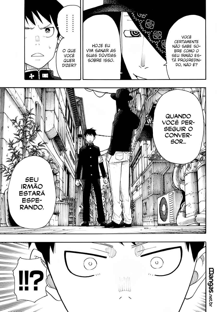Capítulo 0 - Shinra Kusakabe entra na EquipeCapítulo - Roubar? ou Homenagem?Capítulo 1 - EstréiaCapítulo 2 - O Demônio, O Cavaleiro, E a BruxaCapítulo 3 - O Coração de um BombeiroCapítulo 4 - O Suspeito BlasfemoCapítulo 5 - O Torneio dos Bombeiros NovatosCapítulo 6 - O Mal de Descobrir a VerdadeCapítulo 7 - O Demônio e o JokerCapítulo 8 - Procurando pela VerdadeCapítulo 9 - O que a 8ª PersegueCapítulo 10 - O Indivíduo de Fogo com ConsciênciaCapítulo 11 - O Herói e a PrincesaCapítulo 12 - A 5ª e a 8ª BrigadaCapítulo 13 - EsperaCapítulo 14 - A Determinação da Donzela SagradaCapítulo 15 - A Guerra ComeçaCapítulo 16 - A Derrota do CavaleiroCapítulo 17 - Shinra VS HibanaCapítulo 18 - ConfrontoCapítulo 19 - A Promessa de HibanaCapítulo 20 - O Lugar Onde Nascem as ChamasCapítulo 21 - Início da InvestigaçãoCapítulo 22 - Plano de Infiltração no Primeiro BatalhãoCapítulo 24 - Shinra vs. BurnsCapítulo 25 - Persiga o InimigoCapítulo 26 - Inseto das ChamasCapítulo 27 - Mal ImperdoávelCapítulo 28 - Shinra vs. RekkaCapítulo 29 - Punho ou Perna?Capítulo 30 - O Homem Que Está por TrásCapítulo 31 - O Mal que se Espalha Como ChamasCapítulo 32 - Um Novo InimigoCapítulo 33 - Heróis se Reúnem!Capítulo 34 - Jovem CavaleiroCapítulo 35 - PromessaCapítulo 36 - Formação da Oitava Brigada Especial de Incêndio - 1ª ParteCapítulo 37 - Formação da Oitava Brigada Especial de Incêndio - 2ª ParteCapítulo 38 - Onde os Que Vestem Branco EstãoCapítulo 39 - Extintor Mais PotenteCapítulo 40 - A Noite Antes da Guerra de AsakusaCapítulo 41 - A Aliança de Bombeiros do ÓdioCapítulo 42 - Oubi VS BenimaruCapítulo 43 - O Motivo da LutaCapítulo 44 - O Sétimo Batalhão NasceCapítulo 45 - A Armadilha PlanejadaCapítulo 46 - Persiga o Atirador!Capítulo 47 - Luta de Dois Contra DoisCapítulo 48 - O Orgulho de AsakusaCapítulo 49 - Festival de BrigasCapítulo 50 - Chama Para Quem?Capítulo 51 - TaçasCapítulo 52 - O Mundo das ChamasCapítulo 53 - O Deus da Forja!Capítulo 54 - Aqueles com Manobras SecretasCapítulo 55 - O Sonho do EngenheiroCapítulo 56 - Rei Cavaleiro CavalgandoCapítulo 57 - Dilema!!Capítulo 58 - Nós Somos FamiliaCapítulo 59 - Chegada!Capítulo 60 - Preto, Branco e CinzaCapítulo 61 - Espada SagradaCapítulo 62 - PromessaCapítulo 63 - AmigoCapítulo 64 - O Local do TreinamentoCapítulo 65 - O Ponto de IgniçãoCapítulo 66 - Os Resultados de Cada UmCapítulo 67 - Indo ao NetherCapítulo 68 - Perdidos no EscuroCapítulo 69 - Maki Vs FlailCapítulo 70 - O Que é ProtegerCapítulo 71 - Tamaki vs AssaultCapítulo 72 - Aonde a Bala VaiCapítulo 73 - Se OrgulhandoCapítulo 74 - Espada Longa RelâmpagoCapítulo 75 - Orgulho da Brigada de IncêndioCapítulo 76 - Desejo PerfuranteCapítulo 77 - Aquele Que Se ConectaCapítulo 78 - IrmãosCapítulo 79 - Além da Luta até a MorteCapítulo 80 - A Habilidade de ShouCapítulo 81 - A Força de Vontade do IrmãoCapítulo 82 - A Proteção Divina do ConversorCapítulo 83 - Quarta GeraçãoCapítulo 84 - SorrisoCapítulo 85 - Conspiração DeclaradaCapítulo 86 - RecuperaçãoCapítulo 87 - Doutora e ChamaCapítulo 88 - O Passado e o PresenteCapítulo 89 - Passado em ChamasCapítulo 90 - O Final da TragédiaCapítulo 91 - A Luta dos HomensCapítulo 92 - Replanejamento do Chefe da CompanhiaCapítulo 93 - Quarto BatalhãoCapítulo 94 - Souichirou ArgCapítulo 95 - Chamas da RaivaCapítulo 96 - Colegas ReunidosCapítulo 97 - O Motivo do Cavaleiro ReiCapítulo 98 - Shinra vs. ArthurCapítulo 99 - Uma Nova LenhaCapítulo 100 - Aroma das ChamasCapítulo 101 - Tragédia em ChamasCapítulo 102 - Punho SelvagemCapítulo 103 - Tateando nas ChamasCapítulo 104 - Laços do IncêndioCapítulo 105 - ConclusãoCapítulo 106 - Segunda GeraçãoCapítulo 107 - Selo de ChifresCapítulo 108 - O Plano Secreto de LichtCapítulo 109 - Momento CriticoCapítulo 110 - A Hora da EscolhaCapítulo 111 - O Próximo PassoCapítulo 112 - Rumo ao DesconhecidoCapítulo 113 - O Mundo de ForaCapítulo 114 - O Caminho Para o OásisCapítulo 115 - OásisCapítulo 116 - Terra SagradaCapítulo 117 - O Mal Escondido nas ChamasCapítulo 118 - O LíderCapítulo 119 - O Mistério do DeusCapítulo 120 - NúcleoCapítulo 121 - 1 Segundo - 250 AnosCapítulo 122 - Mulher ObscuraCapítulo 123 - Uma Sombra ApareceCapítulo 124 - Herói SombrioCapítulo 125 - A Luz Que Nasce das TrevasCapítulo 126 - Na Sombra do SolCapítulo 127 - Ignição FrontalCapítulo 128 - Grupal e IndividualCapítulo 129 - Caolhos se EnfrentamCapítulo 130 - A Verdade OcultaCapítulo 131 - PesquisadorCapítulo 132 - Confiança e VerdadeCapítulo 133 - O Forte e o MalignoCapítulo 134 - A verdade da MaqueteCapítulo 135 - Shinigami das CinzasCapítulo 136 - Luta em Território InimigoCapítulo 137 - Anjo VS BruxaCapítulo 138 - Coração que confiaCapítulo 139 - Batalha Entre os Três GrandesCapítulo 140 - Batalha de MulheresCapítulo 141Capítulo 142Capítulo 143Capítulo 144Capítulo 145Capítulo 146Capítulo 147Capítulo 148Capítulo 149Capítulo 150Capítulo 151Capítulo 152Capítulo 153Capítulo 154Capítulo 155Capítulo 156Capítulo 157Capítulo 158Capítulo 159Capítulo 160Capítulo 161Capítulo 162Capítulo 163Capítulo 164Capítulo 165Capítulo 166Capítulo 167Capítulo 168Capítulo 169Capítulo 170Capítulo 171Capítulo 172Capítulo 173Capítulo 174Capítulo 175Capítulo 176Capítulo 177Capítulo 178Capítulo 179Capítulo 180Capítulo 181Capítulo 182Capítulo 183Capítulo 184Capítulo 185Capítulo 186Capítulo 187Capítulo 188Capítulo 189Capítulo 190Capítulo 191Capítulo 192Capítulo 193Capítulo 194Capítulo 195Capítulo 196Capítulo 197Capítulo 198Capítulo 199Capítulo 200Capítulo 201Capítulo 202 - A Grande Aventura do Cavaleiro ReiCapítulo 203 - Uma DescobertaCapítulo 204 - A Família do Cavaleiro ReiCapítulo 205 - A lâmina Sagrada Renasce!Capítulo 206 - ConexãoCapítulo 207 - FugaCapítulo 208 - A Reunião FinalCapítulo 209 - Feudo SecretoCapí