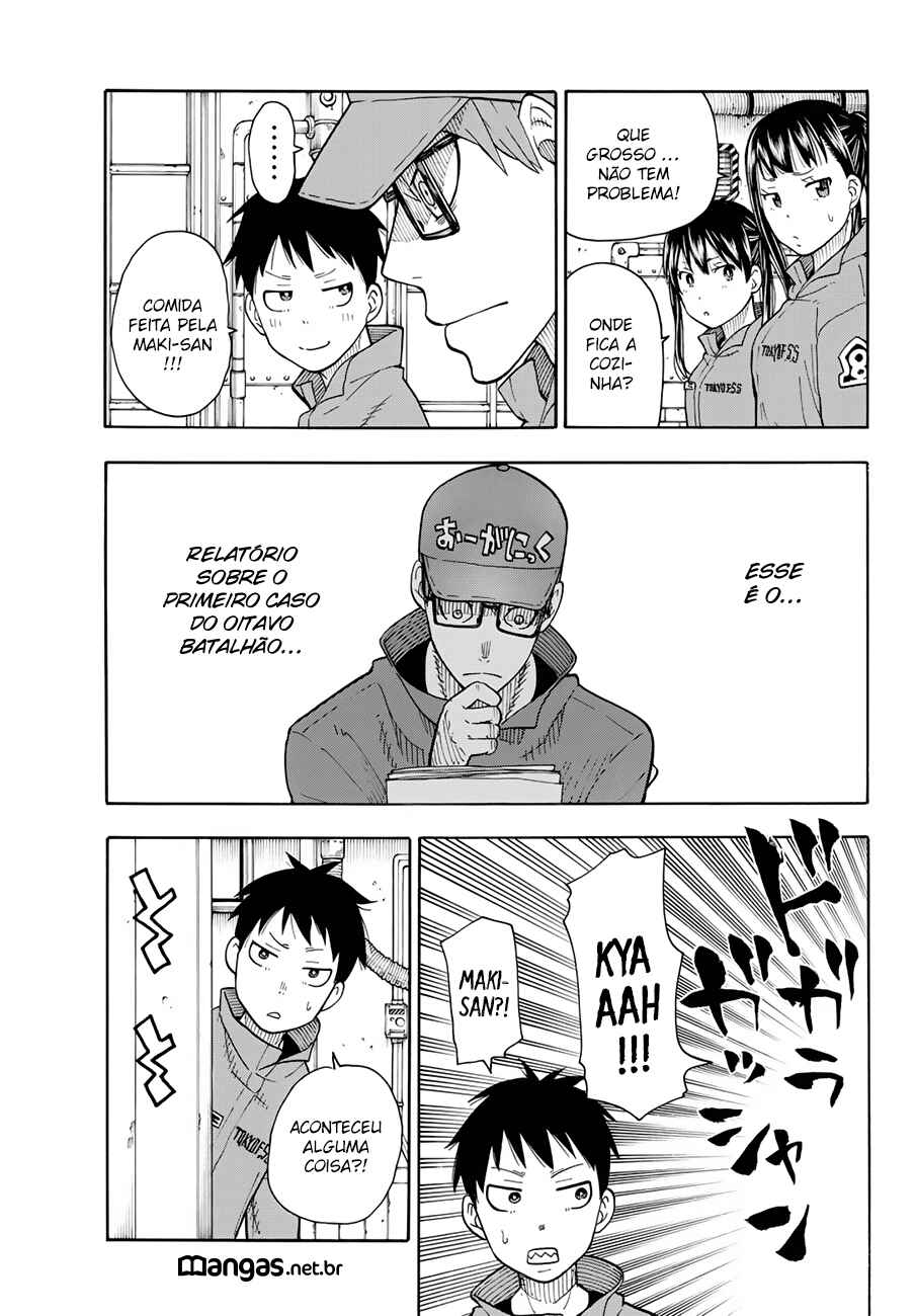 Capítulo 0 - Shinra Kusakabe entra na EquipeCapítulo - Roubar? ou Homenagem?Capítulo 1 - EstréiaCapítulo 2 - O Demônio, O Cavaleiro, E a BruxaCapítulo 3 - O Coração de um BombeiroCapítulo 4 - O Suspeito BlasfemoCapítulo 5 - O Torneio dos Bombeiros NovatosCapítulo 6 - O Mal de Descobrir a VerdadeCapítulo 7 - O Demônio e o JokerCapítulo 8 - Procurando pela VerdadeCapítulo 9 - O que a 8ª PersegueCapítulo 10 - O Indivíduo de Fogo com ConsciênciaCapítulo 11 - O Herói e a PrincesaCapítulo 12 - A 5ª e a 8ª BrigadaCapítulo 13 - EsperaCapítulo 14 - A Determinação da Donzela SagradaCapítulo 15 - A Guerra ComeçaCapítulo 16 - A Derrota do CavaleiroCapítulo 17 - Shinra VS HibanaCapítulo 18 - ConfrontoCapítulo 19 - A Promessa de HibanaCapítulo 20 - O Lugar Onde Nascem as ChamasCapítulo 21 - Início da InvestigaçãoCapítulo 22 - Plano de Infiltração no Primeiro BatalhãoCapítulo 24 - Shinra vs. BurnsCapítulo 25 - Persiga o InimigoCapítulo 26 - Inseto das ChamasCapítulo 27 - Mal ImperdoávelCapítulo 28 - Shinra vs. RekkaCapítulo 29 - Punho ou Perna?Capítulo 30 - O Homem Que Está por TrásCapítulo 31 - O Mal que se Espalha Como ChamasCapítulo 32 - Um Novo InimigoCapítulo 33 - Heróis se Reúnem!Capítulo 34 - Jovem CavaleiroCapítulo 35 - PromessaCapítulo 36 - Formação da Oitava Brigada Especial de Incêndio - 1ª ParteCapítulo 37 - Formação da Oitava Brigada Especial de Incêndio - 2ª ParteCapítulo 38 - Onde os Que Vestem Branco EstãoCapítulo 39 - Extintor Mais PotenteCapítulo 40 - A Noite Antes da Guerra de AsakusaCapítulo 41 - A Aliança de Bombeiros do ÓdioCapítulo 42 - Oubi VS BenimaruCapítulo 43 - O Motivo da LutaCapítulo 44 - O Sétimo Batalhão NasceCapítulo 45 - A Armadilha PlanejadaCapítulo 46 - Persiga o Atirador!Capítulo 47 - Luta de Dois Contra DoisCapítulo 48 - O Orgulho de AsakusaCapítulo 49 - Festival de BrigasCapítulo 50 - Chama Para Quem?Capítulo 51 - TaçasCapítulo 52 - O Mundo das ChamasCapítulo 53 - O Deus da Forja!Capítulo 54 - Aqueles com Manobras SecretasCapítulo 55 - O Sonho do EngenheiroCapítulo 56 - Rei Cavaleiro CavalgandoCapítulo 57 - Dilema!!Capítulo 58 - Nós Somos FamiliaCapítulo 59 - Chegada!Capítulo 60 - Preto, Branco e CinzaCapítulo 61 - Espada SagradaCapítulo 62 - PromessaCapítulo 63 - AmigoCapítulo 64 - O Local do TreinamentoCapítulo 65 - O Ponto de IgniçãoCapítulo 66 - Os Resultados de Cada UmCapítulo 67 - Indo ao NetherCapítulo 68 - Perdidos no EscuroCapítulo 69 - Maki Vs FlailCapítulo 70 - O Que é ProtegerCapítulo 71 - Tamaki vs AssaultCapítulo 72 - Aonde a Bala VaiCapítulo 73 - Se OrgulhandoCapítulo 74 - Espada Longa RelâmpagoCapítulo 75 - Orgulho da Brigada de IncêndioCapítulo 76 - Desejo PerfuranteCapítulo 77 - Aquele Que Se ConectaCapítulo 78 - IrmãosCapítulo 79 - Além da Luta até a MorteCapítulo 80 - A Habilidade de ShouCapítulo 81 - A Força de Vontade do IrmãoCapítulo 82 - A Proteção Divina do ConversorCapítulo 83 - Quarta GeraçãoCapítulo 84 - SorrisoCapítulo 85 - Conspiração DeclaradaCapítulo 86 - RecuperaçãoCapítulo 87 - Doutora e ChamaCapítulo 88 - O Passado e o PresenteCapítulo 89 - Passado em ChamasCapítulo 90 - O Final da TragédiaCapítulo 91 - A Luta dos HomensCapítulo 92 - Replanejamento do Chefe da CompanhiaCapítulo 93 - Quarto BatalhãoCapítulo 94 - Souichirou ArgCapítulo 95 - Chamas da RaivaCapítulo 96 - Colegas ReunidosCapítulo 97 - O Motivo do Cavaleiro ReiCapítulo 98 - Shinra vs. ArthurCapítulo 99 - Uma Nova LenhaCapítulo 100 - Aroma das ChamasCapítulo 101 - Tragédia em ChamasCapítulo 102 - Punho SelvagemCapítulo 103 - Tateando nas ChamasCapítulo 104 - Laços do IncêndioCapítulo 105 - ConclusãoCapítulo 106 - Segunda GeraçãoCapítulo 107 - Selo de ChifresCapítulo 108 - O Plano Secreto de LichtCapítulo 109 - Momento CriticoCapítulo 110 - A Hora da EscolhaCapítulo 111 - O Próximo PassoCapítulo 112 - Rumo ao DesconhecidoCapítulo 113 - O Mundo de ForaCapítulo 114 - O Caminho Para o OásisCapítulo 115 - OásisCapítulo 116 - Terra SagradaCapítulo 117 - O Mal Escondido nas ChamasCapítulo 118 - O LíderCapítulo 119 - O Mistério do DeusCapítulo 120 - NúcleoCapítulo 121 - 1 Segundo - 250 AnosCapítulo 122 - Mulher ObscuraCapítulo 123 - Uma Sombra ApareceCapítulo 124 - Herói SombrioCapítulo 125 - A Luz Que Nasce das TrevasCapítulo 126 - Na Sombra do SolCapítulo 127 - Ignição FrontalCapítulo 128 - Grupal e IndividualCapítulo 129 - Caolhos se EnfrentamCapítulo 130 - A Verdade OcultaCapítulo 131 - PesquisadorCapítulo 132 - Confiança e VerdadeCapítulo 133 - O Forte e o MalignoCapítulo 134 - A verdade da MaqueteCapítulo 135 - Shinigami das CinzasCapítulo 136 - Luta em Território InimigoCapítulo 137 - Anjo VS BruxaCapítulo 138 - Coração que confiaCapítulo 139 - Batalha Entre os Três GrandesCapítulo 140 - Batalha de MulheresCapítulo 141Capítulo 142Capítulo 143Capítulo 144Capítulo 145Capítulo 146Capítulo 147Capítulo 148Capítulo 149Capítulo 150Capítulo 151Capítulo 152Capítulo 153Capítulo 154Capítulo 155Capítulo 156Capítulo 157Capítulo 158Capítulo 159Capítulo 160Capítulo 161Capítulo 162Capítulo 163Capítulo 164Capítulo 165Capítulo 166Capítulo 167Capítulo 168Capítulo 169Capítulo 170Capítulo 171Capítulo 172Capítulo 173Capítulo 174Capítulo 175Capítulo 176Capítulo 177Capítulo 178Capítulo 179Capítulo 180Capítulo 181Capítulo 182Capítulo 183Capítulo 184Capítulo 185Capítulo 186Capítulo 187Capítulo 188Capítulo 189Capítulo 190Capítulo 191Capítulo 192Capítulo 193Capítulo 194Capítulo 195Capítulo 196Capítulo 197Capítulo 198Capítulo 199Capítulo 200Capítulo 201Capítulo 202 - A Grande Aventura do Cavaleiro ReiCapítulo 203 - Uma DescobertaCapítulo 204 - A Família do Cavaleiro ReiCapítulo 205 - A lâmina Sagrada Renasce!Capítulo 206 - ConexãoCapítulo 207 - FugaCapítulo 208 - A Reunião FinalCapítulo 209 - Feudo SecretoCapí