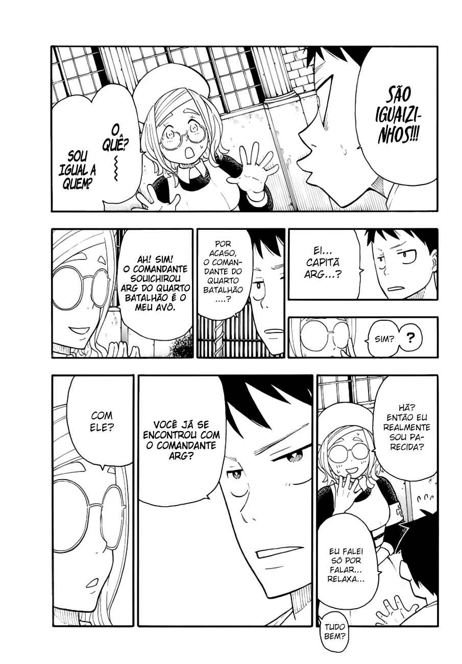 Capítulo 0 - Shinra Kusakabe entra na EquipeCapítulo - Roubar? ou Homenagem?Capítulo 1 - EstréiaCapítulo 2 - O Demônio, O Cavaleiro, E a BruxaCapítulo 3 - O Coração de um BombeiroCapítulo 4 - O Suspeito BlasfemoCapítulo 5 - O Torneio dos Bombeiros NovatosCapítulo 6 - O Mal de Descobrir a VerdadeCapítulo 7 - O Demônio e o JokerCapítulo 8 - Procurando pela VerdadeCapítulo 9 - O que a 8ª PersegueCapítulo 10 - O Indivíduo de Fogo com ConsciênciaCapítulo 11 - O Herói e a PrincesaCapítulo 12 - A 5ª e a 8ª BrigadaCapítulo 13 - EsperaCapítulo 14 - A Determinação da Donzela SagradaCapítulo 15 - A Guerra ComeçaCapítulo 16 - A Derrota do CavaleiroCapítulo 17 - Shinra VS HibanaCapítulo 18 - ConfrontoCapítulo 19 - A Promessa de HibanaCapítulo 20 - O Lugar Onde Nascem as ChamasCapítulo 21 - Início da InvestigaçãoCapítulo 22 - Plano de Infiltração no Primeiro BatalhãoCapítulo 24 - Shinra vs. BurnsCapítulo 25 - Persiga o InimigoCapítulo 26 - Inseto das ChamasCapítulo 27 - Mal ImperdoávelCapítulo 28 - Shinra vs. RekkaCapítulo 29 - Punho ou Perna?Capítulo 30 - O Homem Que Está por TrásCapítulo 31 - O Mal que se Espalha Como ChamasCapítulo 32 - Um Novo InimigoCapítulo 33 - Heróis se Reúnem!Capítulo 34 - Jovem CavaleiroCapítulo 35 - PromessaCapítulo 36 - Formação da Oitava Brigada Especial de Incêndio - 1ª ParteCapítulo 37 - Formação da Oitava Brigada Especial de Incêndio - 2ª ParteCapítulo 38 - Onde os Que Vestem Branco EstãoCapítulo 39 - Extintor Mais PotenteCapítulo 40 - A Noite Antes da Guerra de AsakusaCapítulo 41 - A Aliança de Bombeiros do ÓdioCapítulo 42 - Oubi VS BenimaruCapítulo 43 - O Motivo da LutaCapítulo 44 - O Sétimo Batalhão NasceCapítulo 45 - A Armadilha PlanejadaCapítulo 46 - Persiga o Atirador!Capítulo 47 - Luta de Dois Contra DoisCapítulo 48 - O Orgulho de AsakusaCapítulo 49 - Festival de BrigasCapítulo 50 - Chama Para Quem?Capítulo 51 - TaçasCapítulo 52 - O Mundo das ChamasCapítulo 53 - O Deus da Forja!Capítulo 54 - Aqueles com Manobras SecretasCapítulo 55 - O Sonho do EngenheiroCapítulo 56 - Rei Cavaleiro CavalgandoCapítulo 57 - Dilema!!Capítulo 58 - Nós Somos FamiliaCapítulo 59 - Chegada!Capítulo 60 - Preto, Branco e CinzaCapítulo 61 - Espada SagradaCapítulo 62 - PromessaCapítulo 63 - AmigoCapítulo 64 - O Local do TreinamentoCapítulo 65 - O Ponto de IgniçãoCapítulo 66 - Os Resultados de Cada UmCapítulo 67 - Indo ao NetherCapítulo 68 - Perdidos no EscuroCapítulo 69 - Maki Vs FlailCapítulo 70 - O Que é ProtegerCapítulo 71 - Tamaki vs AssaultCapítulo 72 - Aonde a Bala VaiCapítulo 73 - Se OrgulhandoCapítulo 74 - Espada Longa RelâmpagoCapítulo 75 - Orgulho da Brigada de IncêndioCapítulo 76 - Desejo PerfuranteCapítulo 77 - Aquele Que Se ConectaCapítulo 78 - IrmãosCapítulo 79 - Além da Luta até a MorteCapítulo 80 - A Habilidade de ShouCapítulo 81 - A Força de Vontade do IrmãoCapítulo 82 - A Proteção Divina do ConversorCapítulo 83 - Quarta GeraçãoCapítulo 84 - SorrisoCapítulo 85 - Conspiração DeclaradaCapítulo 86 - RecuperaçãoCapítulo 87 - Doutora e ChamaCapítulo 88 - O Passado e o PresenteCapítulo 89 - Passado em ChamasCapítulo 90 - O Final da TragédiaCapítulo 91 - A Luta dos HomensCapítulo 92 - Replanejamento do Chefe da CompanhiaCapítulo 93 - Quarto BatalhãoCapítulo 94 - Souichirou ArgCapítulo 95 - Chamas da RaivaCapítulo 96 - Colegas ReunidosCapítulo 97 - O Motivo do Cavaleiro ReiCapítulo 98 - Shinra vs. ArthurCapítulo 99 - Uma Nova LenhaCapítulo 100 - Aroma das ChamasCapítulo 101 - Tragédia em ChamasCapítulo 102 - Punho SelvagemCapítulo 103 - Tateando nas ChamasCapítulo 104 - Laços do IncêndioCapítulo 105 - ConclusãoCapítulo 106 - Segunda GeraçãoCapítulo 107 - Selo de ChifresCapítulo 108 - O Plano Secreto de LichtCapítulo 109 - Momento CriticoCapítulo 110 - A Hora da EscolhaCapítulo 111 - O Próximo PassoCapítulo 112 - Rumo ao DesconhecidoCapítulo 113 - O Mundo de ForaCapítulo 114 - O Caminho Para o OásisCapítulo 115 - OásisCapítulo 116 - Terra SagradaCapítulo 117 - O Mal Escondido nas ChamasCapítulo 118 - O LíderCapítulo 119 - O Mistério do DeusCapítulo 120 - NúcleoCapítulo 121 - 1 Segundo - 250 AnosCapítulo 122 - Mulher ObscuraCapítulo 123 - Uma Sombra ApareceCapítulo 124 - Herói SombrioCapítulo 125 - A Luz Que Nasce das TrevasCapítulo 126 - Na Sombra do SolCapítulo 127 - Ignição FrontalCapítulo 128 - Grupal e IndividualCapítulo 129 - Caolhos se EnfrentamCapítulo 130 - A Verdade OcultaCapítulo 131 - PesquisadorCapítulo 132 - Confiança e VerdadeCapítulo 133 - O Forte e o MalignoCapítulo 134 - A verdade da MaqueteCapítulo 135 - Shinigami das CinzasCapítulo 136 - Luta em Território InimigoCapítulo 137 - Anjo VS BruxaCapítulo 138 - Coração que confiaCapítulo 139 - Batalha Entre os Três GrandesCapítulo 140 - Batalha de MulheresCapítulo 141Capítulo 142Capítulo 143Capítulo 144Capítulo 145Capítulo 146Capítulo 147Capítulo 148Capítulo 149Capítulo 150Capítulo 151Capítulo 152Capítulo 153Capítulo 154Capítulo 155Capítulo 156Capítulo 157Capítulo 158Capítulo 159Capítulo 160Capítulo 161Capítulo 162Capítulo 163Capítulo 164Capítulo 165Capítulo 166Capítulo 167Capítulo 168Capítulo 169Capítulo 170Capítulo 171Capítulo 172Capítulo 173Capítulo 174Capítulo 175Capítulo 176Capítulo 177Capítulo 178Capítulo 179Capítulo 180Capítulo 181Capítulo 182Capítulo 183Capítulo 184Capítulo 185Capítulo 186Capítulo 187Capítulo 188Capítulo 189Capítulo 190Capítulo 191Capítulo 192Capítulo 193Capítulo 194Capítulo 195Capítulo 196Capítulo 197Capítulo 198Capítulo 199Capítulo 200Capítulo 201Capítulo 202 - A Grande Aventura do Cavaleiro ReiCapítulo 203 - Uma DescobertaCapítulo 204 - A Família do Cavaleiro ReiCapítulo 205 - A lâmina Sagrada Renasce!Capítulo 206 - ConexãoCapítulo 207 - FugaCapítulo 208 - A Reunião FinalCapítulo 209 - Feudo SecretoCapí