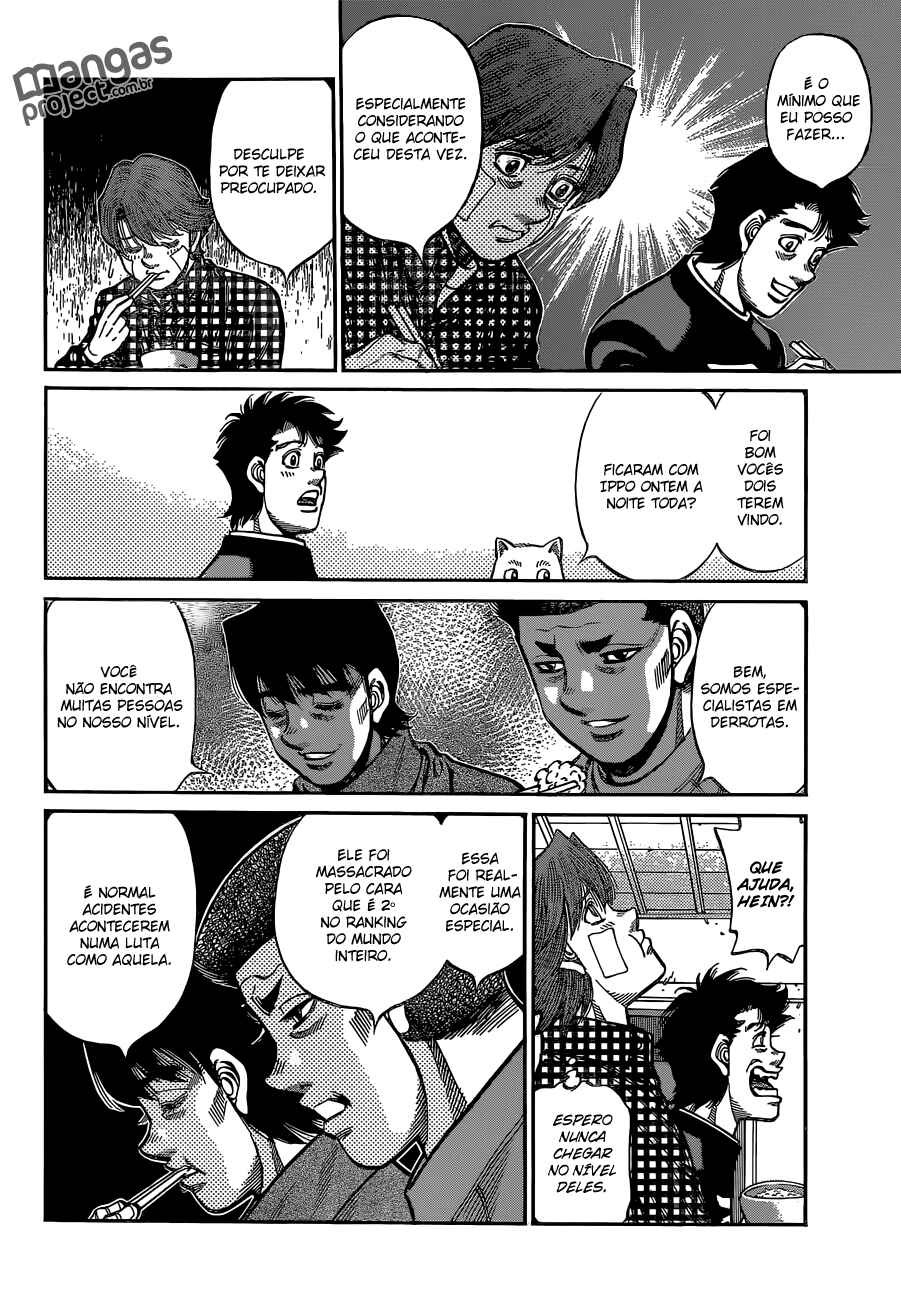 Capítulo 1 - O Primeiro PassoCapítulo 2 - Operação TartarugaCapítulo 3 - Pose de LutaCapítulo 4 - Lágrimas de FelicidadeCapítulo 5 - Uppercut de 1965Capítulo 6 - ShadowboxingCapítulo 7 - TécnicoCapítulo 8 - TreinamentoCapítulo 9 - Gongo da RevancheCapítulo 10 - Coragem do CoraçãoCapítulo 11 - Chance!!Capítulo 12 - Uma Arma InesperadaCapítulo 13 - Poder Destrutivo de 1cmCapítulo 14 - Cardápio do TakamuraCapítulo 15 - Encontro a TrêsCapítulo 16 - Licença de Classe CCapítulo 17 - Mau CaráterCapítulo 18 - Calções ArtesanaisCapítulo 19 - EstreiaCapítulo 20 - Deus!!Capítulo 21 - Parada Médica!?Capítulo 22 - De Repente, SouthpawCapítulo 23 - O Gosto da Primeira VitóriaCapítulo 24 - Peek-a-booCapítulo 25 - ObjetivoCapítulo 26 - AmigoCapítulo 27 - Nome de LutaCapítulo 28 - Pugilista NegroCapítulo 29 - Gancho AssassinoCapítulo 30 - Abertura do Torneio do Rei dos NovatosCapítulo 31 - Iniciativa para a VitóriaCapítulo 32 - Pare Ozuma!!Capítulo 33 - Está Doendo ou Não?Capítulo 34 - Contagem de 9Capítulo 35 - Aplausos para o DerrotadoCapítulo 36 - ShampooCapítulo 37 - AgitaçãoCapítulo 38 - Primeiro ProdígioCapítulo 39 - Ippo na PraiaCapítulo 40 - TreinamentoCapítulo 41 - O Segredo na Sola do PéCapítulo 42 - Pedido para as EstrelasCapítulo 43 - Memorando (Secreto) da VitóriaCapítulo 44 - Campeão FracoCapítulo 45 - ClinchCapítulo 46 - Círculo VazioCapítulo 47 - A Tática AbertaCapítulo 48 - Situação Facilmente PerigosaCapítulo 49 - O Sonho DefinidoCapítulo 50 - Luta pelo Título do Peso Médio do JapãoCapítulo 51 - O Retorno do DesafianteCapítulo 52 - Conferência Sobre o FuturoCapítulo 53 - Assassinato dos InfightersCapítulo 54 - A Força do ShotgunCapítulo 55 - PopularCapítulo 56 - A Face do GênioCapítulo 57 - ManbakenCapítulo 58 - Semifinal do Torneio Rei dos Novatos do Leste JaponêsCapítulo 59 - InesperadoCapítulo 60 - O Wind CarCapítulo 61 - Em Frente como um JavaliCapítulo 62 - A Luta nas CordasCapítulo 63 - Resultado Inesperado!?Capítulo 64 - A Derrota do ProdígioCapítulo 65 - O Primeiro Descanso em TemposCapítulo 66 - A Outra Semi-finalCapítulo 67 - HitmanCapítulo 68 - Ele Está EsperandoCapítulo 69 - Sapatos de BoxeCapítulo 70 - Pássaro Sem AsasCapítulo 71 - Lutando em Uma PernaCapítulo 72 - MensagemCapítulo 73 - Objetivo PerdidoCapítulo 74 - Protagonista do SofrimentoCapítulo 75 - O Irmãos do MashibaCapítulo 76 - Distância de 20cmCapítulo 77 - Punho RevitalizadoCapítulo 78 - Final do Torneio Rei dos Novatos do Leste JaponêsCapítulo 79 - Hitman VS Peek-a-booCapítulo 80 - Muito ForteCapítulo 81 - Murmúrio EstranhoCapítulo 82 - Punho QuebradoCapítulo 83 - Braço Esquerdo CaídoCapítulo 84 - Mashiba Se Levanta como um ReiCapítulo 85 - Energia NegraCapítulo 86 - O Retorno do HitmanCapítulo 87 - Ippo em GlóriaCapítulo 88 - Amante do IppoCapítulo 89 - Eu Adoro Grudar em Alguém!!Capítulo 90 - Sparring InútilCapítulo 91 - Recordação de TokyoCapítulo 92 - Super Doutor YCapítulo 93 - Treino DeliciosoCapítulo 94 - Estrela de OsakaCapítulo 95 - Um Inimigo InesperadoCapítulo 96 - Aumentando a Ansiedade....Capítulo 97 - InjeçãoCapítulo 98 - Grande Sentimento de TemorCapítulo 99 - Sendou PressionaCapítulo 100 - O Punho Direito RecuperadaCapítulo 101 - O Smash ModificadoCapítulo 102 - Foram Essas Palavras que Ele FalouCapítulo 103 - Aquilo que se PareceCapítulo 104 - Sendou no ChãoCapítulo 105 - Surra CompletaCapítulo 106 - Auxiliares, ForaCapítulo 107 - A Dicisão do Rei dos Novatos do JapãoCapítulo 108 - A Estranha CelebraçãoCapítulo 109 - FormaturaCapítulo 110 - Seguidores!?Capítulo 111 - Encontro Acidental com o CampeãoCapítulo 112 - As 9 Pessoas EntreCapítulo 113 - Quando o Punho se CuraCapítulo 114 - Empreste os OmbrosCapítulo 115 - Recupere Seu Estilo de LutaCapítulo 116 - O Soco MágicoCapítulo 117 - O Segredo Atrás da MágicaCapítulo 118 - O Mais Forte CovardeCapítulo 119 - InvejaCapítulo 120 - A Luta Entre Antigo e o Novo Rei dos NovatosCapítulo 121 - CorkscrewCapítulo 122 - O Estilo AdmiradoCapítulo 123 - Admiração do OkitaCapítulo 124 - Aqueles que Ultrapassam os OutrosCapítulo 125 - O Retorno de MiyataCapítulo 126 - Uma Contagem para Superá-losCapítulo 127 - O Homem que Nunca SorriCapítulo 128 - Chances de 1 em 30Capítulo 129 - JoltCapítulo 130 - TempestadeCapítulo 131 - Um Único SorrisoCapítulo 132 - Entrevista de um ÍdoloCapítulo 133 - Dê o Seu Melhor! Gero-MichiCapítulo 134 - O Torneio de Boxe Classe ACapítulo 135 - Eu Sinto MuitoCapítulo 136 - Abandonar ou Não!?Capítulo 137 - Soco de Boas VindasCapítulo 138 - Operação BMGCapítulo 139 - O Anúncio da LutaCapítulo 140 - O Punho Mais Forte VS o Homem Mais RápidoCapítulo 141 - O Homem da AceleraçãoCapítulo 142 - Sumindo com as Mãos e PésCapítulo 143 - Para Todos que Estavam PreocupadosCapítulo 144 - Zona de SegurançaCapítulo 145 - Um Dano Chamado MedoCapítulo 146 - A Declaração para Continuar de PéCapítulo 147 - White FangCapítulo 148 - Minha Canção FavoritaCapítulo 149 - O Tesouro de Gero-MichiCapítulo 150 - O Golpe das Lágrimas no FígadoCapítulo 151 - Grito de GuerraCapítulo 152 - A Luz e a Sombra no RingueCapítulo 153 - As Dúvidas da RaivaCapítulo 154 - Eu Quero Ser uma Gazela!Capítulo 155 - Gazelle PunchCapítulo 156 - A Depressão de um ArtistaCapítulo 157 - Sopa QuenteCapítulo 158 - Véspera das Finais do Torneio Classe ACapítulo 159 - A Fera EnjauladaCapítulo 160 - Você Não Pode FugirCapítulo 161 - Lobo Muito GentilCapítulo 162 - Começa a CaçadaCapítulo 163 - AcreditarCapítulo 164 - A Gazela DesesperadaCapítulo 165 - Aquilo que se Tinha AntesCapítulo 166 - Superando o Talento Natural....Capítulo 167 - Grito de Uma Memória DistanteCapítulo 168 - Exercício sem Oxigênio ExternoCapítulo 169 - O Vencedor em uma BaladaCapítulo 170 - MaçãCapítulo 171 - Entre Encontros e Ser um Bom FilhoCapítulo 172 - 