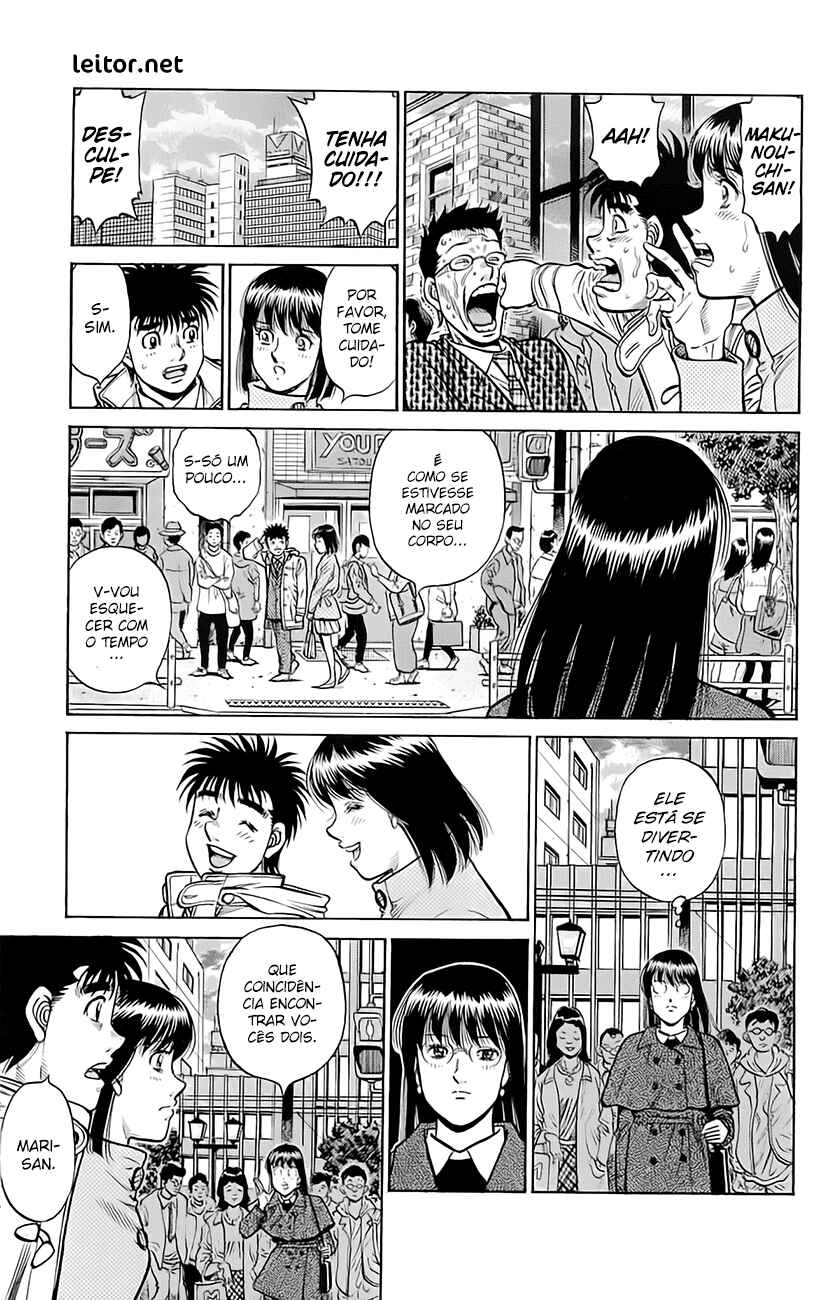 Capítulo 1 - O Primeiro PassoCapítulo 2 - Operação TartarugaCapítulo 3 - Pose de LutaCapítulo 4 - Lágrimas de FelicidadeCapítulo 5 - Uppercut de 1965Capítulo 6 - ShadowboxingCapítulo 7 - TécnicoCapítulo 8 - TreinamentoCapítulo 9 - Gongo da RevancheCapítulo 10 - Coragem do CoraçãoCapítulo 11 - Chance!!Capítulo 12 - Uma Arma InesperadaCapítulo 13 - Poder Destrutivo de 1cmCapítulo 14 - Cardápio do TakamuraCapítulo 15 - Encontro a TrêsCapítulo 16 - Licença de Classe CCapítulo 17 - Mau CaráterCapítulo 18 - Calções ArtesanaisCapítulo 19 - EstreiaCapítulo 20 - Deus!!Capítulo 21 - Parada Médica!?Capítulo 22 - De Repente, SouthpawCapítulo 23 - O Gosto da Primeira VitóriaCapítulo 24 - Peek-a-booCapítulo 25 - ObjetivoCapítulo 26 - AmigoCapítulo 27 - Nome de LutaCapítulo 28 - Pugilista NegroCapítulo 29 - Gancho AssassinoCapítulo 30 - Abertura do Torneio do Rei dos NovatosCapítulo 31 - Iniciativa para a VitóriaCapítulo 32 - Pare Ozuma!!Capítulo 33 - Está Doendo ou Não?Capítulo 34 - Contagem de 9Capítulo 35 - Aplausos para o DerrotadoCapítulo 36 - ShampooCapítulo 37 - AgitaçãoCapítulo 38 - Primeiro ProdígioCapítulo 39 - Ippo na PraiaCapítulo 40 - TreinamentoCapítulo 41 - O Segredo na Sola do PéCapítulo 42 - Pedido para as EstrelasCapítulo 43 - Memorando (Secreto) da VitóriaCapítulo 44 - Campeão FracoCapítulo 45 - ClinchCapítulo 46 - Círculo VazioCapítulo 47 - A Tática AbertaCapítulo 48 - Situação Facilmente PerigosaCapítulo 49 - O Sonho DefinidoCapítulo 50 - Luta pelo Título do Peso Médio do JapãoCapítulo 51 - O Retorno do DesafianteCapítulo 52 - Conferência Sobre o FuturoCapítulo 53 - Assassinato dos InfightersCapítulo 54 - A Força do ShotgunCapítulo 55 - PopularCapítulo 56 - A Face do GênioCapítulo 57 - ManbakenCapítulo 58 - Semifinal do Torneio Rei dos Novatos do Leste JaponêsCapítulo 59 - InesperadoCapítulo 60 - O Wind CarCapítulo 61 - Em Frente como um JavaliCapítulo 62 - A Luta nas CordasCapítulo 63 - Resultado Inesperado!?Capítulo 64 - A Derrota do ProdígioCapítulo 65 - O Primeiro Descanso em TemposCapítulo 66 - A Outra Semi-finalCapítulo 67 - HitmanCapítulo 68 - Ele Está EsperandoCapítulo 69 - Sapatos de BoxeCapítulo 70 - Pássaro Sem AsasCapítulo 71 - Lutando em Uma PernaCapítulo 72 - MensagemCapítulo 73 - Objetivo PerdidoCapítulo 74 - Protagonista do SofrimentoCapítulo 75 - O Irmãos do MashibaCapítulo 76 - Distância de 20cmCapítulo 77 - Punho RevitalizadoCapítulo 78 - Final do Torneio Rei dos Novatos do Leste JaponêsCapítulo 79 - Hitman VS Peek-a-booCapítulo 80 - Muito ForteCapítulo 81 - Murmúrio EstranhoCapítulo 82 - Punho QuebradoCapítulo 83 - Braço Esquerdo CaídoCapítulo 84 - Mashiba Se Levanta como um ReiCapítulo 85 - Energia NegraCapítulo 86 - O Retorno do HitmanCapítulo 87 - Ippo em GlóriaCapítulo 88 - Amante do IppoCapítulo 89 - Eu Adoro Grudar em Alguém!!Capítulo 90 - Sparring InútilCapítulo 91 - Recordação de TokyoCapítulo 92 - Super Doutor YCapítulo 93 - Treino DeliciosoCapítulo 94 - Estrela de OsakaCapítulo 95 - Um Inimigo InesperadoCapítulo 96 - Aumentando a Ansiedade....Capítulo 97 - InjeçãoCapítulo 98 - Grande Sentimento de TemorCapítulo 99 - Sendou PressionaCapítulo 100 - O Punho Direito RecuperadaCapítulo 101 - O Smash ModificadoCapítulo 102 - Foram Essas Palavras que Ele FalouCapítulo 103 - Aquilo que se PareceCapítulo 104 - Sendou no ChãoCapítulo 105 - Surra CompletaCapítulo 106 - Auxiliares, ForaCapítulo 107 - A Dicisão do Rei dos Novatos do JapãoCapítulo 108 - A Estranha CelebraçãoCapítulo 109 - FormaturaCapítulo 110 - Seguidores!?Capítulo 111 - Encontro Acidental com o CampeãoCapítulo 112 - As 9 Pessoas EntreCapítulo 113 - Quando o Punho se CuraCapítulo 114 - Empreste os OmbrosCapítulo 115 - Recupere Seu Estilo de LutaCapítulo 116 - O Soco MágicoCapítulo 117 - O Segredo Atrás da MágicaCapítulo 118 - O Mais Forte CovardeCapítulo 119 - InvejaCapítulo 120 - A Luta Entre Antigo e o Novo Rei dos NovatosCapítulo 121 - CorkscrewCapítulo 122 - O Estilo AdmiradoCapítulo 123 - Admiração do OkitaCapítulo 124 - Aqueles que Ultrapassam os OutrosCapítulo 125 - O Retorno de MiyataCapítulo 126 - Uma Contagem para Superá-losCapítulo 127 - O Homem que Nunca SorriCapítulo 128 - Chances de 1 em 30Capítulo 129 - JoltCapítulo 130 - TempestadeCapítulo 131 - Um Único SorrisoCapítulo 132 - Entrevista de um ÍdoloCapítulo 133 - Dê o Seu Melhor! Gero-MichiCapítulo 134 - O Torneio de Boxe Classe ACapítulo 135 - Eu Sinto MuitoCapítulo 136 - Abandonar ou Não!?Capítulo 137 - Soco de Boas VindasCapítulo 138 - Operação BMGCapítulo 139 - O Anúncio da LutaCapítulo 140 - O Punho Mais Forte VS o Homem Mais RápidoCapítulo 141 - O Homem da AceleraçãoCapítulo 142 - Sumindo com as Mãos e PésCapítulo 143 - Para Todos que Estavam PreocupadosCapítulo 144 - Zona de SegurançaCapítulo 145 - Um Dano Chamado MedoCapítulo 146 - A Declaração para Continuar de PéCapítulo 147 - White FangCapítulo 148 - Minha Canção FavoritaCapítulo 149 - O Tesouro de Gero-MichiCapítulo 150 - O Golpe das Lágrimas no FígadoCapítulo 151 - Grito de GuerraCapítulo 152 - A Luz e a Sombra no RingueCapítulo 153 - As Dúvidas da RaivaCapítulo 154 - Eu Quero Ser uma Gazela!Capítulo 155 - Gazelle PunchCapítulo 156 - A Depressão de um ArtistaCapítulo 157 - Sopa QuenteCapítulo 158 - Véspera das Finais do Torneio Classe ACapítulo 159 - A Fera EnjauladaCapítulo 160 - Você Não Pode FugirCapítulo 161 - Lobo Muito GentilCapítulo 162 - Começa a CaçadaCapítulo 163 - AcreditarCapítulo 164 - A Gazela DesesperadaCapítulo 165 - Aquilo que se Tinha AntesCapítulo 166 - Superando o Talento Natural....Capítulo 167 - Grito de Uma Memória DistanteCapítulo 168 - Exercício sem Oxigênio ExternoCapítulo 169 - O Vencedor em uma BaladaCapítulo 170 - MaçãCapítulo 171 - Entre Encontros e Ser um Bom FilhoCapítulo 172 - 