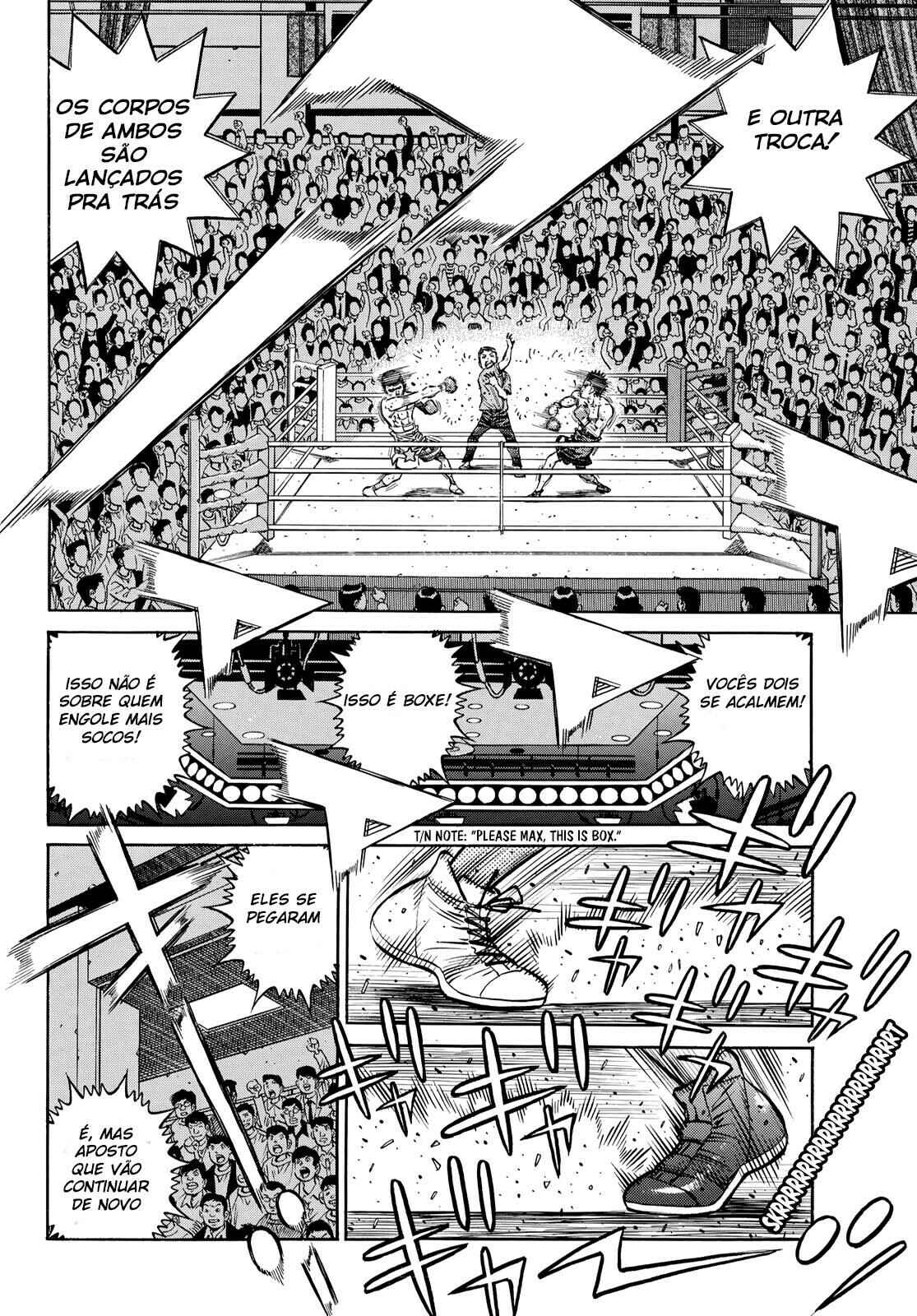 Capítulo 1 - O Primeiro PassoCapítulo 2 - Operação TartarugaCapítulo 3 - Pose de LutaCapítulo 4 - Lágrimas de FelicidadeCapítulo 5 - Uppercut de 1965Capítulo 6 - ShadowboxingCapítulo 7 - TécnicoCapítulo 8 - TreinamentoCapítulo 9 - Gongo da RevancheCapítulo 10 - Coragem do CoraçãoCapítulo 11 - Chance!!Capítulo 12 - Uma Arma InesperadaCapítulo 13 - Poder Destrutivo de 1cmCapítulo 14 - Cardápio do TakamuraCapítulo 15 - Encontro a TrêsCapítulo 16 - Licença de Classe CCapítulo 17 - Mau CaráterCapítulo 18 - Calções ArtesanaisCapítulo 19 - EstreiaCapítulo 20 - Deus!!Capítulo 21 - Parada Médica!?Capítulo 22 - De Repente, SouthpawCapítulo 23 - O Gosto da Primeira VitóriaCapítulo 24 - Peek-a-booCapítulo 25 - ObjetivoCapítulo 26 - AmigoCapítulo 27 - Nome de LutaCapítulo 28 - Pugilista NegroCapítulo 29 - Gancho AssassinoCapítulo 30 - Abertura do Torneio do Rei dos NovatosCapítulo 31 - Iniciativa para a VitóriaCapítulo 32 - Pare Ozuma!!Capítulo 33 - Está Doendo ou Não?Capítulo 34 - Contagem de 9Capítulo 35 - Aplausos para o DerrotadoCapítulo 36 - ShampooCapítulo 37 - AgitaçãoCapítulo 38 - Primeiro ProdígioCapítulo 39 - Ippo na PraiaCapítulo 40 - TreinamentoCapítulo 41 - O Segredo na Sola do PéCapítulo 42 - Pedido para as EstrelasCapítulo 43 - Memorando (Secreto) da VitóriaCapítulo 44 - Campeão FracoCapítulo 45 - ClinchCapítulo 46 - Círculo VazioCapítulo 47 - A Tática AbertaCapítulo 48 - Situação Facilmente PerigosaCapítulo 49 - O Sonho DefinidoCapítulo 50 - Luta pelo Título do Peso Médio do JapãoCapítulo 51 - O Retorno do DesafianteCapítulo 52 - Conferência Sobre o FuturoCapítulo 53 - Assassinato dos InfightersCapítulo 54 - A Força do ShotgunCapítulo 55 - PopularCapítulo 56 - A Face do GênioCapítulo 57 - ManbakenCapítulo 58 - Semifinal do Torneio Rei dos Novatos do Leste JaponêsCapítulo 59 - InesperadoCapítulo 60 - O Wind CarCapítulo 61 - Em Frente como um JavaliCapítulo 62 - A Luta nas CordasCapítulo 63 - Resultado Inesperado!?Capítulo 64 - A Derrota do ProdígioCapítulo 65 - O Primeiro Descanso em TemposCapítulo 66 - A Outra Semi-finalCapítulo 67 - HitmanCapítulo 68 - Ele Está EsperandoCapítulo 69 - Sapatos de BoxeCapítulo 70 - Pássaro Sem AsasCapítulo 71 - Lutando em Uma PernaCapítulo 72 - MensagemCapítulo 73 - Objetivo PerdidoCapítulo 74 - Protagonista do SofrimentoCapítulo 75 - O Irmãos do MashibaCapítulo 76 - Distância de 20cmCapítulo 77 - Punho RevitalizadoCapítulo 78 - Final do Torneio Rei dos Novatos do Leste JaponêsCapítulo 79 - Hitman VS Peek-a-booCapítulo 80 - Muito ForteCapítulo 81 - Murmúrio EstranhoCapítulo 82 - Punho QuebradoCapítulo 83 - Braço Esquerdo CaídoCapítulo 84 - Mashiba Se Levanta como um ReiCapítulo 85 - Energia NegraCapítulo 86 - O Retorno do HitmanCapítulo 87 - Ippo em GlóriaCapítulo 88 - Amante do IppoCapítulo 89 - Eu Adoro Grudar em Alguém!!Capítulo 90 - Sparring InútilCapítulo 91 - Recordação de TokyoCapítulo 92 - Super Doutor YCapítulo 93 - Treino DeliciosoCapítulo 94 - Estrela de OsakaCapítulo 95 - Um Inimigo InesperadoCapítulo 96 - Aumentando a Ansiedade....Capítulo 97 - InjeçãoCapítulo 98 - Grande Sentimento de TemorCapítulo 99 - Sendou PressionaCapítulo 100 - O Punho Direito RecuperadaCapítulo 101 - O Smash ModificadoCapítulo 102 - Foram Essas Palavras que Ele FalouCapítulo 103 - Aquilo que se PareceCapítulo 104 - Sendou no ChãoCapítulo 105 - Surra CompletaCapítulo 106 - Auxiliares, ForaCapítulo 107 - A Dicisão do Rei dos Novatos do JapãoCapítulo 108 - A Estranha CelebraçãoCapítulo 109 - FormaturaCapítulo 110 - Seguidores!?Capítulo 111 - Encontro Acidental com o CampeãoCapítulo 112 - As 9 Pessoas EntreCapítulo 113 - Quando o Punho se CuraCapítulo 114 - Empreste os OmbrosCapítulo 115 - Recupere Seu Estilo de LutaCapítulo 116 - O Soco MágicoCapítulo 117 - O Segredo Atrás da MágicaCapítulo 118 - O Mais Forte CovardeCapítulo 119 - InvejaCapítulo 120 - A Luta Entre Antigo e o Novo Rei dos NovatosCapítulo 121 - CorkscrewCapítulo 122 - O Estilo AdmiradoCapítulo 123 - Admiração do OkitaCapítulo 124 - Aqueles que Ultrapassam os OutrosCapítulo 125 - O Retorno de MiyataCapítulo 126 - Uma Contagem para Superá-losCapítulo 127 - O Homem que Nunca SorriCapítulo 128 - Chances de 1 em 30Capítulo 129 - JoltCapítulo 130 - TempestadeCapítulo 131 - Um Único SorrisoCapítulo 132 - Entrevista de um ÍdoloCapítulo 133 - Dê o Seu Melhor! Gero-MichiCapítulo 134 - O Torneio de Boxe Classe ACapítulo 135 - Eu Sinto MuitoCapítulo 136 - Abandonar ou Não!?Capítulo 137 - Soco de Boas VindasCapítulo 138 - Operação BMGCapítulo 139 - O Anúncio da LutaCapítulo 140 - O Punho Mais Forte VS o Homem Mais RápidoCapítulo 141 - O Homem da AceleraçãoCapítulo 142 - Sumindo com as Mãos e PésCapítulo 143 - Para Todos que Estavam PreocupadosCapítulo 144 - Zona de SegurançaCapítulo 145 - Um Dano Chamado MedoCapítulo 146 - A Declaração para Continuar de PéCapítulo 147 - White FangCapítulo 148 - Minha Canção FavoritaCapítulo 149 - O Tesouro de Gero-MichiCapítulo 150 - O Golpe das Lágrimas no FígadoCapítulo 151 - Grito de GuerraCapítulo 152 - A Luz e a Sombra no RingueCapítulo 153 - As Dúvidas da RaivaCapítulo 154 - Eu Quero Ser uma Gazela!Capítulo 155 - Gazelle PunchCapítulo 156 - A Depressão de um ArtistaCapítulo 157 - Sopa QuenteCapítulo 158 - Véspera das Finais do Torneio Classe ACapítulo 159 - A Fera EnjauladaCapítulo 160 - Você Não Pode FugirCapítulo 161 - Lobo Muito GentilCapítulo 162 - Começa a CaçadaCapítulo 163 - AcreditarCapítulo 164 - A Gazela DesesperadaCapítulo 165 - Aquilo que se Tinha AntesCapítulo 166 - Superando o Talento Natural....Capítulo 167 - Grito de Uma Memória DistanteCapítulo 168 - Exercício sem Oxigênio ExternoCapítulo 169 - O Vencedor em uma BaladaCapítulo 170 - MaçãCapítulo 171 - Entre Encontros e Ser um Bom FilhoCapítulo 172 - 