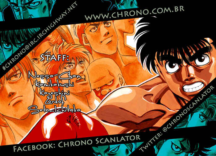 Capítulo 1 - O Primeiro PassoCapítulo 2 - Operação TartarugaCapítulo 3 - Pose de LutaCapítulo 4 - Lágrimas de FelicidadeCapítulo 5 - Uppercut de 1965Capítulo 6 - ShadowboxingCapítulo 7 - TécnicoCapítulo 8 - TreinamentoCapítulo 9 - Gongo da RevancheCapítulo 10 - Coragem do CoraçãoCapítulo 11 - Chance!!Capítulo 12 - Uma Arma InesperadaCapítulo 13 - Poder Destrutivo de 1cmCapítulo 14 - Cardápio do TakamuraCapítulo 15 - Encontro a TrêsCapítulo 16 - Licença de Classe CCapítulo 17 - Mau CaráterCapítulo 18 - Calções ArtesanaisCapítulo 19 - EstreiaCapítulo 20 - Deus!!Capítulo 21 - Parada Médica!?Capítulo 22 - De Repente, SouthpawCapítulo 23 - O Gosto da Primeira VitóriaCapítulo 24 - Peek-a-booCapítulo 25 - ObjetivoCapítulo 26 - AmigoCapítulo 27 - Nome de LutaCapítulo 28 - Pugilista NegroCapítulo 29 - Gancho AssassinoCapítulo 30 - Abertura do Torneio do Rei dos NovatosCapítulo 31 - Iniciativa para a VitóriaCapítulo 32 - Pare Ozuma!!Capítulo 33 - Está Doendo ou Não?Capítulo 34 - Contagem de 9Capítulo 35 - Aplausos para o DerrotadoCapítulo 36 - ShampooCapítulo 37 - AgitaçãoCapítulo 38 - Primeiro ProdígioCapítulo 39 - Ippo na PraiaCapítulo 40 - TreinamentoCapítulo 41 - O Segredo na Sola do PéCapítulo 42 - Pedido para as EstrelasCapítulo 43 - Memorando (Secreto) da VitóriaCapítulo 44 - Campeão FracoCapítulo 45 - ClinchCapítulo 46 - Círculo VazioCapítulo 47 - A Tática AbertaCapítulo 48 - Situação Facilmente PerigosaCapítulo 49 - O Sonho DefinidoCapítulo 50 - Luta pelo Título do Peso Médio do JapãoCapítulo 51 - O Retorno do DesafianteCapítulo 52 - Conferência Sobre o FuturoCapítulo 53 - Assassinato dos InfightersCapítulo 54 - A Força do ShotgunCapítulo 55 - PopularCapítulo 56 - A Face do GênioCapítulo 57 - ManbakenCapítulo 58 - Semifinal do Torneio Rei dos Novatos do Leste JaponêsCapítulo 59 - InesperadoCapítulo 60 - O Wind CarCapítulo 61 - Em Frente como um JavaliCapítulo 62 - A Luta nas CordasCapítulo 63 - Resultado Inesperado!?Capítulo 64 - A Derrota do ProdígioCapítulo 65 - O Primeiro Descanso em TemposCapítulo 66 - A Outra Semi-finalCapítulo 67 - HitmanCapítulo 68 - Ele Está EsperandoCapítulo 69 - Sapatos de BoxeCapítulo 70 - Pássaro Sem AsasCapítulo 71 - Lutando em Uma PernaCapítulo 72 - MensagemCapítulo 73 - Objetivo PerdidoCapítulo 74 - Protagonista do SofrimentoCapítulo 75 - O Irmãos do MashibaCapítulo 76 - Distância de 20cmCapítulo 77 - Punho RevitalizadoCapítulo 78 - Final do Torneio Rei dos Novatos do Leste JaponêsCapítulo 79 - Hitman VS Peek-a-booCapítulo 80 - Muito ForteCapítulo 81 - Murmúrio EstranhoCapítulo 82 - Punho QuebradoCapítulo 83 - Braço Esquerdo CaídoCapítulo 84 - Mashiba Se Levanta como um ReiCapítulo 85 - Energia NegraCapítulo 86 - O Retorno do HitmanCapítulo 87 - Ippo em GlóriaCapítulo 88 - Amante do IppoCapítulo 89 - Eu Adoro Grudar em Alguém!!Capítulo 90 - Sparring InútilCapítulo 91 - Recordação de TokyoCapítulo 92 - Super Doutor YCapítulo 93 - Treino DeliciosoCapítulo 94 - Estrela de OsakaCapítulo 95 - Um Inimigo InesperadoCapítulo 96 - Aumentando a Ansiedade....Capítulo 97 - InjeçãoCapítulo 98 - Grande Sentimento de TemorCapítulo 99 - Sendou PressionaCapítulo 100 - O Punho Direito RecuperadaCapítulo 101 - O Smash ModificadoCapítulo 102 - Foram Essas Palavras que Ele FalouCapítulo 103 - Aquilo que se PareceCapítulo 104 - Sendou no ChãoCapítulo 105 - Surra CompletaCapítulo 106 - Auxiliares, ForaCapítulo 107 - A Dicisão do Rei dos Novatos do JapãoCapítulo 108 - A Estranha CelebraçãoCapítulo 109 - FormaturaCapítulo 110 - Seguidores!?Capítulo 111 - Encontro Acidental com o CampeãoCapítulo 112 - As 9 Pessoas EntreCapítulo 113 - Quando o Punho se CuraCapítulo 114 - Empreste os OmbrosCapítulo 115 - Recupere Seu Estilo de LutaCapítulo 116 - O Soco MágicoCapítulo 117 - O Segredo Atrás da MágicaCapítulo 118 - O Mais Forte CovardeCapítulo 119 - InvejaCapítulo 120 - A Luta Entre Antigo e o Novo Rei dos NovatosCapítulo 121 - CorkscrewCapítulo 122 - O Estilo AdmiradoCapítulo 123 - Admiração do OkitaCapítulo 124 - Aqueles que Ultrapassam os OutrosCapítulo 125 - O Retorno de MiyataCapítulo 126 - Uma Contagem para Superá-losCapítulo 127 - O Homem que Nunca SorriCapítulo 128 - Chances de 1 em 30Capítulo 129 - JoltCapítulo 130 - TempestadeCapítulo 131 - Um Único SorrisoCapítulo 132 - Entrevista de um ÍdoloCapítulo 133 - Dê o Seu Melhor! Gero-MichiCapítulo 134 - O Torneio de Boxe Classe ACapítulo 135 - Eu Sinto MuitoCapítulo 136 - Abandonar ou Não!?Capítulo 137 - Soco de Boas VindasCapítulo 138 - Operação BMGCapítulo 139 - O Anúncio da LutaCapítulo 140 - O Punho Mais Forte VS o Homem Mais RápidoCapítulo 141 - O Homem da AceleraçãoCapítulo 142 - Sumindo com as Mãos e PésCapítulo 143 - Para Todos que Estavam PreocupadosCapítulo 144 - Zona de SegurançaCapítulo 145 - Um Dano Chamado MedoCapítulo 146 - A Declaração para Continuar de PéCapítulo 147 - White FangCapítulo 148 - Minha Canção FavoritaCapítulo 149 - O Tesouro de Gero-MichiCapítulo 150 - O Golpe das Lágrimas no FígadoCapítulo 151 - Grito de GuerraCapítulo 152 - A Luz e a Sombra no RingueCapítulo 153 - As Dúvidas da RaivaCapítulo 154 - Eu Quero Ser uma Gazela!Capítulo 155 - Gazelle PunchCapítulo 156 - A Depressão de um ArtistaCapítulo 157 - Sopa QuenteCapítulo 158 - Véspera das Finais do Torneio Classe ACapítulo 159 - A Fera EnjauladaCapítulo 160 - Você Não Pode FugirCapítulo 161 - Lobo Muito GentilCapítulo 162 - Começa a CaçadaCapítulo 163 - AcreditarCapítulo 164 - A Gazela DesesperadaCapítulo 165 - Aquilo que se Tinha AntesCapítulo 166 - Superando o Talento Natural....Capítulo 167 - Grito de Uma Memória DistanteCapítulo 168 - Exercício sem Oxigênio ExternoCapítulo 169 - O Vencedor em uma BaladaCapítulo 170 - MaçãCapítulo 171 - Entre Encontros e Ser um Bom FilhoCapítulo 172 - 