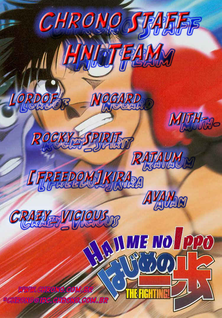 Capítulo 1 - O Primeiro PassoCapítulo 2 - Operação TartarugaCapítulo 3 - Pose de LutaCapítulo 4 - Lágrimas de FelicidadeCapítulo 5 - Uppercut de 1965Capítulo 6 - ShadowboxingCapítulo 7 - TécnicoCapítulo 8 - TreinamentoCapítulo 9 - Gongo da RevancheCapítulo 10 - Coragem do CoraçãoCapítulo 11 - Chance!!Capítulo 12 - Uma Arma InesperadaCapítulo 13 - Poder Destrutivo de 1cmCapítulo 14 - Cardápio do TakamuraCapítulo 15 - Encontro a TrêsCapítulo 16 - Licença de Classe CCapítulo 17 - Mau CaráterCapítulo 18 - Calções ArtesanaisCapítulo 19 - EstreiaCapítulo 20 - Deus!!Capítulo 21 - Parada Médica!?Capítulo 22 - De Repente, SouthpawCapítulo 23 - O Gosto da Primeira VitóriaCapítulo 24 - Peek-a-booCapítulo 25 - ObjetivoCapítulo 26 - AmigoCapítulo 27 - Nome de LutaCapítulo 28 - Pugilista NegroCapítulo 29 - Gancho AssassinoCapítulo 30 - Abertura do Torneio do Rei dos NovatosCapítulo 31 - Iniciativa para a VitóriaCapítulo 32 - Pare Ozuma!!Capítulo 33 - Está Doendo ou Não?Capítulo 34 - Contagem de 9Capítulo 35 - Aplausos para o DerrotadoCapítulo 36 - ShampooCapítulo 37 - AgitaçãoCapítulo 38 - Primeiro ProdígioCapítulo 39 - Ippo na PraiaCapítulo 40 - TreinamentoCapítulo 41 - O Segredo na Sola do PéCapítulo 42 - Pedido para as EstrelasCapítulo 43 - Memorando (Secreto) da VitóriaCapítulo 44 - Campeão FracoCapítulo 45 - ClinchCapítulo 46 - Círculo VazioCapítulo 47 - A Tática AbertaCapítulo 48 - Situação Facilmente PerigosaCapítulo 49 - O Sonho DefinidoCapítulo 50 - Luta pelo Título do Peso Médio do JapãoCapítulo 51 - O Retorno do DesafianteCapítulo 52 - Conferência Sobre o FuturoCapítulo 53 - Assassinato dos InfightersCapítulo 54 - A Força do ShotgunCapítulo 55 - PopularCapítulo 56 - A Face do GênioCapítulo 57 - ManbakenCapítulo 58 - Semifinal do Torneio Rei dos Novatos do Leste JaponêsCapítulo 59 - InesperadoCapítulo 60 - O Wind CarCapítulo 61 - Em Frente como um JavaliCapítulo 62 - A Luta nas CordasCapítulo 63 - Resultado Inesperado!?Capítulo 64 - A Derrota do ProdígioCapítulo 65 - O Primeiro Descanso em TemposCapítulo 66 - A Outra Semi-finalCapítulo 67 - HitmanCapítulo 68 - Ele Está EsperandoCapítulo 69 - Sapatos de BoxeCapítulo 70 - Pássaro Sem AsasCapítulo 71 - Lutando em Uma PernaCapítulo 72 - MensagemCapítulo 73 - Objetivo PerdidoCapítulo 74 - Protagonista do SofrimentoCapítulo 75 - O Irmãos do MashibaCapítulo 76 - Distância de 20cmCapítulo 77 - Punho RevitalizadoCapítulo 78 - Final do Torneio Rei dos Novatos do Leste JaponêsCapítulo 79 - Hitman VS Peek-a-booCapítulo 80 - Muito ForteCapítulo 81 - Murmúrio EstranhoCapítulo 82 - Punho QuebradoCapítulo 83 - Braço Esquerdo CaídoCapítulo 84 - Mashiba Se Levanta como um ReiCapítulo 85 - Energia NegraCapítulo 86 - O Retorno do HitmanCapítulo 87 - Ippo em GlóriaCapítulo 88 - Amante do IppoCapítulo 89 - Eu Adoro Grudar em Alguém!!Capítulo 90 - Sparring InútilCapítulo 91 - Recordação de TokyoCapítulo 92 - Super Doutor YCapítulo 93 - Treino DeliciosoCapítulo 94 - Estrela de OsakaCapítulo 95 - Um Inimigo InesperadoCapítulo 96 - Aumentando a Ansiedade....Capítulo 97 - InjeçãoCapítulo 98 - Grande Sentimento de TemorCapítulo 99 - Sendou PressionaCapítulo 100 - O Punho Direito RecuperadaCapítulo 101 - O Smash ModificadoCapítulo 102 - Foram Essas Palavras que Ele FalouCapítulo 103 - Aquilo que se PareceCapítulo 104 - Sendou no ChãoCapítulo 105 - Surra CompletaCapítulo 106 - Auxiliares, ForaCapítulo 107 - A Dicisão do Rei dos Novatos do JapãoCapítulo 108 - A Estranha CelebraçãoCapítulo 109 - FormaturaCapítulo 110 - Seguidores!?Capítulo 111 - Encontro Acidental com o CampeãoCapítulo 112 - As 9 Pessoas EntreCapítulo 113 - Quando o Punho se CuraCapítulo 114 - Empreste os OmbrosCapítulo 115 - Recupere Seu Estilo de LutaCapítulo 116 - O Soco MágicoCapítulo 117 - O Segredo Atrás da MágicaCapítulo 118 - O Mais Forte CovardeCapítulo 119 - InvejaCapítulo 120 - A Luta Entre Antigo e o Novo Rei dos NovatosCapítulo 121 - CorkscrewCapítulo 122 - O Estilo AdmiradoCapítulo 123 - Admiração do OkitaCapítulo 124 - Aqueles que Ultrapassam os OutrosCapítulo 125 - O Retorno de MiyataCapítulo 126 - Uma Contagem para Superá-losCapítulo 127 - O Homem que Nunca SorriCapítulo 128 - Chances de 1 em 30Capítulo 129 - JoltCapítulo 130 - TempestadeCapítulo 131 - Um Único SorrisoCapítulo 132 - Entrevista de um ÍdoloCapítulo 133 - Dê o Seu Melhor! Gero-MichiCapítulo 134 - O Torneio de Boxe Classe ACapítulo 135 - Eu Sinto MuitoCapítulo 136 - Abandonar ou Não!?Capítulo 137 - Soco de Boas VindasCapítulo 138 - Operação BMGCapítulo 139 - O Anúncio da LutaCapítulo 140 - O Punho Mais Forte VS o Homem Mais RápidoCapítulo 141 - O Homem da AceleraçãoCapítulo 142 - Sumindo com as Mãos e PésCapítulo 143 - Para Todos que Estavam PreocupadosCapítulo 144 - Zona de SegurançaCapítulo 145 - Um Dano Chamado MedoCapítulo 146 - A Declaração para Continuar de PéCapítulo 147 - White FangCapítulo 148 - Minha Canção FavoritaCapítulo 149 - O Tesouro de Gero-MichiCapítulo 150 - O Golpe das Lágrimas no FígadoCapítulo 151 - Grito de GuerraCapítulo 152 - A Luz e a Sombra no RingueCapítulo 153 - As Dúvidas da RaivaCapítulo 154 - Eu Quero Ser uma Gazela!Capítulo 155 - Gazelle PunchCapítulo 156 - A Depressão de um ArtistaCapítulo 157 - Sopa QuenteCapítulo 158 - Véspera das Finais do Torneio Classe ACapítulo 159 - A Fera EnjauladaCapítulo 160 - Você Não Pode FugirCapítulo 161 - Lobo Muito GentilCapítulo 162 - Começa a CaçadaCapítulo 163 - AcreditarCapítulo 164 - A Gazela DesesperadaCapítulo 165 - Aquilo que se Tinha AntesCapítulo 166 - Superando o Talento Natural....Capítulo 167 - Grito de Uma Memória DistanteCapítulo 168 - Exercício sem Oxigênio ExternoCapítulo 169 - O Vencedor em uma BaladaCapítulo 170 - MaçãCapítulo 171 - Entre Encontros e Ser um Bom FilhoCapítulo 172 - 