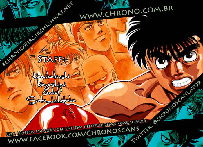 Capítulo 1 - O Primeiro PassoCapítulo 2 - Operação TartarugaCapítulo 3 - Pose de LutaCapítulo 4 - Lágrimas de FelicidadeCapítulo 5 - Uppercut de 1965Capítulo 6 - ShadowboxingCapítulo 7 - TécnicoCapítulo 8 - TreinamentoCapítulo 9 - Gongo da RevancheCapítulo 10 - Coragem do CoraçãoCapítulo 11 - Chance!!Capítulo 12 - Uma Arma InesperadaCapítulo 13 - Poder Destrutivo de 1cmCapítulo 14 - Cardápio do TakamuraCapítulo 15 - Encontro a TrêsCapítulo 16 - Licença de Classe CCapítulo 17 - Mau CaráterCapítulo 18 - Calções ArtesanaisCapítulo 19 - EstreiaCapítulo 20 - Deus!!Capítulo 21 - Parada Médica!?Capítulo 22 - De Repente, SouthpawCapítulo 23 - O Gosto da Primeira VitóriaCapítulo 24 - Peek-a-booCapítulo 25 - ObjetivoCapítulo 26 - AmigoCapítulo 27 - Nome de LutaCapítulo 28 - Pugilista NegroCapítulo 29 - Gancho AssassinoCapítulo 30 - Abertura do Torneio do Rei dos NovatosCapítulo 31 - Iniciativa para a VitóriaCapítulo 32 - Pare Ozuma!!Capítulo 33 - Está Doendo ou Não?Capítulo 34 - Contagem de 9Capítulo 35 - Aplausos para o DerrotadoCapítulo 36 - ShampooCapítulo 37 - AgitaçãoCapítulo 38 - Primeiro ProdígioCapítulo 39 - Ippo na PraiaCapítulo 40 - TreinamentoCapítulo 41 - O Segredo na Sola do PéCapítulo 42 - Pedido para as EstrelasCapítulo 43 - Memorando (Secreto) da VitóriaCapítulo 44 - Campeão FracoCapítulo 45 - ClinchCapítulo 46 - Círculo VazioCapítulo 47 - A Tática AbertaCapítulo 48 - Situação Facilmente PerigosaCapítulo 49 - O Sonho DefinidoCapítulo 50 - Luta pelo Título do Peso Médio do JapãoCapítulo 51 - O Retorno do DesafianteCapítulo 52 - Conferência Sobre o FuturoCapítulo 53 - Assassinato dos InfightersCapítulo 54 - A Força do ShotgunCapítulo 55 - PopularCapítulo 56 - A Face do GênioCapítulo 57 - ManbakenCapítulo 58 - Semifinal do Torneio Rei dos Novatos do Leste JaponêsCapítulo 59 - InesperadoCapítulo 60 - O Wind CarCapítulo 61 - Em Frente como um JavaliCapítulo 62 - A Luta nas CordasCapítulo 63 - Resultado Inesperado!?Capítulo 64 - A Derrota do ProdígioCapítulo 65 - O Primeiro Descanso em TemposCapítulo 66 - A Outra Semi-finalCapítulo 67 - HitmanCapítulo 68 - Ele Está EsperandoCapítulo 69 - Sapatos de BoxeCapítulo 70 - Pássaro Sem AsasCapítulo 71 - Lutando em Uma PernaCapítulo 72 - MensagemCapítulo 73 - Objetivo PerdidoCapítulo 74 - Protagonista do SofrimentoCapítulo 75 - O Irmãos do MashibaCapítulo 76 - Distância de 20cmCapítulo 77 - Punho RevitalizadoCapítulo 78 - Final do Torneio Rei dos Novatos do Leste JaponêsCapítulo 79 - Hitman VS Peek-a-booCapítulo 80 - Muito ForteCapítulo 81 - Murmúrio EstranhoCapítulo 82 - Punho QuebradoCapítulo 83 - Braço Esquerdo CaídoCapítulo 84 - Mashiba Se Levanta como um ReiCapítulo 85 - Energia NegraCapítulo 86 - O Retorno do HitmanCapítulo 87 - Ippo em GlóriaCapítulo 88 - Amante do IppoCapítulo 89 - Eu Adoro Grudar em Alguém!!Capítulo 90 - Sparring InútilCapítulo 91 - Recordação de TokyoCapítulo 92 - Super Doutor YCapítulo 93 - Treino DeliciosoCapítulo 94 - Estrela de OsakaCapítulo 95 - Um Inimigo InesperadoCapítulo 96 - Aumentando a Ansiedade....Capítulo 97 - InjeçãoCapítulo 98 - Grande Sentimento de TemorCapítulo 99 - Sendou PressionaCapítulo 100 - O Punho Direito RecuperadaCapítulo 101 - O Smash ModificadoCapítulo 102 - Foram Essas Palavras que Ele FalouCapítulo 103 - Aquilo que se PareceCapítulo 104 - Sendou no ChãoCapítulo 105 - Surra CompletaCapítulo 106 - Auxiliares, ForaCapítulo 107 - A Dicisão do Rei dos Novatos do JapãoCapítulo 108 - A Estranha CelebraçãoCapítulo 109 - FormaturaCapítulo 110 - Seguidores!?Capítulo 111 - Encontro Acidental com o CampeãoCapítulo 112 - As 9 Pessoas EntreCapítulo 113 - Quando o Punho se CuraCapítulo 114 - Empreste os OmbrosCapítulo 115 - Recupere Seu Estilo de LutaCapítulo 116 - O Soco MágicoCapítulo 117 - O Segredo Atrás da MágicaCapítulo 118 - O Mais Forte CovardeCapítulo 119 - InvejaCapítulo 120 - A Luta Entre Antigo e o Novo Rei dos NovatosCapítulo 121 - CorkscrewCapítulo 122 - O Estilo AdmiradoCapítulo 123 - Admiração do OkitaCapítulo 124 - Aqueles que Ultrapassam os OutrosCapítulo 125 - O Retorno de MiyataCapítulo 126 - Uma Contagem para Superá-losCapítulo 127 - O Homem que Nunca SorriCapítulo 128 - Chances de 1 em 30Capítulo 129 - JoltCapítulo 130 - TempestadeCapítulo 131 - Um Único SorrisoCapítulo 132 - Entrevista de um ÍdoloCapítulo 133 - Dê o Seu Melhor! Gero-MichiCapítulo 134 - O Torneio de Boxe Classe ACapítulo 135 - Eu Sinto MuitoCapítulo 136 - Abandonar ou Não!?Capítulo 137 - Soco de Boas VindasCapítulo 138 - Operação BMGCapítulo 139 - O Anúncio da LutaCapítulo 140 - O Punho Mais Forte VS o Homem Mais RápidoCapítulo 141 - O Homem da AceleraçãoCapítulo 142 - Sumindo com as Mãos e PésCapítulo 143 - Para Todos que Estavam PreocupadosCapítulo 144 - Zona de SegurançaCapítulo 145 - Um Dano Chamado MedoCapítulo 146 - A Declaração para Continuar de PéCapítulo 147 - White FangCapítulo 148 - Minha Canção FavoritaCapítulo 149 - O Tesouro de Gero-MichiCapítulo 150 - O Golpe das Lágrimas no FígadoCapítulo 151 - Grito de GuerraCapítulo 152 - A Luz e a Sombra no RingueCapítulo 153 - As Dúvidas da RaivaCapítulo 154 - Eu Quero Ser uma Gazela!Capítulo 155 - Gazelle PunchCapítulo 156 - A Depressão de um ArtistaCapítulo 157 - Sopa QuenteCapítulo 158 - Véspera das Finais do Torneio Classe ACapítulo 159 - A Fera EnjauladaCapítulo 160 - Você Não Pode FugirCapítulo 161 - Lobo Muito GentilCapítulo 162 - Começa a CaçadaCapítulo 163 - AcreditarCapítulo 164 - A Gazela DesesperadaCapítulo 165 - Aquilo que se Tinha AntesCapítulo 166 - Superando o Talento Natural....Capítulo 167 - Grito de Uma Memória DistanteCapítulo 168 - Exercício sem Oxigênio ExternoCapítulo 169 - O Vencedor em uma BaladaCapítulo 170 - MaçãCapítulo 171 - Entre Encontros e Ser um Bom FilhoCapítulo 172 - 