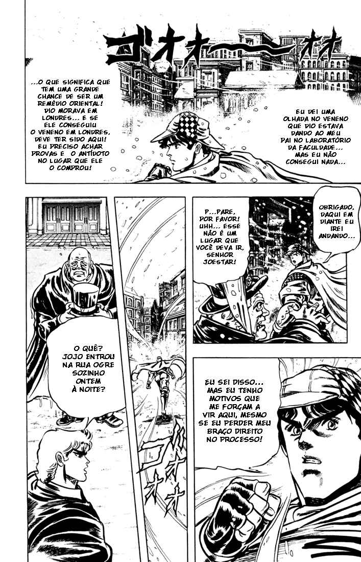 Capítulo 1 - A vinda de DioCapítulo 2 - Um novo amigoCapítulo 3 - Querida ErinaCapítulo 4 - Vão vou perderCapítulo 5 - Danny em chamasCapítulo 6 - Uma carta do passadoCapítulo 7 - O juramento para o paiCapítulo 8 - Batalha na Rua OgreCapítulo 9 - O experimento vivo para a máscaraCapítulo 10 - A sede de sangueCapítulo 11 - Transcendendo a humanidadeCapítulo 12 - Os dois anéisCapítulo 13 - Monstro imortalCapítulo 14 - Ataque dos mortos vivosCapítulo 15 - Acertando a juventude com Dio!Capítulo 16 - Estátua da deusa do amorCapítulo 17 - Rosto nostálgicoCapítulo 18 - Jack, o vilão e Zepelli o exêntricoCapítulo 19 - A energia milagrosaCapítulo 20 - Tragédia em alto marCapítulo 21 - Cidade malditaCapítulo 22 - Retalhe seus medosCapítulo 23 - Vento do norte e vikingsCapítulo 24 - Convite para uma armadilhaCapítulo 25 - O poder da máscara que congela o sangueCapítulo 26 - Os cavaleiros negrosCapítulo 27 - Demônio vingativo do passadoCapítulo 28 - Os heróis dos 72 anéisCapítulo 29 - A maldição do cavaleiro negroCapítulo 30 - Durma como um heróiCapítulo 31 - Ruínas de um cavaleiroCapítulo 32 - A sala de decapitação do dragãoCapítulo 33 - A coragem do amanhãCapítulo 34 - A profecia do anciãoCapítulo 35 - Exploda-o com fúria!Capítulo 36 - Os três de um país distante.Capítulo 37 - O monstro DubeeCapítulo 38 - Ataque cortante da cruz do trovãoCapítulo 39 - Batalha de sangue Jojo vs Dio!Capítulo 40 - Fogo e geloCapítulo 41 - O fim de um demônioCapítulo 42 - Prefácio a tempestadeCapítulo 43 - O Hamon finalCapítulo 44 - No esquecimento