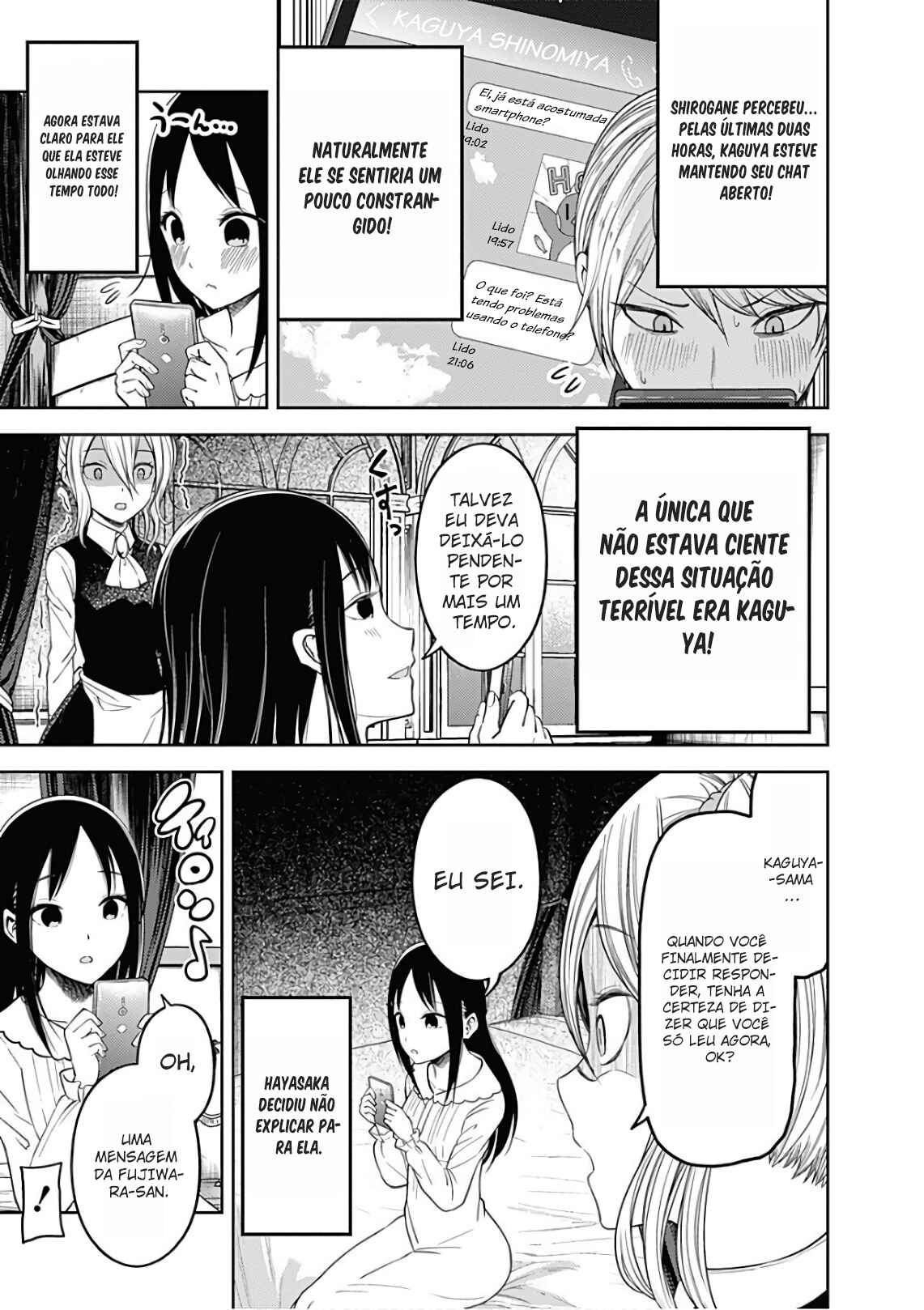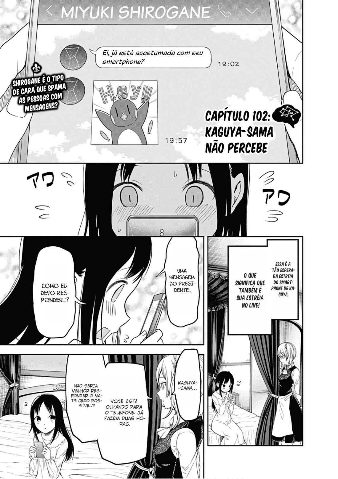 Capítulo 1 - Eu quero ser convidada para o cinemaCapítulo 2 - Eu quero jogar micoCapítulo 3 - Kaguya não sabe muitoCapítulo 4Capítulo 5 - Kaguya quer comerCapítulo 5.5 - ExtraCapítulo 6 - Shirogane Miyuki quer esconderCapítulo 7 - Quer ir em uma ViagemCapítulo 8 - Kaguya quer ser RespondidaCapítulo 9 - Kaguya quer CaminharCapítulo 10 - O Conselho Estudantil quer fazer uma BrincadeiraCapítulo 10.5Capítulo 11 - Kaguya quer TrocarCapítulo 12 - Kaguya quer ser IntrometidaCapítulo 13 - Kaguya quer ser indiretaCapítulo 14 - Shirogane miyuki não fez issoCapítulo 15 - Shirogami miyuki quer fugirCapítulo 16 - Kaguya quer fazer direitoCapítulo 17 - Kaguya quer adorarCapítulo 18 - O conselho estudantil quer conversarCapítulo 19 - Kaguya quer ser enviadaCapítulo 20 - Miyuki shirogane quer falarCapítulo 20.5 - ExtraCapítulo 21 - Kaguya quer segurarCapítulo 22 - Chika fujiwara quer ser comidaCapítulo 23 - Miyuki shirogane quer mostrarCapítulo 24 - Ishigami yu quer sobreviverCapítulo 25 - Kaguya quer ser notadaCapítulo 26 - Miyuki shirogane quer trabalharCapítulo 27 - Kaguya tenta resistirCapítulo 27.5 - ExtraCapítulo 28 - Fujiwara chika quer testarCapítulo 29 - Kaguya quer se juntarCapítulo 30 - Hayasaka ai quer defenderCapítulo 31 - Shirogane miyuki não pode perderCapítulo 32 - Kaguya quer ser odiadaCapítulo 33 - Kaguya quer oferecerCapítulo 34 - Fujiwara chika quer visitarCapítulo 35 - Em relação a shinomiya kaguya, parte 1Capítulo 36 - Miyuki shirogane quer cantarCapítulo 37 - Kaguya não vai cederCapítulo 38 - Kaguya quer perdoarCapítulo 39 - Kaguya quer ser chamadaCapítulo 40 - Shirogane miyuki quer viajarCapítulo 41 - Shirogane miyuki quer se encontrarCapítulo 42 - Hayasaka ai quer mergulharCapítulo 43 - Fujiwara chika quer comerCapítulo 44 - Eu não consigo ouvir os fogos,parte 1Capítulo 45 - Eu não consigo ouvir os fogos,parte 2Capítulo 46 - Kaguya não quer fugirCapítulo 47 - Kaguya quer escolherCapítulo 48 - O conselho estudantil não fezCapítulo 49 - Shirogane miyuki quer prepararCapítulo 50 - Nagisa kashiwagi não consegue assistirCapítulo 51 - Kaguya quer comemorarCapítulo 52 - Kaguya quer perguntarCapítulo 53 - Kaguya quer darCapítulo 54 - Chika fujiwara quer confirmarCapítulo 55 - Assim, yu ishigami fechou seus olhos, parte 1Capítulo 56 - Miyuki shirogane quer observarCapítulo 57 - Kaguya quer se casarCapítulo 58 - Ai hayasaka quer seduzirCapítulo 59 - O 67° conselho estudantilCapítulo 60Capítulo 61 - Kaguya quer uma confissãoCapítulo 62Capítulo 63 - Miyuki shirogane quer ser popularCapítulo 64 - Nagisa kashiwagi quer consolarCapítulo 65 - Miko lino quer corrigirCapítulo 66 - Kaguya quer eliminarCapítulo 67 - Miko lino não pode ser ridicularizadaCapítulo 68 - Eu quero fazer a miko lino sorrirCapítulo 69 - Kaguya não quer ser chamadaCapítulo 70 - Kaguya quer tirarCapítulo 71 - Kaguya quer produzirCapítulo 72 - Miko lino quer restringirCapítulo 73 - Shirogame miyuki quer lerCapítulo 74 - Kaguya♡AquárioCapítulo 75 - Kaguya quer coletarCapítulo 76 - Nagisa kashiwagi é irritanteCapítulo 77 - Chika fujiwara quer obter informaçãoCapítulo 78 - Kaguya não está assustadaCapítulo 79 - Kaguya quer ser examinadaCapítulo 80 - Assim, yu ishigami fechou seus olhos, parte 2Capítulo 81 - Kaguya quer tocarCapítulo 82 - Kaguya não vai recusarCapítulo 83 - Kai shirogane não consegue dizer issoCapítulo 84 - Miyuki shirogane quer dançarCapítulo 85 - Osaragui kobashi quer controlarCapítulo 86 - Shirogane pai quer perguntarCapítulo 87 - Festival de atletismo da shuuichiinCapítulo 88 - Assim, yu ishigami fechou seus olhos, parte 3Capítulo 89 - Miyuki shirogane e yu ishigamiCapítulo 90 - Kyoko ootomo não percebeCapítulo 91 - Chika Fujiwara Quer Fazer CrescerCapítulo 92 - Eu Quero Fazer a Kaguya CorarCapítulo 93 - Kaguya Quer Tirá-lo de LáCapítulo 94 - Kaguya Quer InterromperCapítulo 95 - Miko Iino Quer RelaxarCapítulo 96 - Kaguya Quer Alimentar EleCapítulo 97 - Nagisa Kashiwagi Quer Matá-loCapítulo 101 - O Conselho Estudantil Quer Ser Fotografado, Parte 2Capítulo 102 - Kaguya-sama Não PercebeCapítulo 103 - Miyuki Shirogane Quer MediarCapítulo 104 - O Desafio Impossível de Kaguya Shinomiya: “A Concha Koyasugai”, Parte 1Capítulo 105 - Yu Ishigami Quer ResponderCapítulo 106 - Chika Fujiwara Quer Uma Festa do PijamaCapítulo 107 - Chika Fujiwara Quer Manter o RitmoCapítulo 108 - Ai Hayasaka Quer Dizer AlgoCapítulo 109 - Maki Shijo Quer Pedir AjudaCapítulo 110 - Yu Ishigami Quer ConversarCapítulo 111 - O Conselho Estudantil Quer AvançarCapítulo 112 - Miyuki Shirogane Quer Receber Uma Confissão, Parte 1Capítulo 113 - Miyuki Shirogane Quer Receber Uma Confissão, Parte 2Capítulo 114 - Miyuki Shirogane Quer Receber Uma Confissão, Parte 3Capítulo 115 - Miko Iino Não Consegue Amar, Parte 1Capítulo 116 - Queremos Falar Sobre o Festival CulturalCapítulo 117 - Chika Fujiwara Quer LutarCapítulo 118 - Miyuki Shirogane Quer ExpandirCapítulo 119 - Kei Shirogane Quer se ExibirCapítulo 120 - Sobre Kaguya Shinomiya, Parte 2Capítulo 121 - Primeiro Ano, PrimaveraCapítulo 122 - Kaguya Quer se Confessar, Parte 1Capítulo 123 - Festival Cultural da KaguyaCapítulo 124 - Festival Cultural do Yu IshigamiCapítulo 125 - Kozue Makihara Quer BrincarCapítulo 126 - Chika Fujiwara Quer Acertar as ContasCapítulo 127 - Festival Cultural de Miyuki ShiroganeCapítulo 128 - Kaguya Quer Derrubá-losCapítulo 129 - Miyuki Shirogane Quer Receber Uma Confissão, Parte 4Capítulo 130 - Tsubame Koyasu Quer Rejeitá-loCapítulo 131 - Miyuki Shirogane Quer Receber Uma Confissão, Parte 5Capítulo 132 - Kaguya Quer Se Confessar, Parte 2Capítulo 133 - Kaguya Quer Se Confessar, Parte 3Capítulo 134 - Confissões Duplas, Parte 1Capítulo 135 - Confissões Duplas, Parte 2Capítulo 136 - Confissões Duplas, Parte 3Capítulo 137 - O Pós-festa da Shuchi’inCapítulo 138 - Kaguya Quer ExplicarCapítulo 139 -