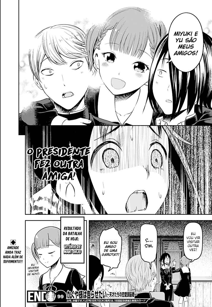 Capítulo 1 - Eu quero ser convidada para o cinemaCapítulo 2 - Eu quero jogar micoCapítulo 3 - Kaguya não sabe muitoCapítulo 4Capítulo 5 - Kaguya quer comerCapítulo 5.5 - ExtraCapítulo 6 - Shirogane Miyuki quer esconderCapítulo 7 - Quer ir em uma ViagemCapítulo 8 - Kaguya quer ser RespondidaCapítulo 9 - Kaguya quer CaminharCapítulo 10 - O Conselho Estudantil quer fazer uma BrincadeiraCapítulo 10.5Capítulo 11 - Kaguya quer TrocarCapítulo 12 - Kaguya quer ser IntrometidaCapítulo 13 - Kaguya quer ser indiretaCapítulo 14 - Shirogane miyuki não fez issoCapítulo 15 - Shirogami miyuki quer fugirCapítulo 16 - Kaguya quer fazer direitoCapítulo 17 - Kaguya quer adorarCapítulo 18 - O conselho estudantil quer conversarCapítulo 19 - Kaguya quer ser enviadaCapítulo 20 - Miyuki shirogane quer falarCapítulo 20.5 - ExtraCapítulo 21 - Kaguya quer segurarCapítulo 22 - Chika fujiwara quer ser comidaCapítulo 23 - Miyuki shirogane quer mostrarCapítulo 24 - Ishigami yu quer sobreviverCapítulo 25 - Kaguya quer ser notadaCapítulo 26 - Miyuki shirogane quer trabalharCapítulo 27 - Kaguya tenta resistirCapítulo 27.5 - ExtraCapítulo 28 - Fujiwara chika quer testarCapítulo 29 - Kaguya quer se juntarCapítulo 30 - Hayasaka ai quer defenderCapítulo 31 - Shirogane miyuki não pode perderCapítulo 32 - Kaguya quer ser odiadaCapítulo 33 - Kaguya quer oferecerCapítulo 34 - Fujiwara chika quer visitarCapítulo 35 - Em relação a shinomiya kaguya, parte 1Capítulo 36 - Miyuki shirogane quer cantarCapítulo 37 - Kaguya não vai cederCapítulo 38 - Kaguya quer perdoarCapítulo 39 - Kaguya quer ser chamadaCapítulo 40 - Shirogane miyuki quer viajarCapítulo 41 - Shirogane miyuki quer se encontrarCapítulo 42 - Hayasaka ai quer mergulharCapítulo 43 - Fujiwara chika quer comerCapítulo 44 - Eu não consigo ouvir os fogos,parte 1Capítulo 45 - Eu não consigo ouvir os fogos,parte 2Capítulo 46 - Kaguya não quer fugirCapítulo 47 - Kaguya quer escolherCapítulo 48 - O conselho estudantil não fezCapítulo 49 - Shirogane miyuki quer prepararCapítulo 50 - Nagisa kashiwagi não consegue assistirCapítulo 51 - Kaguya quer comemorarCapítulo 52 - Kaguya quer perguntarCapítulo 53 - Kaguya quer darCapítulo 54 - Chika fujiwara quer confirmarCapítulo 55 - Assim, yu ishigami fechou seus olhos, parte 1Capítulo 56 - Miyuki shirogane quer observarCapítulo 57 - Kaguya quer se casarCapítulo 58 - Ai hayasaka quer seduzirCapítulo 59 - O 67° conselho estudantilCapítulo 60Capítulo 61 - Kaguya quer uma confissãoCapítulo 62Capítulo 63 - Miyuki shirogane quer ser popularCapítulo 64 - Nagisa kashiwagi quer consolarCapítulo 65 - Miko lino quer corrigirCapítulo 66 - Kaguya quer eliminarCapítulo 67 - Miko lino não pode ser ridicularizadaCapítulo 68 - Eu quero fazer a miko lino sorrirCapítulo 69 - Kaguya não quer ser chamadaCapítulo 70 - Kaguya quer tirarCapítulo 71 - Kaguya quer produzirCapítulo 72 - Miko lino quer restringirCapítulo 73 - Shirogame miyuki quer lerCapítulo 74 - Kaguya♡AquárioCapítulo 75 - Kaguya quer coletarCapítulo 76 - Nagisa kashiwagi é irritanteCapítulo 77 - Chika fujiwara quer obter informaçãoCapítulo 78 - Kaguya não está assustadaCapítulo 79 - Kaguya quer ser examinadaCapítulo 80 - Assim, yu ishigami fechou seus olhos, parte 2Capítulo 81 - Kaguya quer tocarCapítulo 82 - Kaguya não vai recusarCapítulo 83 - Kai shirogane não consegue dizer issoCapítulo 84 - Miyuki shirogane quer dançarCapítulo 85 - Osaragui kobashi quer controlarCapítulo 86 - Shirogane pai quer perguntarCapítulo 87 - Festival de atletismo da shuuichiinCapítulo 88 - Assim, yu ishigami fechou seus olhos, parte 3Capítulo 89 - Miyuki shirogane e yu ishigamiCapítulo 90 - Kyoko ootomo não percebeCapítulo 91 - Chika Fujiwara Quer Fazer CrescerCapítulo 92 - Eu Quero Fazer a Kaguya CorarCapítulo 93 - Kaguya Quer Tirá-lo de LáCapítulo 94 - Kaguya Quer InterromperCapítulo 95 - Miko Iino Quer RelaxarCapítulo 96 - Kaguya Quer Alimentar EleCapítulo 97 - Nagisa Kashiwagi Quer Matá-loCapítulo 101 - O Conselho Estudantil Quer Ser Fotografado, Parte 2Capítulo 102 - Kaguya-sama Não PercebeCapítulo 103 - Miyuki Shirogane Quer MediarCapítulo 104 - O Desafio Impossível de Kaguya Shinomiya: “A Concha Koyasugai”, Parte 1Capítulo 105 - Yu Ishigami Quer ResponderCapítulo 106 - Chika Fujiwara Quer Uma Festa do PijamaCapítulo 107 - Chika Fujiwara Quer Manter o RitmoCapítulo 108 - Ai Hayasaka Quer Dizer AlgoCapítulo 109 - Maki Shijo Quer Pedir AjudaCapítulo 110 - Yu Ishigami Quer ConversarCapítulo 111 - O Conselho Estudantil Quer AvançarCapítulo 112 - Miyuki Shirogane Quer Receber Uma Confissão, Parte 1Capítulo 113 - Miyuki Shirogane Quer Receber Uma Confissão, Parte 2Capítulo 114 - Miyuki Shirogane Quer Receber Uma Confissão, Parte 3Capítulo 115 - Miko Iino Não Consegue Amar, Parte 1Capítulo 116 - Queremos Falar Sobre o Festival CulturalCapítulo 117 - Chika Fujiwara Quer LutarCapítulo 118 - Miyuki Shirogane Quer ExpandirCapítulo 119 - Kei Shirogane Quer se ExibirCapítulo 120 - Sobre Kaguya Shinomiya, Parte 2Capítulo 121 - Primeiro Ano, PrimaveraCapítulo 122 - Kaguya Quer se Confessar, Parte 1Capítulo 123 - Festival Cultural da KaguyaCapítulo 124 - Festival Cultural do Yu IshigamiCapítulo 125 - Kozue Makihara Quer BrincarCapítulo 126 - Chika Fujiwara Quer Acertar as ContasCapítulo 127 - Festival Cultural de Miyuki ShiroganeCapítulo 128 - Kaguya Quer Derrubá-losCapítulo 129 - Miyuki Shirogane Quer Receber Uma Confissão, Parte 4Capítulo 130 - Tsubame Koyasu Quer Rejeitá-loCapítulo 131 - Miyuki Shirogane Quer Receber Uma Confissão, Parte 5Capítulo 132 - Kaguya Quer Se Confessar, Parte 2Capítulo 133 - Kaguya Quer Se Confessar, Parte 3Capítulo 134 - Confissões Duplas, Parte 1Capítulo 135 - Confissões Duplas, Parte 2Capítulo 136 - Confissões Duplas, Parte 3Capítulo 137 - O Pós-festa da Shuchi’inCapítulo 138 - Kaguya Quer ExplicarCapítulo 139 -