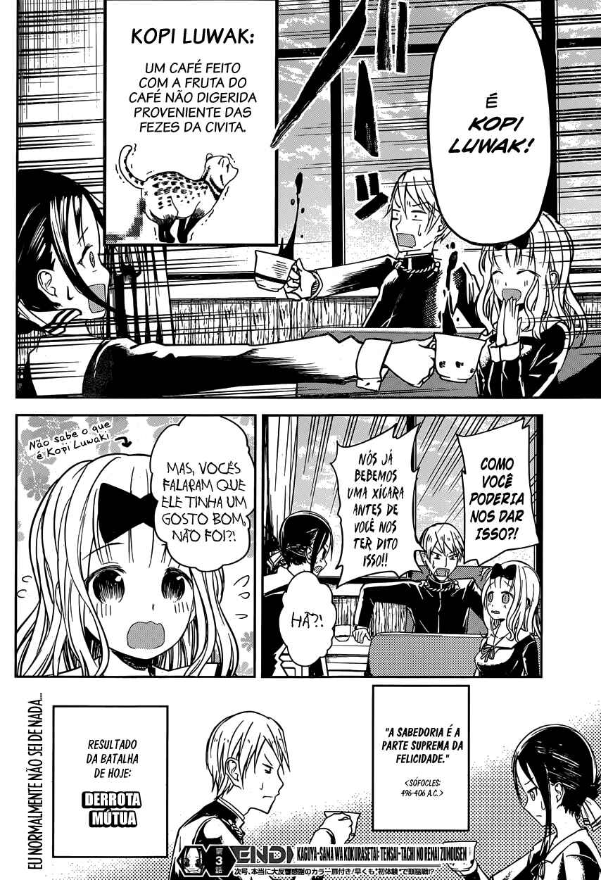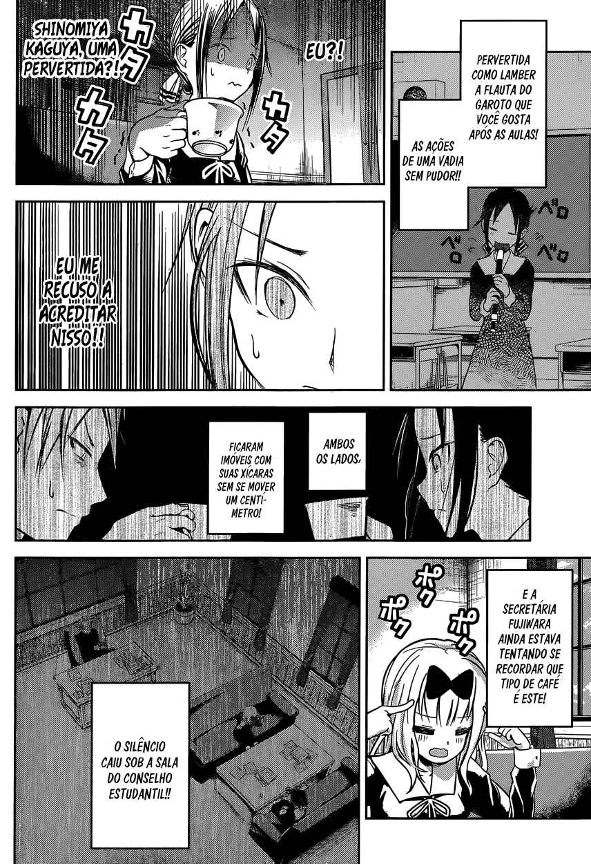 Capítulo 1 - Eu quero ser convidada para o cinemaCapítulo 2 - Eu quero jogar micoCapítulo 3 - Kaguya não sabe muitoCapítulo 4Capítulo 5 - Kaguya quer comerCapítulo 5.5 - ExtraCapítulo 6 - Shirogane Miyuki quer esconderCapítulo 7 - Quer ir em uma ViagemCapítulo 8 - Kaguya quer ser RespondidaCapítulo 9 - Kaguya quer CaminharCapítulo 10 - O Conselho Estudantil quer fazer uma BrincadeiraCapítulo 10.5Capítulo 11 - Kaguya quer TrocarCapítulo 12 - Kaguya quer ser IntrometidaCapítulo 13 - Kaguya quer ser indiretaCapítulo 14 - Shirogane miyuki não fez issoCapítulo 15 - Shirogami miyuki quer fugirCapítulo 16 - Kaguya quer fazer direitoCapítulo 17 - Kaguya quer adorarCapítulo 18 - O conselho estudantil quer conversarCapítulo 19 - Kaguya quer ser enviadaCapítulo 20 - Miyuki shirogane quer falarCapítulo 20.5 - ExtraCapítulo 21 - Kaguya quer segurarCapítulo 22 - Chika fujiwara quer ser comidaCapítulo 23 - Miyuki shirogane quer mostrarCapítulo 24 - Ishigami yu quer sobreviverCapítulo 25 - Kaguya quer ser notadaCapítulo 26 - Miyuki shirogane quer trabalharCapítulo 27 - Kaguya tenta resistirCapítulo 27.5 - ExtraCapítulo 28 - Fujiwara chika quer testarCapítulo 29 - Kaguya quer se juntarCapítulo 30 - Hayasaka ai quer defenderCapítulo 31 - Shirogane miyuki não pode perderCapítulo 32 - Kaguya quer ser odiadaCapítulo 33 - Kaguya quer oferecerCapítulo 34 - Fujiwara chika quer visitarCapítulo 35 - Em relação a shinomiya kaguya, parte 1Capítulo 36 - Miyuki shirogane quer cantarCapítulo 37 - Kaguya não vai cederCapítulo 38 - Kaguya quer perdoarCapítulo 39 - Kaguya quer ser chamadaCapítulo 40 - Shirogane miyuki quer viajarCapítulo 41 - Shirogane miyuki quer se encontrarCapítulo 42 - Hayasaka ai quer mergulharCapítulo 43 - Fujiwara chika quer comerCapítulo 44 - Eu não consigo ouvir os fogos,parte 1Capítulo 45 - Eu não consigo ouvir os fogos,parte 2Capítulo 46 - Kaguya não quer fugirCapítulo 47 - Kaguya quer escolherCapítulo 48 - O conselho estudantil não fezCapítulo 49 - Shirogane miyuki quer prepararCapítulo 50 - Nagisa kashiwagi não consegue assistirCapítulo 51 - Kaguya quer comemorarCapítulo 52 - Kaguya quer perguntarCapítulo 53 - Kaguya quer darCapítulo 54 - Chika fujiwara quer confirmarCapítulo 55 - Assim, yu ishigami fechou seus olhos, parte 1Capítulo 56 - Miyuki shirogane quer observarCapítulo 57 - Kaguya quer se casarCapítulo 58 - Ai hayasaka quer seduzirCapítulo 59 - O 67° conselho estudantilCapítulo 60Capítulo 61 - Kaguya quer uma confissãoCapítulo 62Capítulo 63 - Miyuki shirogane quer ser popularCapítulo 64 - Nagisa kashiwagi quer consolarCapítulo 65 - Miko lino quer corrigirCapítulo 66 - Kaguya quer eliminarCapítulo 67 - Miko lino não pode ser ridicularizadaCapítulo 68 - Eu quero fazer a miko lino sorrirCapítulo 69 - Kaguya não quer ser chamadaCapítulo 70 - Kaguya quer tirarCapítulo 71 - Kaguya quer produzirCapítulo 72 - Miko lino quer restringirCapítulo 73 - Shirogame miyuki quer lerCapítulo 74 - Kaguya♡AquárioCapítulo 75 - Kaguya quer coletarCapítulo 76 - Nagisa kashiwagi é irritanteCapítulo 77 - Chika fujiwara quer obter informaçãoCapítulo 78 - Kaguya não está assustadaCapítulo 79 - Kaguya quer ser examinadaCapítulo 80 - Assim, yu ishigami fechou seus olhos, parte 2Capítulo 81 - Kaguya quer tocarCapítulo 82 - Kaguya não vai recusarCapítulo 83 - Kai shirogane não consegue dizer issoCapítulo 84 - Miyuki shirogane quer dançarCapítulo 85 - Osaragui kobashi quer controlarCapítulo 86 - Shirogane pai quer perguntarCapítulo 87 - Festival de atletismo da shuuichiinCapítulo 88 - Assim, yu ishigami fechou seus olhos, parte 3Capítulo 89 - Miyuki shirogane e yu ishigamiCapítulo 90 - Kyoko ootomo não percebeCapítulo 91 - Chika Fujiwara Quer Fazer CrescerCapítulo 92 - Eu Quero Fazer a Kaguya CorarCapítulo 93 - Kaguya Quer Tirá-lo de LáCapítulo 94 - Kaguya Quer InterromperCapítulo 95 - Miko Iino Quer RelaxarCapítulo 96 - Kaguya Quer Alimentar EleCapítulo 97 - Nagisa Kashiwagi Quer Matá-loCapítulo 101 - O Conselho Estudantil Quer Ser Fotografado, Parte 2Capítulo 102 - Kaguya-sama Não PercebeCapítulo 103 - Miyuki Shirogane Quer MediarCapítulo 104 - O Desafio Impossível de Kaguya Shinomiya: “A Concha Koyasugai”, Parte 1Capítulo 105 - Yu Ishigami Quer ResponderCapítulo 106 - Chika Fujiwara Quer Uma Festa do PijamaCapítulo 107 - Chika Fujiwara Quer Manter o RitmoCapítulo 108 - Ai Hayasaka Quer Dizer AlgoCapítulo 109 - Maki Shijo Quer Pedir AjudaCapítulo 110 - Yu Ishigami Quer ConversarCapítulo 111 - O Conselho Estudantil Quer AvançarCapítulo 112 - Miyuki Shirogane Quer Receber Uma Confissão, Parte 1Capítulo 113 - Miyuki Shirogane Quer Receber Uma Confissão, Parte 2Capítulo 114 - Miyuki Shirogane Quer Receber Uma Confissão, Parte 3Capítulo 115 - Miko Iino Não Consegue Amar, Parte 1Capítulo 116 - Queremos Falar Sobre o Festival CulturalCapítulo 117 - Chika Fujiwara Quer LutarCapítulo 118 - Miyuki Shirogane Quer ExpandirCapítulo 119 - Kei Shirogane Quer se ExibirCapítulo 120 - Sobre Kaguya Shinomiya, Parte 2Capítulo 121 - Primeiro Ano, PrimaveraCapítulo 122 - Kaguya Quer se Confessar, Parte 1Capítulo 123 - Festival Cultural da KaguyaCapítulo 124 - Festival Cultural do Yu IshigamiCapítulo 125 - Kozue Makihara Quer BrincarCapítulo 126 - Chika Fujiwara Quer Acertar as ContasCapítulo 127 - Festival Cultural de Miyuki ShiroganeCapítulo 128 - Kaguya Quer Derrubá-losCapítulo 129 - Miyuki Shirogane Quer Receber Uma Confissão, Parte 4Capítulo 130 - Tsubame Koyasu Quer Rejeitá-loCapítulo 131 - Miyuki Shirogane Quer Receber Uma Confissão, Parte 5Capítulo 132 - Kaguya Quer Se Confessar, Parte 2Capítulo 133 - Kaguya Quer Se Confessar, Parte 3Capítulo 134 - Confissões Duplas, Parte 1Capítulo 135 - Confissões Duplas, Parte 2Capítulo 136 - Confissões Duplas, Parte 3Capítulo 137 - O Pós-festa da Shuchi’inCapítulo 138 - Kaguya Quer ExplicarCapítulo 139 -