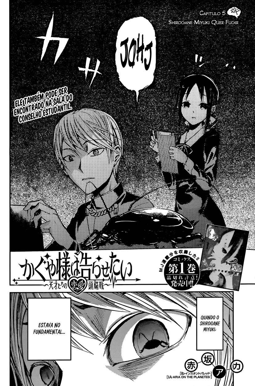 Capítulo 1 - Eu quero ser convidada para o cinemaCapítulo 2 - Eu quero jogar micoCapítulo 3 - Kaguya não sabe muitoCapítulo 4Capítulo 5 - Kaguya quer comerCapítulo 5.5 - ExtraCapítulo 6 - Shirogane Miyuki quer esconderCapítulo 7 - Quer ir em uma ViagemCapítulo 8 - Kaguya quer ser RespondidaCapítulo 9 - Kaguya quer CaminharCapítulo 10 - O Conselho Estudantil quer fazer uma BrincadeiraCapítulo 10.5Capítulo 11 - Kaguya quer TrocarCapítulo 12 - Kaguya quer ser IntrometidaCapítulo 13 - Kaguya quer ser indiretaCapítulo 14 - Shirogane miyuki não fez issoCapítulo 15 - Shirogami miyuki quer fugirCapítulo 16 - Kaguya quer fazer direitoCapítulo 17 - Kaguya quer adorarCapítulo 18 - O conselho estudantil quer conversarCapítulo 19 - Kaguya quer ser enviadaCapítulo 20 - Miyuki shirogane quer falarCapítulo 20.5 - ExtraCapítulo 21 - Kaguya quer segurarCapítulo 22 - Chika fujiwara quer ser comidaCapítulo 23 - Miyuki shirogane quer mostrarCapítulo 24 - Ishigami yu quer sobreviverCapítulo 25 - Kaguya quer ser notadaCapítulo 26 - Miyuki shirogane quer trabalharCapítulo 27 - Kaguya tenta resistirCapítulo 27.5 - ExtraCapítulo 28 - Fujiwara chika quer testarCapítulo 29 - Kaguya quer se juntarCapítulo 30 - Hayasaka ai quer defenderCapítulo 31 - Shirogane miyuki não pode perderCapítulo 32 - Kaguya quer ser odiadaCapítulo 33 - Kaguya quer oferecerCapítulo 34 - Fujiwara chika quer visitarCapítulo 35 - Em relação a shinomiya kaguya, parte 1Capítulo 36 - Miyuki shirogane quer cantarCapítulo 37 - Kaguya não vai cederCapítulo 38 - Kaguya quer perdoarCapítulo 39 - Kaguya quer ser chamadaCapítulo 40 - Shirogane miyuki quer viajarCapítulo 41 - Shirogane miyuki quer se encontrarCapítulo 42 - Hayasaka ai quer mergulharCapítulo 43 - Fujiwara chika quer comerCapítulo 44 - Eu não consigo ouvir os fogos,parte 1Capítulo 45 - Eu não consigo ouvir os fogos,parte 2Capítulo 46 - Kaguya não quer fugirCapítulo 47 - Kaguya quer escolherCapítulo 48 - O conselho estudantil não fezCapítulo 49 - Shirogane miyuki quer prepararCapítulo 50 - Nagisa kashiwagi não consegue assistirCapítulo 51 - Kaguya quer comemorarCapítulo 52 - Kaguya quer perguntarCapítulo 53 - Kaguya quer darCapítulo 54 - Chika fujiwara quer confirmarCapítulo 55 - Assim, yu ishigami fechou seus olhos, parte 1Capítulo 56 - Miyuki shirogane quer observarCapítulo 57 - Kaguya quer se casarCapítulo 58 - Ai hayasaka quer seduzirCapítulo 59 - O 67° conselho estudantilCapítulo 60Capítulo 61 - Kaguya quer uma confissãoCapítulo 62Capítulo 63 - Miyuki shirogane quer ser popularCapítulo 64 - Nagisa kashiwagi quer consolarCapítulo 65 - Miko lino quer corrigirCapítulo 66 - Kaguya quer eliminarCapítulo 67 - Miko lino não pode ser ridicularizadaCapítulo 68 - Eu quero fazer a miko lino sorrirCapítulo 69 - Kaguya não quer ser chamadaCapítulo 70 - Kaguya quer tirarCapítulo 71 - Kaguya quer produzirCapítulo 72 - Miko lino quer restringirCapítulo 73 - Shirogame miyuki quer lerCapítulo 74 - Kaguya♡AquárioCapítulo 75 - Kaguya quer coletarCapítulo 76 - Nagisa kashiwagi é irritanteCapítulo 77 - Chika fujiwara quer obter informaçãoCapítulo 78 - Kaguya não está assustadaCapítulo 79 - Kaguya quer ser examinadaCapítulo 80 - Assim, yu ishigami fechou seus olhos, parte 2Capítulo 81 - Kaguya quer tocarCapítulo 82 - Kaguya não vai recusarCapítulo 83 - Kai shirogane não consegue dizer issoCapítulo 84 - Miyuki shirogane quer dançarCapítulo 85 - Osaragui kobashi quer controlarCapítulo 86 - Shirogane pai quer perguntarCapítulo 87 - Festival de atletismo da shuuichiinCapítulo 88 - Assim, yu ishigami fechou seus olhos, parte 3Capítulo 89 - Miyuki shirogane e yu ishigamiCapítulo 90 - Kyoko ootomo não percebeCapítulo 91 - Chika Fujiwara Quer Fazer CrescerCapítulo 92 - Eu Quero Fazer a Kaguya CorarCapítulo 93 - Kaguya Quer Tirá-lo de LáCapítulo 94 - Kaguya Quer InterromperCapítulo 95 - Miko Iino Quer RelaxarCapítulo 96 - Kaguya Quer Alimentar EleCapítulo 97 - Nagisa Kashiwagi Quer Matá-loCapítulo 101 - O Conselho Estudantil Quer Ser Fotografado, Parte 2Capítulo 102 - Kaguya-sama Não PercebeCapítulo 103 - Miyuki Shirogane Quer MediarCapítulo 104 - O Desafio Impossível de Kaguya Shinomiya: “A Concha Koyasugai”, Parte 1Capítulo 105 - Yu Ishigami Quer ResponderCapítulo 106 - Chika Fujiwara Quer Uma Festa do PijamaCapítulo 107 - Chika Fujiwara Quer Manter o RitmoCapítulo 108 - Ai Hayasaka Quer Dizer AlgoCapítulo 109 - Maki Shijo Quer Pedir AjudaCapítulo 110 - Yu Ishigami Quer ConversarCapítulo 111 - O Conselho Estudantil Quer AvançarCapítulo 112 - Miyuki Shirogane Quer Receber Uma Confissão, Parte 1Capítulo 113 - Miyuki Shirogane Quer Receber Uma Confissão, Parte 2Capítulo 114 - Miyuki Shirogane Quer Receber Uma Confissão, Parte 3Capítulo 115 - Miko Iino Não Consegue Amar, Parte 1Capítulo 116 - Queremos Falar Sobre o Festival CulturalCapítulo 117 - Chika Fujiwara Quer LutarCapítulo 118 - Miyuki Shirogane Quer ExpandirCapítulo 119 - Kei Shirogane Quer se ExibirCapítulo 120 - Sobre Kaguya Shinomiya, Parte 2Capítulo 121 - Primeiro Ano, PrimaveraCapítulo 122 - Kaguya Quer se Confessar, Parte 1Capítulo 123 - Festival Cultural da KaguyaCapítulo 124 - Festival Cultural do Yu IshigamiCapítulo 125 - Kozue Makihara Quer BrincarCapítulo 126 - Chika Fujiwara Quer Acertar as ContasCapítulo 127 - Festival Cultural de Miyuki ShiroganeCapítulo 128 - Kaguya Quer Derrubá-losCapítulo 129 - Miyuki Shirogane Quer Receber Uma Confissão, Parte 4Capítulo 130 - Tsubame Koyasu Quer Rejeitá-loCapítulo 131 - Miyuki Shirogane Quer Receber Uma Confissão, Parte 5Capítulo 132 - Kaguya Quer Se Confessar, Parte 2Capítulo 133 - Kaguya Quer Se Confessar, Parte 3Capítulo 134 - Confissões Duplas, Parte 1Capítulo 135 - Confissões Duplas, Parte 2Capítulo 136 - Confissões Duplas, Parte 3Capítulo 137 - O Pós-festa da Shuchi’inCapítulo 138 - Kaguya Quer ExplicarCapítulo 139 -