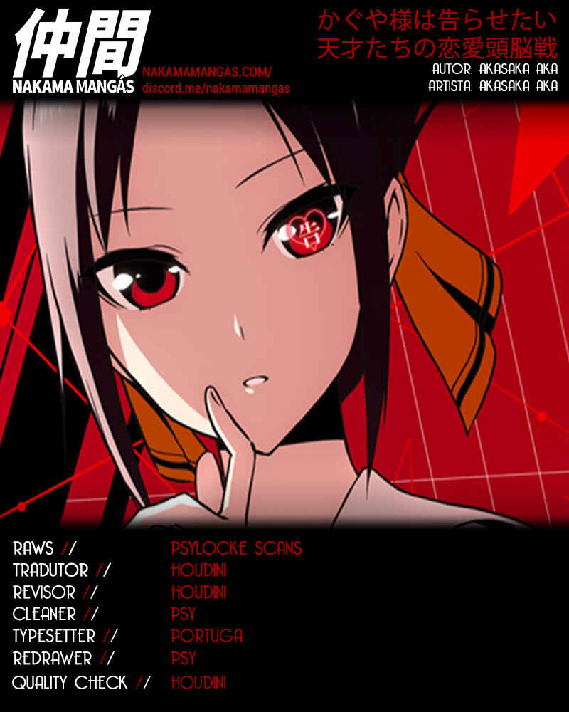 Capítulo 1 - Eu quero ser convidada para o cinemaCapítulo 2 - Eu quero jogar micoCapítulo 3 - Kaguya não sabe muitoCapítulo 4Capítulo 5 - Kaguya quer comerCapítulo 5.5 - ExtraCapítulo 6 - Shirogane Miyuki quer esconderCapítulo 7 - Quer ir em uma ViagemCapítulo 8 - Kaguya quer ser RespondidaCapítulo 9 - Kaguya quer CaminharCapítulo 10 - O Conselho Estudantil quer fazer uma BrincadeiraCapítulo 10.5Capítulo 11 - Kaguya quer TrocarCapítulo 12 - Kaguya quer ser IntrometidaCapítulo 13 - Kaguya quer ser indiretaCapítulo 14 - Shirogane miyuki não fez issoCapítulo 15 - Shirogami miyuki quer fugirCapítulo 16 - Kaguya quer fazer direitoCapítulo 17 - Kaguya quer adorarCapítulo 18 - O conselho estudantil quer conversarCapítulo 19 - Kaguya quer ser enviadaCapítulo 20 - Miyuki shirogane quer falarCapítulo 20.5 - ExtraCapítulo 21 - Kaguya quer segurarCapítulo 22 - Chika fujiwara quer ser comidaCapítulo 23 - Miyuki shirogane quer mostrarCapítulo 24 - Ishigami yu quer sobreviverCapítulo 25 - Kaguya quer ser notadaCapítulo 26 - Miyuki shirogane quer trabalharCapítulo 27 - Kaguya tenta resistirCapítulo 27.5 - ExtraCapítulo 28 - Fujiwara chika quer testarCapítulo 29 - Kaguya quer se juntarCapítulo 30 - Hayasaka ai quer defenderCapítulo 31 - Shirogane miyuki não pode perderCapítulo 32 - Kaguya quer ser odiadaCapítulo 33 - Kaguya quer oferecerCapítulo 34 - Fujiwara chika quer visitarCapítulo 35 - Em relação a shinomiya kaguya, parte 1Capítulo 36 - Miyuki shirogane quer cantarCapítulo 37 - Kaguya não vai cederCapítulo 38 - Kaguya quer perdoarCapítulo 39 - Kaguya quer ser chamadaCapítulo 40 - Shirogane miyuki quer viajarCapítulo 41 - Shirogane miyuki quer se encontrarCapítulo 42 - Hayasaka ai quer mergulharCapítulo 43 - Fujiwara chika quer comerCapítulo 44 - Eu não consigo ouvir os fogos,parte 1Capítulo 45 - Eu não consigo ouvir os fogos,parte 2Capítulo 46 - Kaguya não quer fugirCapítulo 47 - Kaguya quer escolherCapítulo 48 - O conselho estudantil não fezCapítulo 49 - Shirogane miyuki quer prepararCapítulo 50 - Nagisa kashiwagi não consegue assistirCapítulo 51 - Kaguya quer comemorarCapítulo 52 - Kaguya quer perguntarCapítulo 53 - Kaguya quer darCapítulo 54 - Chika fujiwara quer confirmarCapítulo 55 - Assim, yu ishigami fechou seus olhos, parte 1Capítulo 56 - Miyuki shirogane quer observarCapítulo 57 - Kaguya quer se casarCapítulo 58 - Ai hayasaka quer seduzirCapítulo 59 - O 67° conselho estudantilCapítulo 60Capítulo 61 - Kaguya quer uma confissãoCapítulo 62Capítulo 63 - Miyuki shirogane quer ser popularCapítulo 64 - Nagisa kashiwagi quer consolarCapítulo 65 - Miko lino quer corrigirCapítulo 66 - Kaguya quer eliminarCapítulo 67 - Miko lino não pode ser ridicularizadaCapítulo 68 - Eu quero fazer a miko lino sorrirCapítulo 69 - Kaguya não quer ser chamadaCapítulo 70 - Kaguya quer tirarCapítulo 71 - Kaguya quer produzirCapítulo 72 - Miko lino quer restringirCapítulo 73 - Shirogame miyuki quer lerCapítulo 74 - Kaguya♡AquárioCapítulo 75 - Kaguya quer coletarCapítulo 76 - Nagisa kashiwagi é irritanteCapítulo 77 - Chika fujiwara quer obter informaçãoCapítulo 78 - Kaguya não está assustadaCapítulo 79 - Kaguya quer ser examinadaCapítulo 80 - Assim, yu ishigami fechou seus olhos, parte 2Capítulo 81 - Kaguya quer tocarCapítulo 82 - Kaguya não vai recusarCapítulo 83 - Kai shirogane não consegue dizer issoCapítulo 84 - Miyuki shirogane quer dançarCapítulo 85 - Osaragui kobashi quer controlarCapítulo 86 - Shirogane pai quer perguntarCapítulo 87 - Festival de atletismo da shuuichiinCapítulo 88 - Assim, yu ishigami fechou seus olhos, parte 3Capítulo 89 - Miyuki shirogane e yu ishigamiCapítulo 90 - Kyoko ootomo não percebeCapítulo 91 - Chika Fujiwara Quer Fazer CrescerCapítulo 92 - Eu Quero Fazer a Kaguya CorarCapítulo 93 - Kaguya Quer Tirá-lo de LáCapítulo 94 - Kaguya Quer InterromperCapítulo 95 - Miko Iino Quer RelaxarCapítulo 96 - Kaguya Quer Alimentar EleCapítulo 97 - Nagisa Kashiwagi Quer Matá-loCapítulo 101 - O Conselho Estudantil Quer Ser Fotografado, Parte 2Capítulo 102 - Kaguya-sama Não PercebeCapítulo 103 - Miyuki Shirogane Quer MediarCapítulo 104 - O Desafio Impossível de Kaguya Shinomiya: “A Concha Koyasugai”, Parte 1Capítulo 105 - Yu Ishigami Quer ResponderCapítulo 106 - Chika Fujiwara Quer Uma Festa do PijamaCapítulo 107 - Chika Fujiwara Quer Manter o RitmoCapítulo 108 - Ai Hayasaka Quer Dizer AlgoCapítulo 109 - Maki Shijo Quer Pedir AjudaCapítulo 110 - Yu Ishigami Quer ConversarCapítulo 111 - O Conselho Estudantil Quer AvançarCapítulo 112 - Miyuki Shirogane Quer Receber Uma Confissão, Parte 1Capítulo 113 - Miyuki Shirogane Quer Receber Uma Confissão, Parte 2Capítulo 114 - Miyuki Shirogane Quer Receber Uma Confissão, Parte 3Capítulo 115 - Miko Iino Não Consegue Amar, Parte 1Capítulo 116 - Queremos Falar Sobre o Festival CulturalCapítulo 117 - Chika Fujiwara Quer LutarCapítulo 118 - Miyuki Shirogane Quer ExpandirCapítulo 119 - Kei Shirogane Quer se ExibirCapítulo 120 - Sobre Kaguya Shinomiya, Parte 2Capítulo 121 - Primeiro Ano, PrimaveraCapítulo 122 - Kaguya Quer se Confessar, Parte 1Capítulo 123 - Festival Cultural da KaguyaCapítulo 124 - Festival Cultural do Yu IshigamiCapítulo 125 - Kozue Makihara Quer BrincarCapítulo 126 - Chika Fujiwara Quer Acertar as ContasCapítulo 127 - Festival Cultural de Miyuki ShiroganeCapítulo 128 - Kaguya Quer Derrubá-losCapítulo 129 - Miyuki Shirogane Quer Receber Uma Confissão, Parte 4Capítulo 130 - Tsubame Koyasu Quer Rejeitá-loCapítulo 131 - Miyuki Shirogane Quer Receber Uma Confissão, Parte 5Capítulo 132 - Kaguya Quer Se Confessar, Parte 2Capítulo 133 - Kaguya Quer Se Confessar, Parte 3Capítulo 134 - Confissões Duplas, Parte 1Capítulo 135 - Confissões Duplas, Parte 2Capítulo 136 - Confissões Duplas, Parte 3Capítulo 137 - O Pós-festa da Shuchi’inCapítulo 138 - Kaguya Quer ExplicarCapítulo 139 -