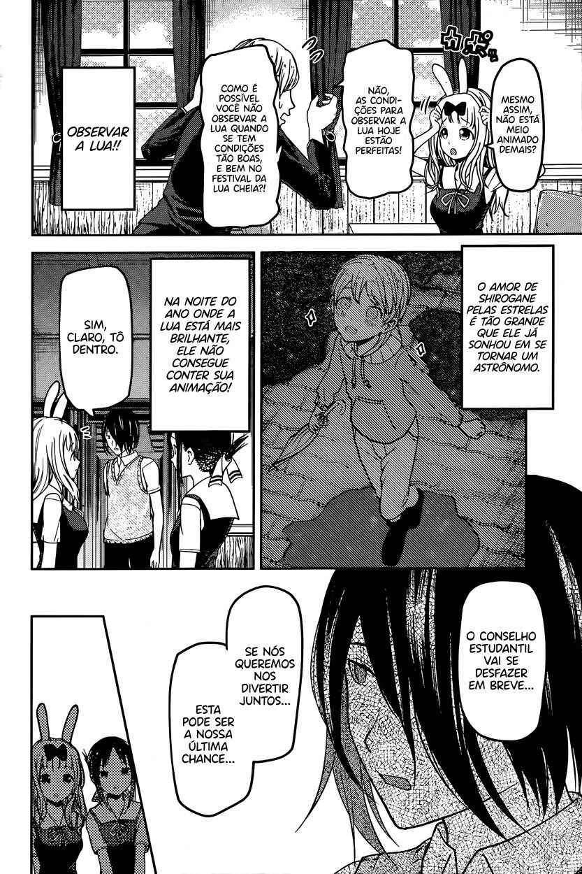 Capítulo 1 - Eu quero ser convidada para o cinemaCapítulo 2 - Eu quero jogar micoCapítulo 3 - Kaguya não sabe muitoCapítulo 4Capítulo 5 - Kaguya quer comerCapítulo 5.5 - ExtraCapítulo 6 - Shirogane Miyuki quer esconderCapítulo 7 - Quer ir em uma ViagemCapítulo 8 - Kaguya quer ser RespondidaCapítulo 9 - Kaguya quer CaminharCapítulo 10 - O Conselho Estudantil quer fazer uma BrincadeiraCapítulo 10.5Capítulo 11 - Kaguya quer TrocarCapítulo 12 - Kaguya quer ser IntrometidaCapítulo 13 - Kaguya quer ser indiretaCapítulo 14 - Shirogane miyuki não fez issoCapítulo 15 - Shirogami miyuki quer fugirCapítulo 16 - Kaguya quer fazer direitoCapítulo 17 - Kaguya quer adorarCapítulo 18 - O conselho estudantil quer conversarCapítulo 19 - Kaguya quer ser enviadaCapítulo 20 - Miyuki shirogane quer falarCapítulo 20.5 - ExtraCapítulo 21 - Kaguya quer segurarCapítulo 22 - Chika fujiwara quer ser comidaCapítulo 23 - Miyuki shirogane quer mostrarCapítulo 24 - Ishigami yu quer sobreviverCapítulo 25 - Kaguya quer ser notadaCapítulo 26 - Miyuki shirogane quer trabalharCapítulo 27 - Kaguya tenta resistirCapítulo 27.5 - ExtraCapítulo 28 - Fujiwara chika quer testarCapítulo 29 - Kaguya quer se juntarCapítulo 30 - Hayasaka ai quer defenderCapítulo 31 - Shirogane miyuki não pode perderCapítulo 32 - Kaguya quer ser odiadaCapítulo 33 - Kaguya quer oferecerCapítulo 34 - Fujiwara chika quer visitarCapítulo 35 - Em relação a shinomiya kaguya, parte 1Capítulo 36 - Miyuki shirogane quer cantarCapítulo 37 - Kaguya não vai cederCapítulo 38 - Kaguya quer perdoarCapítulo 39 - Kaguya quer ser chamadaCapítulo 40 - Shirogane miyuki quer viajarCapítulo 41 - Shirogane miyuki quer se encontrarCapítulo 42 - Hayasaka ai quer mergulharCapítulo 43 - Fujiwara chika quer comerCapítulo 44 - Eu não consigo ouvir os fogos,parte 1Capítulo 45 - Eu não consigo ouvir os fogos,parte 2Capítulo 46 - Kaguya não quer fugirCapítulo 47 - Kaguya quer escolherCapítulo 48 - O conselho estudantil não fezCapítulo 49 - Shirogane miyuki quer prepararCapítulo 50 - Nagisa kashiwagi não consegue assistirCapítulo 51 - Kaguya quer comemorarCapítulo 52 - Kaguya quer perguntarCapítulo 53 - Kaguya quer darCapítulo 54 - Chika fujiwara quer confirmarCapítulo 55 - Assim, yu ishigami fechou seus olhos, parte 1Capítulo 56 - Miyuki shirogane quer observarCapítulo 57 - Kaguya quer se casarCapítulo 58 - Ai hayasaka quer seduzirCapítulo 59 - O 67° conselho estudantilCapítulo 60Capítulo 61 - Kaguya quer uma confissãoCapítulo 62Capítulo 63 - Miyuki shirogane quer ser popularCapítulo 64 - Nagisa kashiwagi quer consolarCapítulo 65 - Miko lino quer corrigirCapítulo 66 - Kaguya quer eliminarCapítulo 67 - Miko lino não pode ser ridicularizadaCapítulo 68 - Eu quero fazer a miko lino sorrirCapítulo 69 - Kaguya não quer ser chamadaCapítulo 70 - Kaguya quer tirarCapítulo 71 - Kaguya quer produzirCapítulo 72 - Miko lino quer restringirCapítulo 73 - Shirogame miyuki quer lerCapítulo 74 - Kaguya♡AquárioCapítulo 75 - Kaguya quer coletarCapítulo 76 - Nagisa kashiwagi é irritanteCapítulo 77 - Chika fujiwara quer obter informaçãoCapítulo 78 - Kaguya não está assustadaCapítulo 79 - Kaguya quer ser examinadaCapítulo 80 - Assim, yu ishigami fechou seus olhos, parte 2Capítulo 81 - Kaguya quer tocarCapítulo 82 - Kaguya não vai recusarCapítulo 83 - Kai shirogane não consegue dizer issoCapítulo 84 - Miyuki shirogane quer dançarCapítulo 85 - Osaragui kobashi quer controlarCapítulo 86 - Shirogane pai quer perguntarCapítulo 87 - Festival de atletismo da shuuichiinCapítulo 88 - Assim, yu ishigami fechou seus olhos, parte 3Capítulo 89 - Miyuki shirogane e yu ishigamiCapítulo 90 - Kyoko ootomo não percebeCapítulo 91 - Chika Fujiwara Quer Fazer CrescerCapítulo 92 - Eu Quero Fazer a Kaguya CorarCapítulo 93 - Kaguya Quer Tirá-lo de LáCapítulo 94 - Kaguya Quer InterromperCapítulo 95 - Miko Iino Quer RelaxarCapítulo 96 - Kaguya Quer Alimentar EleCapítulo 97 - Nagisa Kashiwagi Quer Matá-loCapítulo 101 - O Conselho Estudantil Quer Ser Fotografado, Parte 2Capítulo 102 - Kaguya-sama Não PercebeCapítulo 103 - Miyuki Shirogane Quer MediarCapítulo 104 - O Desafio Impossível de Kaguya Shinomiya: “A Concha Koyasugai”, Parte 1Capítulo 105 - Yu Ishigami Quer ResponderCapítulo 106 - Chika Fujiwara Quer Uma Festa do PijamaCapítulo 107 - Chika Fujiwara Quer Manter o RitmoCapítulo 108 - Ai Hayasaka Quer Dizer AlgoCapítulo 109 - Maki Shijo Quer Pedir AjudaCapítulo 110 - Yu Ishigami Quer ConversarCapítulo 111 - O Conselho Estudantil Quer AvançarCapítulo 112 - Miyuki Shirogane Quer Receber Uma Confissão, Parte 1Capítulo 113 - Miyuki Shirogane Quer Receber Uma Confissão, Parte 2Capítulo 114 - Miyuki Shirogane Quer Receber Uma Confissão, Parte 3Capítulo 115 - Miko Iino Não Consegue Amar, Parte 1Capítulo 116 - Queremos Falar Sobre o Festival CulturalCapítulo 117 - Chika Fujiwara Quer LutarCapítulo 118 - Miyuki Shirogane Quer ExpandirCapítulo 119 - Kei Shirogane Quer se ExibirCapítulo 120 - Sobre Kaguya Shinomiya, Parte 2Capítulo 121 - Primeiro Ano, PrimaveraCapítulo 122 - Kaguya Quer se Confessar, Parte 1Capítulo 123 - Festival Cultural da KaguyaCapítulo 124 - Festival Cultural do Yu IshigamiCapítulo 125 - Kozue Makihara Quer BrincarCapítulo 126 - Chika Fujiwara Quer Acertar as ContasCapítulo 127 - Festival Cultural de Miyuki ShiroganeCapítulo 128 - Kaguya Quer Derrubá-losCapítulo 129 - Miyuki Shirogane Quer Receber Uma Confissão, Parte 4Capítulo 130 - Tsubame Koyasu Quer Rejeitá-loCapítulo 131 - Miyuki Shirogane Quer Receber Uma Confissão, Parte 5Capítulo 132 - Kaguya Quer Se Confessar, Parte 2Capítulo 133 - Kaguya Quer Se Confessar, Parte 3Capítulo 134 - Confissões Duplas, Parte 1Capítulo 135 - Confissões Duplas, Parte 2Capítulo 136 - Confissões Duplas, Parte 3Capítulo 137 - O Pós-festa da Shuchi’inCapítulo 138 - Kaguya Quer ExplicarCapítulo 139 -