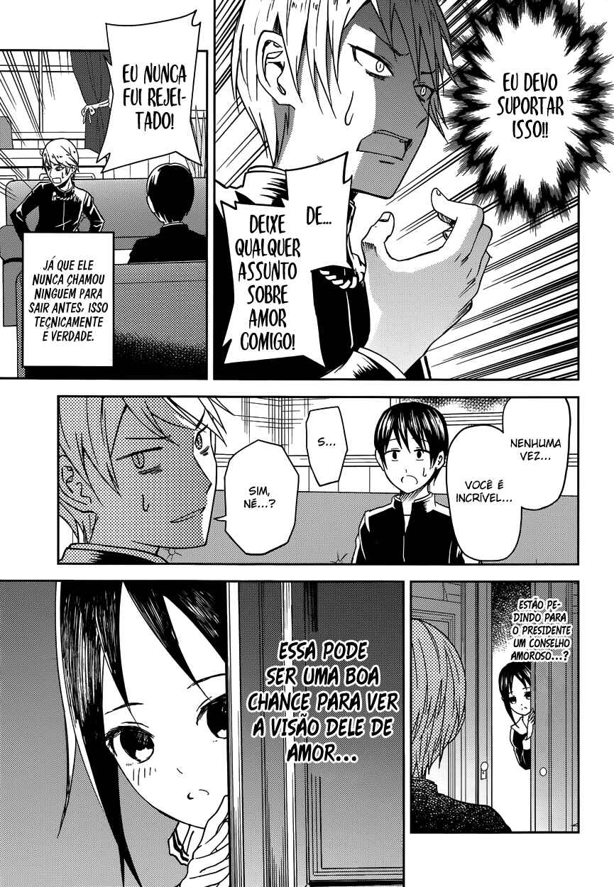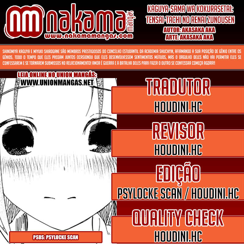 Capítulo 1 - Eu quero ser convidada para o cinemaCapítulo 2 - Eu quero jogar micoCapítulo 3 - Kaguya não sabe muitoCapítulo 4Capítulo 5 - Kaguya quer comerCapítulo 5.5 - ExtraCapítulo 6 - Shirogane Miyuki quer esconderCapítulo 7 - Quer ir em uma ViagemCapítulo 8 - Kaguya quer ser RespondidaCapítulo 9 - Kaguya quer CaminharCapítulo 10 - O Conselho Estudantil quer fazer uma BrincadeiraCapítulo 10.5Capítulo 11 - Kaguya quer TrocarCapítulo 12 - Kaguya quer ser IntrometidaCapítulo 13 - Kaguya quer ser indiretaCapítulo 14 - Shirogane miyuki não fez issoCapítulo 15 - Shirogami miyuki quer fugirCapítulo 16 - Kaguya quer fazer direitoCapítulo 17 - Kaguya quer adorarCapítulo 18 - O conselho estudantil quer conversarCapítulo 19 - Kaguya quer ser enviadaCapítulo 20 - Miyuki shirogane quer falarCapítulo 20.5 - ExtraCapítulo 21 - Kaguya quer segurarCapítulo 22 - Chika fujiwara quer ser comidaCapítulo 23 - Miyuki shirogane quer mostrarCapítulo 24 - Ishigami yu quer sobreviverCapítulo 25 - Kaguya quer ser notadaCapítulo 26 - Miyuki shirogane quer trabalharCapítulo 27 - Kaguya tenta resistirCapítulo 27.5 - ExtraCapítulo 28 - Fujiwara chika quer testarCapítulo 29 - Kaguya quer se juntarCapítulo 30 - Hayasaka ai quer defenderCapítulo 31 - Shirogane miyuki não pode perderCapítulo 32 - Kaguya quer ser odiadaCapítulo 33 - Kaguya quer oferecerCapítulo 34 - Fujiwara chika quer visitarCapítulo 35 - Em relação a shinomiya kaguya, parte 1Capítulo 36 - Miyuki shirogane quer cantarCapítulo 37 - Kaguya não vai cederCapítulo 38 - Kaguya quer perdoarCapítulo 39 - Kaguya quer ser chamadaCapítulo 40 - Shirogane miyuki quer viajarCapítulo 41 - Shirogane miyuki quer se encontrarCapítulo 42 - Hayasaka ai quer mergulharCapítulo 43 - Fujiwara chika quer comerCapítulo 44 - Eu não consigo ouvir os fogos,parte 1Capítulo 45 - Eu não consigo ouvir os fogos,parte 2Capítulo 46 - Kaguya não quer fugirCapítulo 47 - Kaguya quer escolherCapítulo 48 - O conselho estudantil não fezCapítulo 49 - Shirogane miyuki quer prepararCapítulo 50 - Nagisa kashiwagi não consegue assistirCapítulo 51 - Kaguya quer comemorarCapítulo 52 - Kaguya quer perguntarCapítulo 53 - Kaguya quer darCapítulo 54 - Chika fujiwara quer confirmarCapítulo 55 - Assim, yu ishigami fechou seus olhos, parte 1Capítulo 56 - Miyuki shirogane quer observarCapítulo 57 - Kaguya quer se casarCapítulo 58 - Ai hayasaka quer seduzirCapítulo 59 - O 67° conselho estudantilCapítulo 60Capítulo 61 - Kaguya quer uma confissãoCapítulo 62Capítulo 63 - Miyuki shirogane quer ser popularCapítulo 64 - Nagisa kashiwagi quer consolarCapítulo 65 - Miko lino quer corrigirCapítulo 66 - Kaguya quer eliminarCapítulo 67 - Miko lino não pode ser ridicularizadaCapítulo 68 - Eu quero fazer a miko lino sorrirCapítulo 69 - Kaguya não quer ser chamadaCapítulo 70 - Kaguya quer tirarCapítulo 71 - Kaguya quer produzirCapítulo 72 - Miko lino quer restringirCapítulo 73 - Shirogame miyuki quer lerCapítulo 74 - Kaguya♡AquárioCapítulo 75 - Kaguya quer coletarCapítulo 76 - Nagisa kashiwagi é irritanteCapítulo 77 - Chika fujiwara quer obter informaçãoCapítulo 78 - Kaguya não está assustadaCapítulo 79 - Kaguya quer ser examinadaCapítulo 80 - Assim, yu ishigami fechou seus olhos, parte 2Capítulo 81 - Kaguya quer tocarCapítulo 82 - Kaguya não vai recusarCapítulo 83 - Kai shirogane não consegue dizer issoCapítulo 84 - Miyuki shirogane quer dançarCapítulo 85 - Osaragui kobashi quer controlarCapítulo 86 - Shirogane pai quer perguntarCapítulo 87 - Festival de atletismo da shuuichiinCapítulo 88 - Assim, yu ishigami fechou seus olhos, parte 3Capítulo 89 - Miyuki shirogane e yu ishigamiCapítulo 90 - Kyoko ootomo não percebeCapítulo 91 - Chika Fujiwara Quer Fazer CrescerCapítulo 92 - Eu Quero Fazer a Kaguya CorarCapítulo 93 - Kaguya Quer Tirá-lo de LáCapítulo 94 - Kaguya Quer InterromperCapítulo 95 - Miko Iino Quer RelaxarCapítulo 96 - Kaguya Quer Alimentar EleCapítulo 97 - Nagisa Kashiwagi Quer Matá-loCapítulo 101 - O Conselho Estudantil Quer Ser Fotografado, Parte 2Capítulo 102 - Kaguya-sama Não PercebeCapítulo 103 - Miyuki Shirogane Quer MediarCapítulo 104 - O Desafio Impossível de Kaguya Shinomiya: “A Concha Koyasugai”, Parte 1Capítulo 105 - Yu Ishigami Quer ResponderCapítulo 106 - Chika Fujiwara Quer Uma Festa do PijamaCapítulo 107 - Chika Fujiwara Quer Manter o RitmoCapítulo 108 - Ai Hayasaka Quer Dizer AlgoCapítulo 109 - Maki Shijo Quer Pedir AjudaCapítulo 110 - Yu Ishigami Quer ConversarCapítulo 111 - O Conselho Estudantil Quer AvançarCapítulo 112 - Miyuki Shirogane Quer Receber Uma Confissão, Parte 1Capítulo 113 - Miyuki Shirogane Quer Receber Uma Confissão, Parte 2Capítulo 114 - Miyuki Shirogane Quer Receber Uma Confissão, Parte 3Capítulo 115 - Miko Iino Não Consegue Amar, Parte 1Capítulo 116 - Queremos Falar Sobre o Festival CulturalCapítulo 117 - Chika Fujiwara Quer LutarCapítulo 118 - Miyuki Shirogane Quer ExpandirCapítulo 119 - Kei Shirogane Quer se ExibirCapítulo 120 - Sobre Kaguya Shinomiya, Parte 2Capítulo 121 - Primeiro Ano, PrimaveraCapítulo 122 - Kaguya Quer se Confessar, Parte 1Capítulo 123 - Festival Cultural da KaguyaCapítulo 124 - Festival Cultural do Yu IshigamiCapítulo 125 - Kozue Makihara Quer BrincarCapítulo 126 - Chika Fujiwara Quer Acertar as ContasCapítulo 127 - Festival Cultural de Miyuki ShiroganeCapítulo 128 - Kaguya Quer Derrubá-losCapítulo 129 - Miyuki Shirogane Quer Receber Uma Confissão, Parte 4Capítulo 130 - Tsubame Koyasu Quer Rejeitá-loCapítulo 131 - Miyuki Shirogane Quer Receber Uma Confissão, Parte 5Capítulo 132 - Kaguya Quer Se Confessar, Parte 2Capítulo 133 - Kaguya Quer Se Confessar, Parte 3Capítulo 134 - Confissões Duplas, Parte 1Capítulo 135 - Confissões Duplas, Parte 2Capítulo 136 - Confissões Duplas, Parte 3Capítulo 137 - O Pós-festa da Shuchi’inCapítulo 138 - Kaguya Quer ExplicarCapítulo 139 -