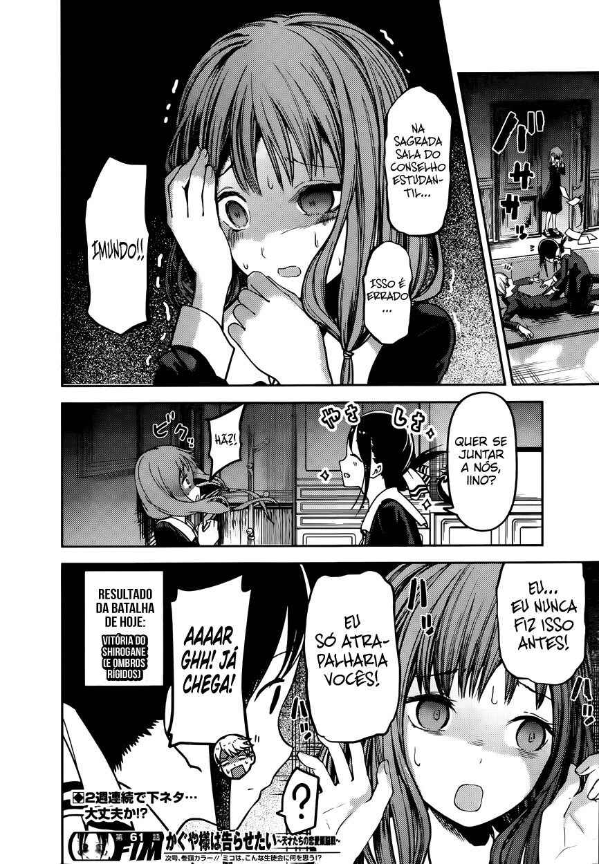 Capítulo 1 - Eu quero ser convidada para o cinemaCapítulo 2 - Eu quero jogar micoCapítulo 3 - Kaguya não sabe muitoCapítulo 4Capítulo 5 - Kaguya quer comerCapítulo 5.5 - ExtraCapítulo 6 - Shirogane Miyuki quer esconderCapítulo 7 - Quer ir em uma ViagemCapítulo 8 - Kaguya quer ser RespondidaCapítulo 9 - Kaguya quer CaminharCapítulo 10 - O Conselho Estudantil quer fazer uma BrincadeiraCapítulo 10.5Capítulo 11 - Kaguya quer TrocarCapítulo 12 - Kaguya quer ser IntrometidaCapítulo 13 - Kaguya quer ser indiretaCapítulo 14 - Shirogane miyuki não fez issoCapítulo 15 - Shirogami miyuki quer fugirCapítulo 16 - Kaguya quer fazer direitoCapítulo 17 - Kaguya quer adorarCapítulo 18 - O conselho estudantil quer conversarCapítulo 19 - Kaguya quer ser enviadaCapítulo 20 - Miyuki shirogane quer falarCapítulo 20.5 - ExtraCapítulo 21 - Kaguya quer segurarCapítulo 22 - Chika fujiwara quer ser comidaCapítulo 23 - Miyuki shirogane quer mostrarCapítulo 24 - Ishigami yu quer sobreviverCapítulo 25 - Kaguya quer ser notadaCapítulo 26 - Miyuki shirogane quer trabalharCapítulo 27 - Kaguya tenta resistirCapítulo 27.5 - ExtraCapítulo 28 - Fujiwara chika quer testarCapítulo 29 - Kaguya quer se juntarCapítulo 30 - Hayasaka ai quer defenderCapítulo 31 - Shirogane miyuki não pode perderCapítulo 32 - Kaguya quer ser odiadaCapítulo 33 - Kaguya quer oferecerCapítulo 34 - Fujiwara chika quer visitarCapítulo 35 - Em relação a shinomiya kaguya, parte 1Capítulo 36 - Miyuki shirogane quer cantarCapítulo 37 - Kaguya não vai cederCapítulo 38 - Kaguya quer perdoarCapítulo 39 - Kaguya quer ser chamadaCapítulo 40 - Shirogane miyuki quer viajarCapítulo 41 - Shirogane miyuki quer se encontrarCapítulo 42 - Hayasaka ai quer mergulharCapítulo 43 - Fujiwara chika quer comerCapítulo 44 - Eu não consigo ouvir os fogos,parte 1Capítulo 45 - Eu não consigo ouvir os fogos,parte 2Capítulo 46 - Kaguya não quer fugirCapítulo 47 - Kaguya quer escolherCapítulo 48 - O conselho estudantil não fezCapítulo 49 - Shirogane miyuki quer prepararCapítulo 50 - Nagisa kashiwagi não consegue assistirCapítulo 51 - Kaguya quer comemorarCapítulo 52 - Kaguya quer perguntarCapítulo 53 - Kaguya quer darCapítulo 54 - Chika fujiwara quer confirmarCapítulo 55 - Assim, yu ishigami fechou seus olhos, parte 1Capítulo 56 - Miyuki shirogane quer observarCapítulo 57 - Kaguya quer se casarCapítulo 58 - Ai hayasaka quer seduzirCapítulo 59 - O 67° conselho estudantilCapítulo 60Capítulo 61 - Kaguya quer uma confissãoCapítulo 62Capítulo 63 - Miyuki shirogane quer ser popularCapítulo 64 - Nagisa kashiwagi quer consolarCapítulo 65 - Miko lino quer corrigirCapítulo 66 - Kaguya quer eliminarCapítulo 67 - Miko lino não pode ser ridicularizadaCapítulo 68 - Eu quero fazer a miko lino sorrirCapítulo 69 - Kaguya não quer ser chamadaCapítulo 70 - Kaguya quer tirarCapítulo 71 - Kaguya quer produzirCapítulo 72 - Miko lino quer restringirCapítulo 73 - Shirogame miyuki quer lerCapítulo 74 - Kaguya♡AquárioCapítulo 75 - Kaguya quer coletarCapítulo 76 - Nagisa kashiwagi é irritanteCapítulo 77 - Chika fujiwara quer obter informaçãoCapítulo 78 - Kaguya não está assustadaCapítulo 79 - Kaguya quer ser examinadaCapítulo 80 - Assim, yu ishigami fechou seus olhos, parte 2Capítulo 81 - Kaguya quer tocarCapítulo 82 - Kaguya não vai recusarCapítulo 83 - Kai shirogane não consegue dizer issoCapítulo 84 - Miyuki shirogane quer dançarCapítulo 85 - Osaragui kobashi quer controlarCapítulo 86 - Shirogane pai quer perguntarCapítulo 87 - Festival de atletismo da shuuichiinCapítulo 88 - Assim, yu ishigami fechou seus olhos, parte 3Capítulo 89 - Miyuki shirogane e yu ishigamiCapítulo 90 - Kyoko ootomo não percebeCapítulo 91 - Chika Fujiwara Quer Fazer CrescerCapítulo 92 - Eu Quero Fazer a Kaguya CorarCapítulo 93 - Kaguya Quer Tirá-lo de LáCapítulo 94 - Kaguya Quer InterromperCapítulo 95 - Miko Iino Quer RelaxarCapítulo 96 - Kaguya Quer Alimentar EleCapítulo 97 - Nagisa Kashiwagi Quer Matá-loCapítulo 101 - O Conselho Estudantil Quer Ser Fotografado, Parte 2Capítulo 102 - Kaguya-sama Não PercebeCapítulo 103 - Miyuki Shirogane Quer MediarCapítulo 104 - O Desafio Impossível de Kaguya Shinomiya: “A Concha Koyasugai”, Parte 1Capítulo 105 - Yu Ishigami Quer ResponderCapítulo 106 - Chika Fujiwara Quer Uma Festa do PijamaCapítulo 107 - Chika Fujiwara Quer Manter o RitmoCapítulo 108 - Ai Hayasaka Quer Dizer AlgoCapítulo 109 - Maki Shijo Quer Pedir AjudaCapítulo 110 - Yu Ishigami Quer ConversarCapítulo 111 - O Conselho Estudantil Quer AvançarCapítulo 112 - Miyuki Shirogane Quer Receber Uma Confissão, Parte 1Capítulo 113 - Miyuki Shirogane Quer Receber Uma Confissão, Parte 2Capítulo 114 - Miyuki Shirogane Quer Receber Uma Confissão, Parte 3Capítulo 115 - Miko Iino Não Consegue Amar, Parte 1Capítulo 116 - Queremos Falar Sobre o Festival CulturalCapítulo 117 - Chika Fujiwara Quer LutarCapítulo 118 - Miyuki Shirogane Quer ExpandirCapítulo 119 - Kei Shirogane Quer se ExibirCapítulo 120 - Sobre Kaguya Shinomiya, Parte 2Capítulo 121 - Primeiro Ano, PrimaveraCapítulo 122 - Kaguya Quer se Confessar, Parte 1Capítulo 123 - Festival Cultural da KaguyaCapítulo 124 - Festival Cultural do Yu IshigamiCapítulo 125 - Kozue Makihara Quer BrincarCapítulo 126 - Chika Fujiwara Quer Acertar as ContasCapítulo 127 - Festival Cultural de Miyuki ShiroganeCapítulo 128 - Kaguya Quer Derrubá-losCapítulo 129 - Miyuki Shirogane Quer Receber Uma Confissão, Parte 4Capítulo 130 - Tsubame Koyasu Quer Rejeitá-loCapítulo 131 - Miyuki Shirogane Quer Receber Uma Confissão, Parte 5Capítulo 132 - Kaguya Quer Se Confessar, Parte 2Capítulo 133 - Kaguya Quer Se Confessar, Parte 3Capítulo 134 - Confissões Duplas, Parte 1Capítulo 135 - Confissões Duplas, Parte 2Capítulo 136 - Confissões Duplas, Parte 3Capítulo 137 - O Pós-festa da Shuchi’inCapítulo 138 - Kaguya Quer ExplicarCapítulo 139 -