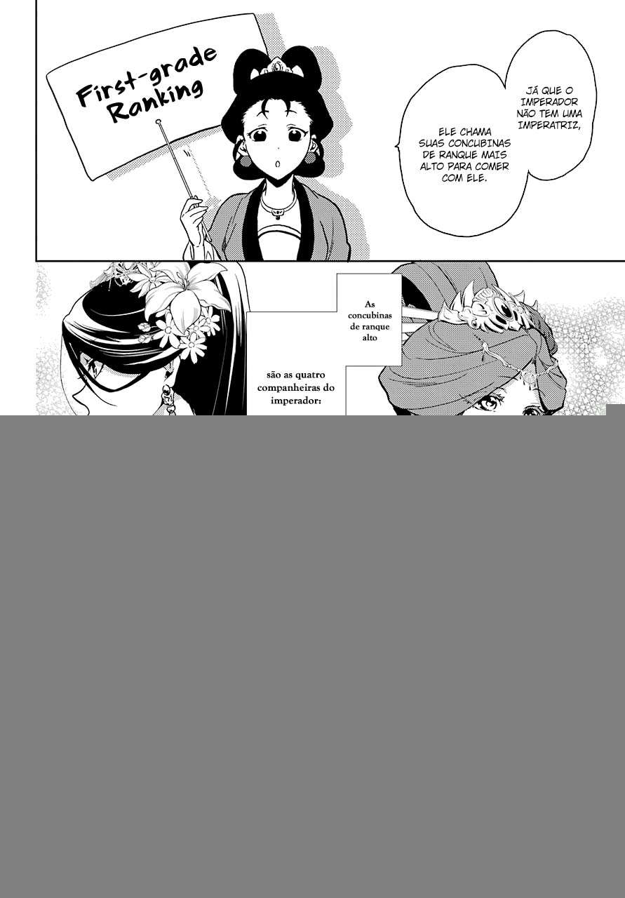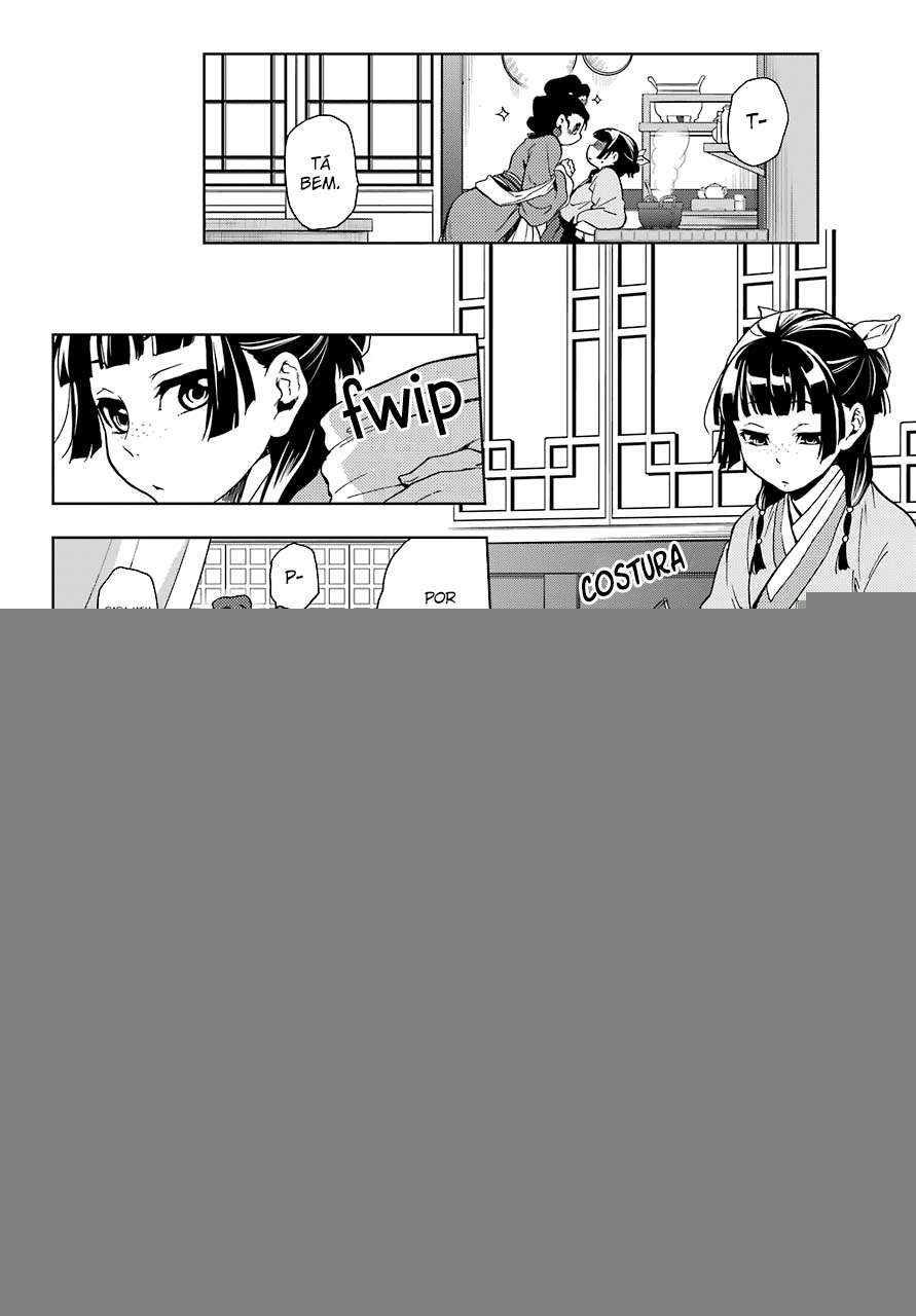 Capítulo 1 - A Maldição do HarémCapítulo 2 - Cientista LoucaCapítulo 3 - A Ninfa da Corte ImperialCapítulo 4 - O Fantasma do LuarCapítulo 5 - Sendo a EnfermeiraCapítulo 6 - Festa do Jardim (Parte 1)Capítulo 7 - Festa do Jardim (Parte 2)Capítulo 8 - Festa do Jardim (Parte 3)Capítulo 9 - A perspicácia de MaomaoCapítulo 10 - O significado da presilhaCapítulo 11 - De volta ao larCapítulo 12 - Canudo de PalhaCapítulo 13 - DesentendimentoCapítulo 14 - SaquêCapítulo 15 - Um pedido para MaomaoCapítulo 16 - Mel parte 1Capítulo 17 - Mel (parte 2)Capítulo 18 - A companheira AaduoCapítulo 19 - EncruzilhadaCapítulo 20 - O Eunuco e a CortesãCapítulo 21 - Cercada por irmãs...Capítulo 22 - Os Deveres do Pátio ExteriorCapítulo 23 - Lições do Pátio InteriorCapítulo 24 - Um CachimboCapítulo 25 - NamasuCapítulo 26 - O PrincipalCapítulo 27 - CosméticosCapítulo 28.1 - Um Passeio pela Cidade - ICapítulo 28.2 - Um Passeio pela Cidade - IICapítulo 29.1 - Sífilis - ICapítulo 29.2 - Sífilis - IICapítulo 30 - Sui ReiCapítulo 31 - Coincidência ou Inevitável?Capítulo 32 - O Mestre de Rituais MédiosCapítulo 33 - A Trombeta do DiaboCapítulo 34 - Gao ShunCapítulo 35.1 - De Volta ao Palácio Interior - ICapítulo 35.2 - De Volta ao Palácio Interior - IICapítulo 36.1 - Rosas e Esmaltes - ICapítulo 36.2 - Rosas e Esmaltes - IICapítulo 36.3 - Rosas e Esmaltes - IIICapítulo 37 - Bálsamo e Oxalis - ICapítulo 38 - Bálsamo e Oxalis - IICapítulo 39 - Bálsamo e Oxalis - IIICapítulo 40 - DespacheCapítulo 41 - O LivroCapítulo 42.1 - Gato (parte 1)Capítulo 42.2 - Gato (parte 2)Capítulo 43.1 - Caravana (parte 1)Capítulo 43.2 - Caravana (parte 2)Capítulo 44.1 - Cordyceps (parte 1)Capítulo 44.2 - Cordyceps humano (parte 2)Capítulo 45.1 - Cordyceps (epílogo)Capítulo 45.2 - Cordyceps (epílogo, parte 2)Capítulo 46 - EspelhoCapítulo 47 - Fada da lua (parte 1)Capítulo 48.1 - Fada da lua (parte 2)Capítulo 48.2 - Fada da lua (parte 3)Capítulo 49 - A clínicaCapítulo 50 - Na terceira vez dá certo (parte 1)Capítulo 51 - Na terceira vez dá certo (parte 2)Capítulo 52.1 - Na terceira vez dá certo (parte 3)Capítulo 52.2 - Na terceira vez dá certo (parte 4)Capítulo 53 - O Templo da Escolha (Parte 1)Capítulo 54 - O templo da escolha (parte 2)Capítulo 55.1 - Imperatriz Viúva (Parte 1)Capítulo 55.2 - Imperatriz Viúva (Parte 2)Capítulo 56Capítulo 57Capítulo 58Capítulo 59.1 - História de Terror (Parte 1)Capítulo 60.1 - Retiro de Verão (Parte 1)Capítulo 60.2 - Retiro de Verão (Parte 2)Capítulo 61 - A Caçada (Parte 1)Capítulo 62 - A Caçada (Parte 2)Capítulo 63.1 - A Caçada (Parte 3)Capítulo 63.2 - A Caçada (Parte 4)Capítulo 64 - O homem mascaradoCapítulo 65 - O BanhoCapítulo 66 - SekiuCapítulo 67 - O Fantasma DançarinoCapítulo 68 - O Famoso Eunuco e SorveteCapítulo 68 - O Eunuco dos rumores e o SorveteCapítulo 69 - Parto PélvicoCapítulo 69 - Feto em Posição PodálicaCapítulo 70 - Malícia Repulsiva Parte 1Capítulo 71 - Malícia Repulsiva Parte 2Capítulo 71 - Malícia Oculta (Parte 2)Capítulo 72 - A Raposa e o Texugo se enfrentam Capítulo 73 - PegadasCapítulo 73 - Rastreando os PassosCapítulo 74.1 - A vila da Raposa (1)Capítulo 74.1 - A Terra da Raposa (Parte I)Capítulo 74.2 - A vila da Raposa (2)Capítulo 74.2 - A Terra da Raposa (parte 2)Capítulo 75 - Physalis (Parte 1)Capítulo 75.1 - Hozuki ①Capítulo 75.2 - Physalis (Parte 2)Capítulo 76.1 - Festival (Parte 1)Capítulo 76.1 - Festival ①Capítulo 76.2 - Festival (parte 2)Capítulo 76.2 - Festival ②Capítulo 77 - Local da TransaçãoCapítulo 77.1 - Área de trocaCapítulo 77.2 - Local de transação ②Capítulo 77.2 - Local da Transação (Parte 2)Capítulo 78 - A Fortaleza (Parte 1)Capítulo 78.1 - Fortaleza ①Capítulo 78.2 - Fortaleza (2)Capítulo 78.2 - A Fortaleza (Parte 2)Capítulo 79.1 - O Poço ①Capítulo 79.1 - Taibon (parte 1)Capítulo 79.2 - O poço (2)Capítulo 79.2 - Taibon (parte 2)Capítulo 80 - Feifa