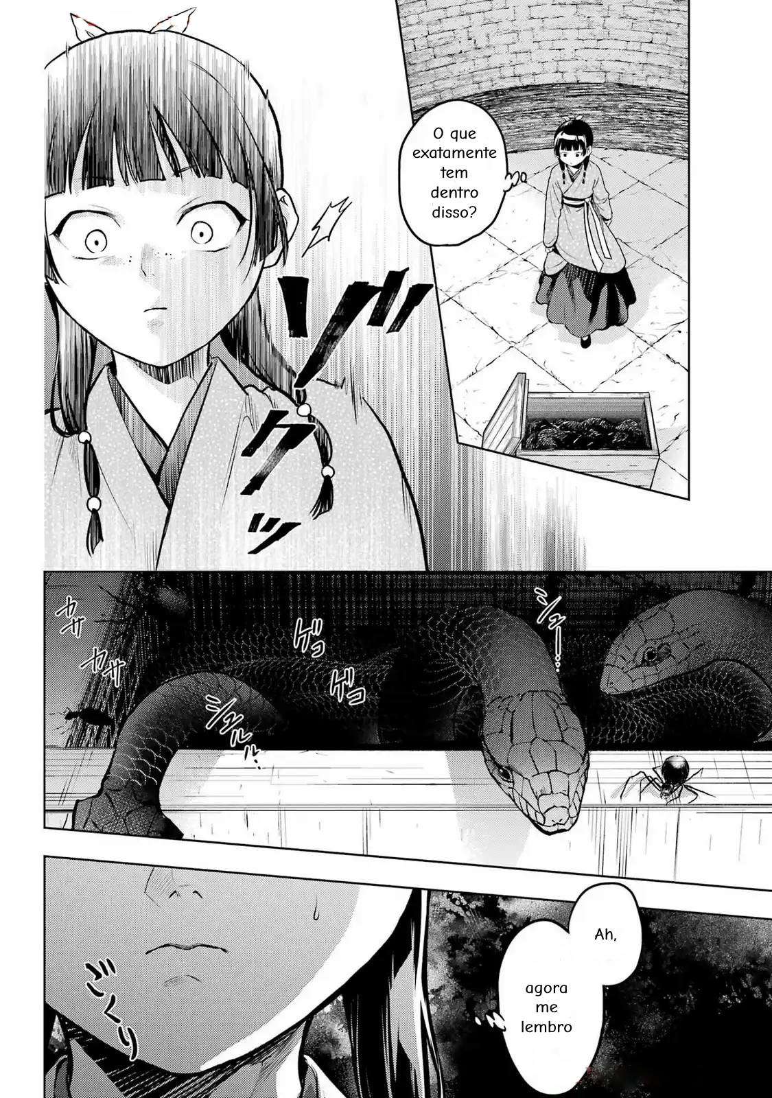 Capítulo 1 - A Maldição do HarémCapítulo 2 - Cientista LoucaCapítulo 3 - A Ninfa da Corte ImperialCapítulo 4 - O Fantasma do LuarCapítulo 5 - Sendo a EnfermeiraCapítulo 6 - Festa do Jardim (Parte 1)Capítulo 7 - Festa do Jardim (Parte 2)Capítulo 8 - Festa do Jardim (Parte 3)Capítulo 9 - A perspicácia de MaomaoCapítulo 10 - O significado da presilhaCapítulo 11 - De volta ao larCapítulo 12 - Canudo de PalhaCapítulo 13 - DesentendimentoCapítulo 14 - SaquêCapítulo 15 - Um pedido para MaomaoCapítulo 16 - Mel parte 1Capítulo 17 - Mel (parte 2)Capítulo 18 - A companheira AaduoCapítulo 19 - EncruzilhadaCapítulo 20 - O Eunuco e a CortesãCapítulo 21 - Cercada por irmãs...Capítulo 22 - Os Deveres do Pátio ExteriorCapítulo 23 - Lições do Pátio InteriorCapítulo 24 - Um CachimboCapítulo 25 - NamasuCapítulo 26 - O PrincipalCapítulo 27 - CosméticosCapítulo 28.1 - Um Passeio pela Cidade - ICapítulo 28.2 - Um Passeio pela Cidade - IICapítulo 29.1 - Sífilis - ICapítulo 29.2 - Sífilis - IICapítulo 30 - Sui ReiCapítulo 31 - Coincidência ou Inevitável?Capítulo 32 - O Mestre de Rituais MédiosCapítulo 33 - A Trombeta do DiaboCapítulo 34 - Gao ShunCapítulo 35.1 - De Volta ao Palácio Interior - ICapítulo 35.2 - De Volta ao Palácio Interior - IICapítulo 36.1 - Rosas e Esmaltes - ICapítulo 36.2 - Rosas e Esmaltes - IICapítulo 36.3 - Rosas e Esmaltes - IIICapítulo 37 - Bálsamo e Oxalis - ICapítulo 38 - Bálsamo e Oxalis - IICapítulo 39 - Bálsamo e Oxalis - IIICapítulo 40 - DespacheCapítulo 41 - O LivroCapítulo 42.1 - Gato (parte 1)Capítulo 42.2 - Gato (parte 2)Capítulo 43.1 - Caravana (parte 1)Capítulo 43.2 - Caravana (parte 2)Capítulo 44.1 - Cordyceps (parte 1)Capítulo 44.2 - Cordyceps humano (parte 2)Capítulo 45.1 - Cordyceps (epílogo)Capítulo 45.2 - Cordyceps (epílogo, parte 2)Capítulo 46 - EspelhoCapítulo 47 - Fada da lua (parte 1)Capítulo 48.1 - Fada da lua (parte 2)Capítulo 48.2 - Fada da lua (parte 3)Capítulo 49 - A clínicaCapítulo 50 - Na terceira vez dá certo (parte 1)Capítulo 51 - Na terceira vez dá certo (parte 2)Capítulo 52.1 - Na terceira vez dá certo (parte 3)Capítulo 52.2 - Na terceira vez dá certo (parte 4)Capítulo 53 - O Templo da Escolha (Parte 1)Capítulo 54 - O templo da escolha (parte 2)Capítulo 55.1 - Imperatriz Viúva (Parte 1)Capítulo 55.2 - Imperatriz Viúva (Parte 2)Capítulo 56Capítulo 57Capítulo 58Capítulo 59.1 - História de Terror (Parte 1)Capítulo 60.1 - Retiro de Verão (Parte 1)Capítulo 60.2 - Retiro de Verão (Parte 2)Capítulo 61 - A Caçada (Parte 1)Capítulo 62 - A Caçada (Parte 2)Capítulo 63.1 - A Caçada (Parte 3)Capítulo 63.2 - A Caçada (Parte 4)Capítulo 64 - O homem mascaradoCapítulo 65 - O BanhoCapítulo 66 - SekiuCapítulo 67 - O Fantasma DançarinoCapítulo 68 - O Famoso Eunuco e SorveteCapítulo 68 - O Eunuco dos rumores e o SorveteCapítulo 69 - Feto em Posição PodálicaCapítulo 69 - Parto PélvicoCapítulo 70 - Malícia Oculta (parte 1)Capítulo 70 - Malícia Repulsiva Parte 1Capítulo 71 - Malícia Repulsiva Parte 2Capítulo 71 - Malícia Oculta (Parte 2)Capítulo 72 - A Raposa e o Texugo se enfrentam Capítulo 73 - Rastreando os PassosCapítulo 73 - PegadasCapítulo 74.1 - A Terra da Raposa (Parte I)Capítulo 74.1 - A vila da Raposa (1)Capítulo 74.2 - A Terra da Raposa (parte 2)Capítulo 74.2 - A vila da Raposa (2)Capítulo 75 - Physalis (Parte 1)Capítulo 75.1 - Hozuki ①Capítulo 75.2 - Physalis (Parte 2)Capítulo 76.1 - Festival (Parte 1)Capítulo 76.1 - Festival ①Capítulo 76.2 - Festival ②Capítulo 76.2 - Festival (parte 2)Capítulo 77 - Local da TransaçãoCapítulo 77.1 - Área de trocaCapítulo 77.2 - Local de transação ②Capítulo 77.2 - Local da Transação (Parte 2)Capítulo 78 - A Fortaleza (Parte 1)Capítulo 78.1 - Fortaleza ①Capítulo 78.2 - Fortaleza (2)Capítulo 78.2 - A Fortaleza (Parte 2)Capítulo 79.1 - Taibon (parte 1)Capítulo 79.1 - O Poço ①Capítulo 79.2 - Taibon (parte 2)Capítulo 79.2 - O poço (2)